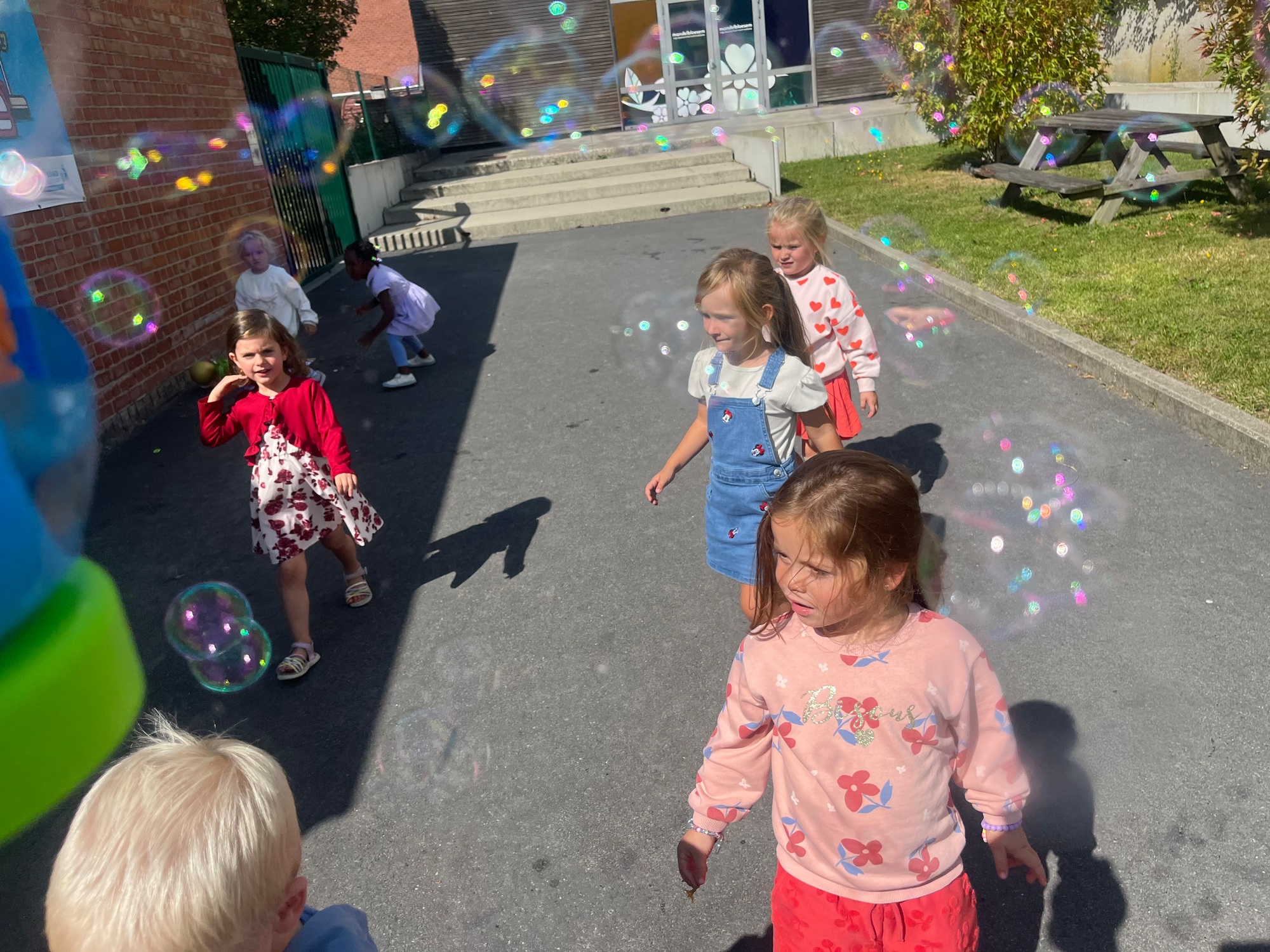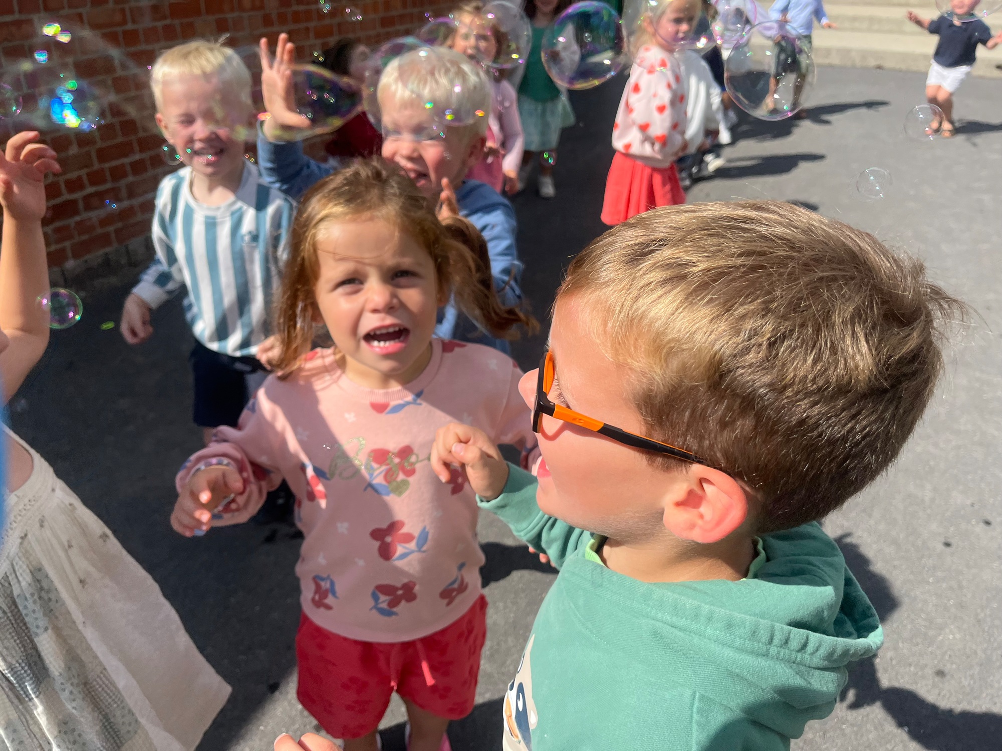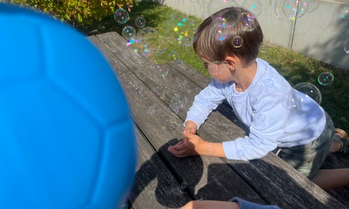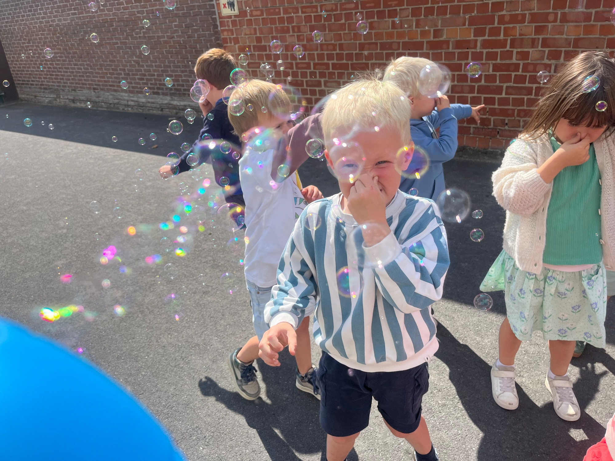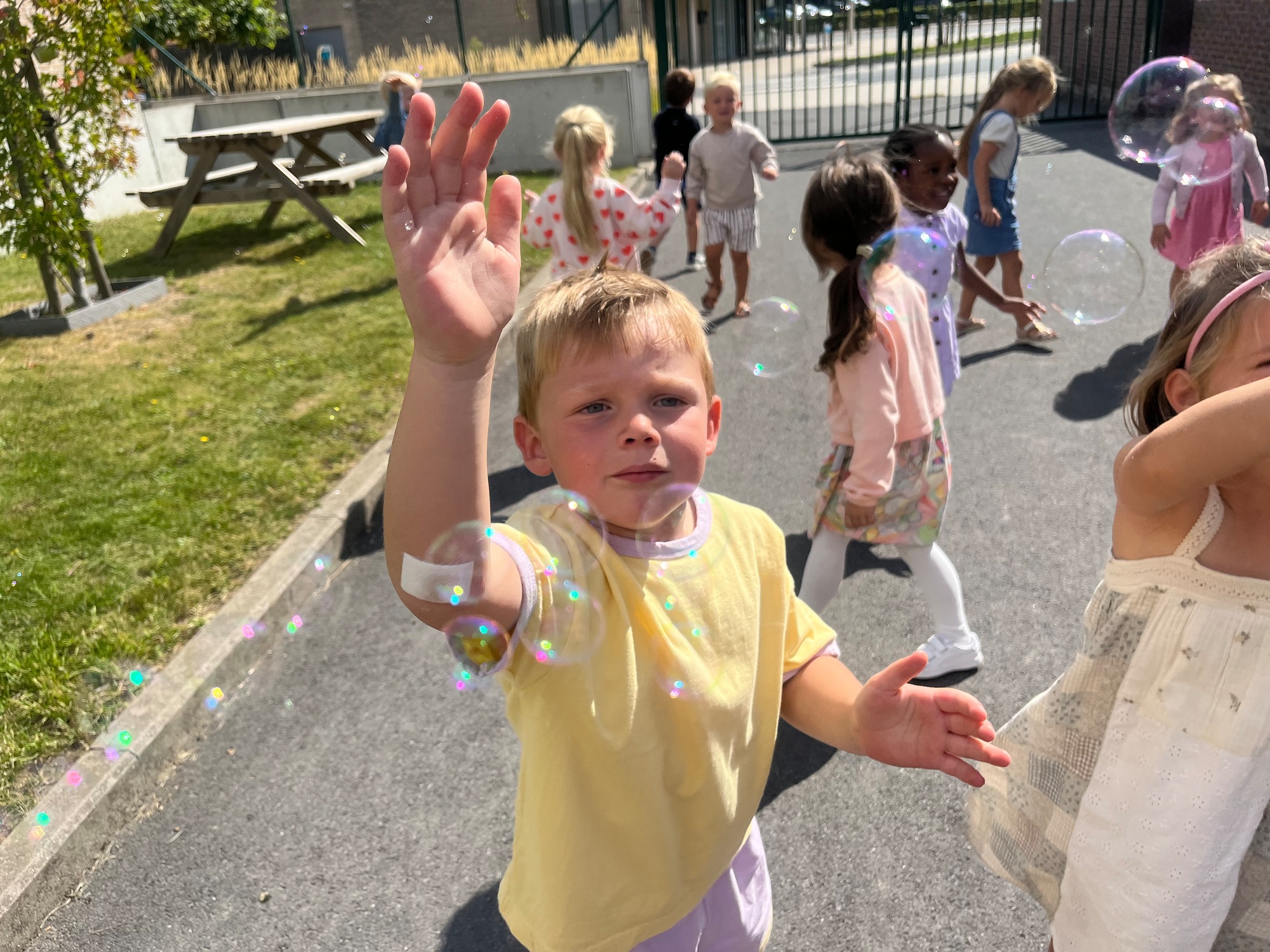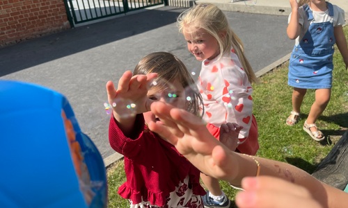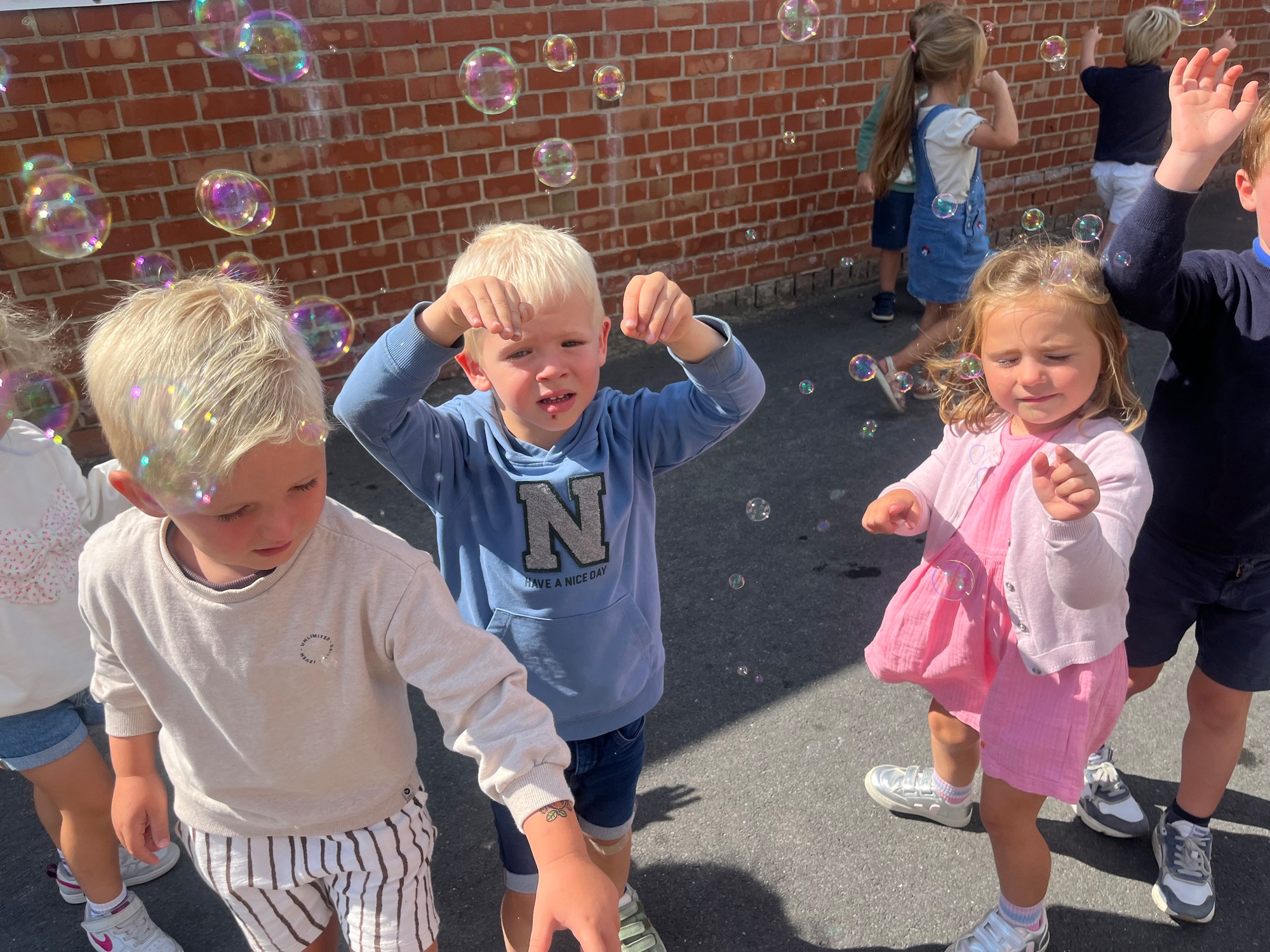 Leeuw brult heel luid en vangt de bellen, aap springt op en neer, olifant vangt de bellen met zijn slurf en krokodil vangt ze met zijn grote bek.