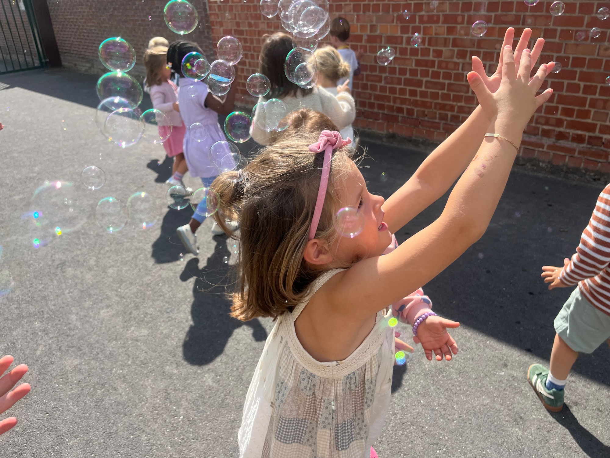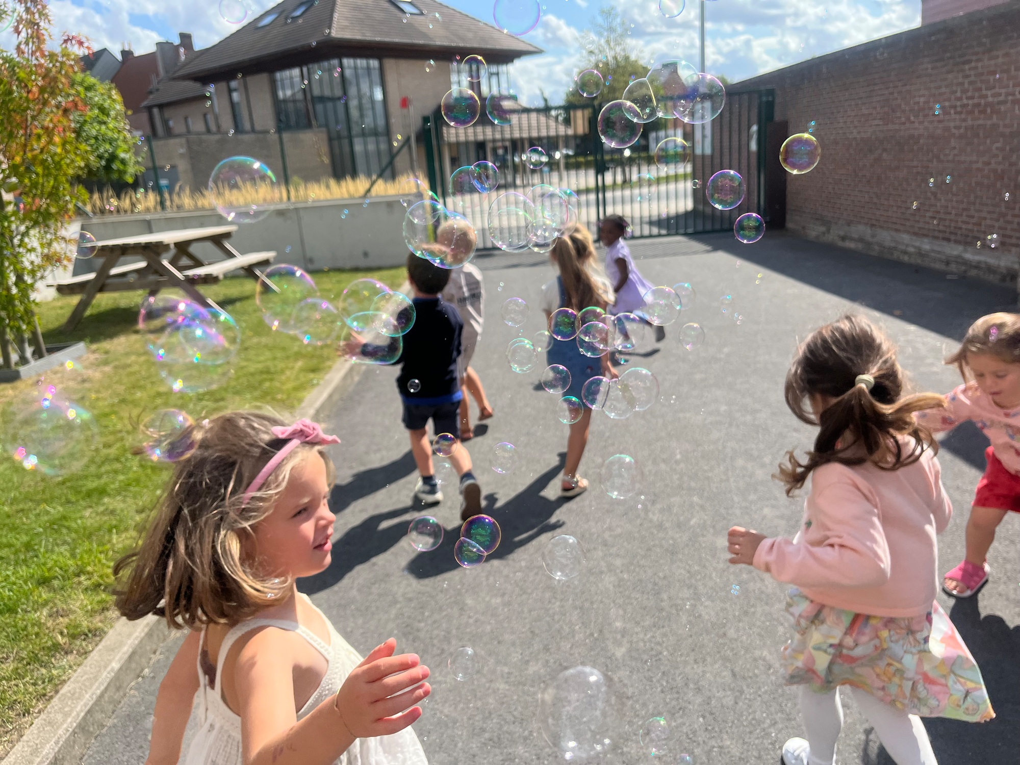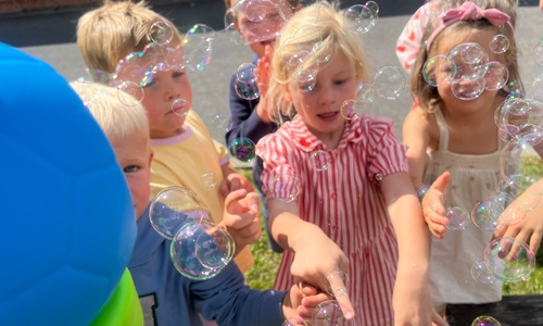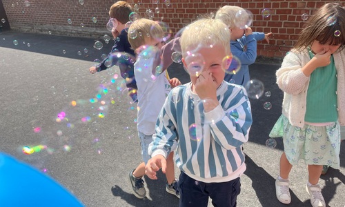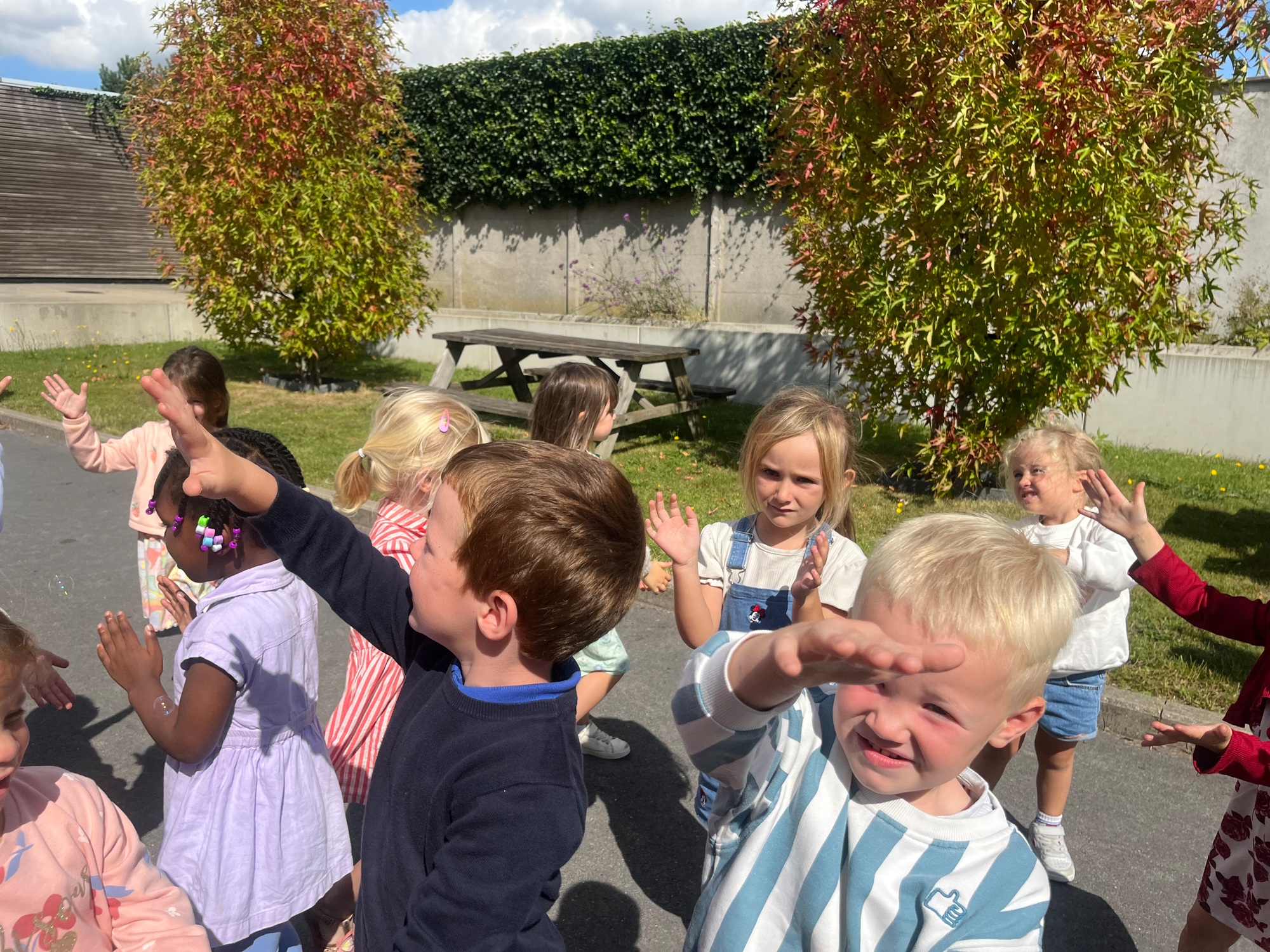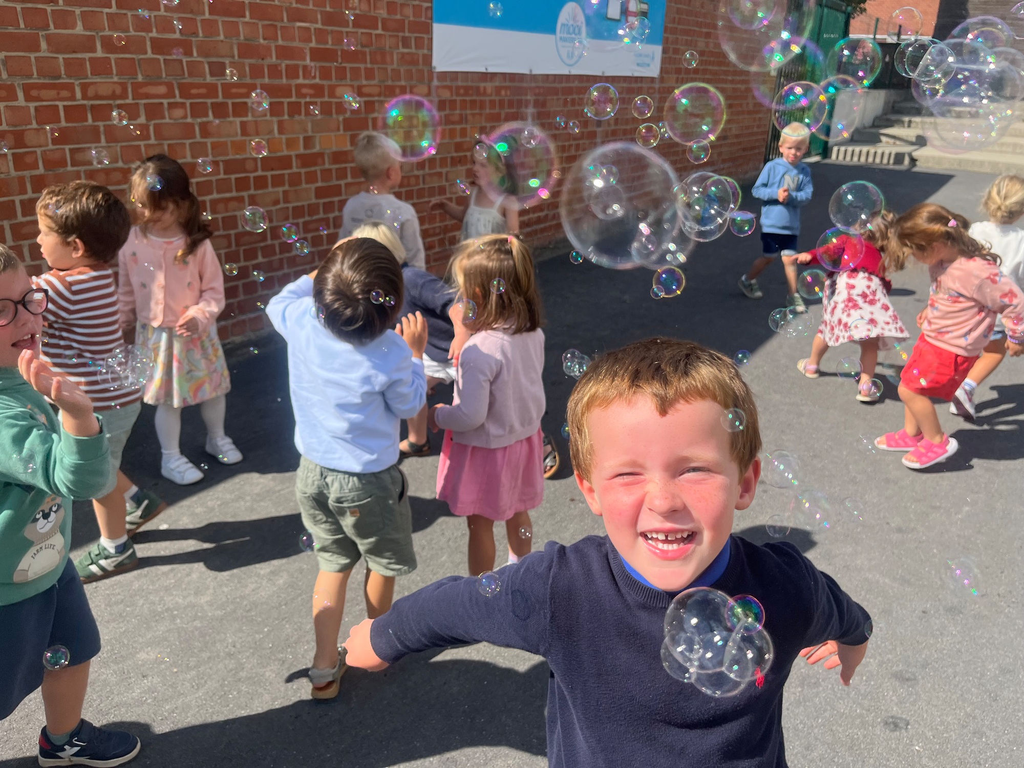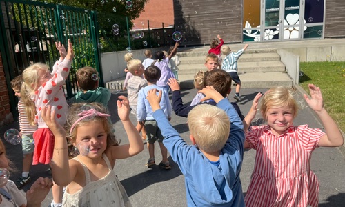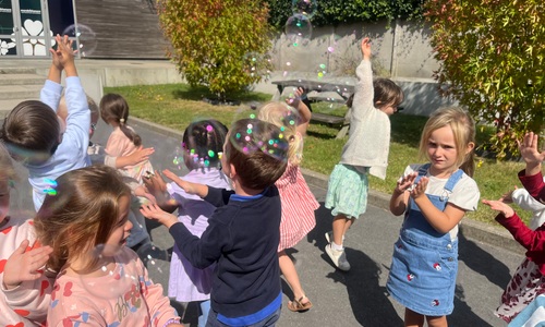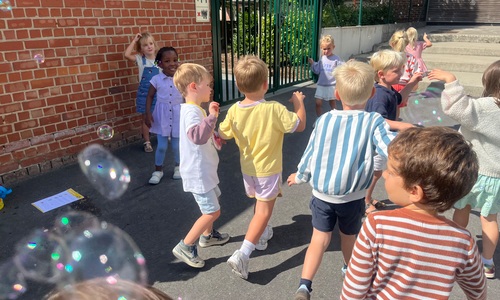 Leeuw brult heel luid en vangt de bellen, aap springt op en neer, olifant vangt de bellen met zijn slurf en krokodil vangt ze met zijn grote bek.