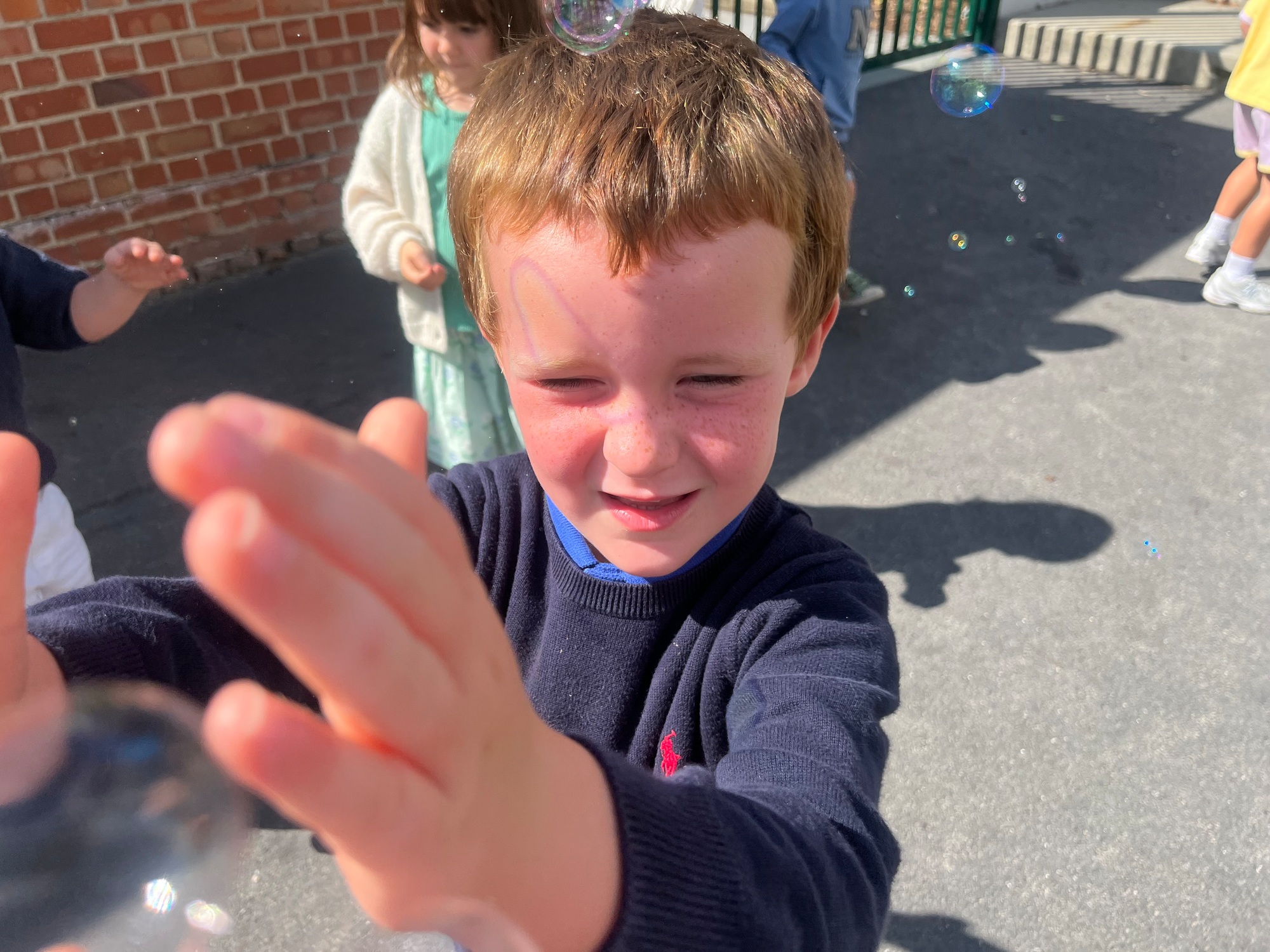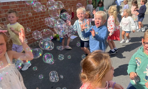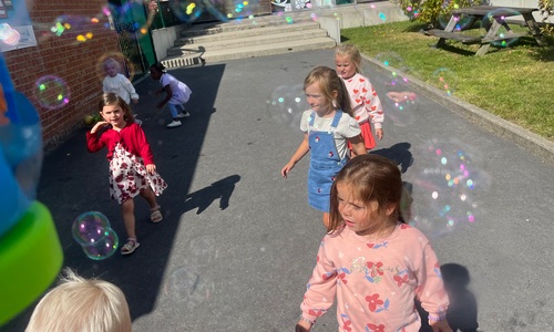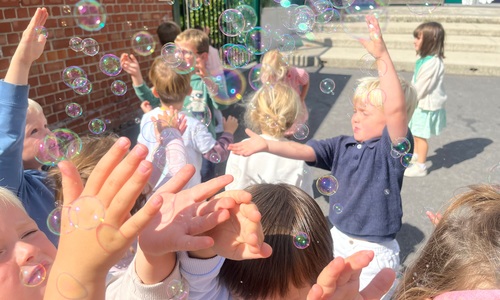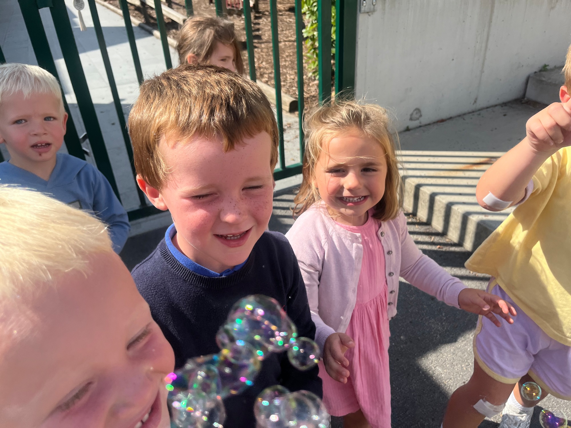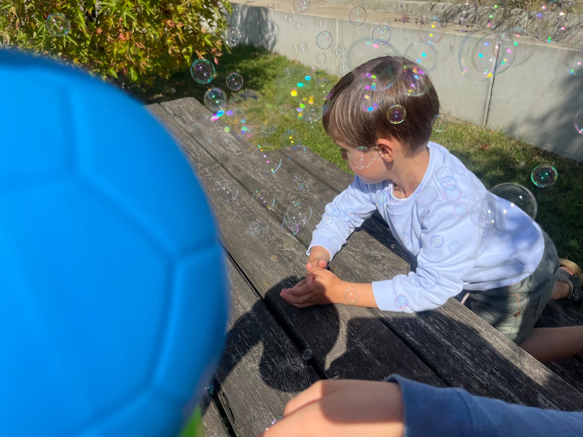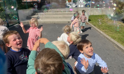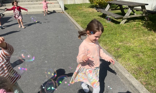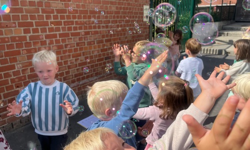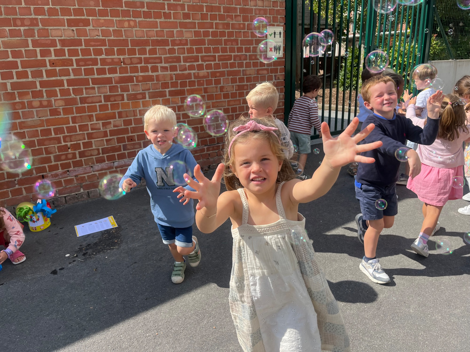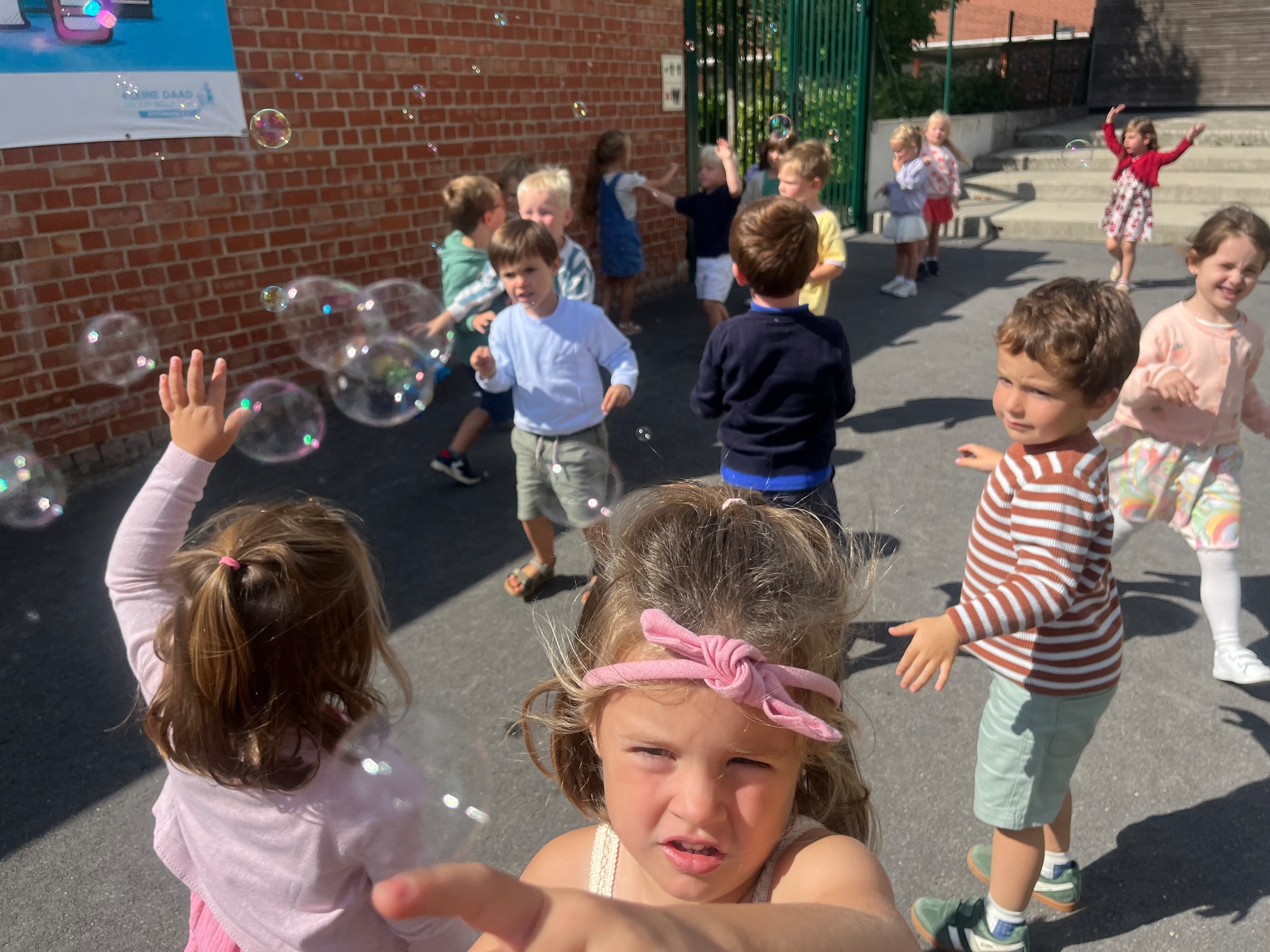 Leeuw brult heel luid en vangt de bellen, aap springt op en neer, olifant vangt de bellen met zijn slurf en krokodil vangt ze met zijn grote bek.