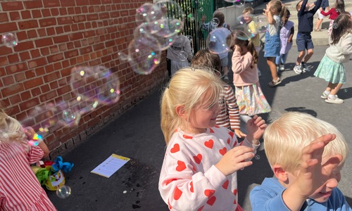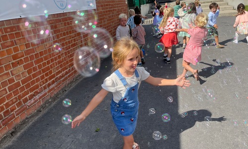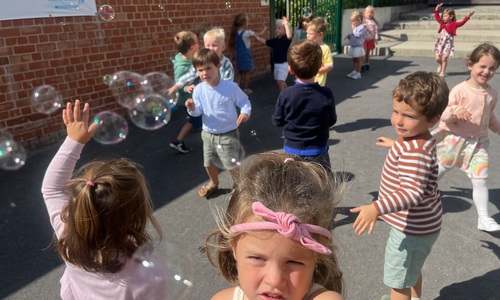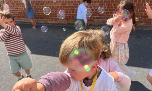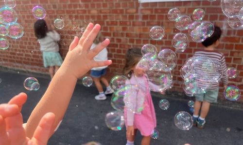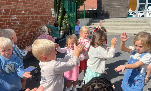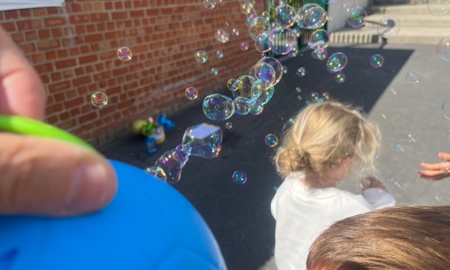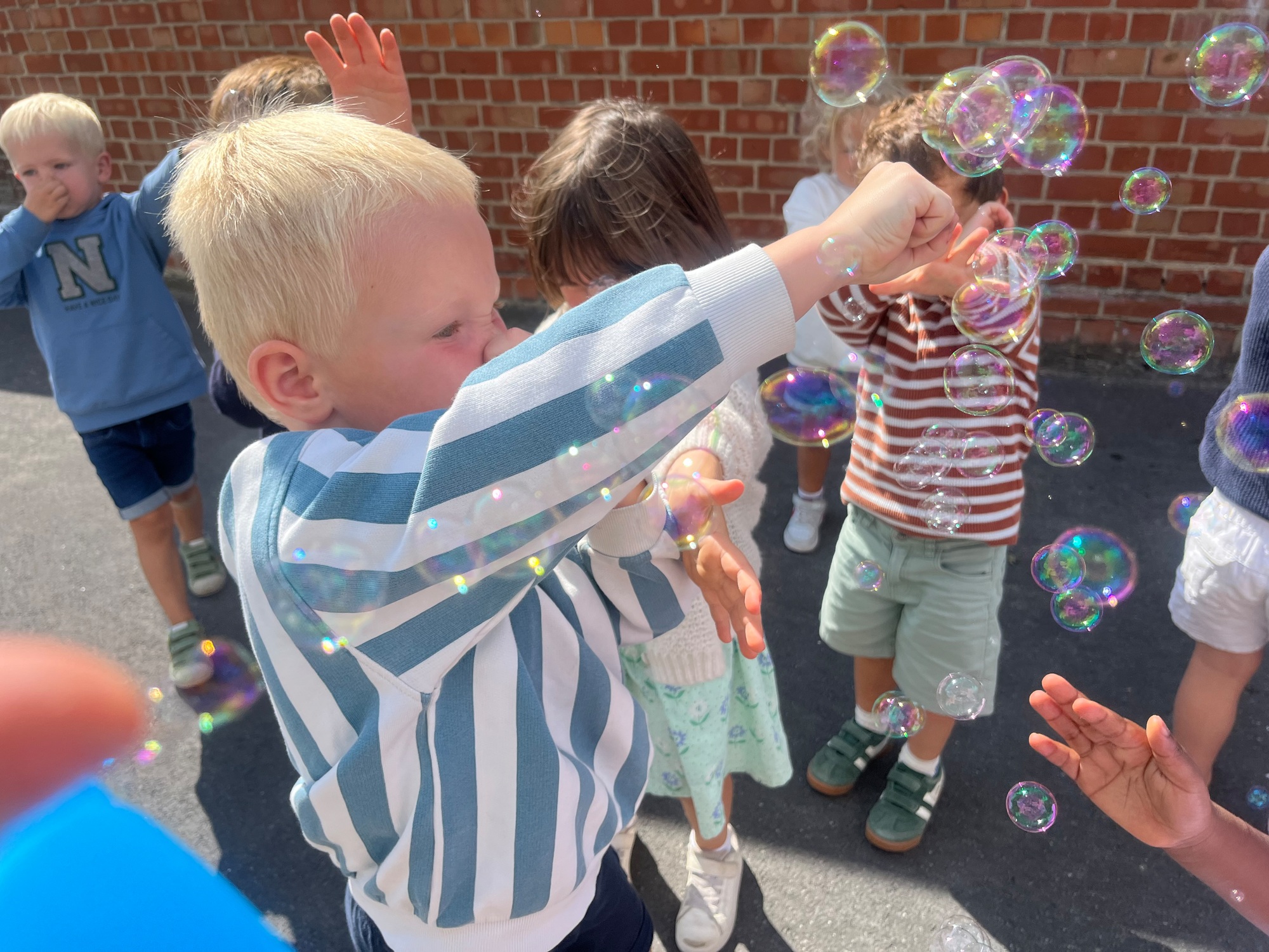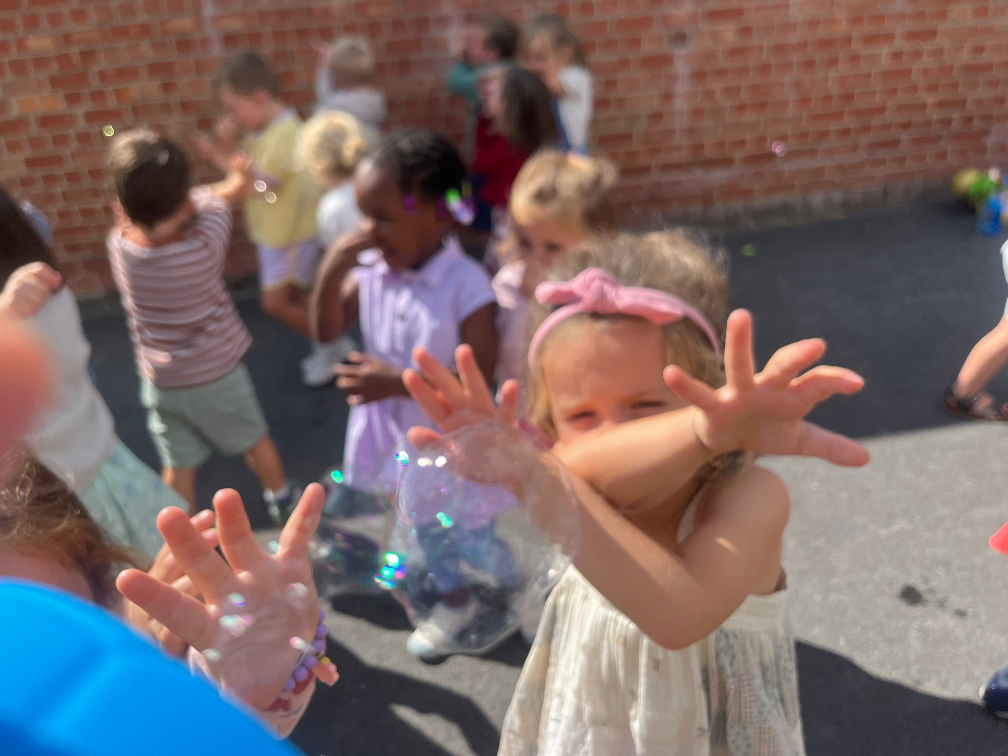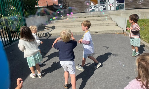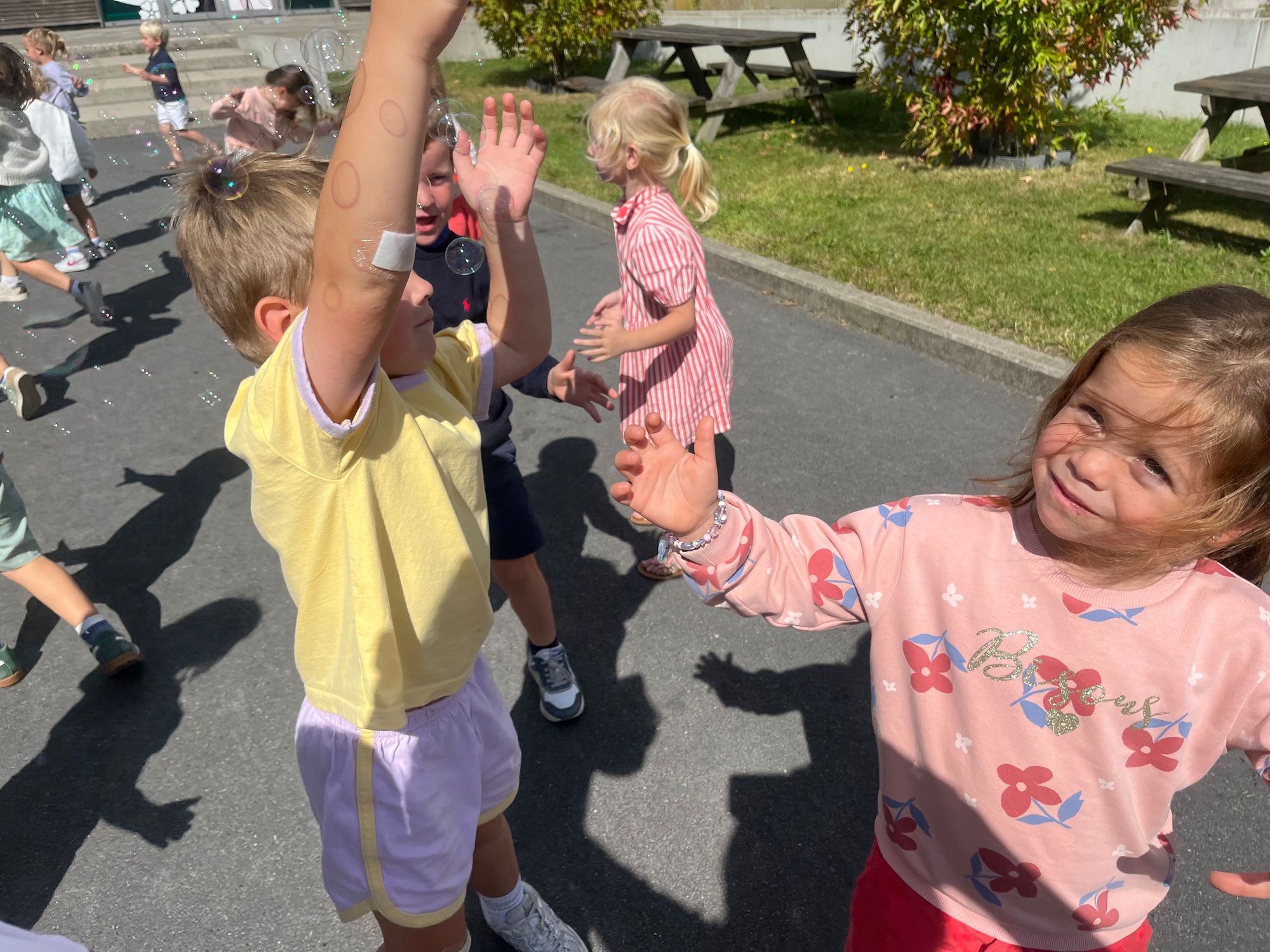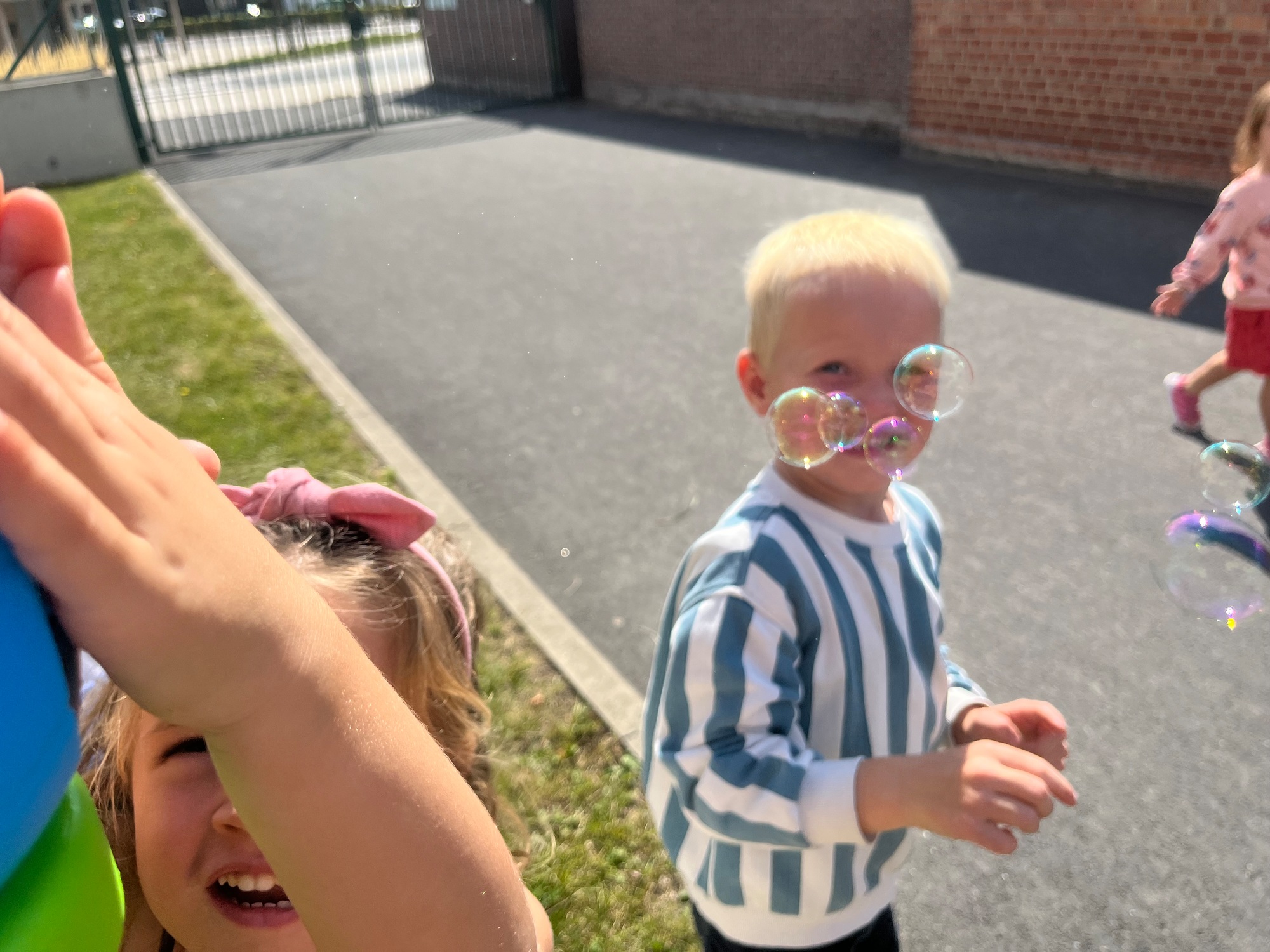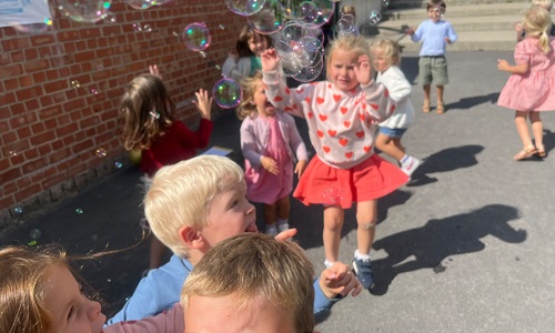 Leeuw brult heel luid en vangt de bellen, aap springt op en neer, olifant vangt de bellen met zijn slurf en krokodil vangt ze met zijn grote bek.
