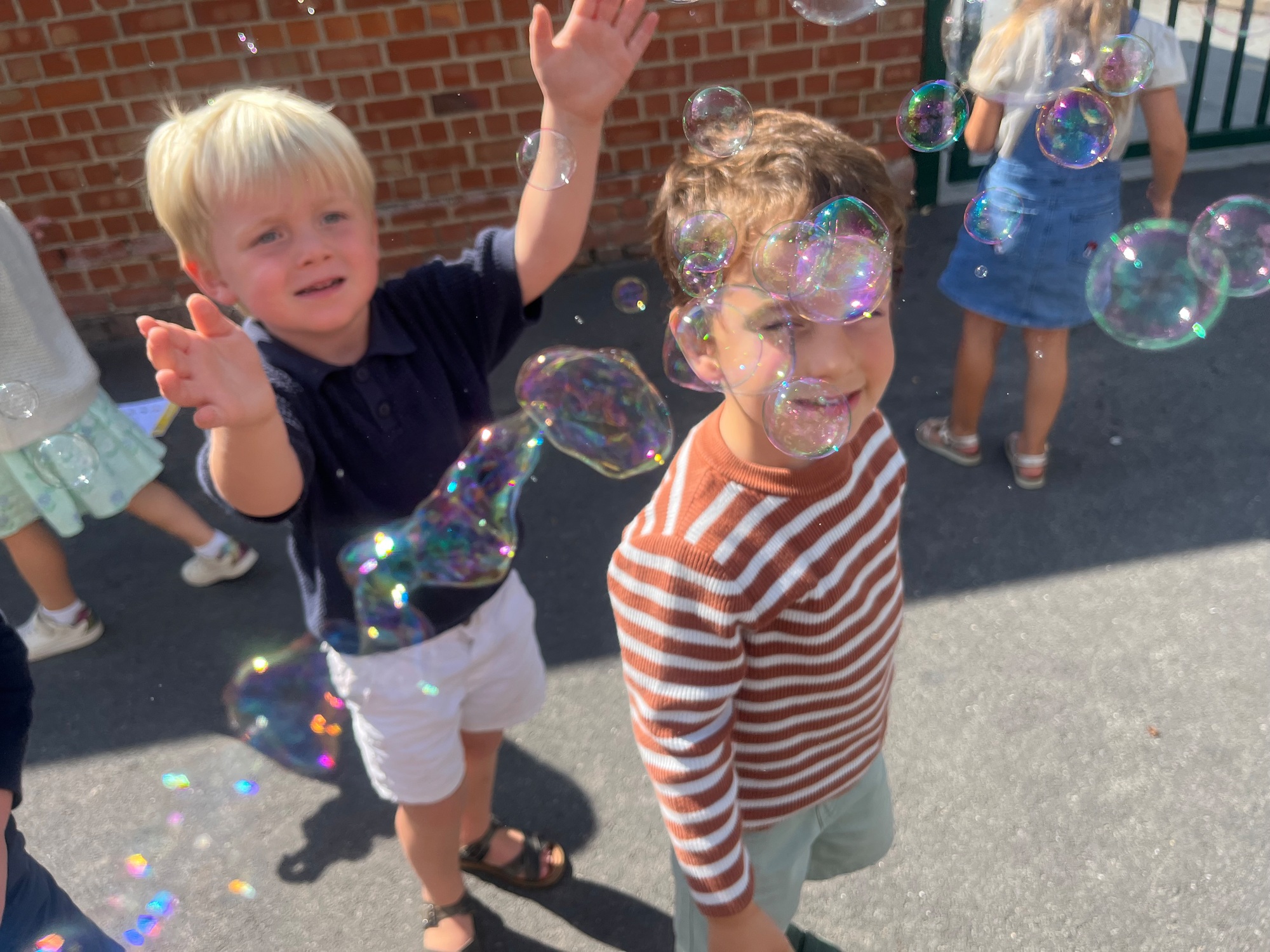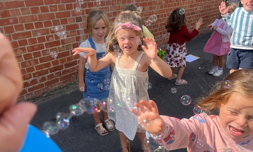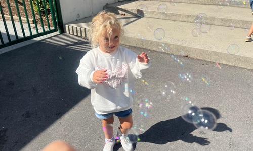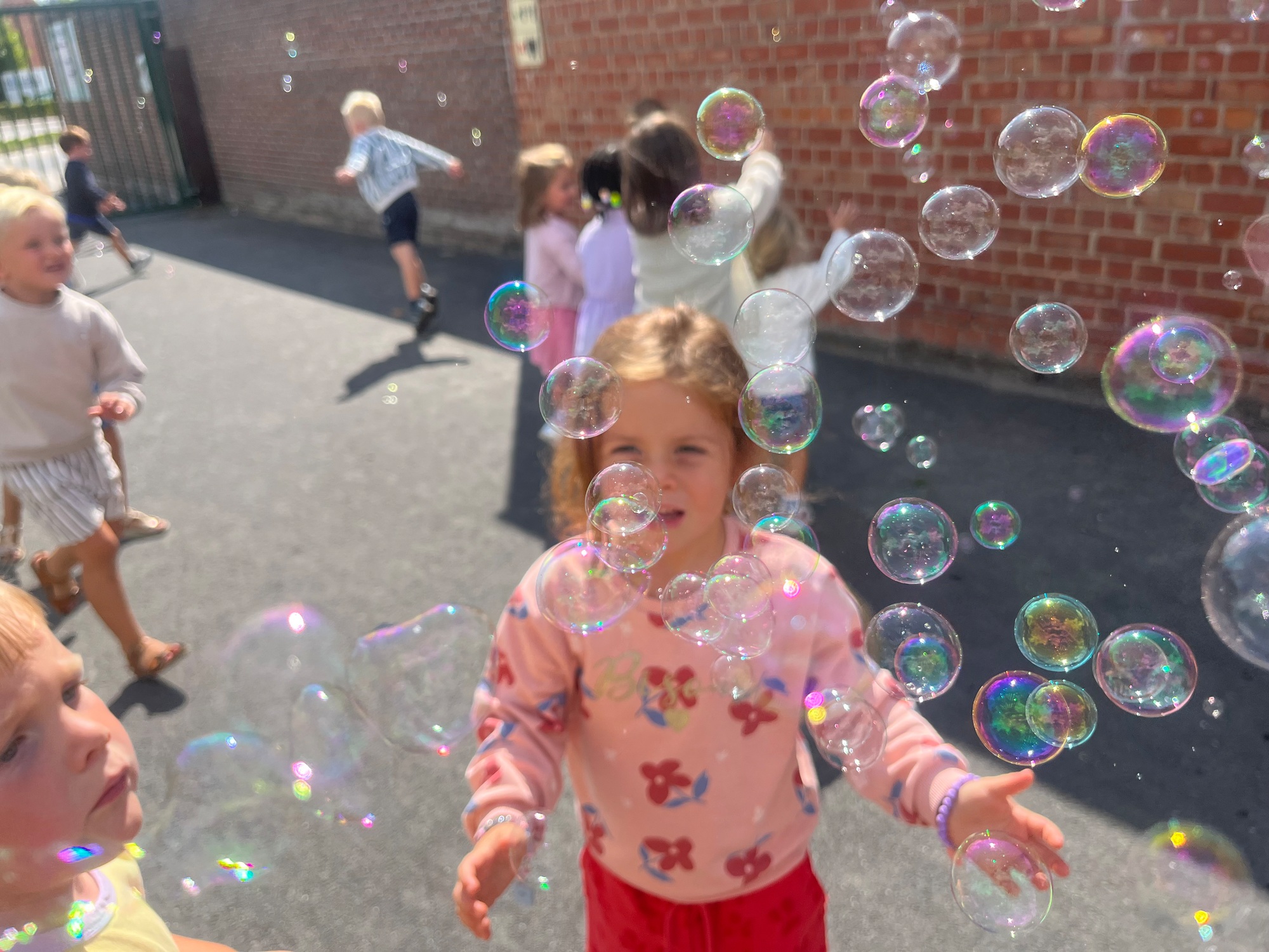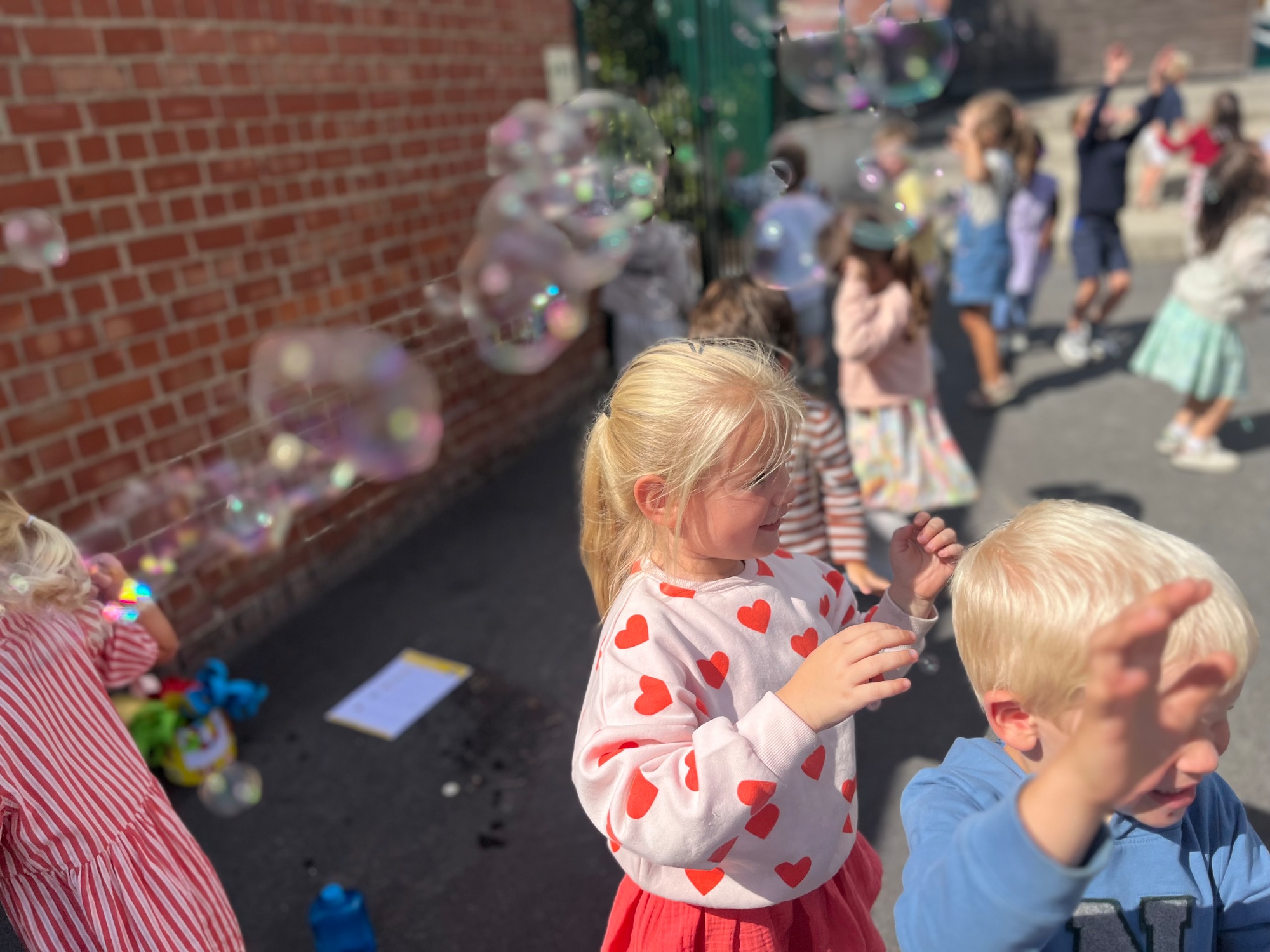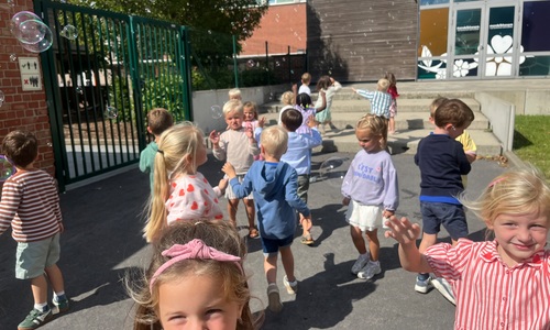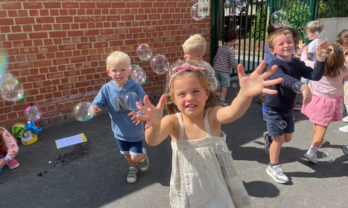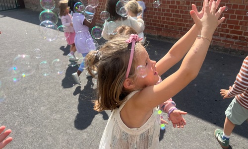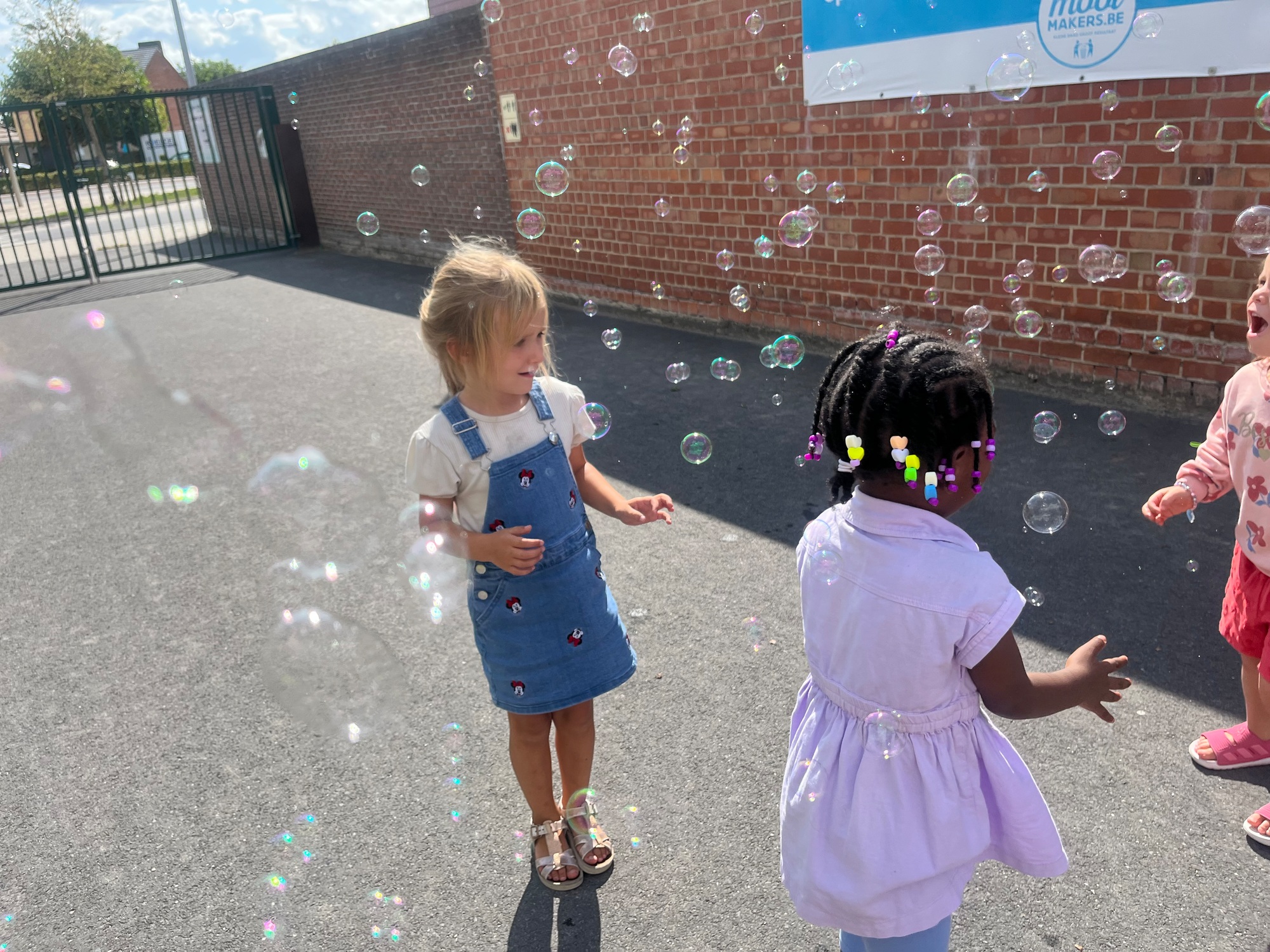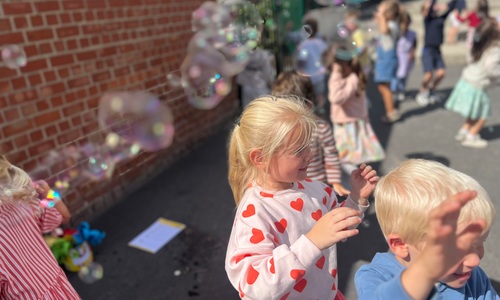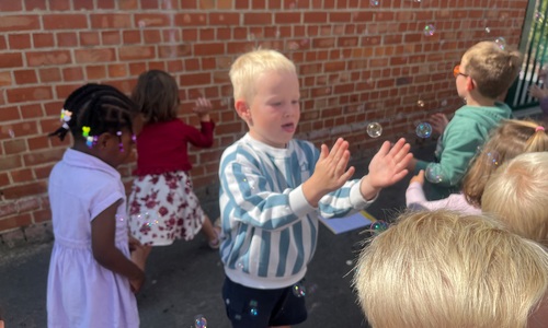 Leeuw brult heel luid en vangt de bellen, aap springt op en neer, olifant vangt de bellen met zijn slurf en krokodil vangt ze met zijn grote bek.