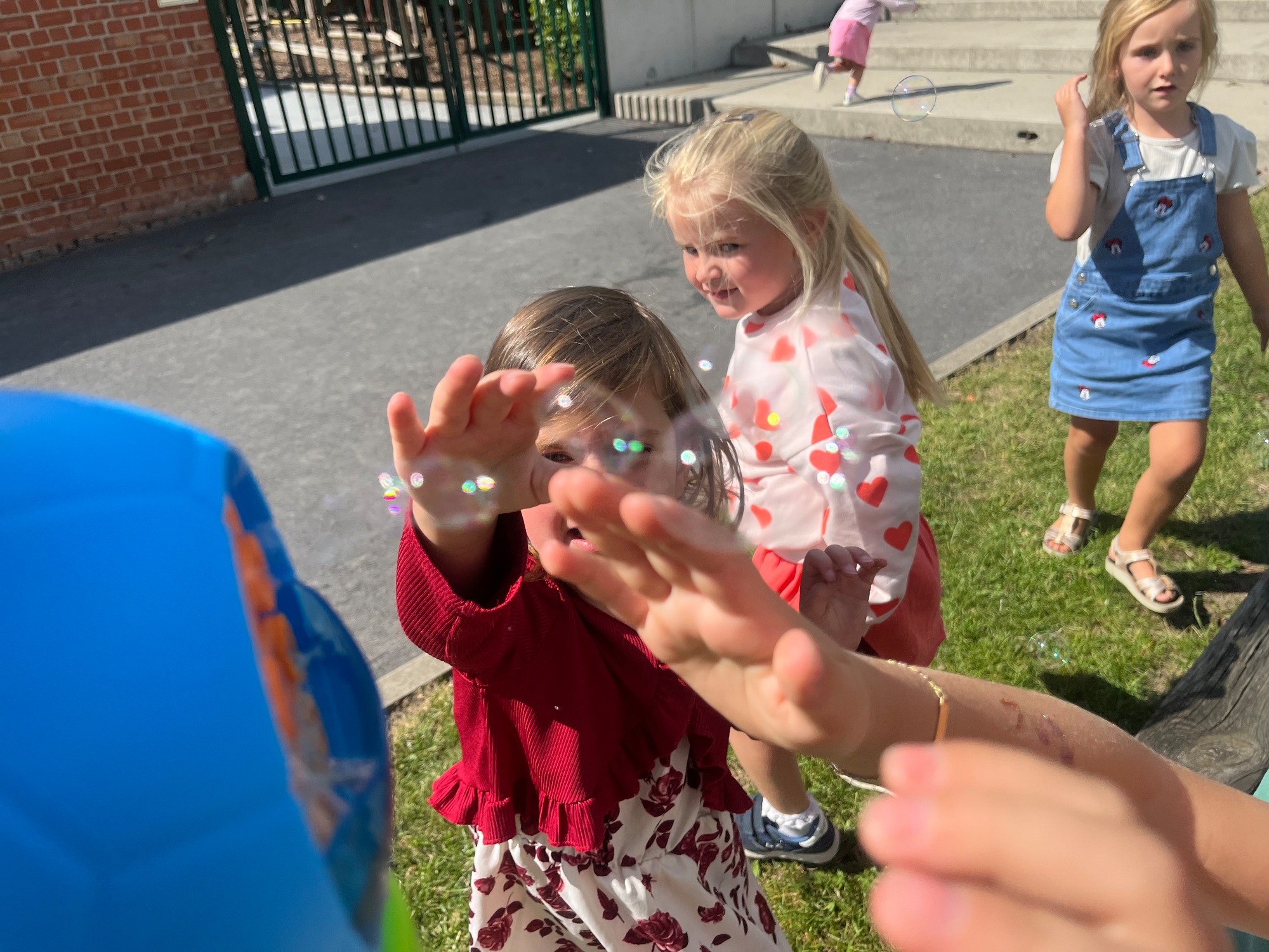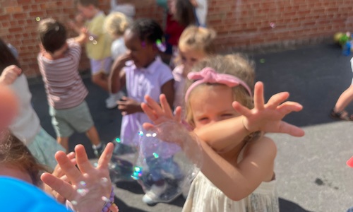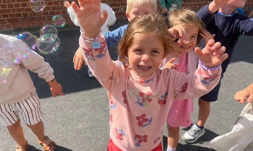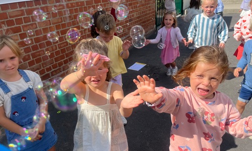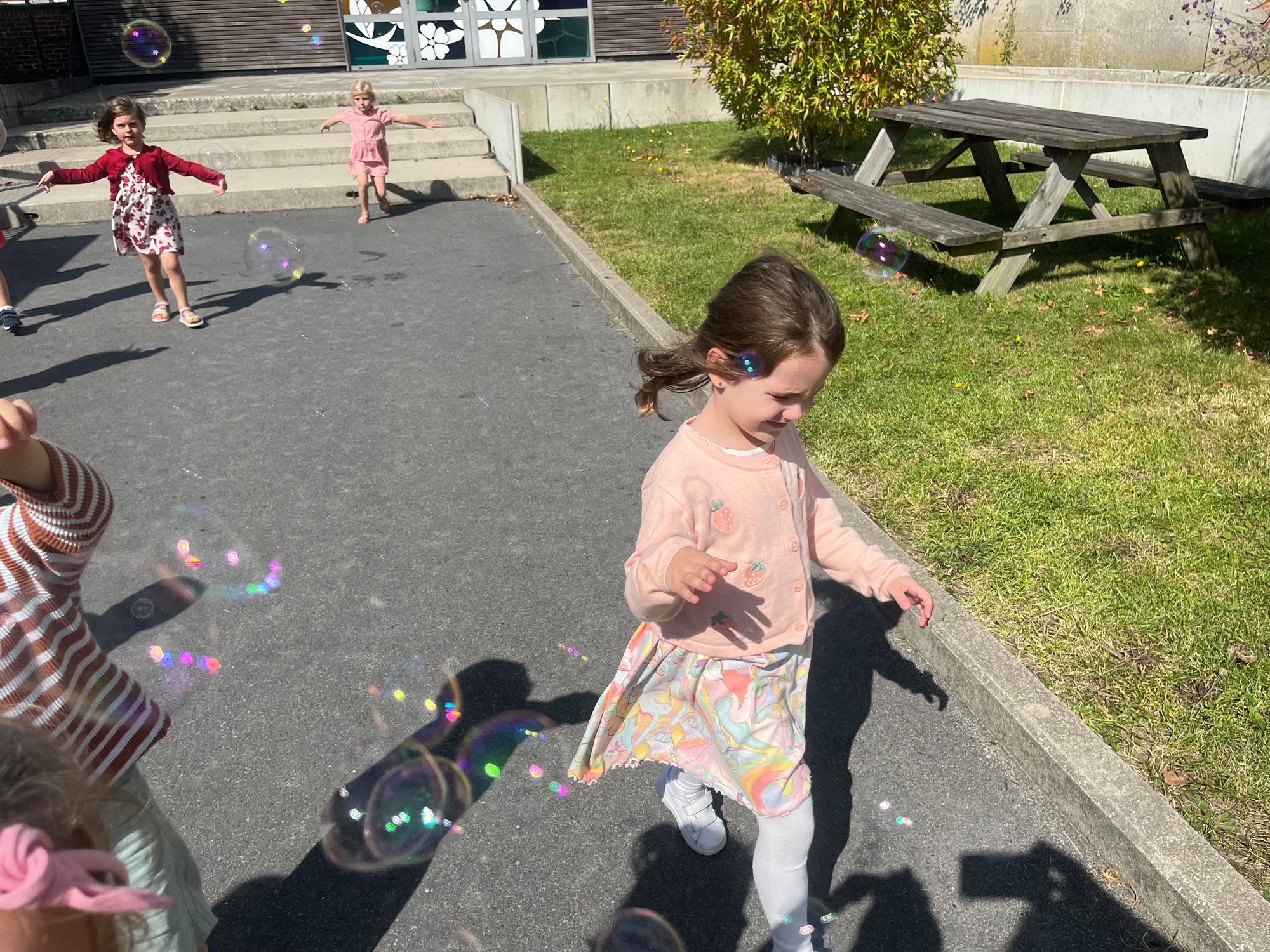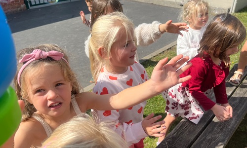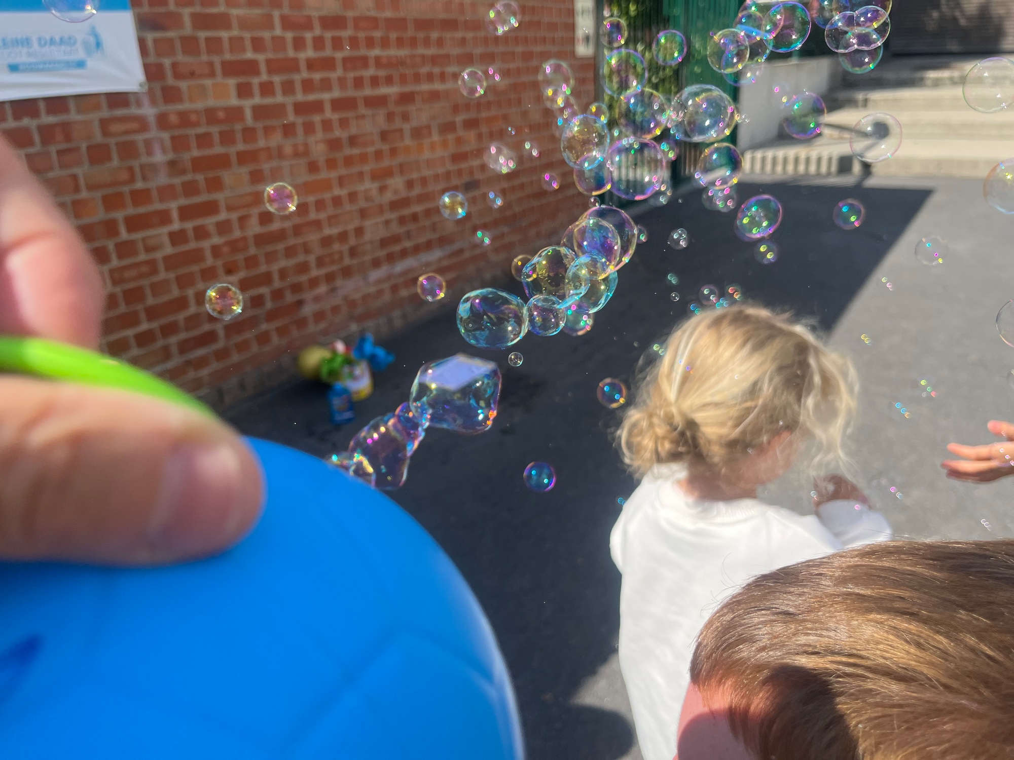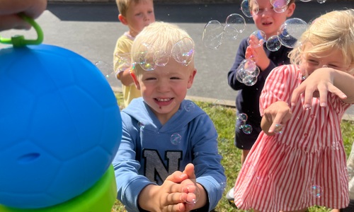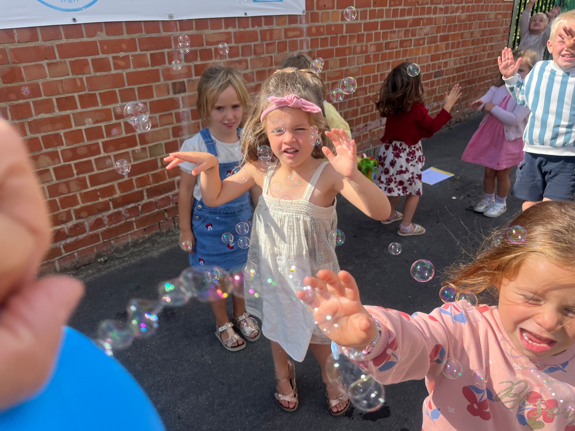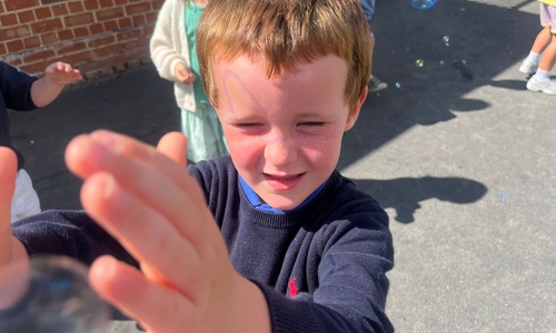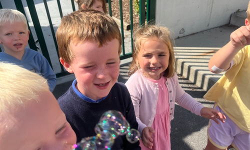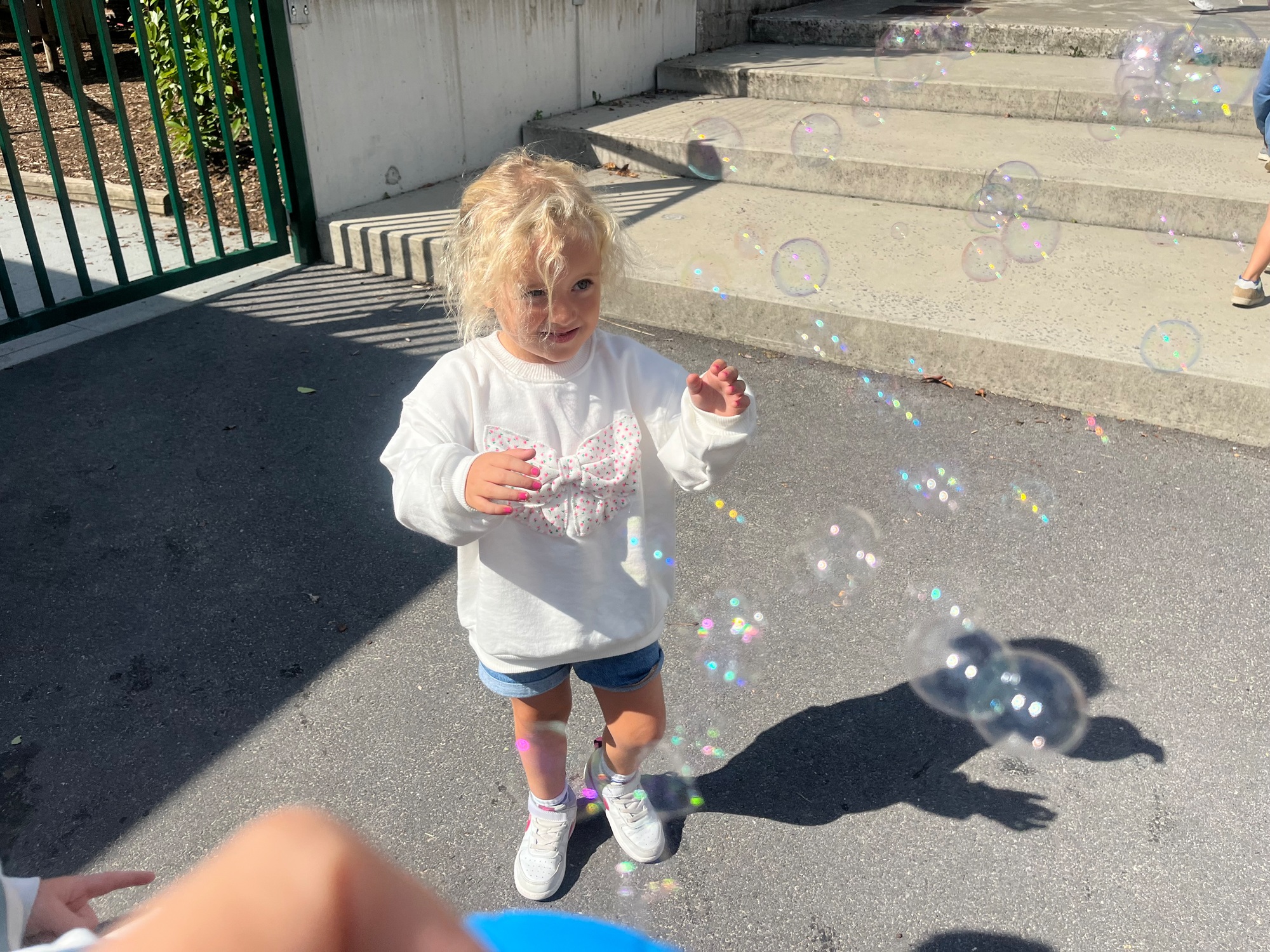 Leeuw brult heel luid en vangt de bellen, aap springt op en neer, olifant vangt de bellen met zijn slurf en krokodil vangt ze met zijn grote bek.