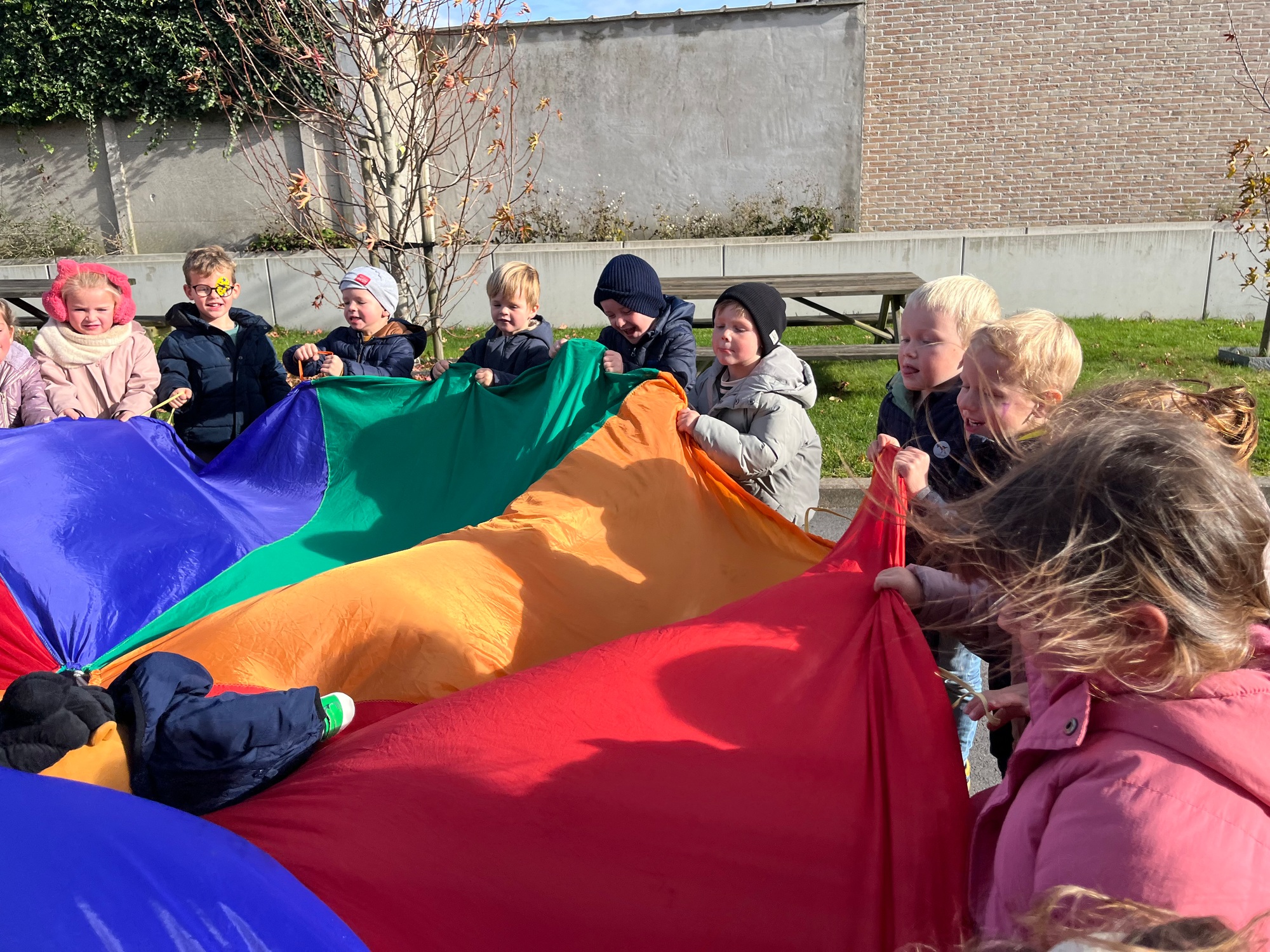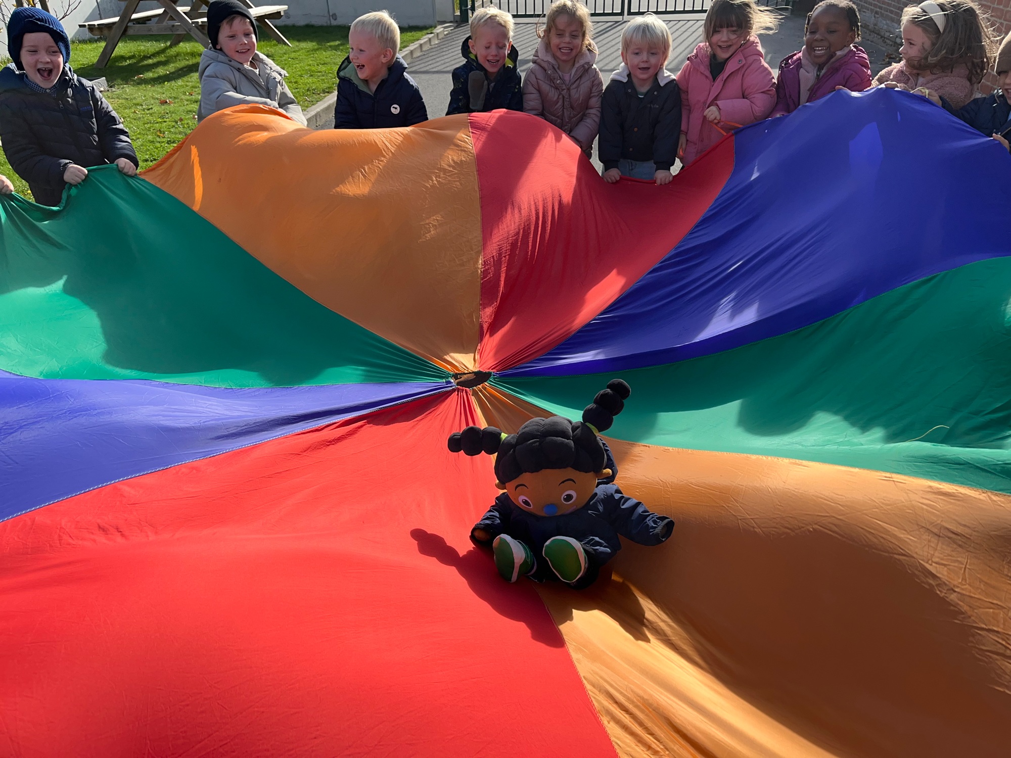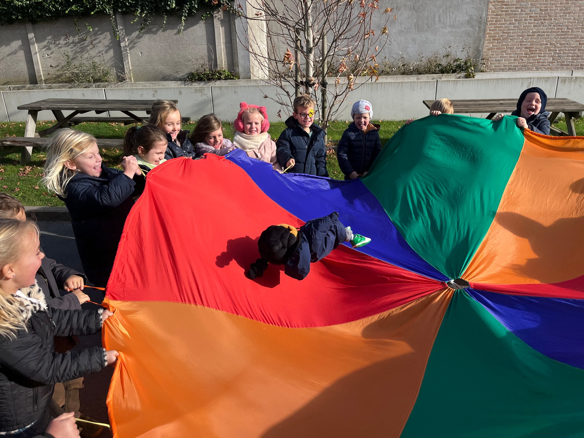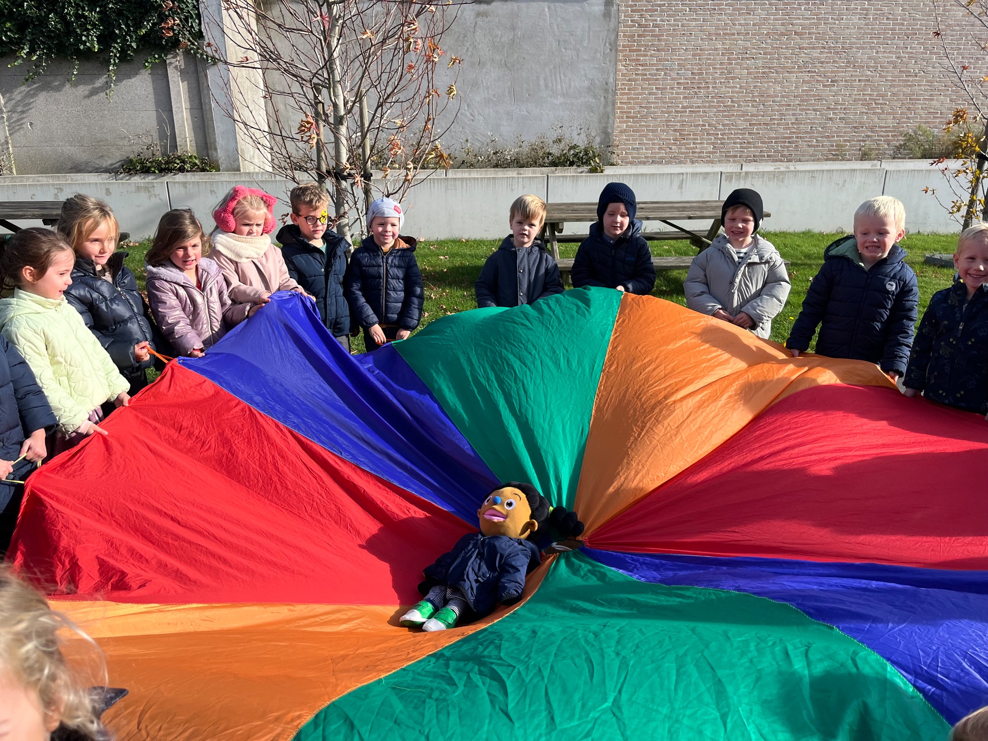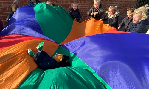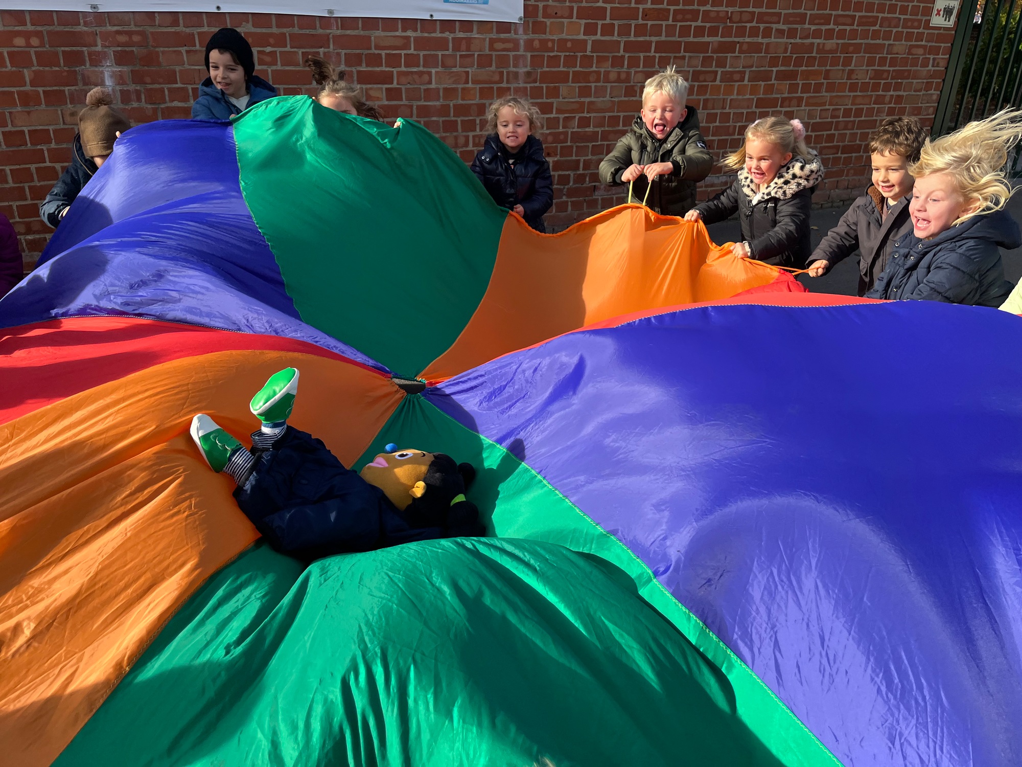 We maken wind met de parachute en laten Looeloe springen in de parachute