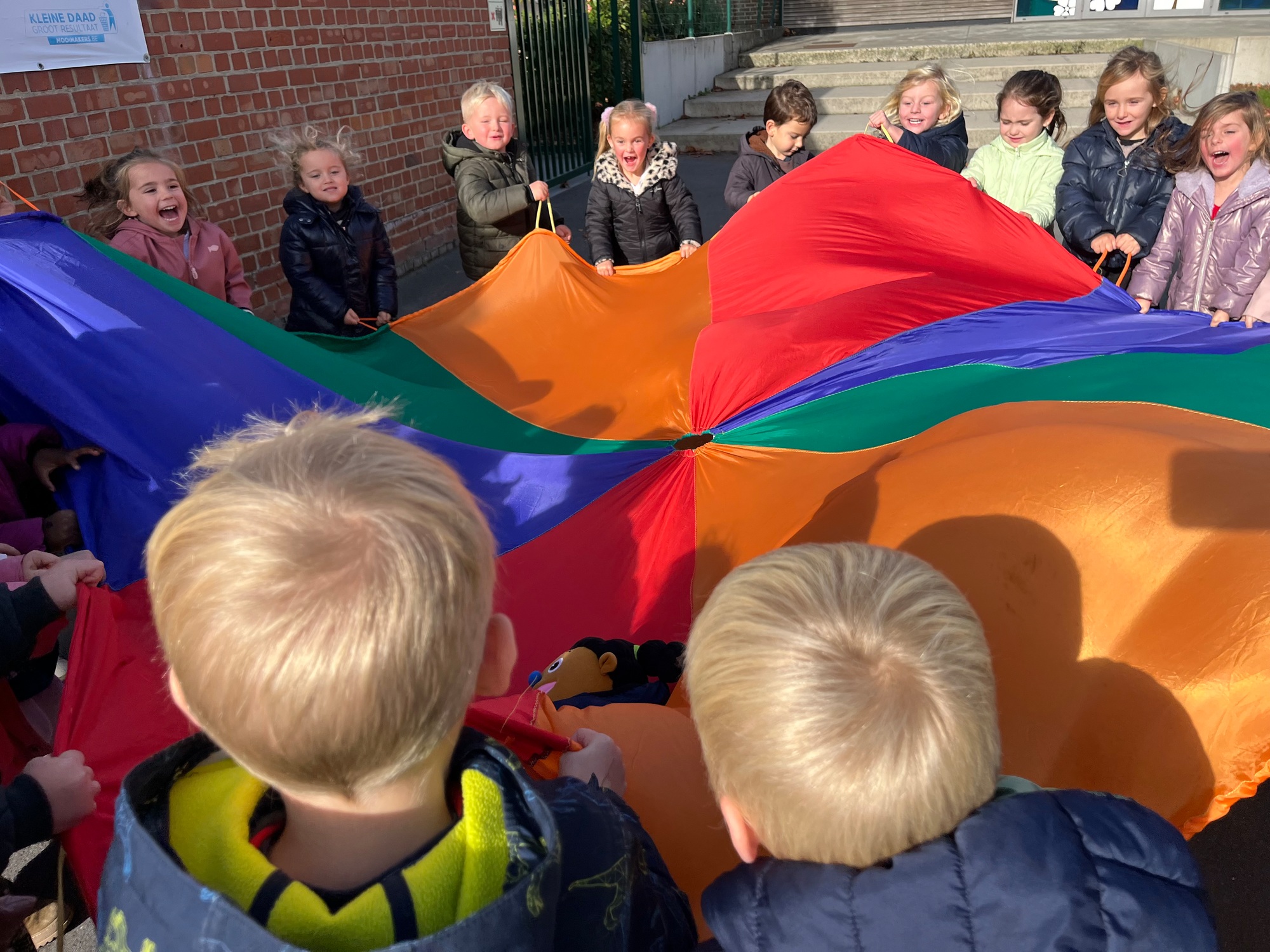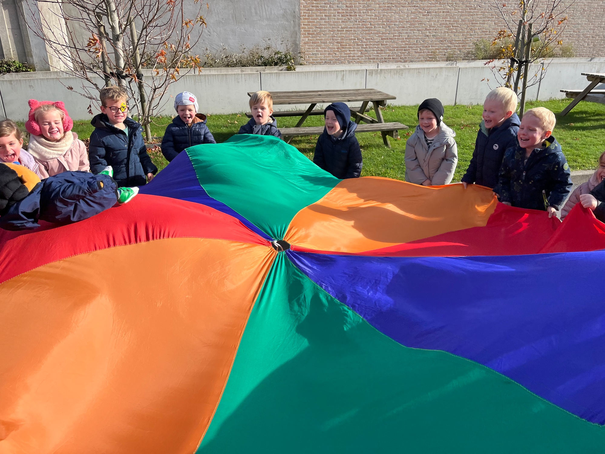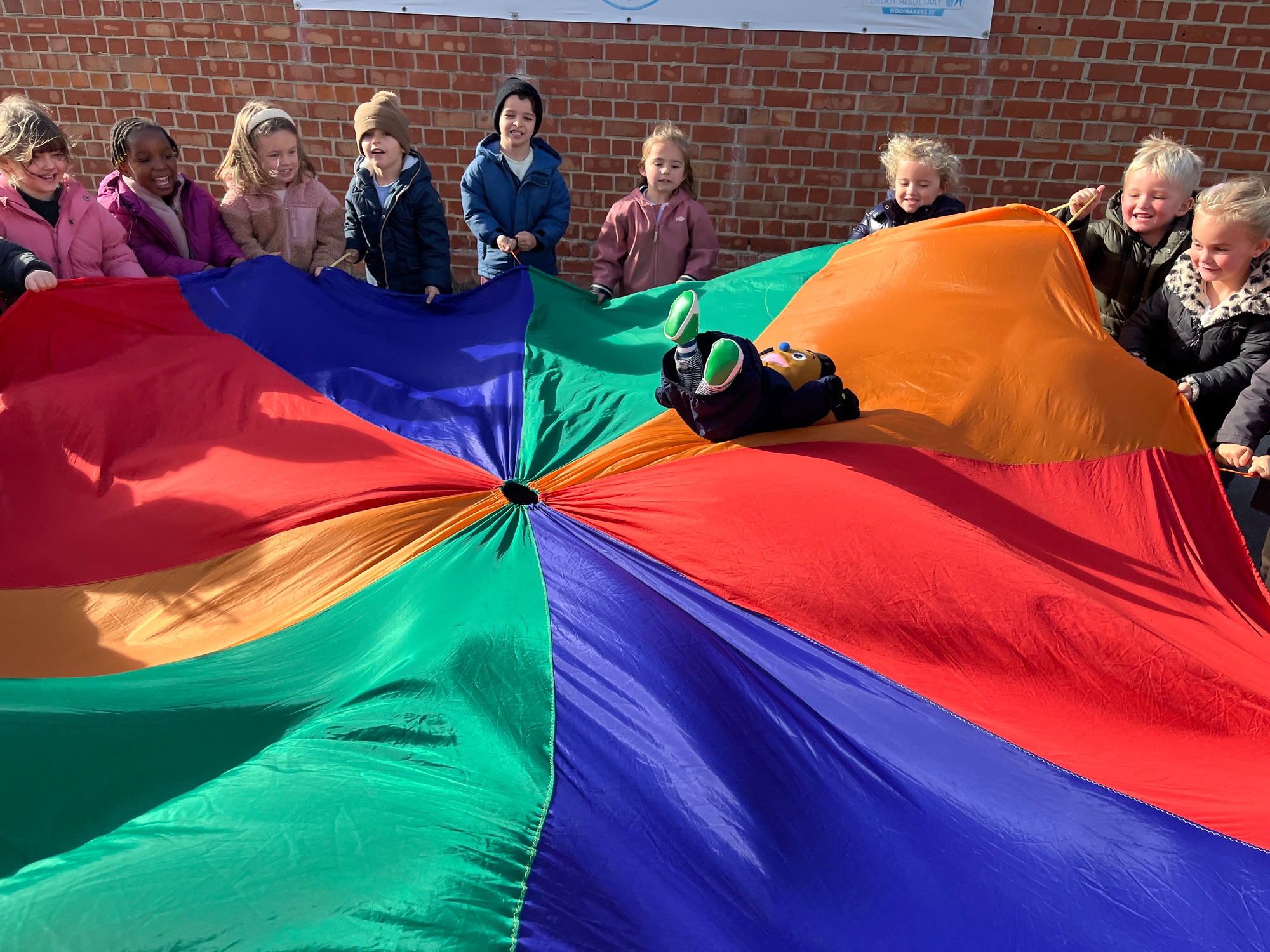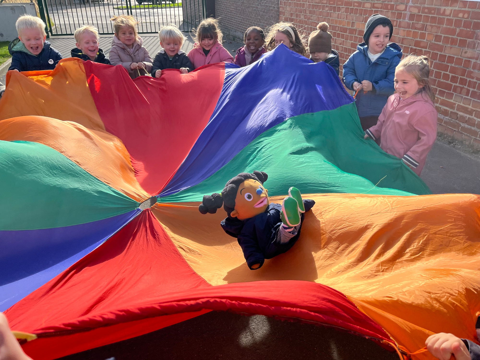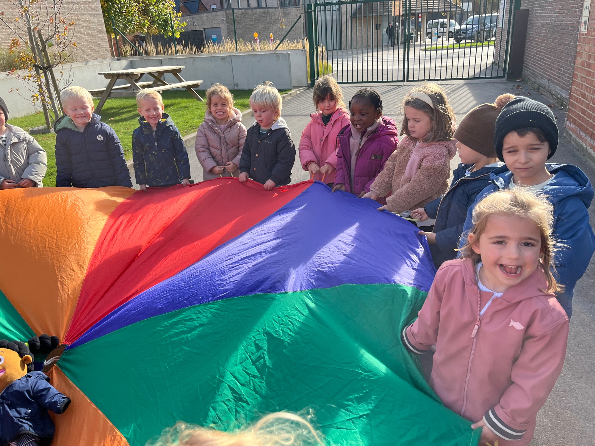 We maken wind met de parachute en laten Looeloe springen in de parachute