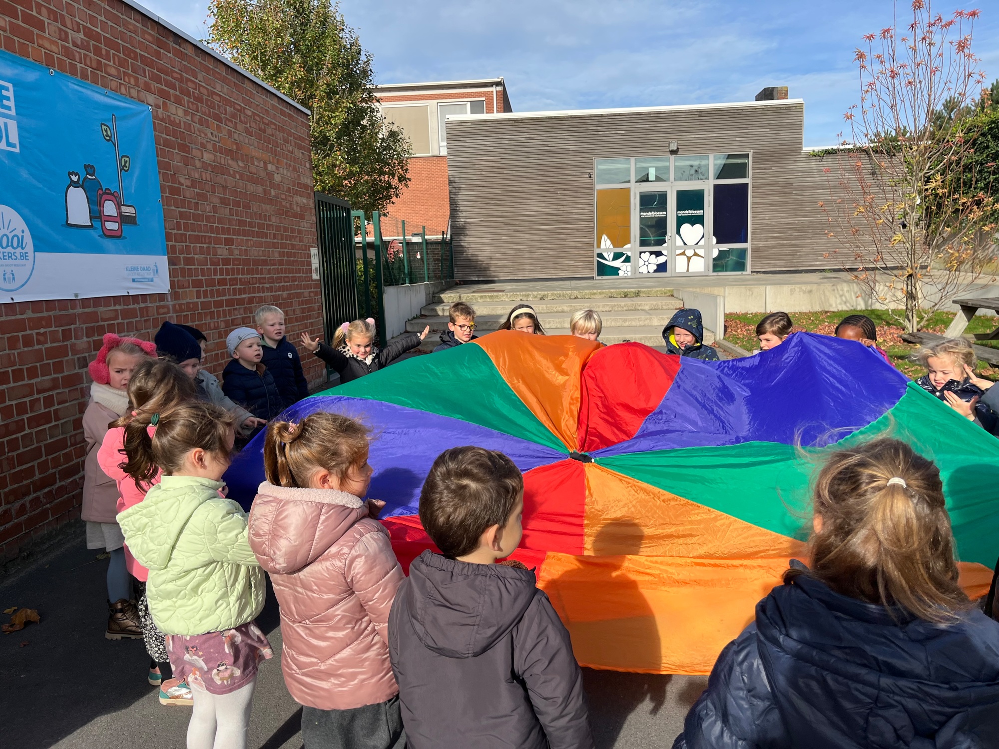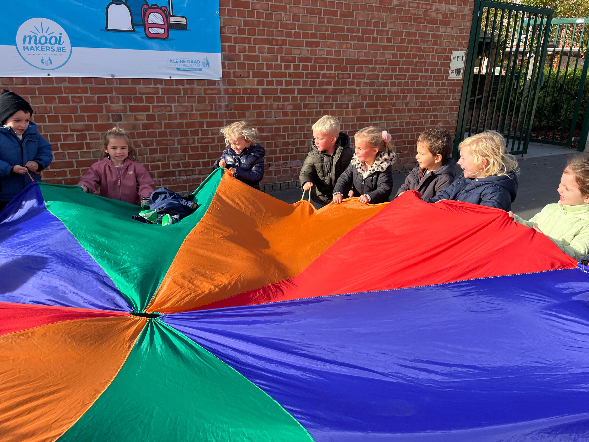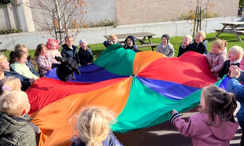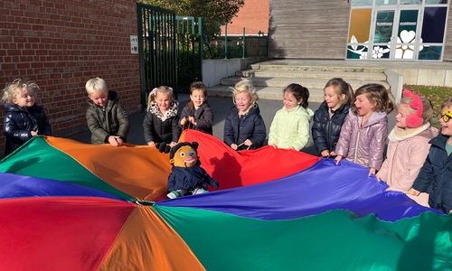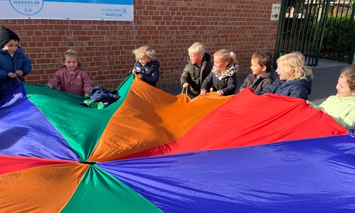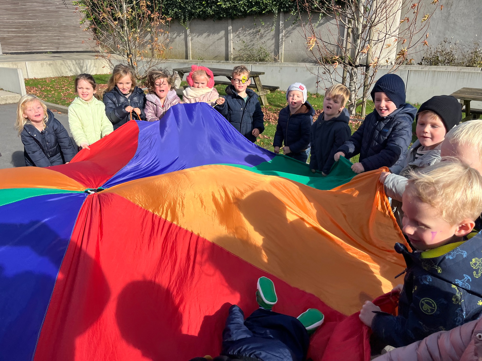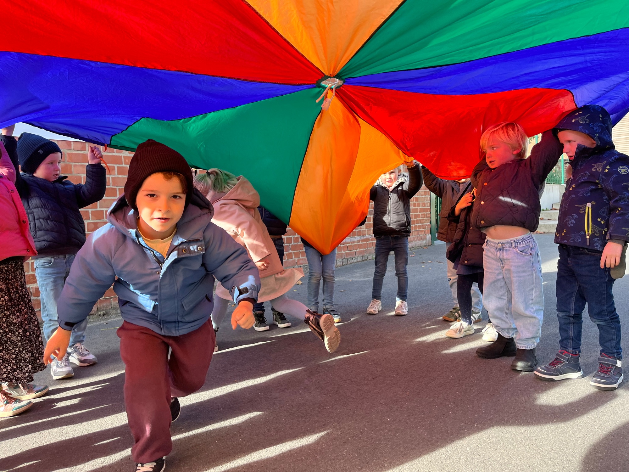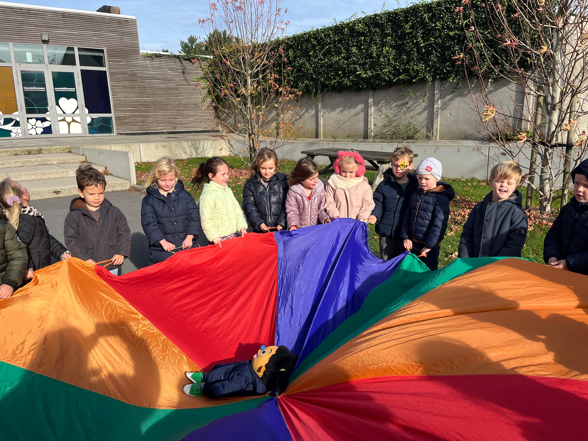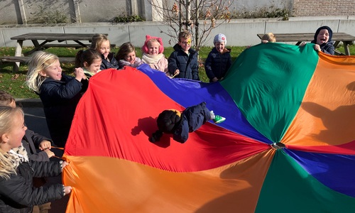 We maken wind met de parachute en laten Looeloe springen in de parachute
