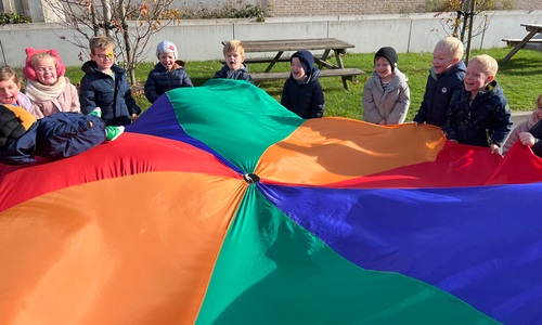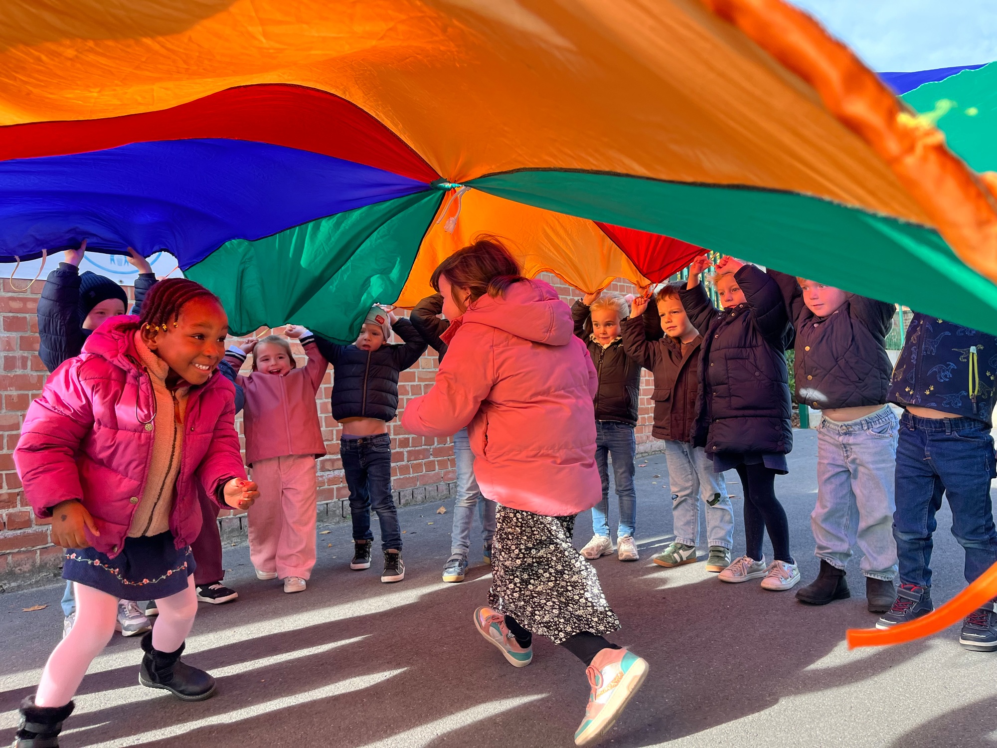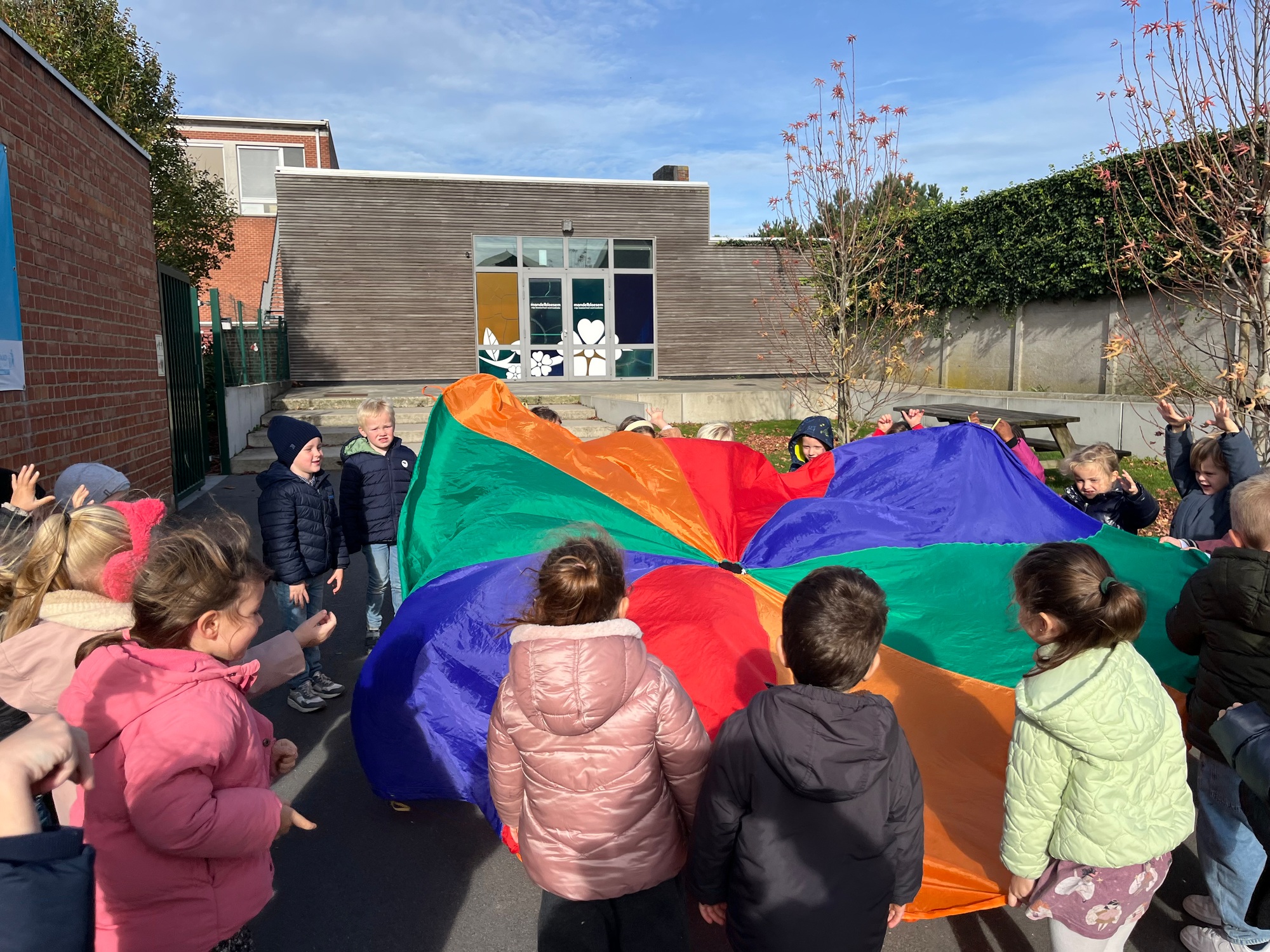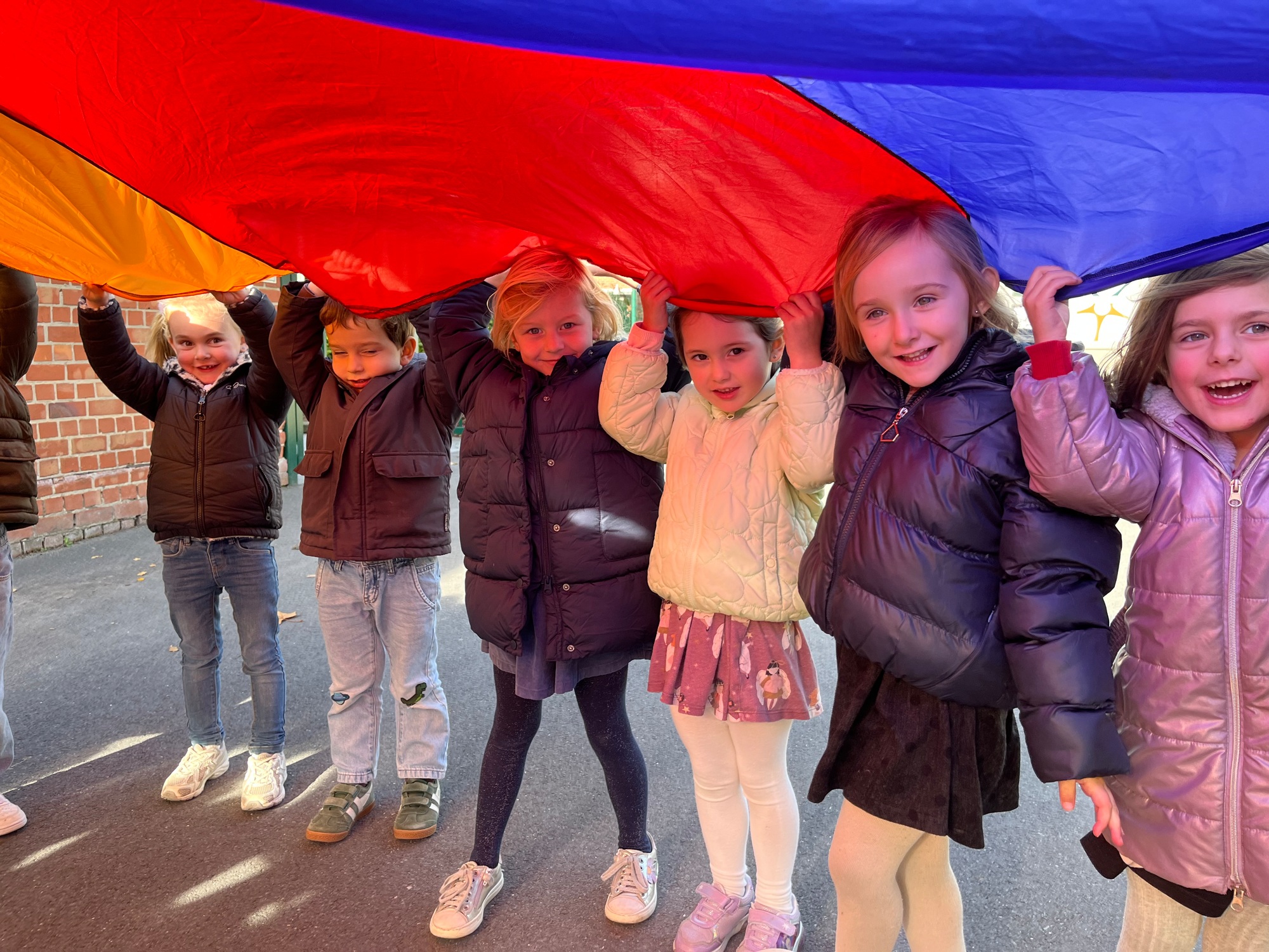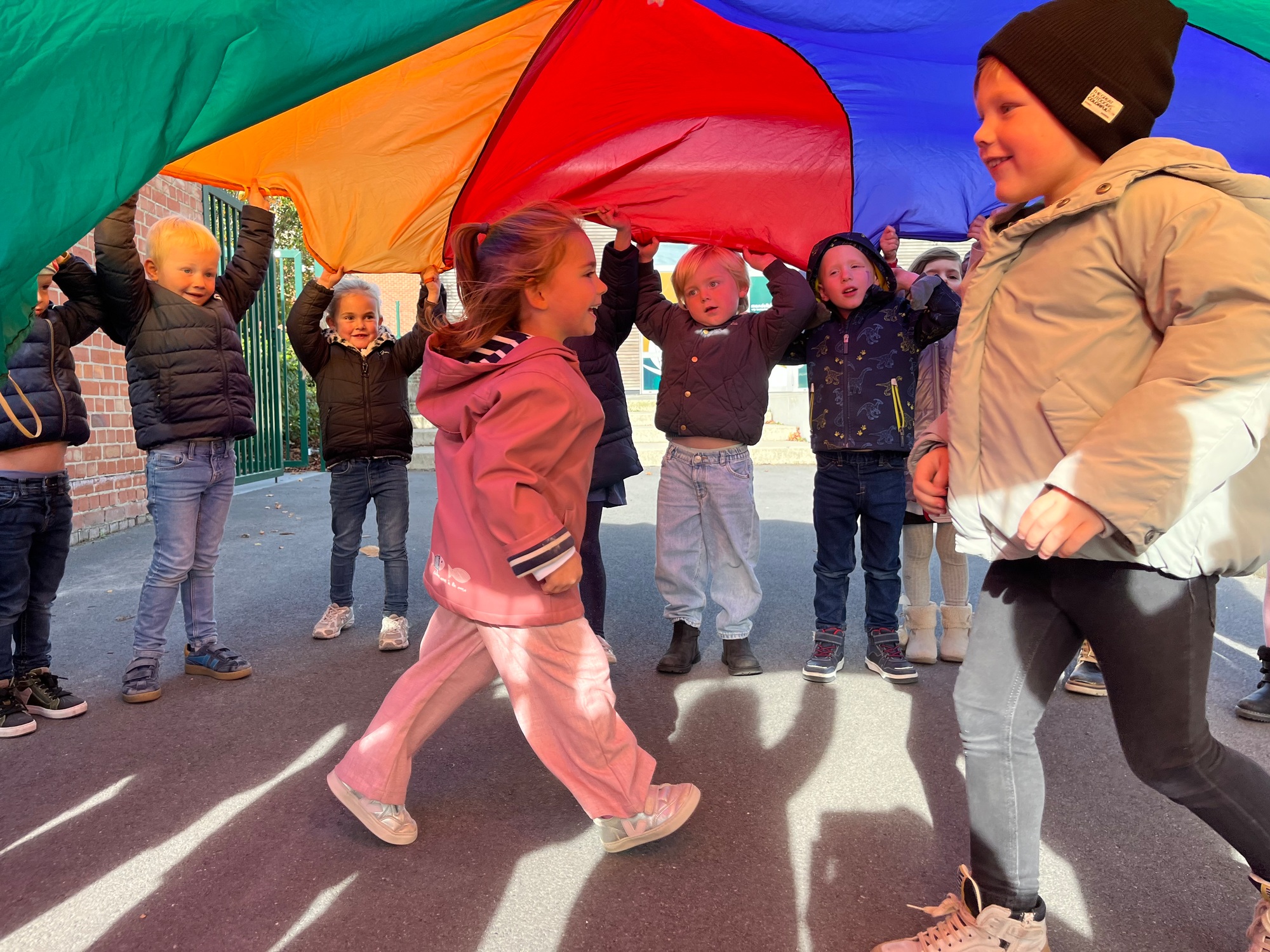 We maken wind met de parachute en laten Looeloe springen in de parachute