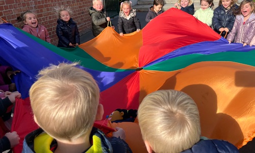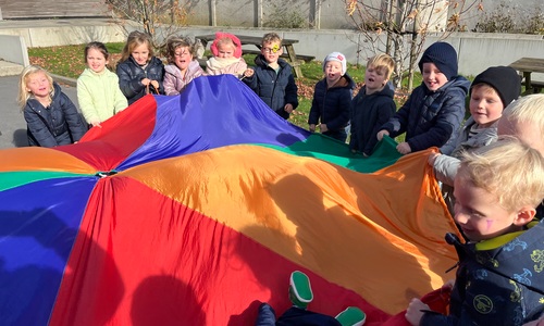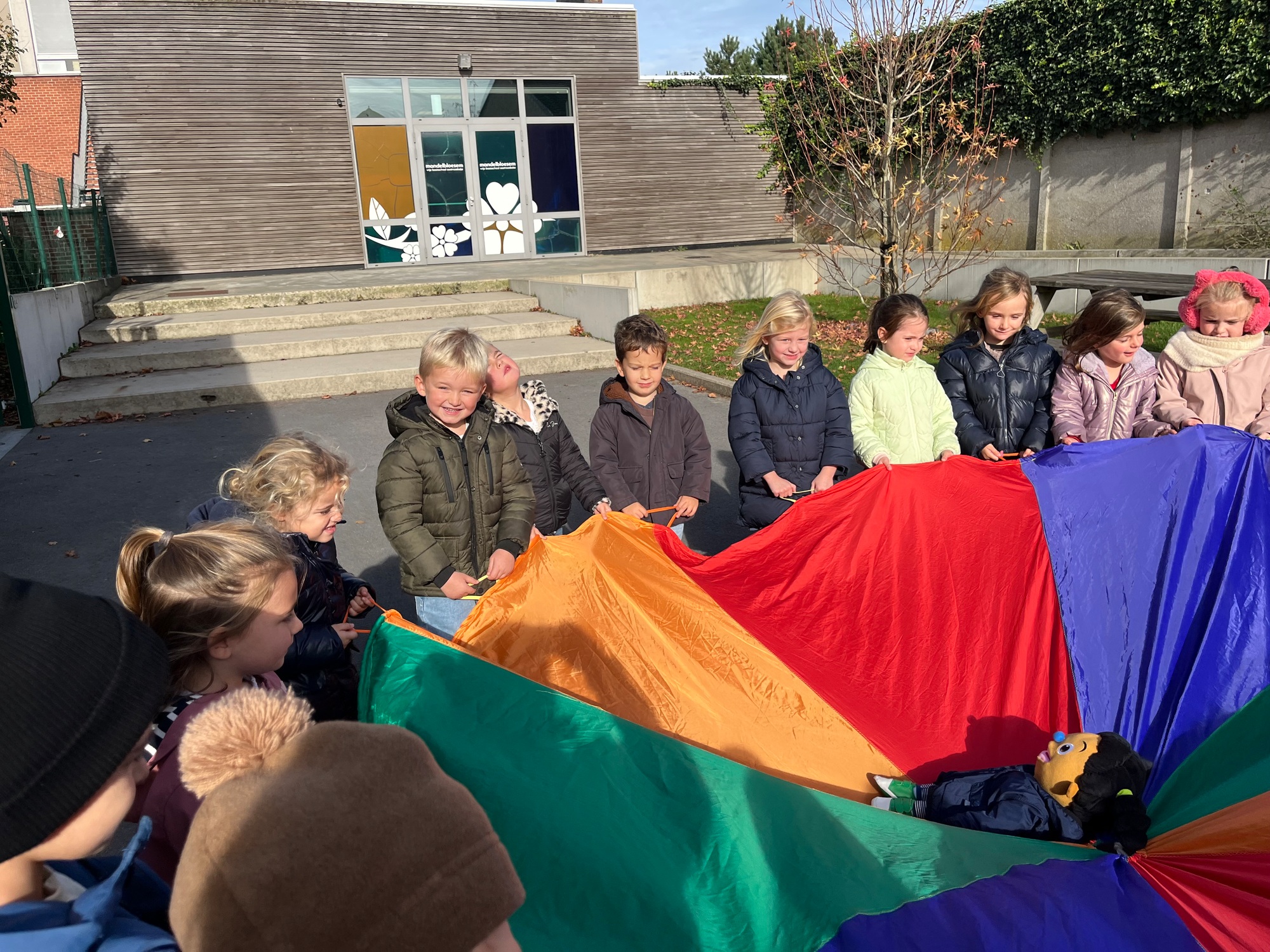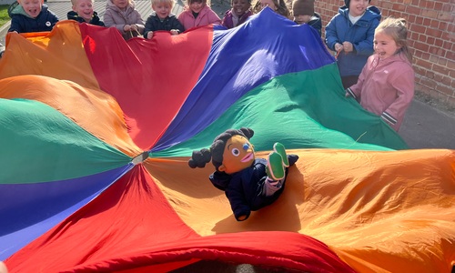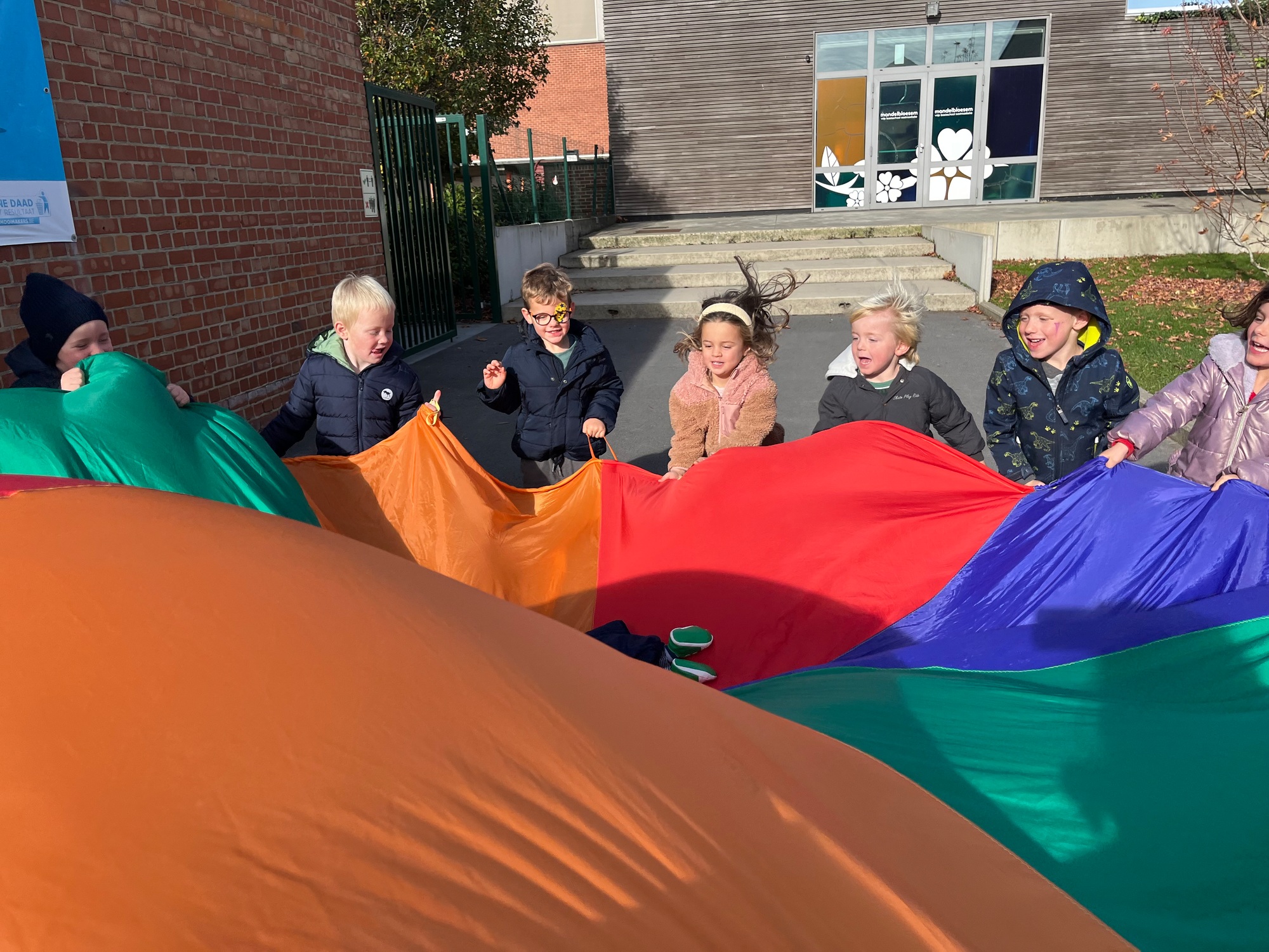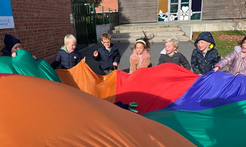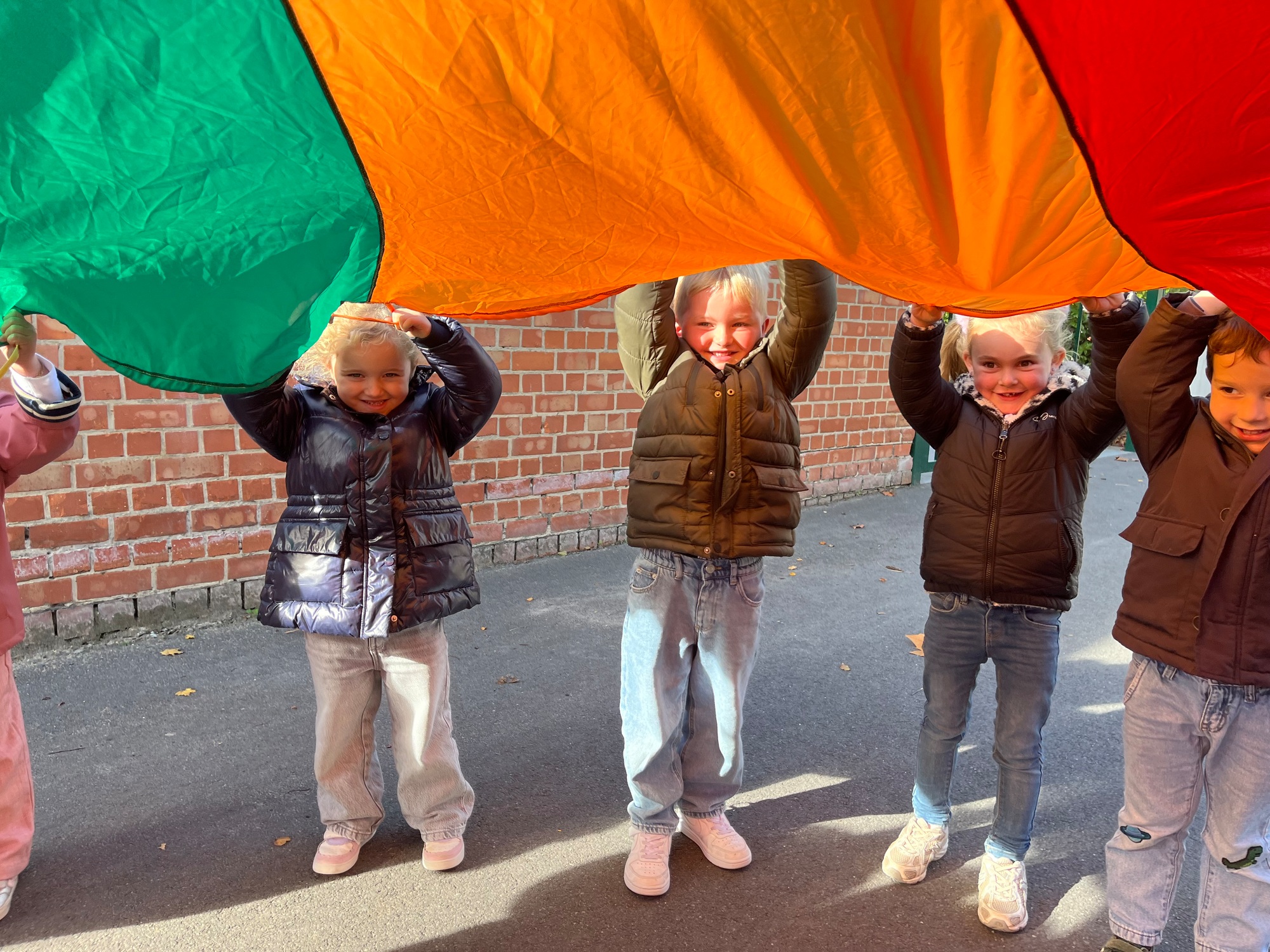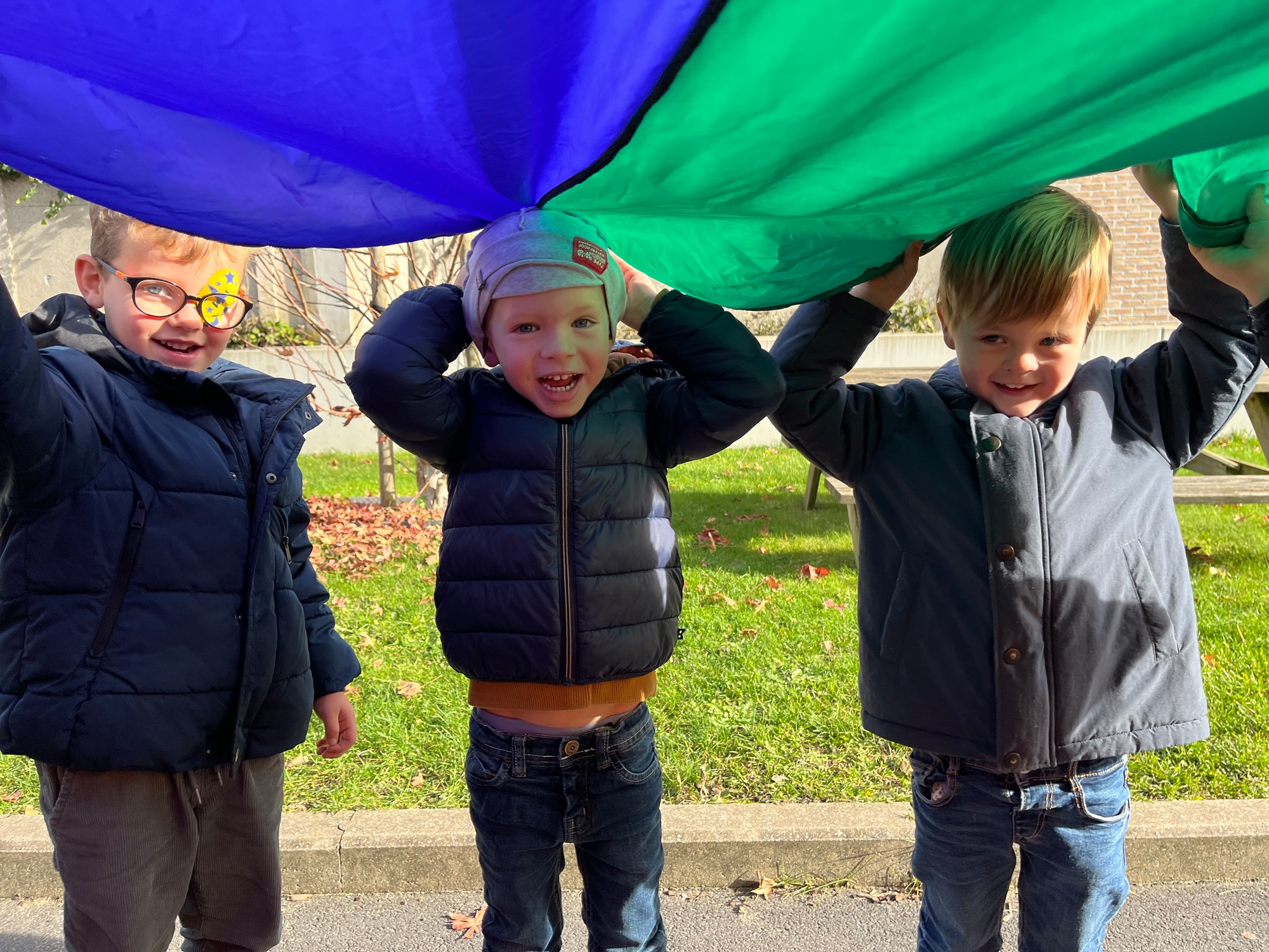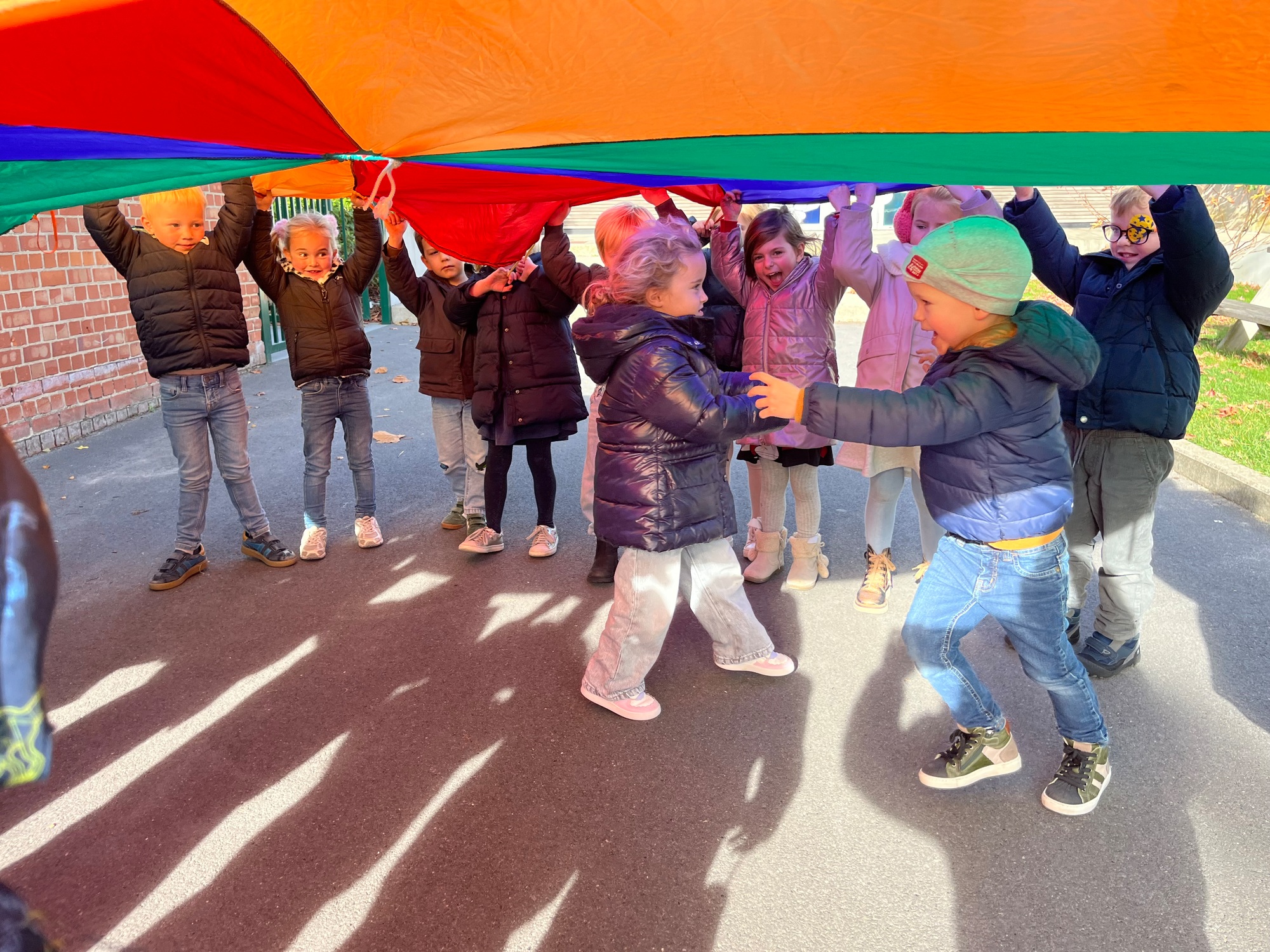 We maken wind met de parachute en laten Looeloe springen in de parachute
