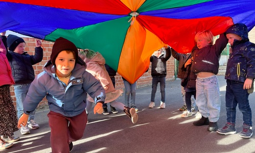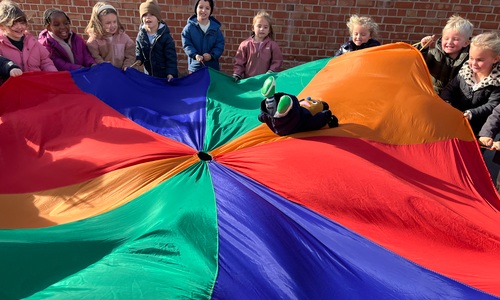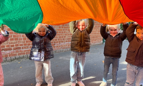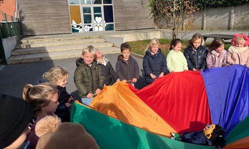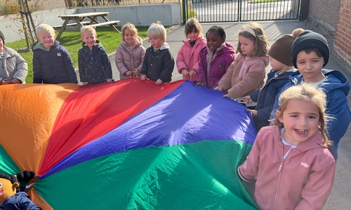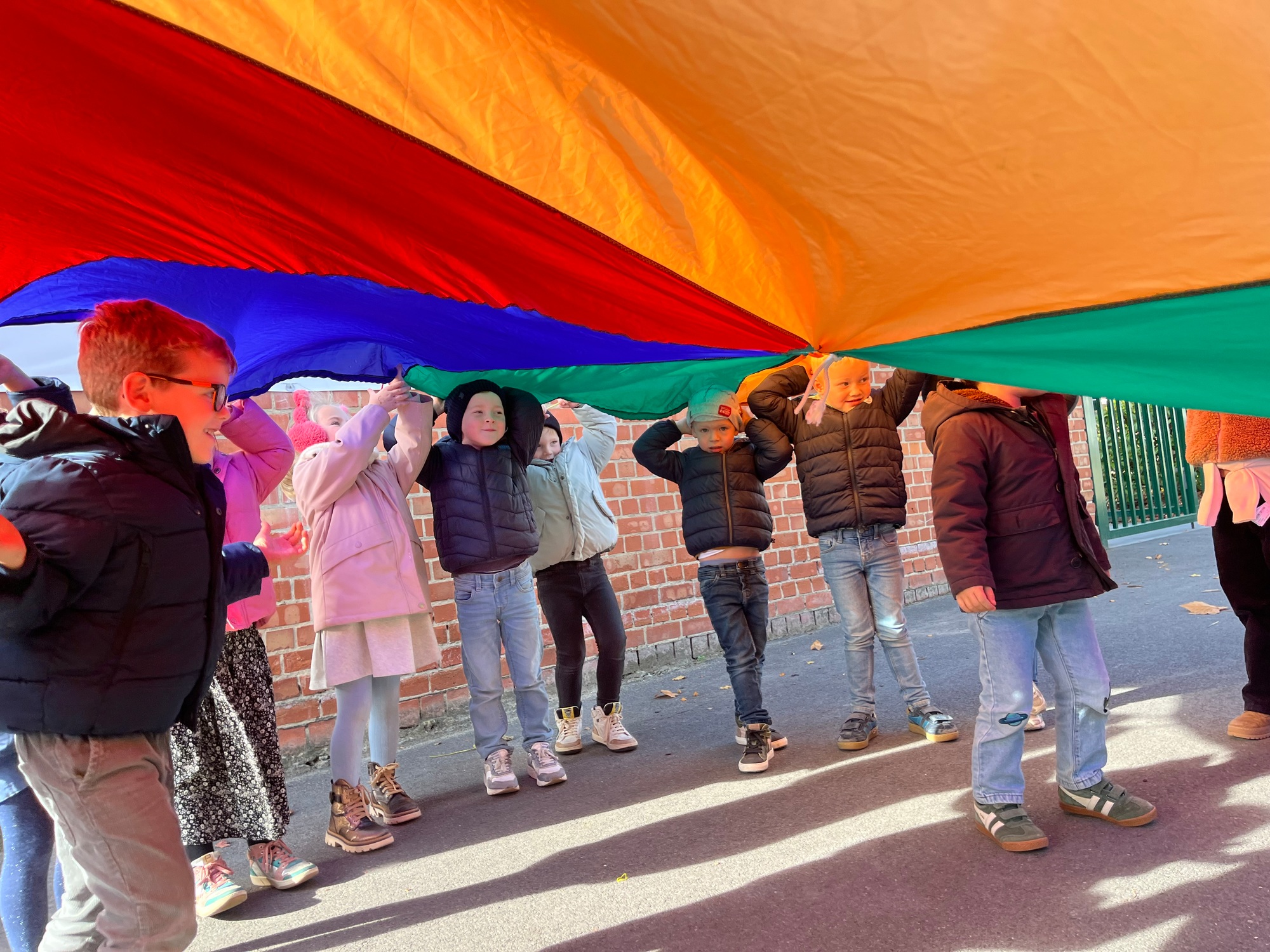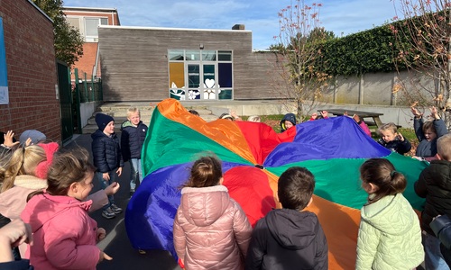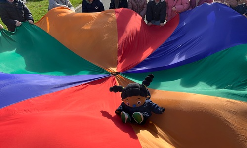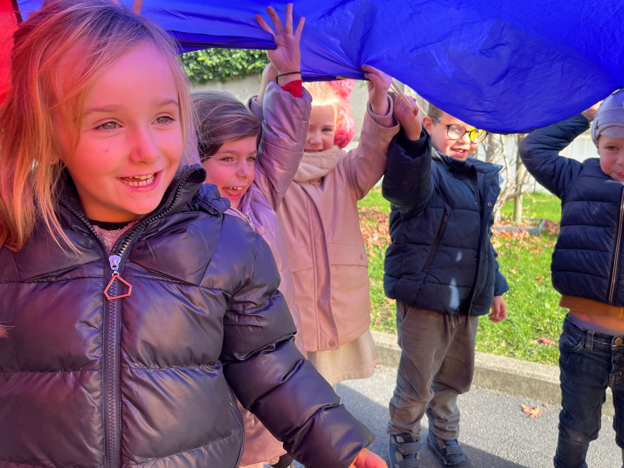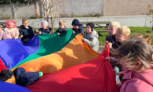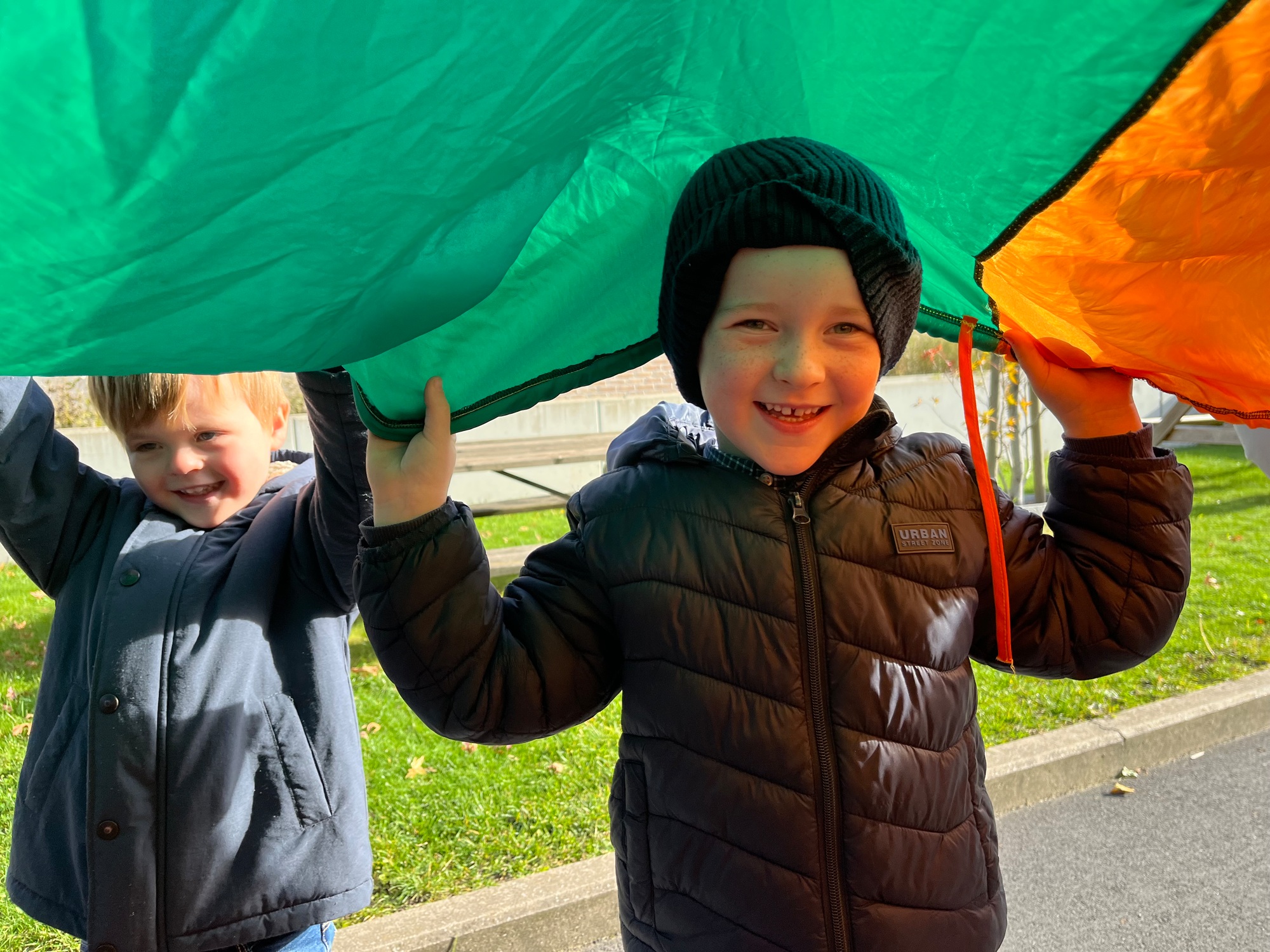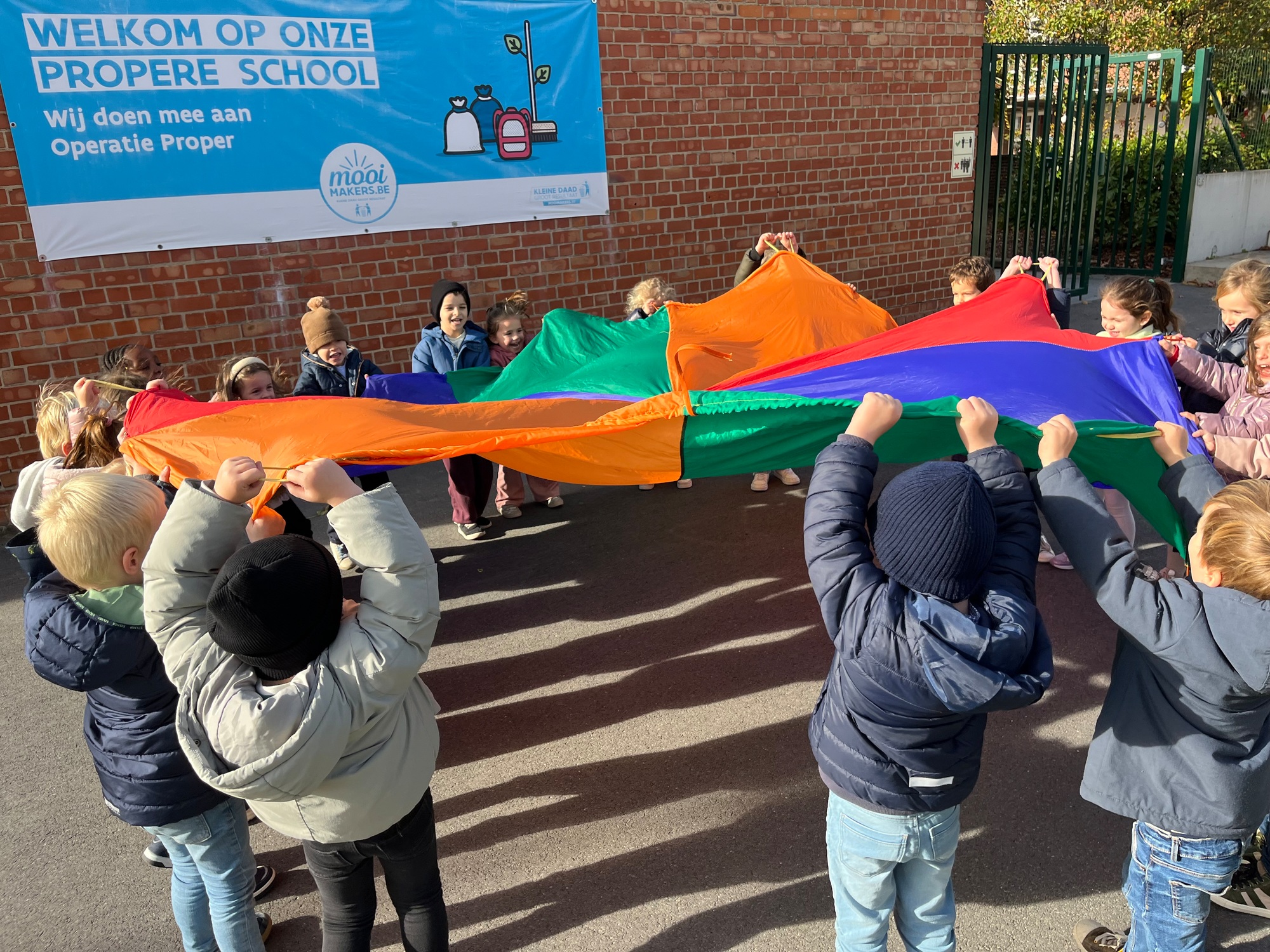 We maken wind met de parachute en laten Looeloe springen in de parachute