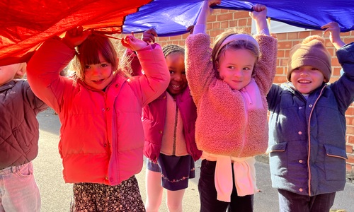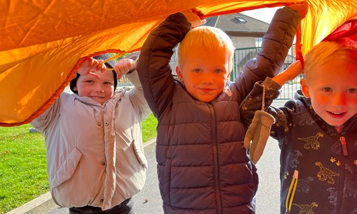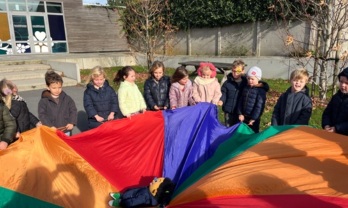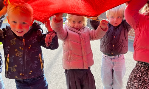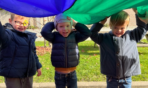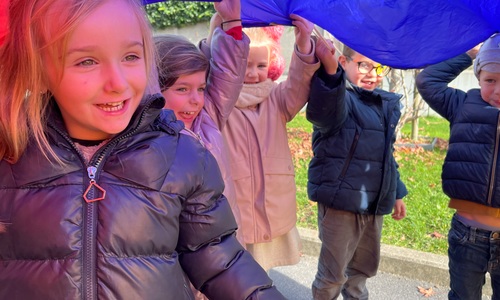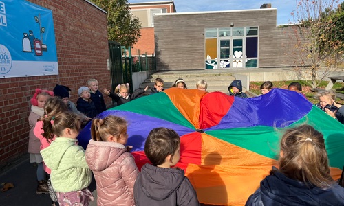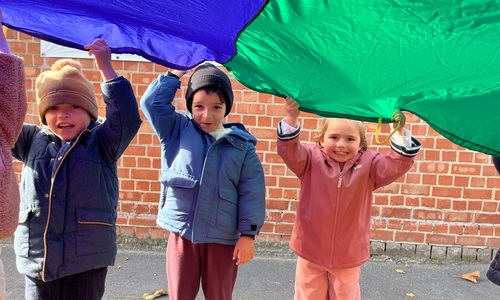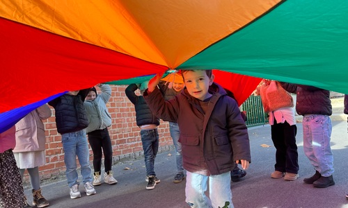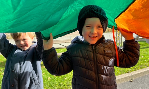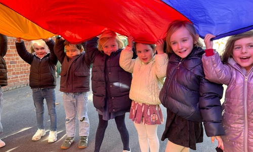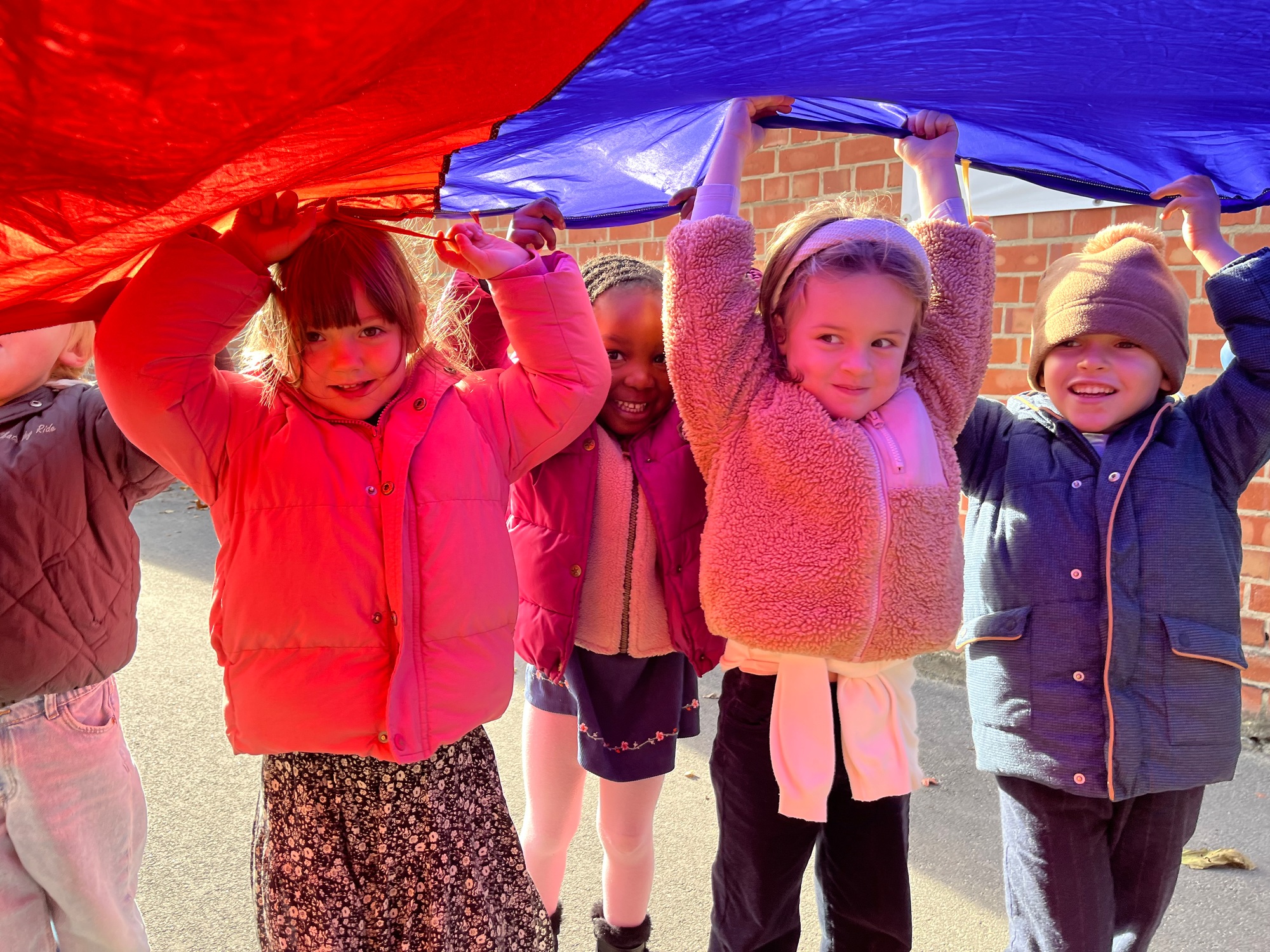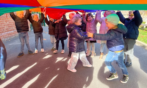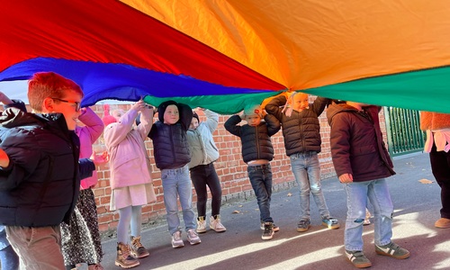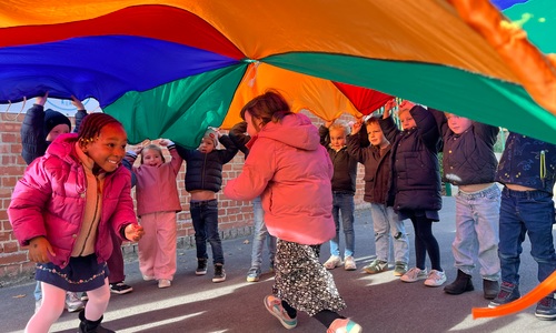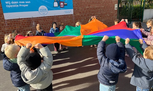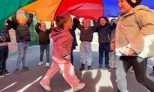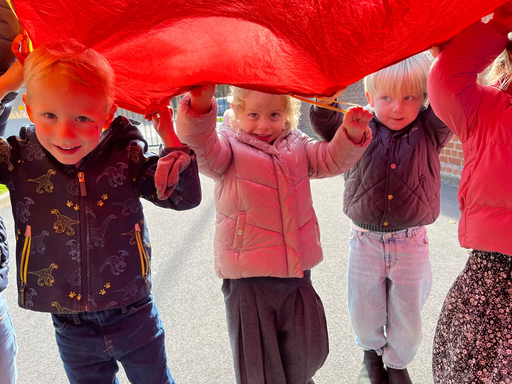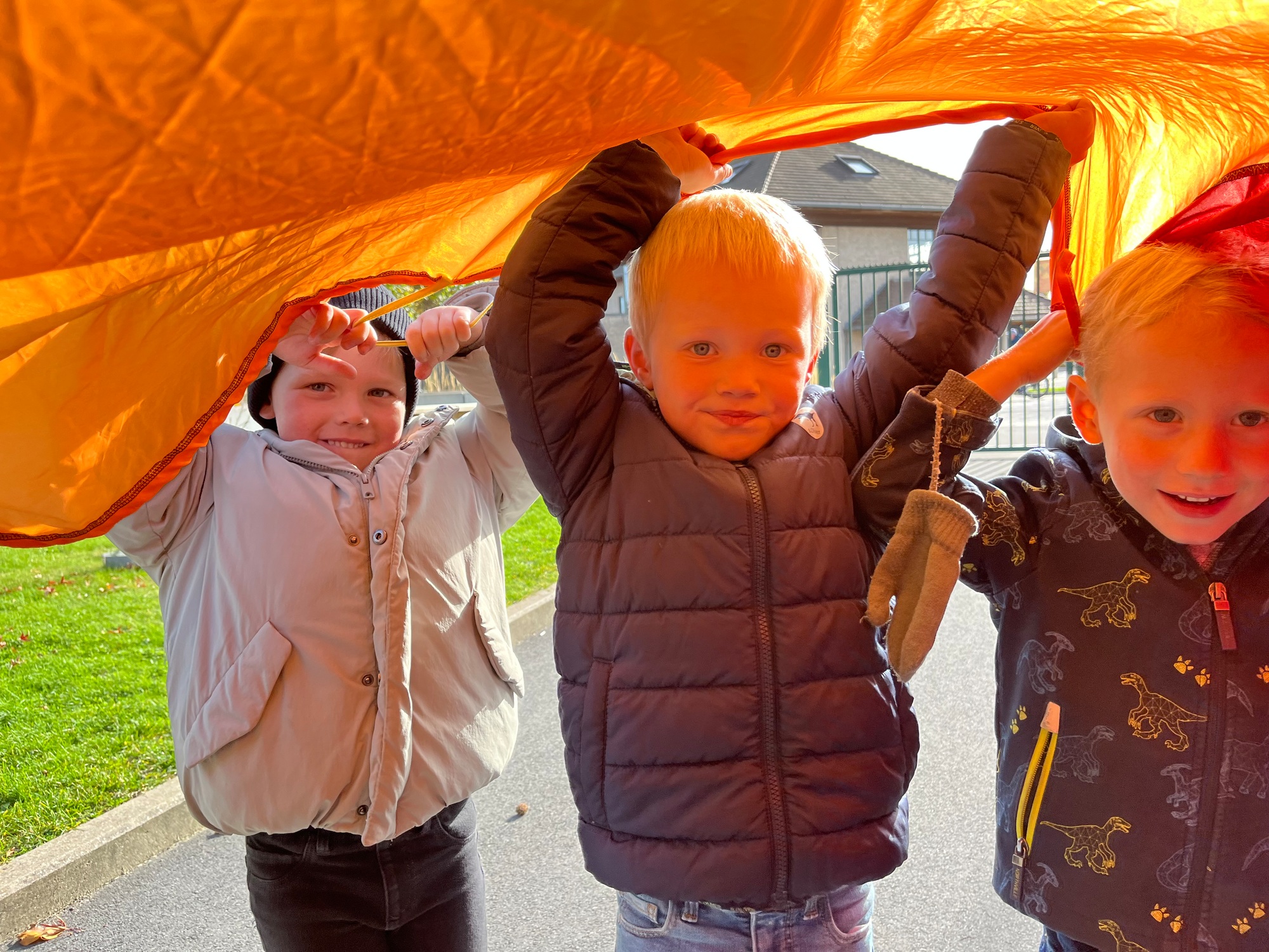 We maken wind met de parachute en laten Looeloe springen in de parachute