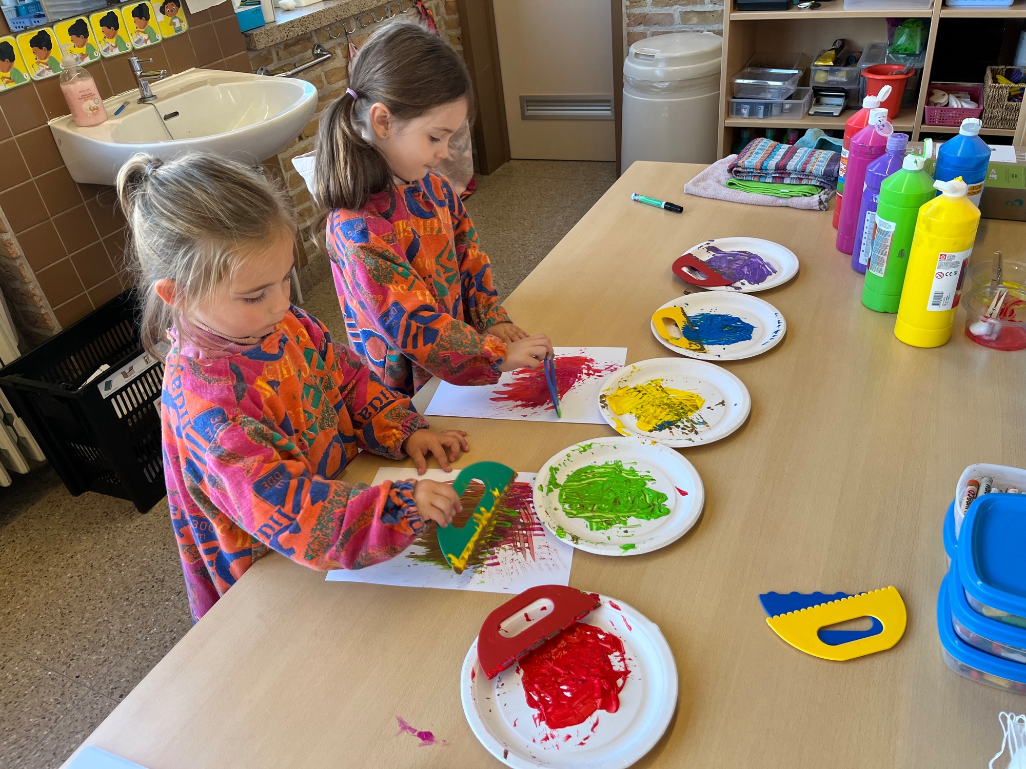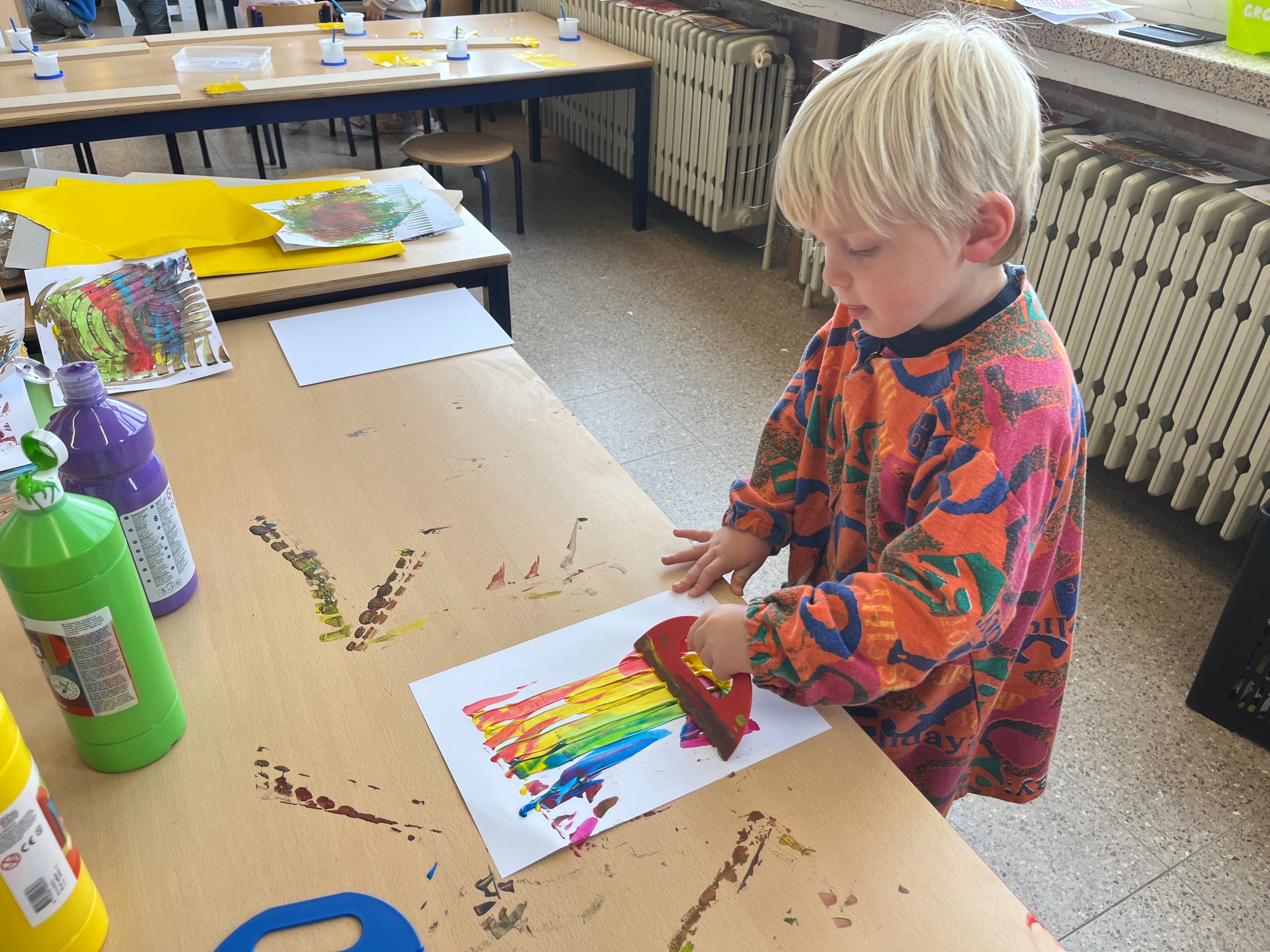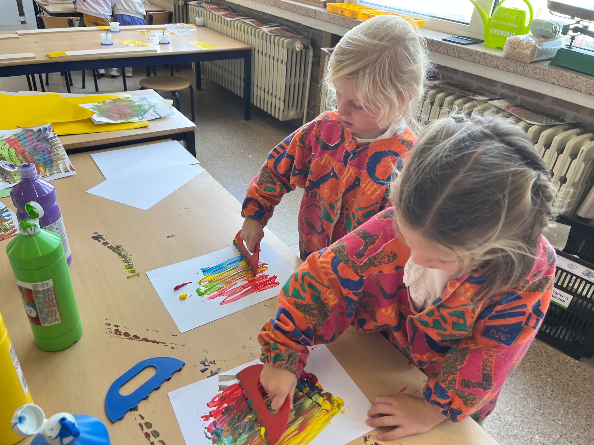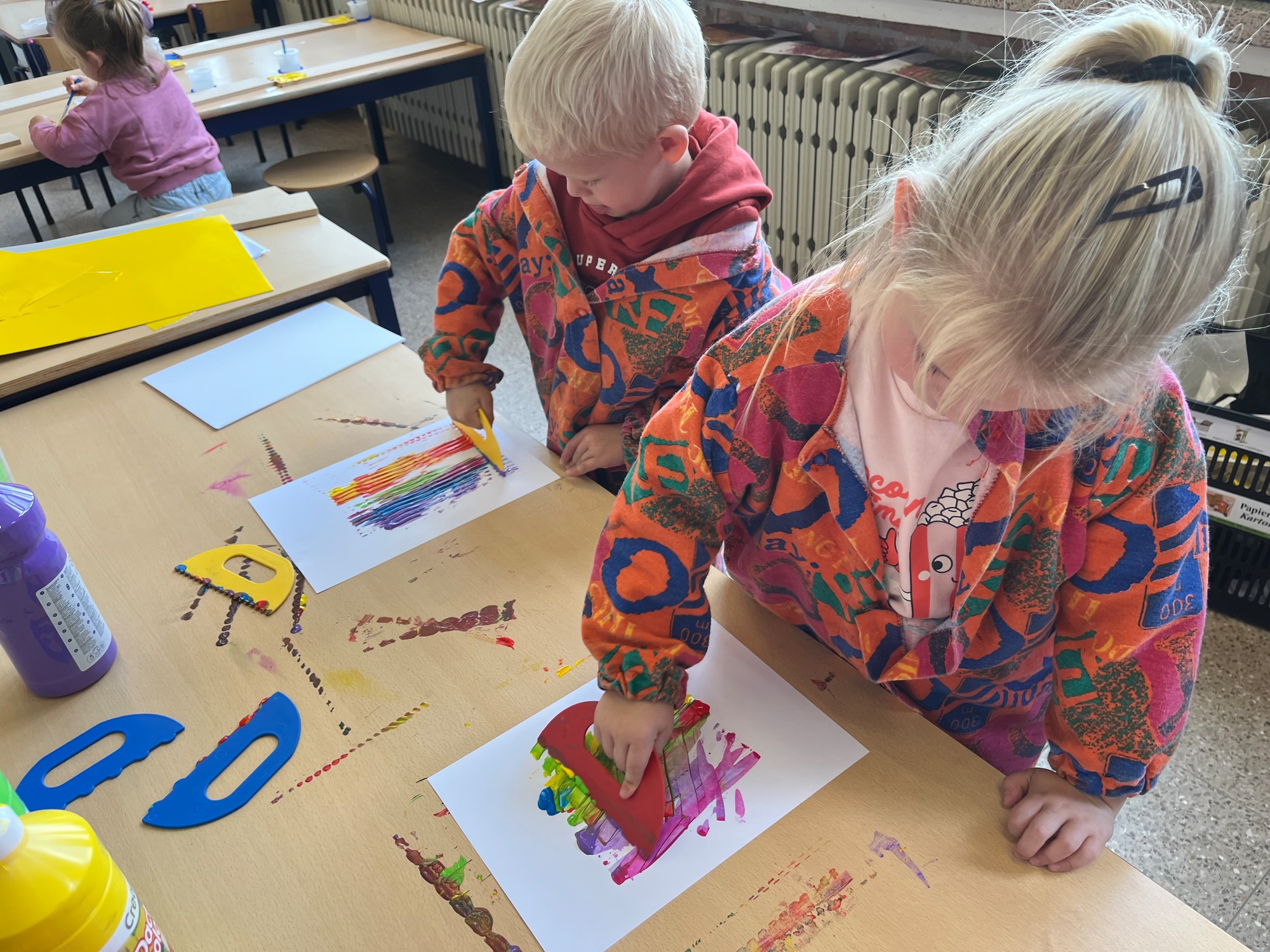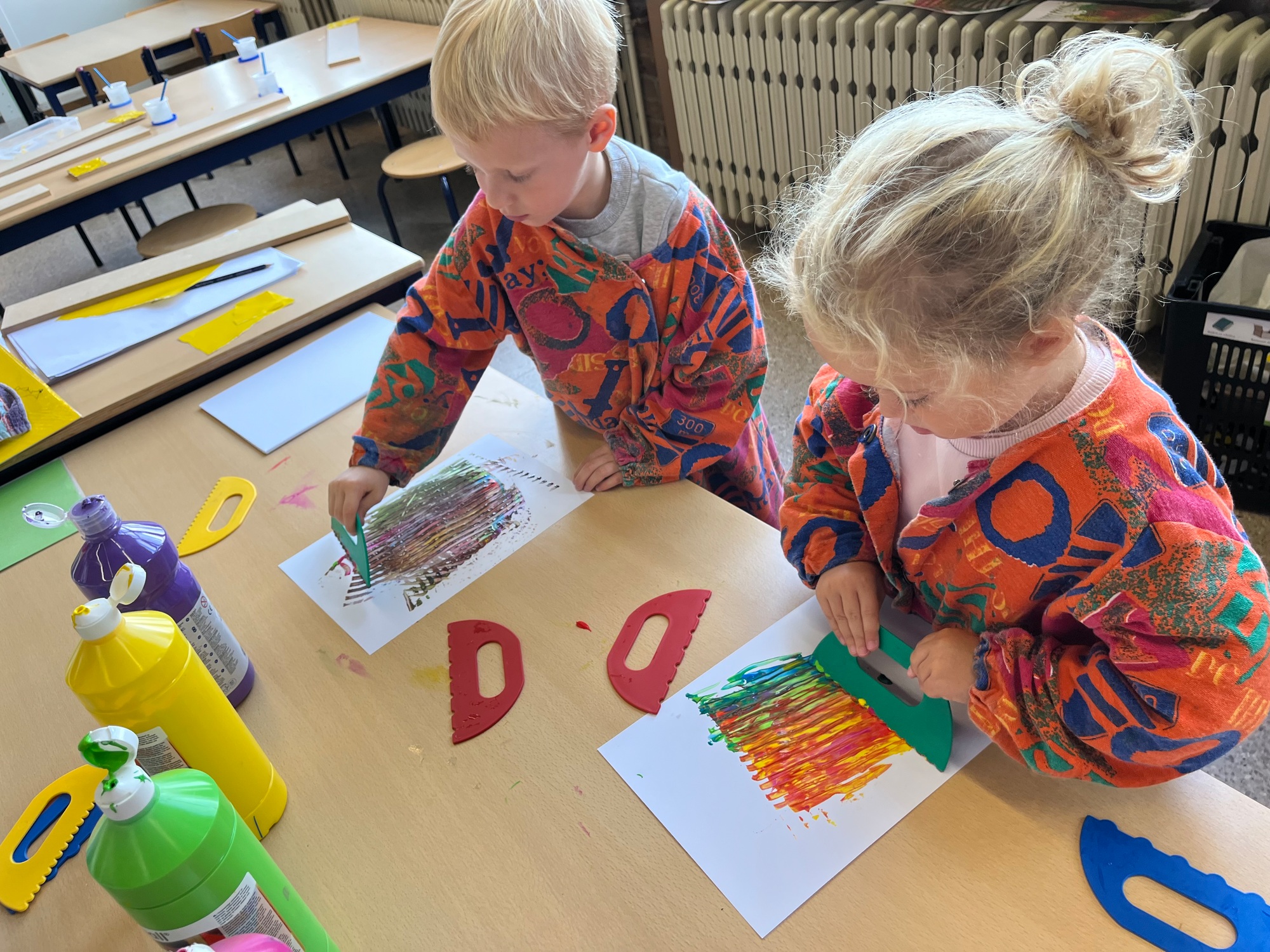 Met een speciale verfspatel schilderden we een kleurenmonster, daarna hebben we het monster geprikt en krullenbollen deden we als onderlaag.
