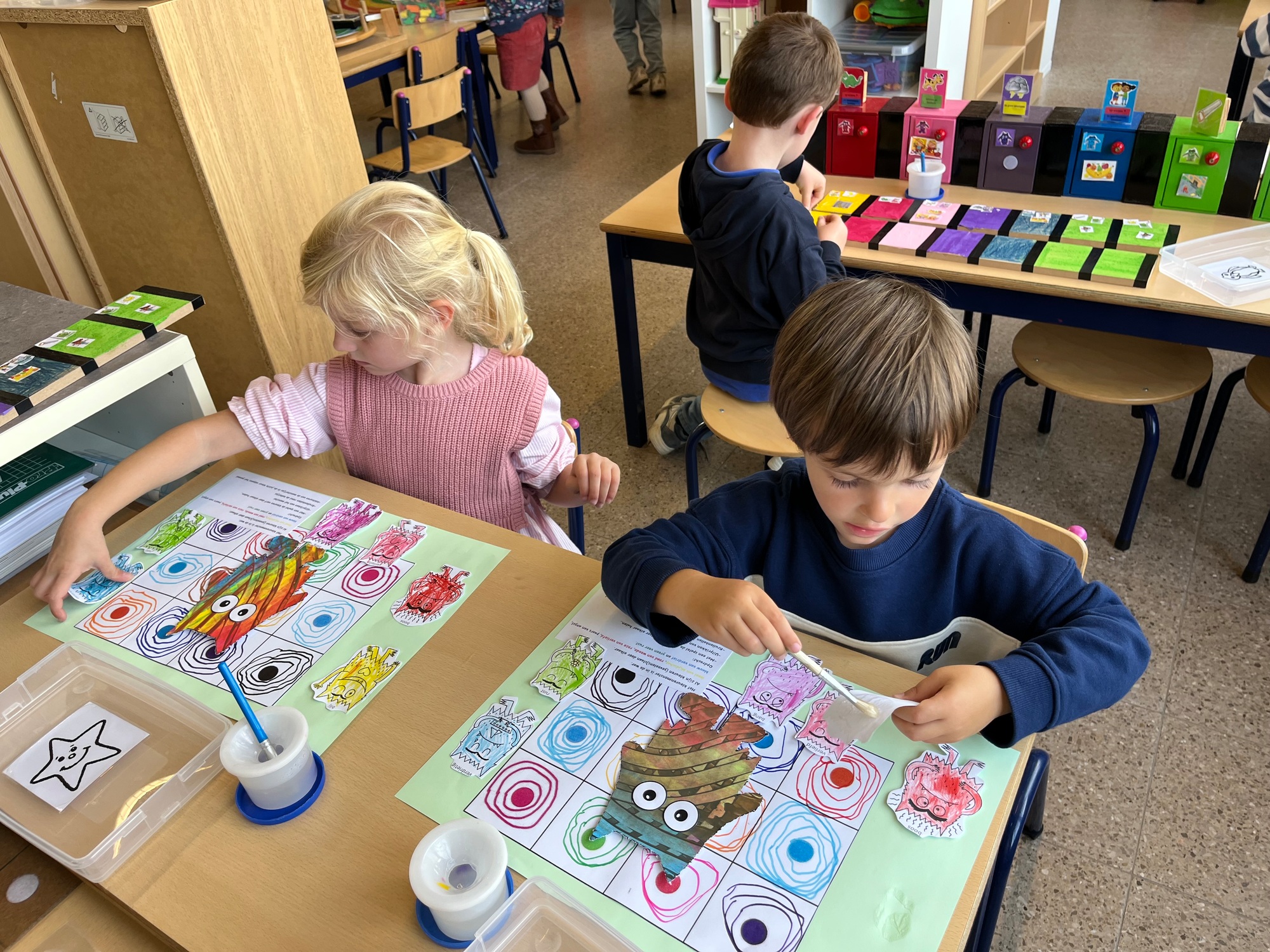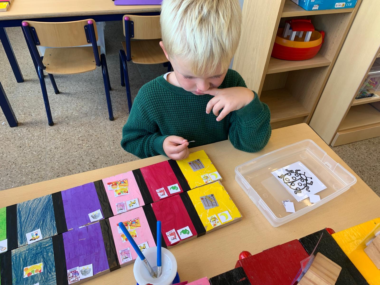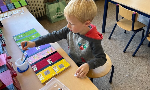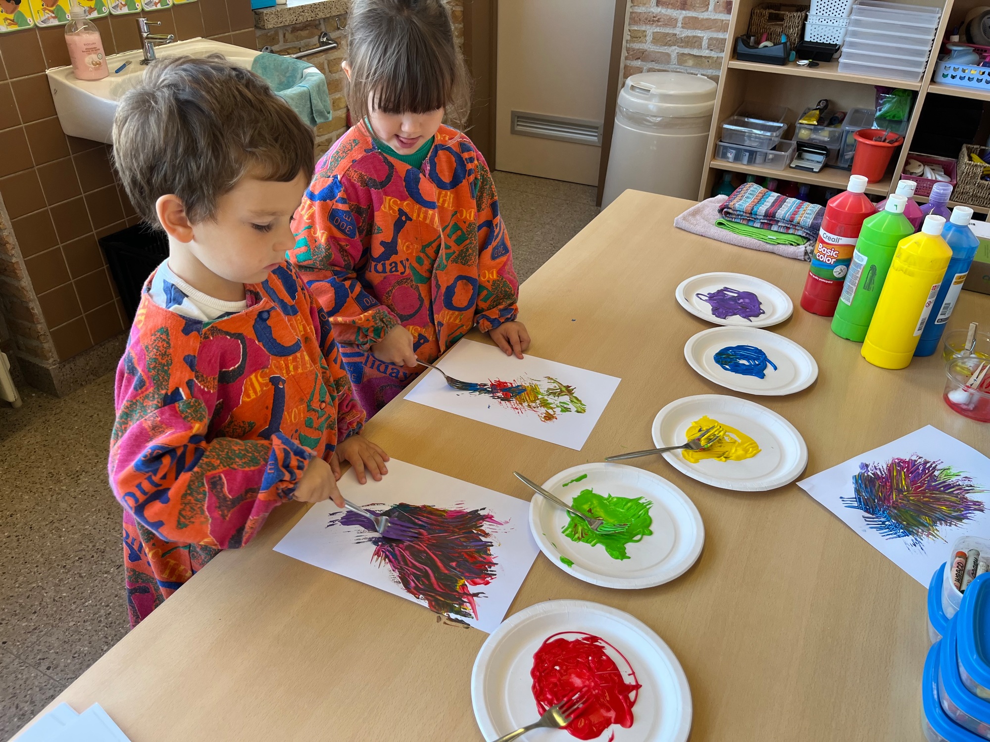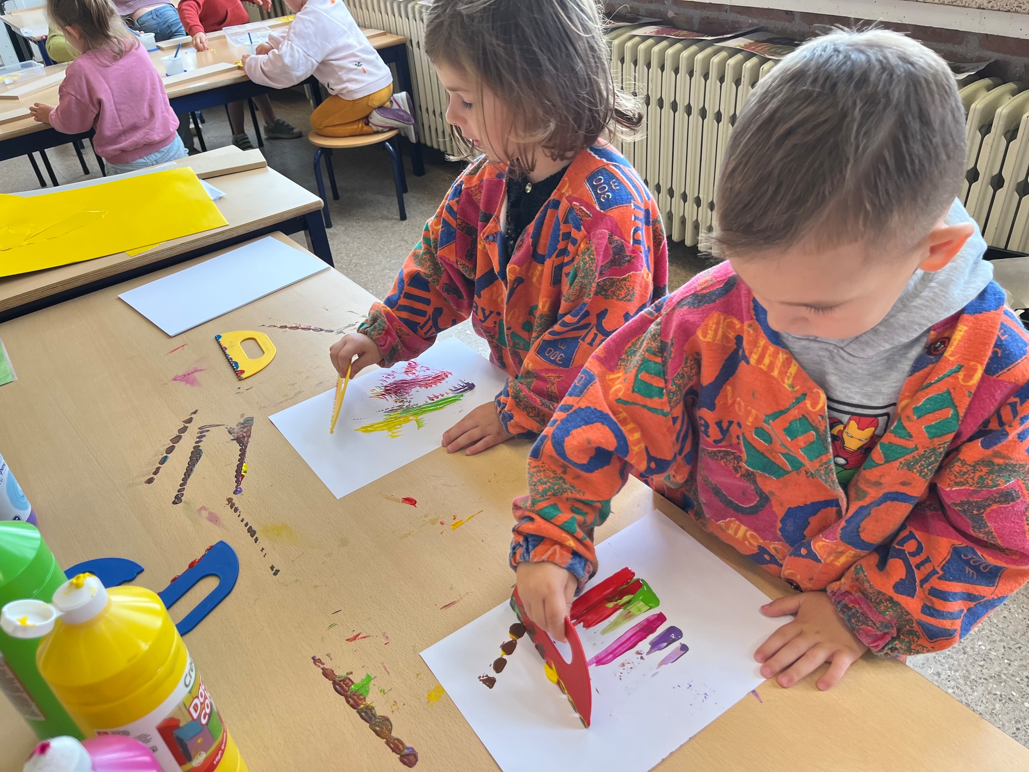 Met een speciale verfspatel schilderden we een kleurenmonster, daarna hebben we het monster geprikt en krullenbollen deden we als onderlaag.