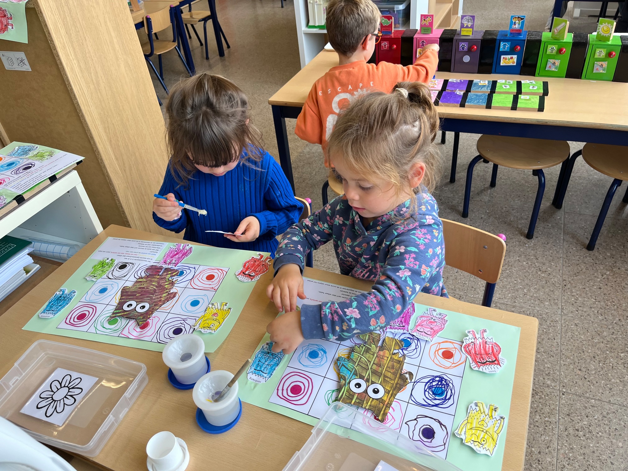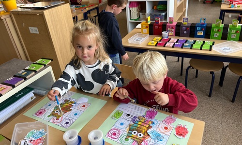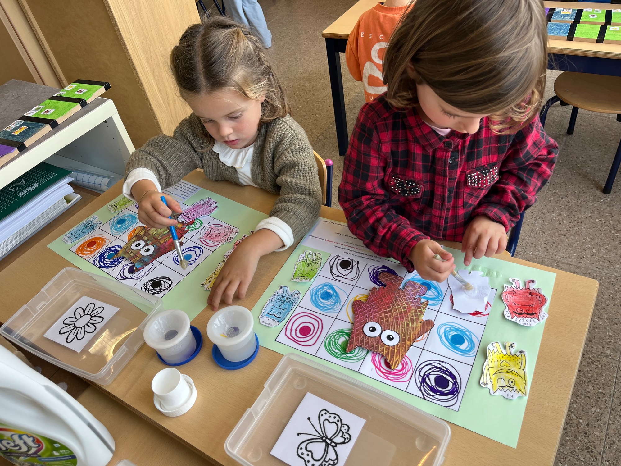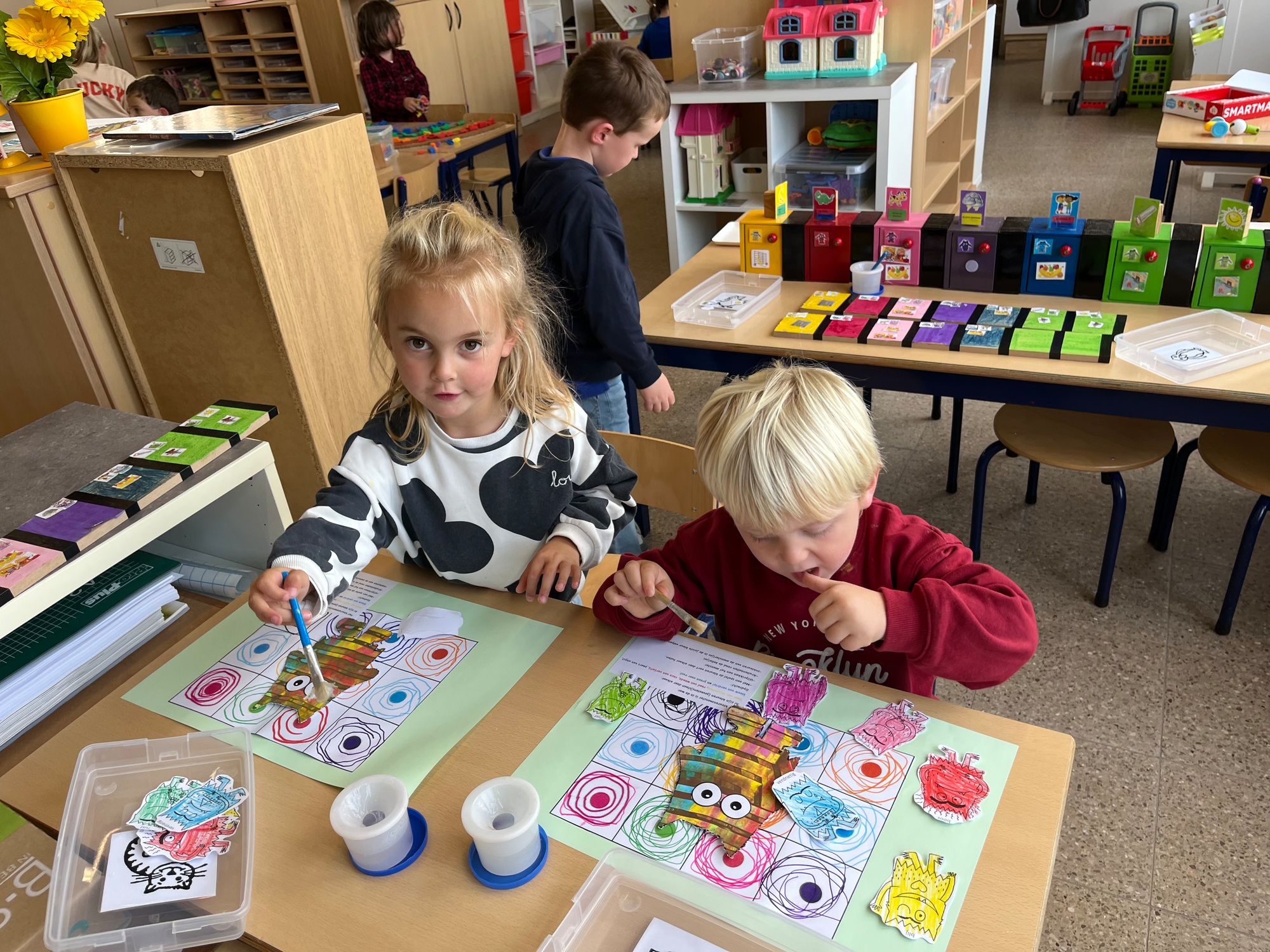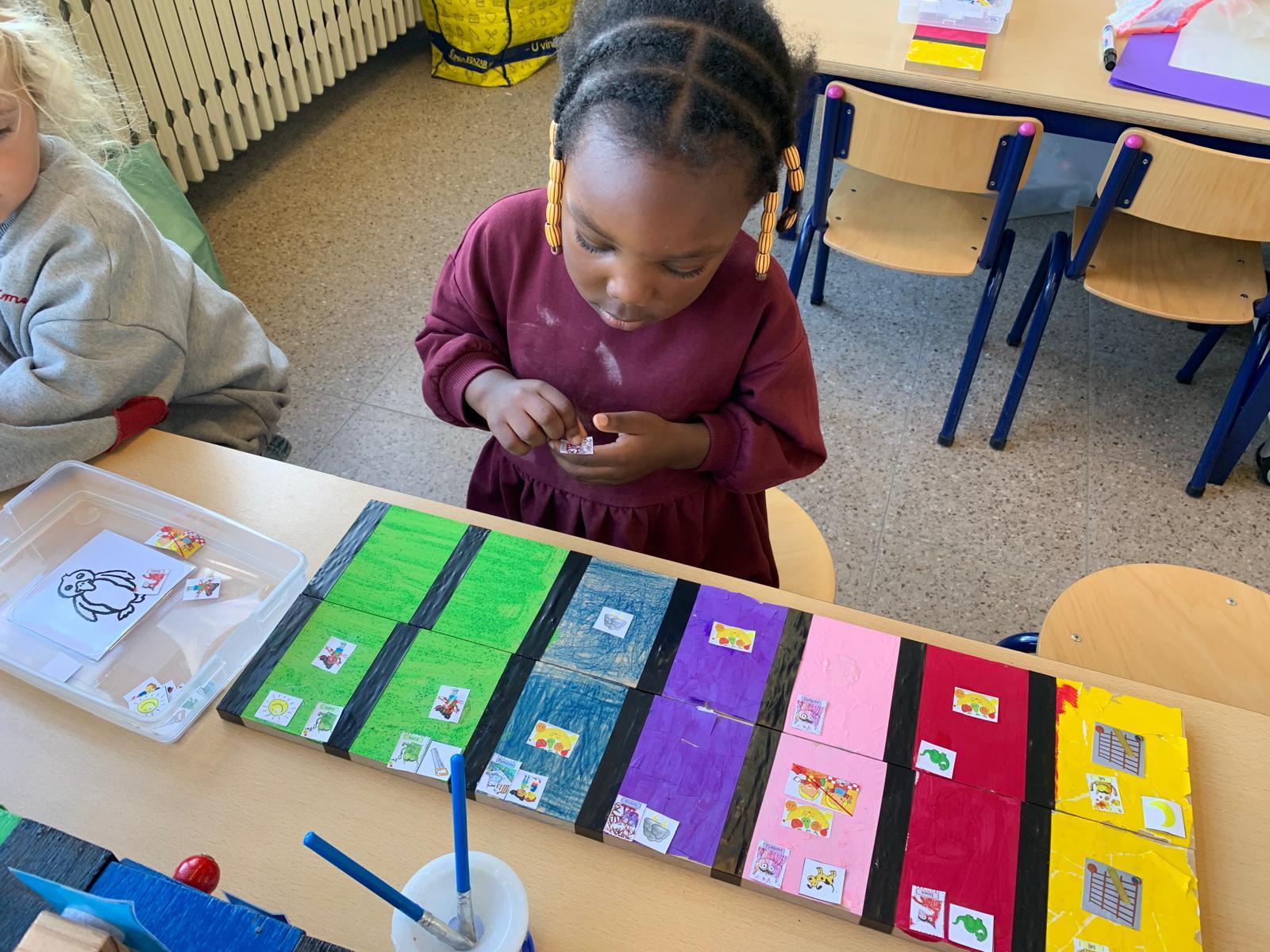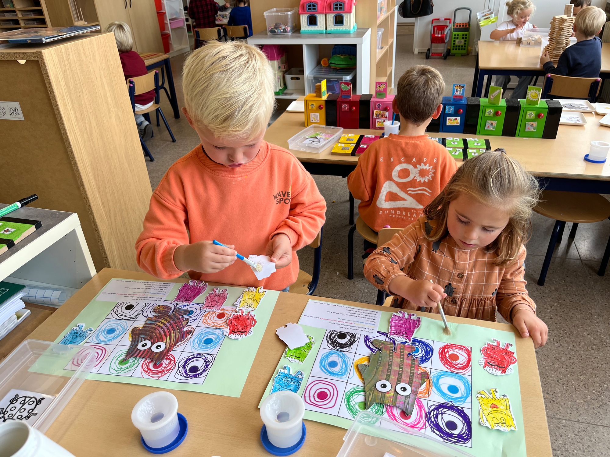 Met een speciale verfspatel schilderden we een kleurenmonster, daarna hebben we het monster geprikt en krullenbollen deden we als onderlaag.