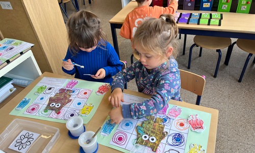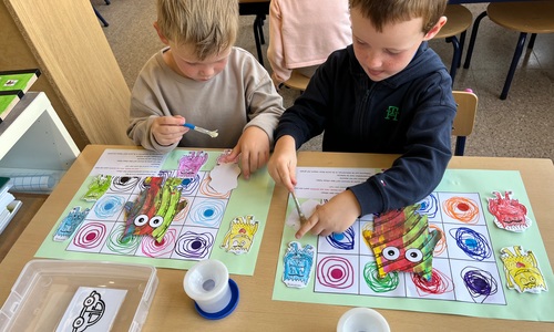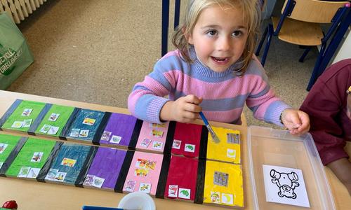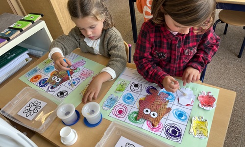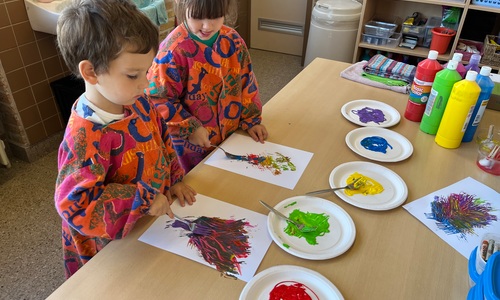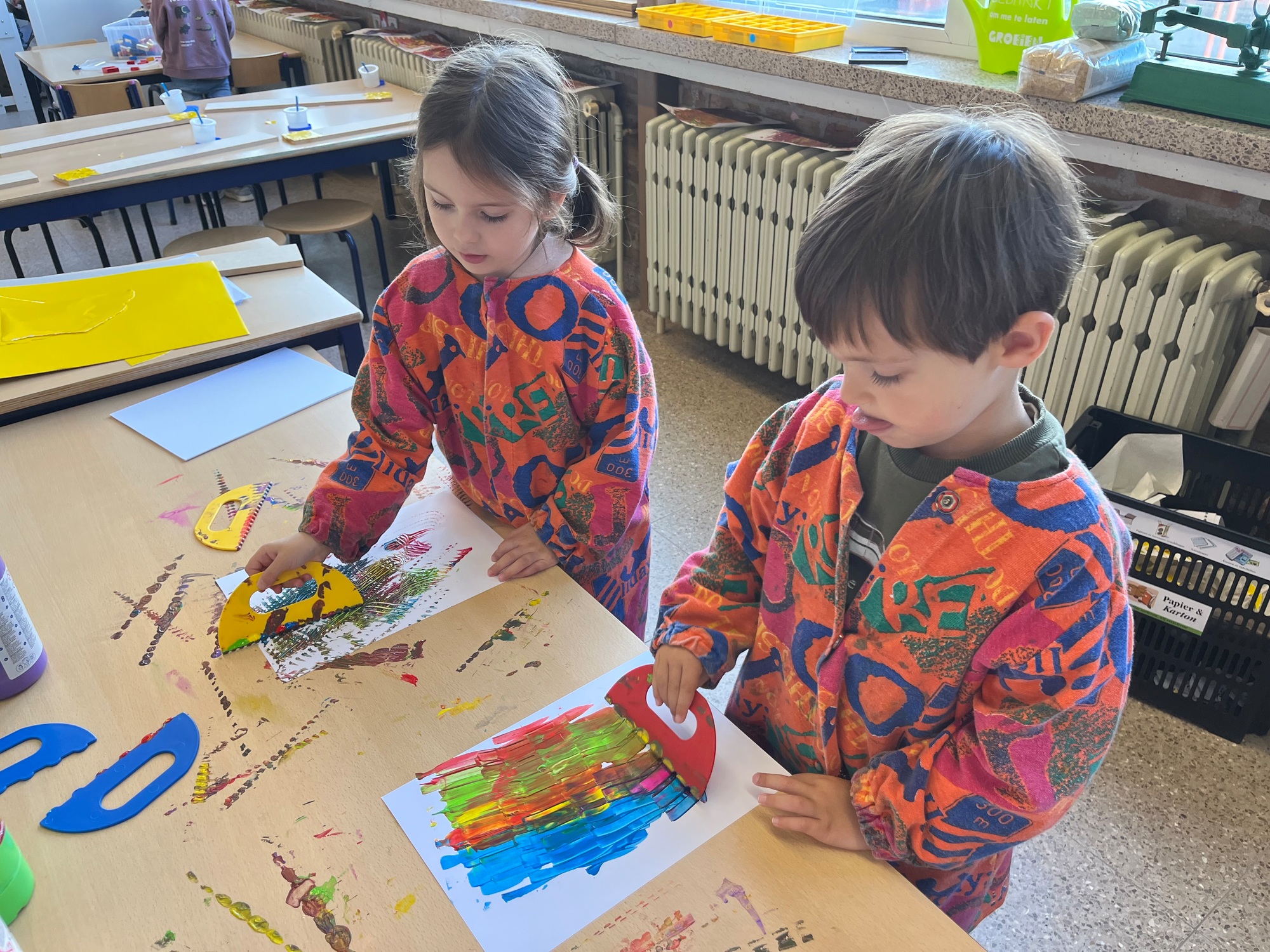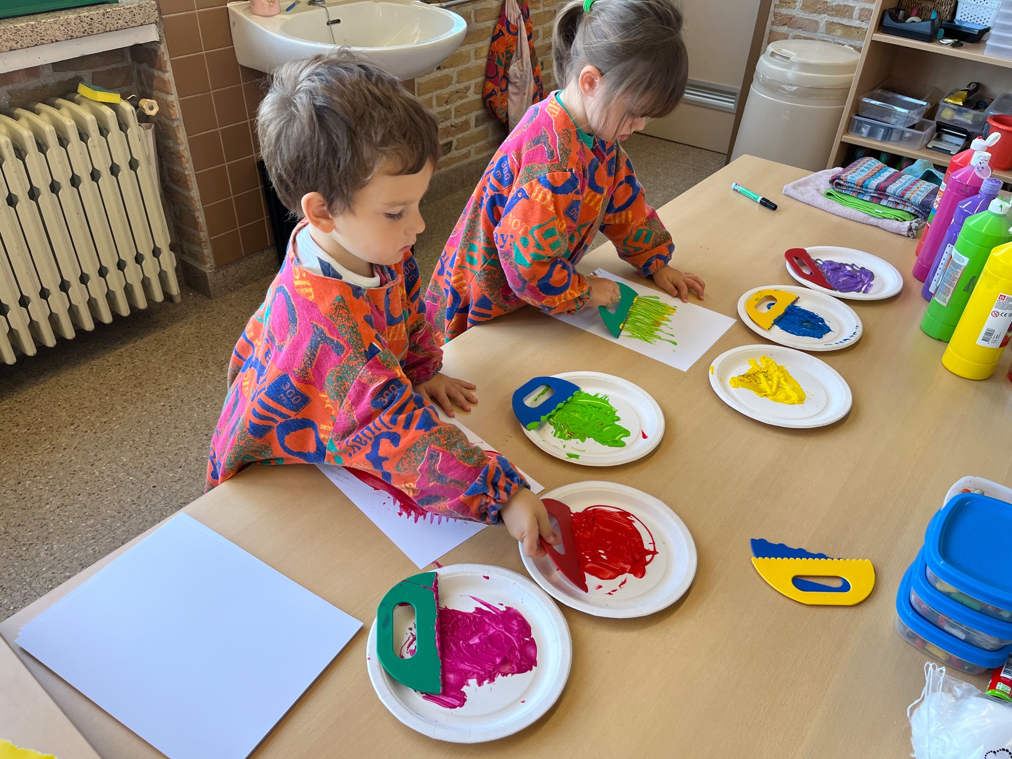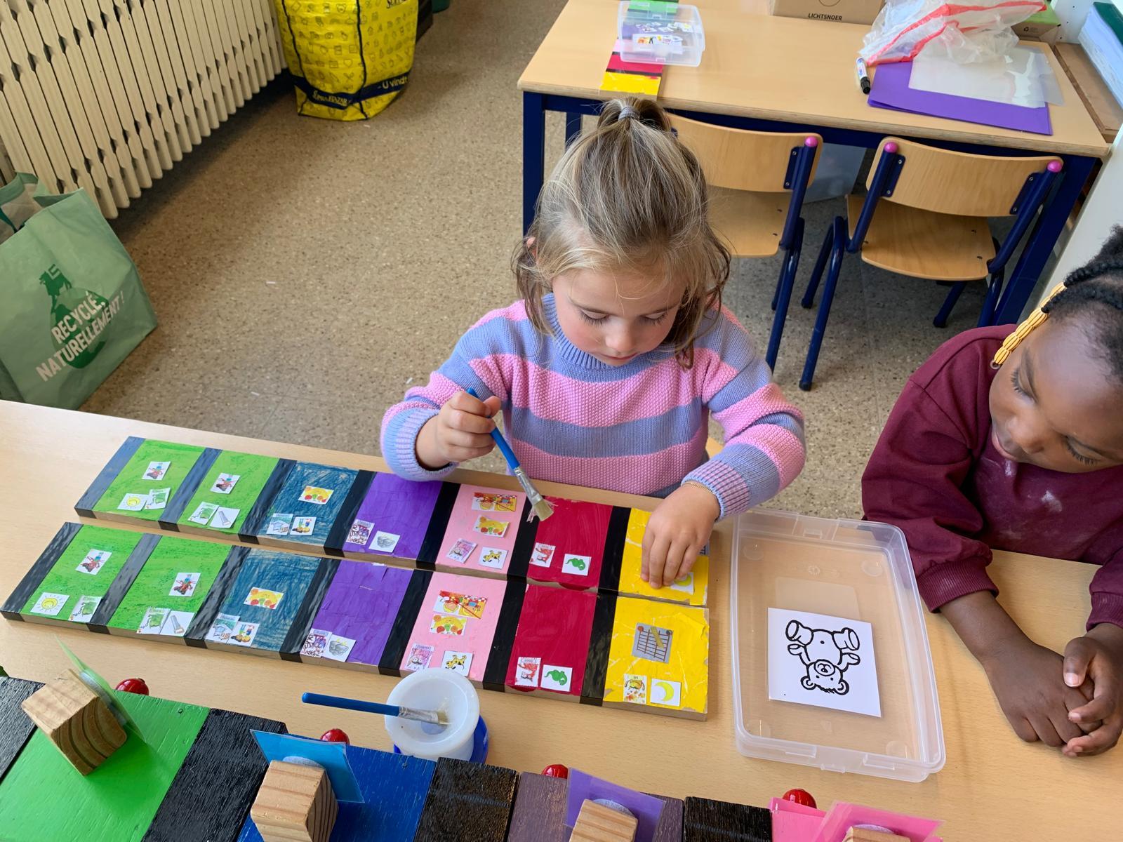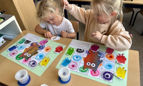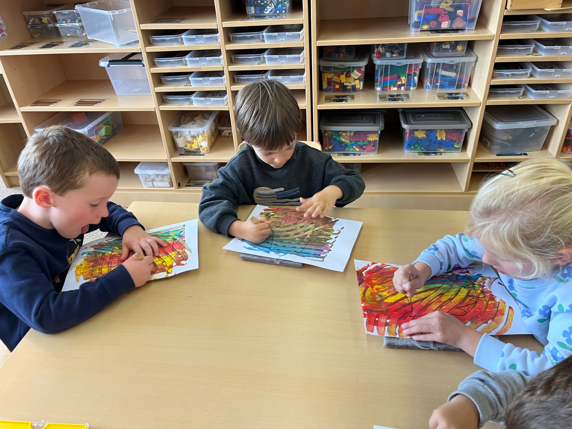 Met een speciale verfspatel schilderden we een kleurenmonster, daarna hebben we het monster geprikt en krullenbollen deden we als onderlaag.