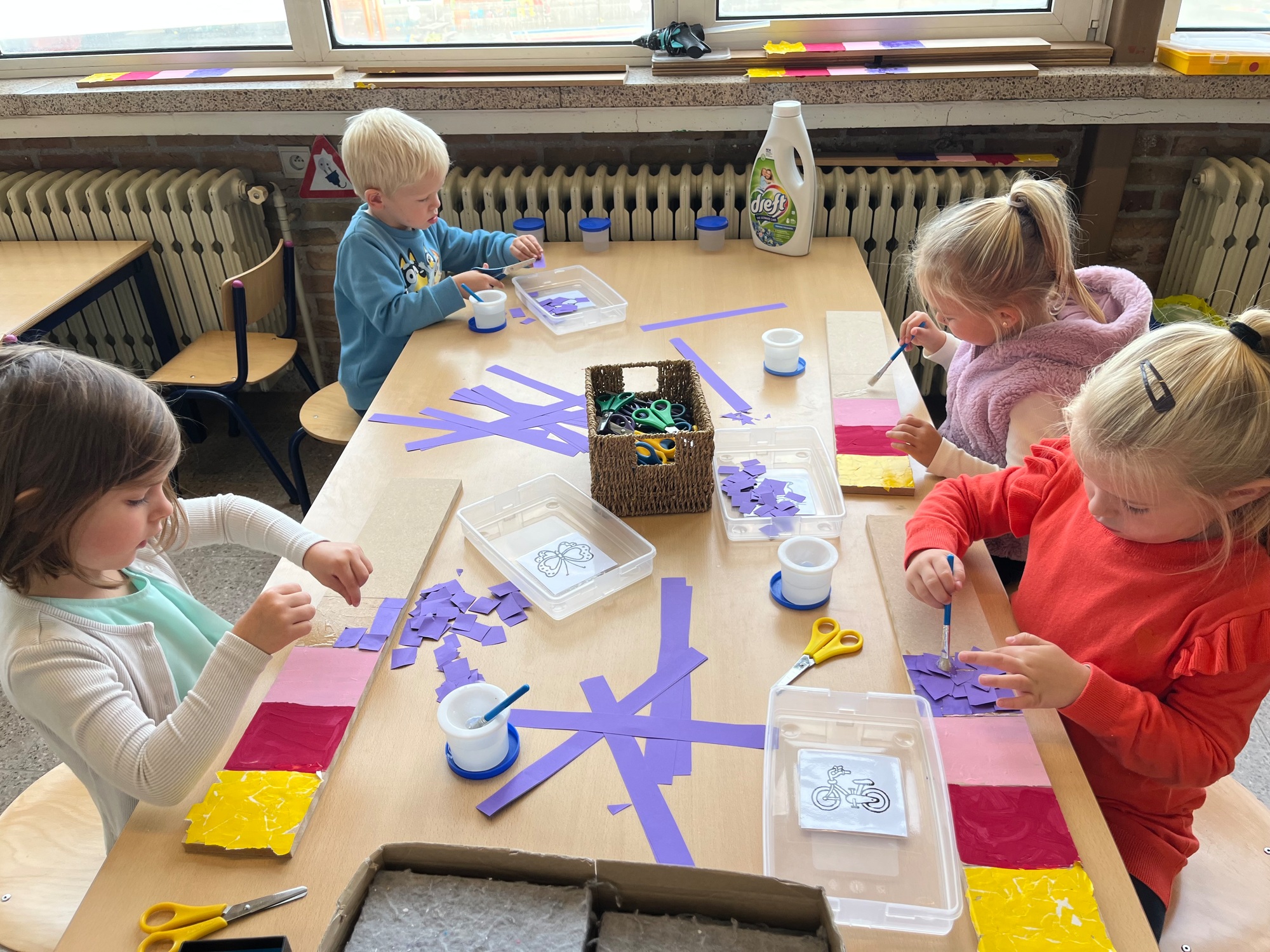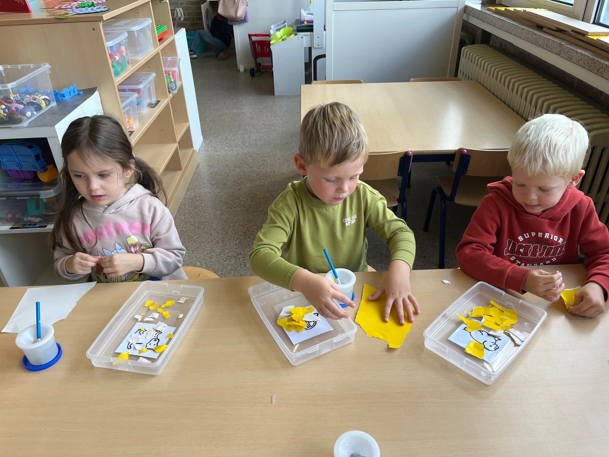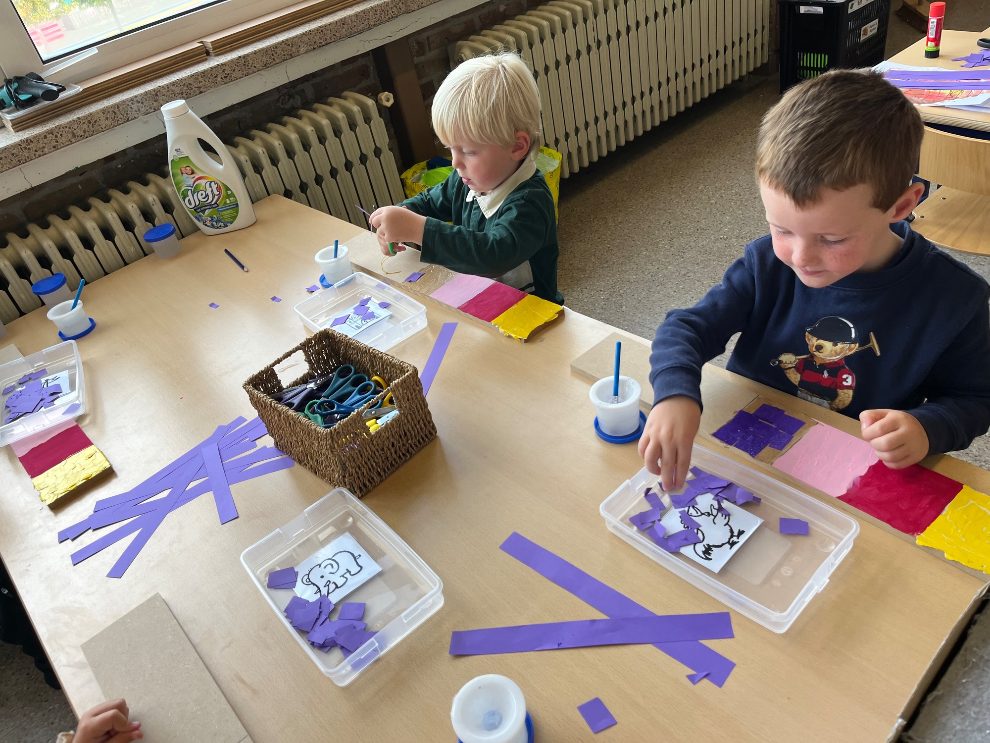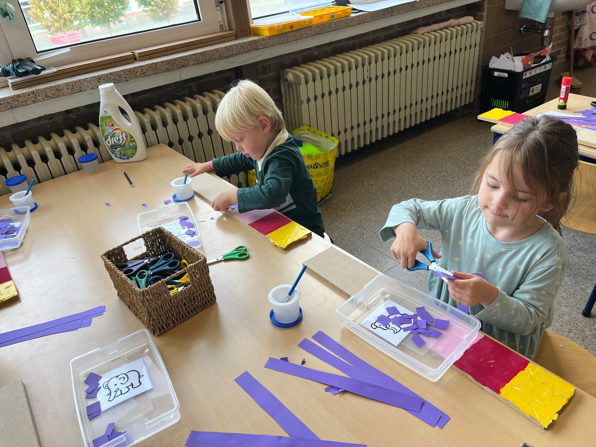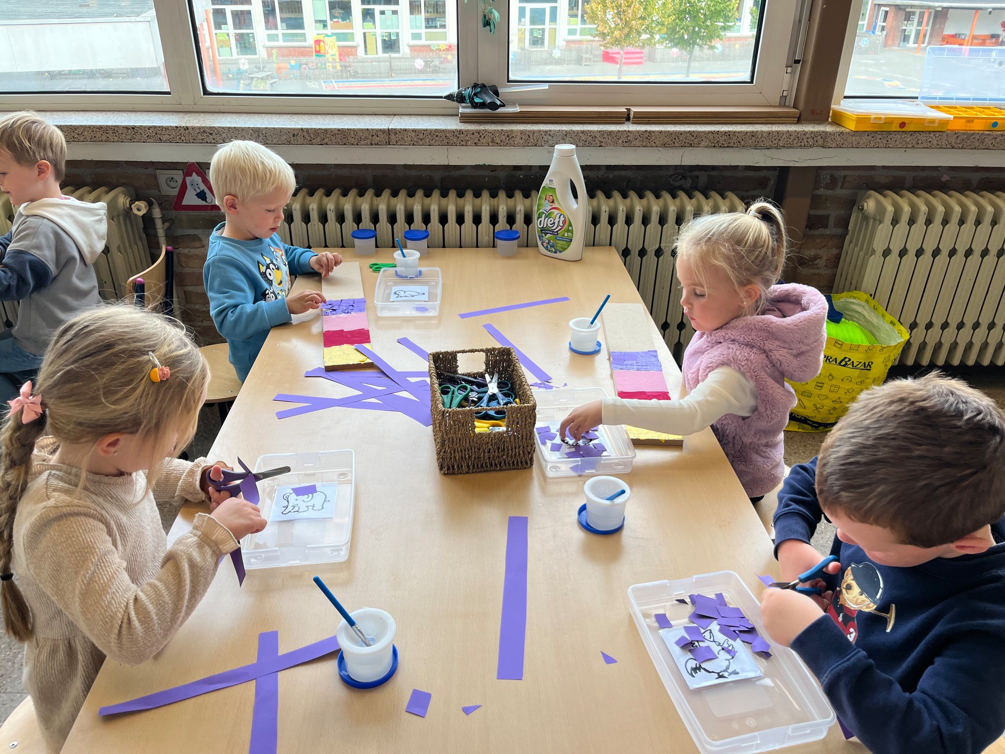 We pasten verschillende technieken toe: knippen, scheuren, schilderen, stempelen, kleven,..
