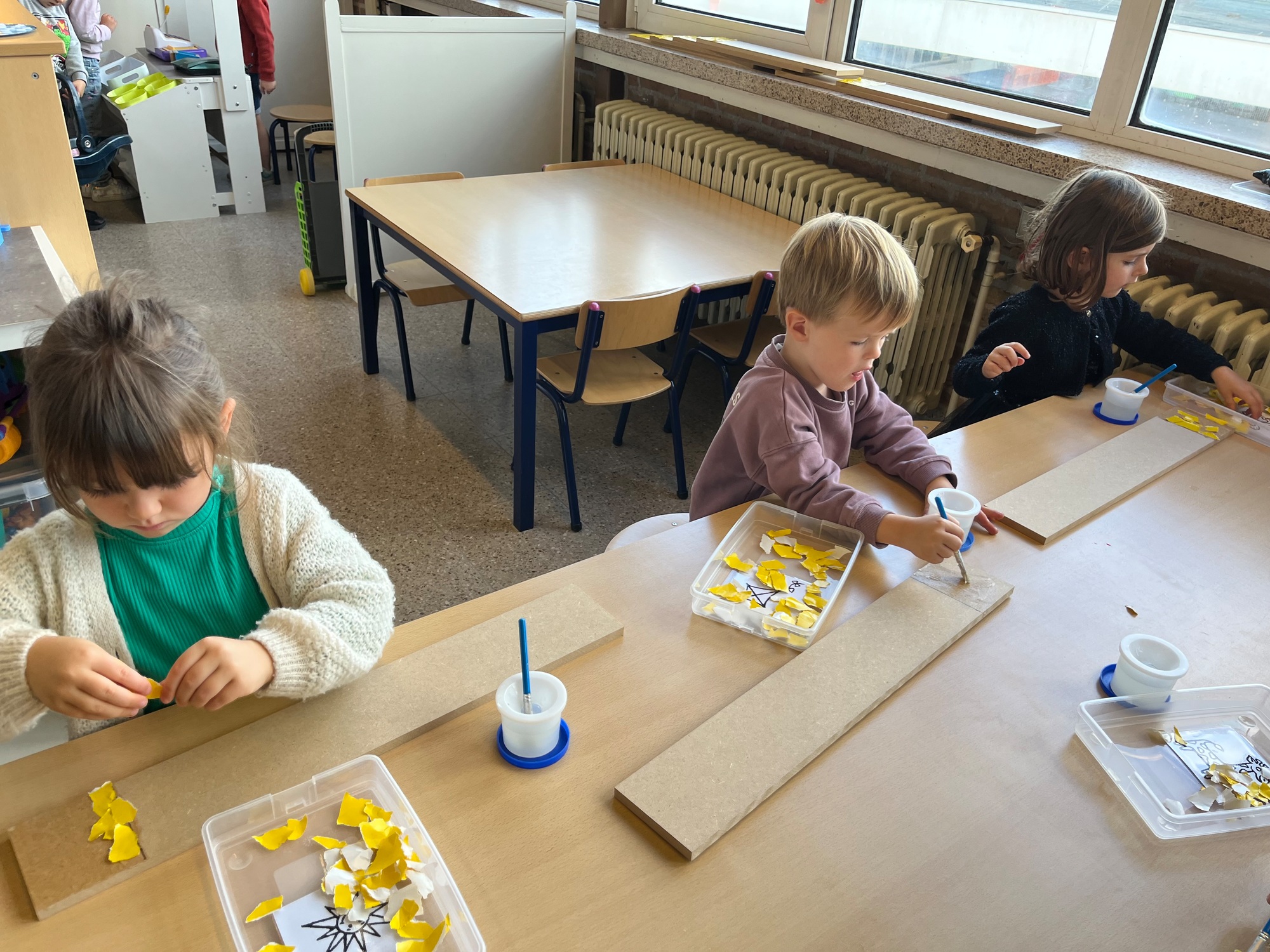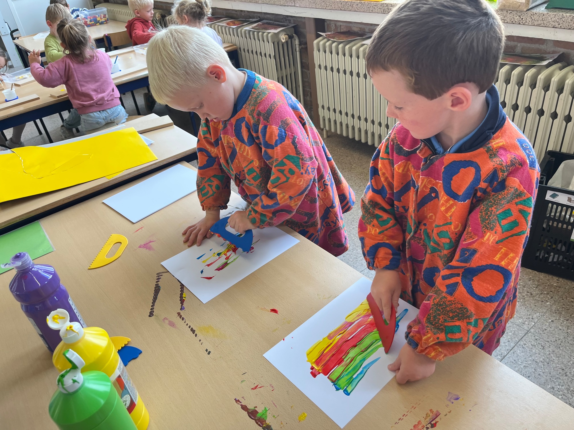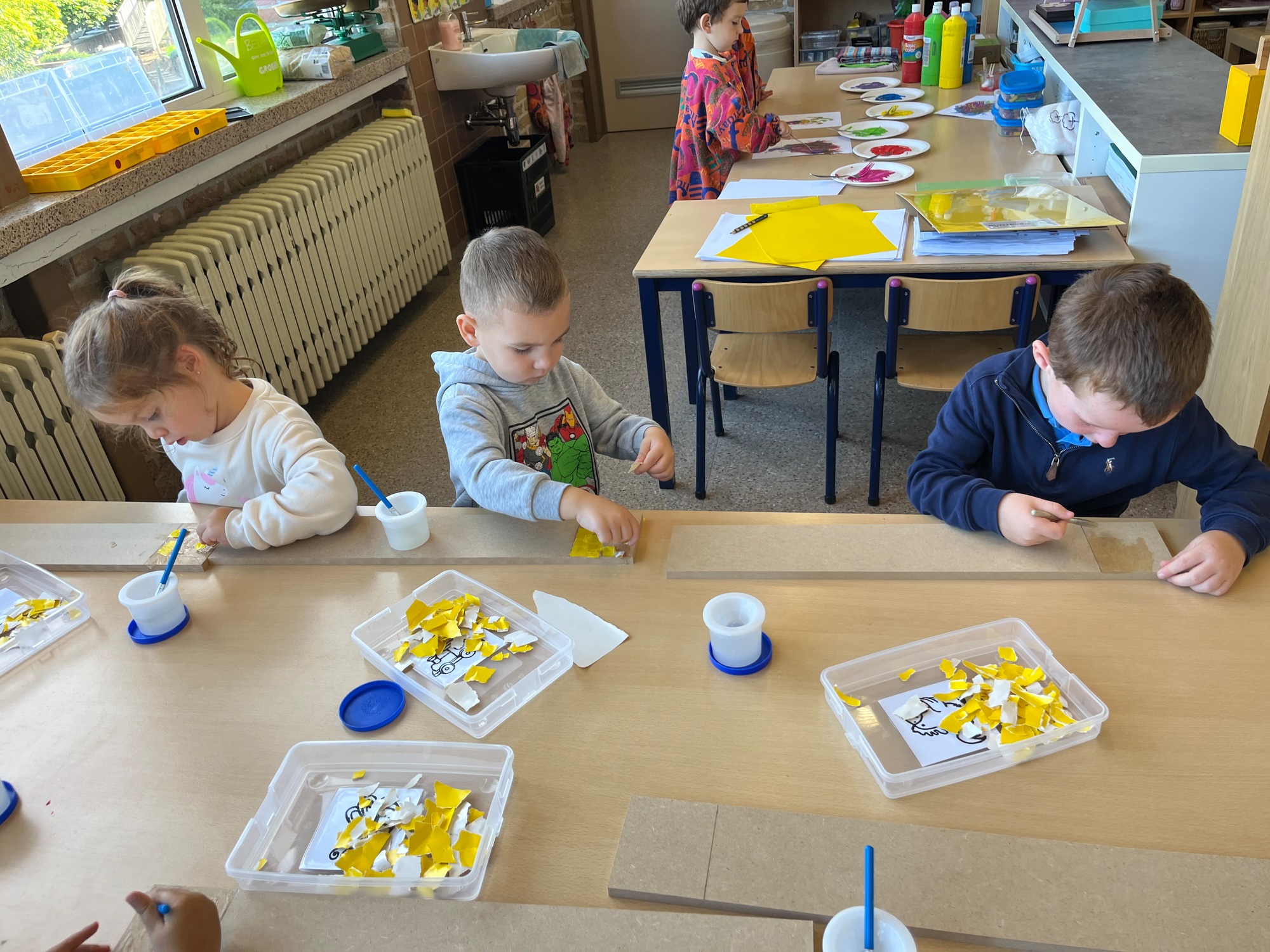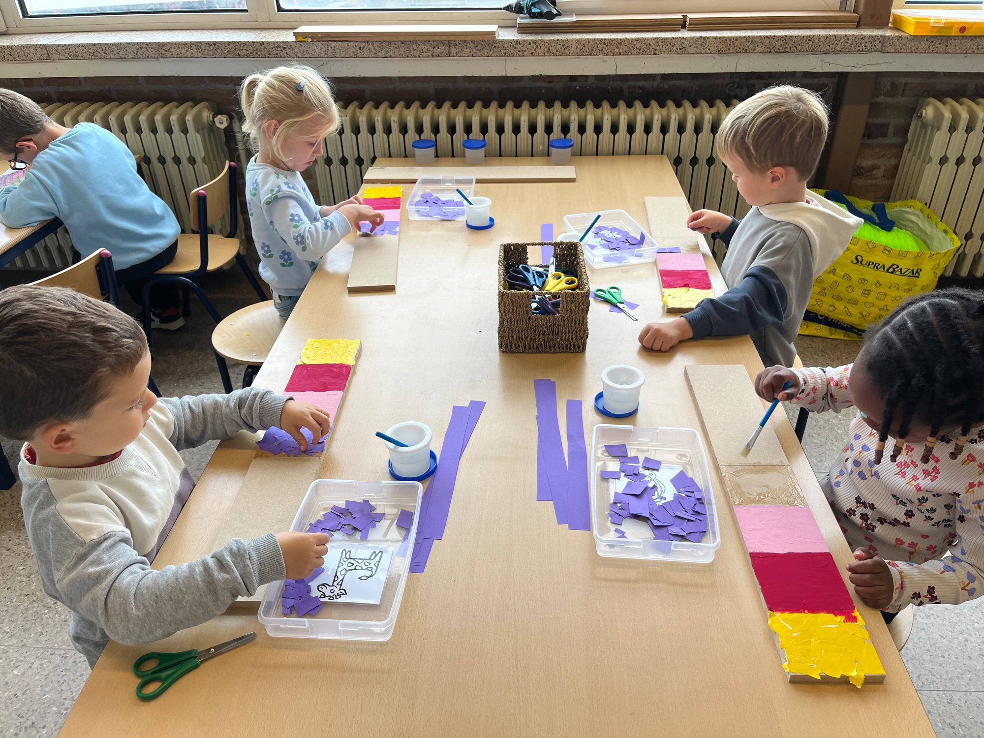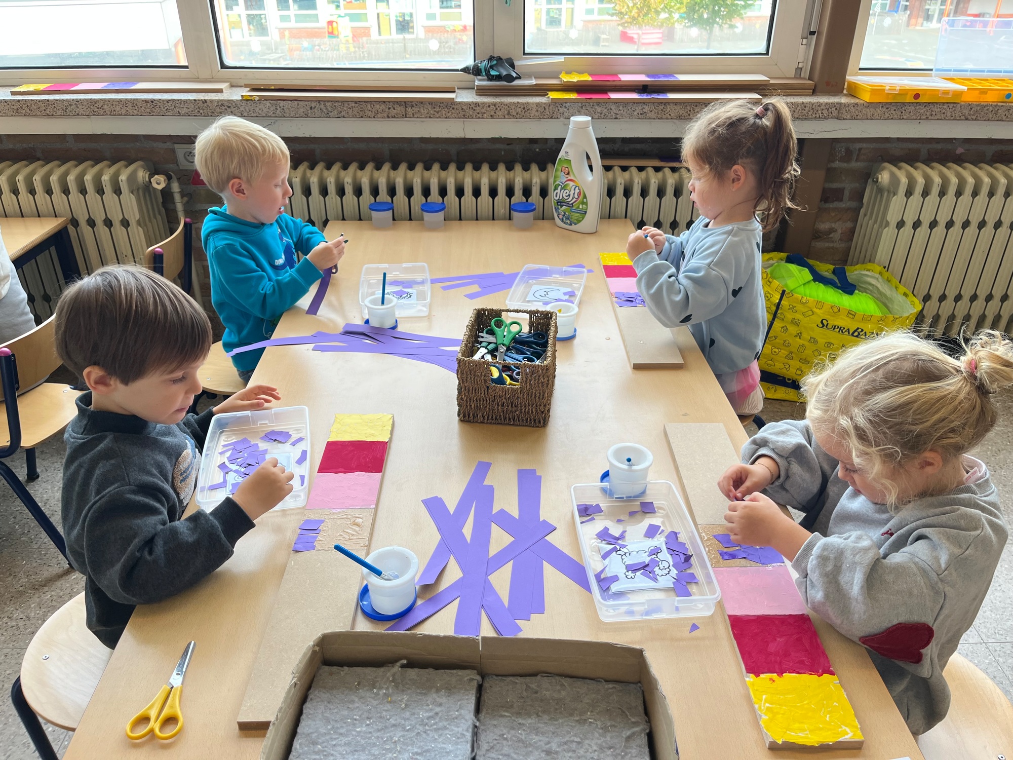 We pasten verschillende technieken toe: knippen, scheuren, schilderen, stempelen, kleven,..