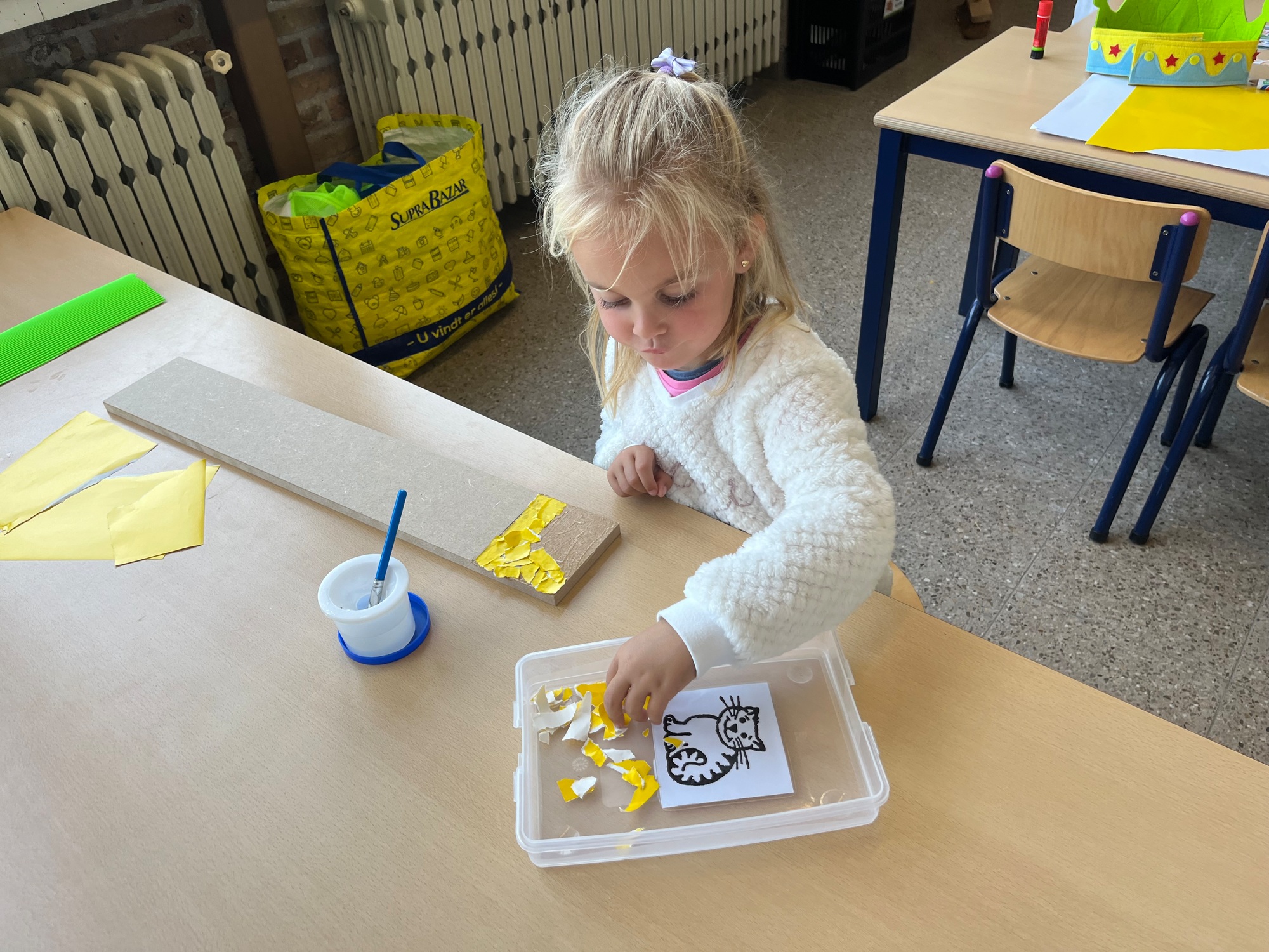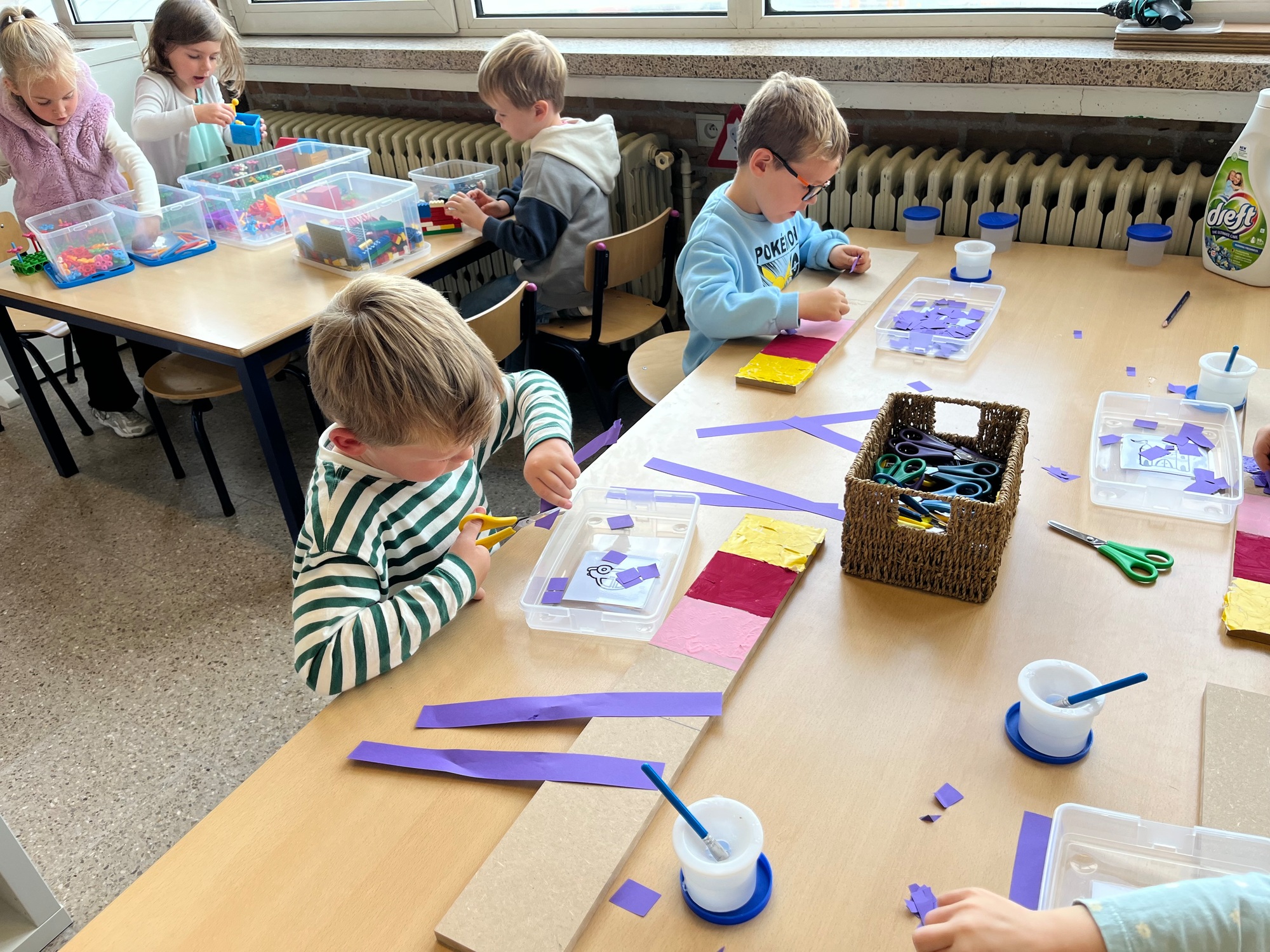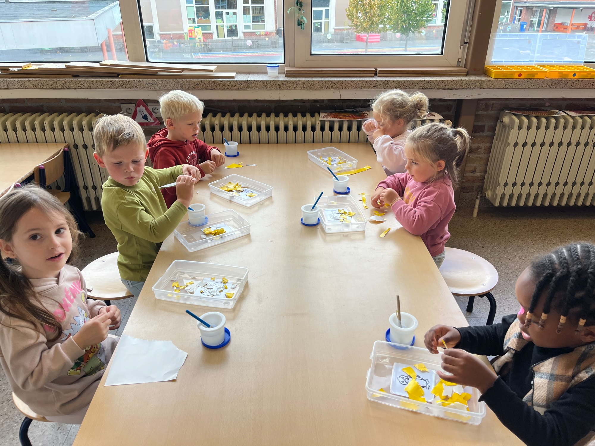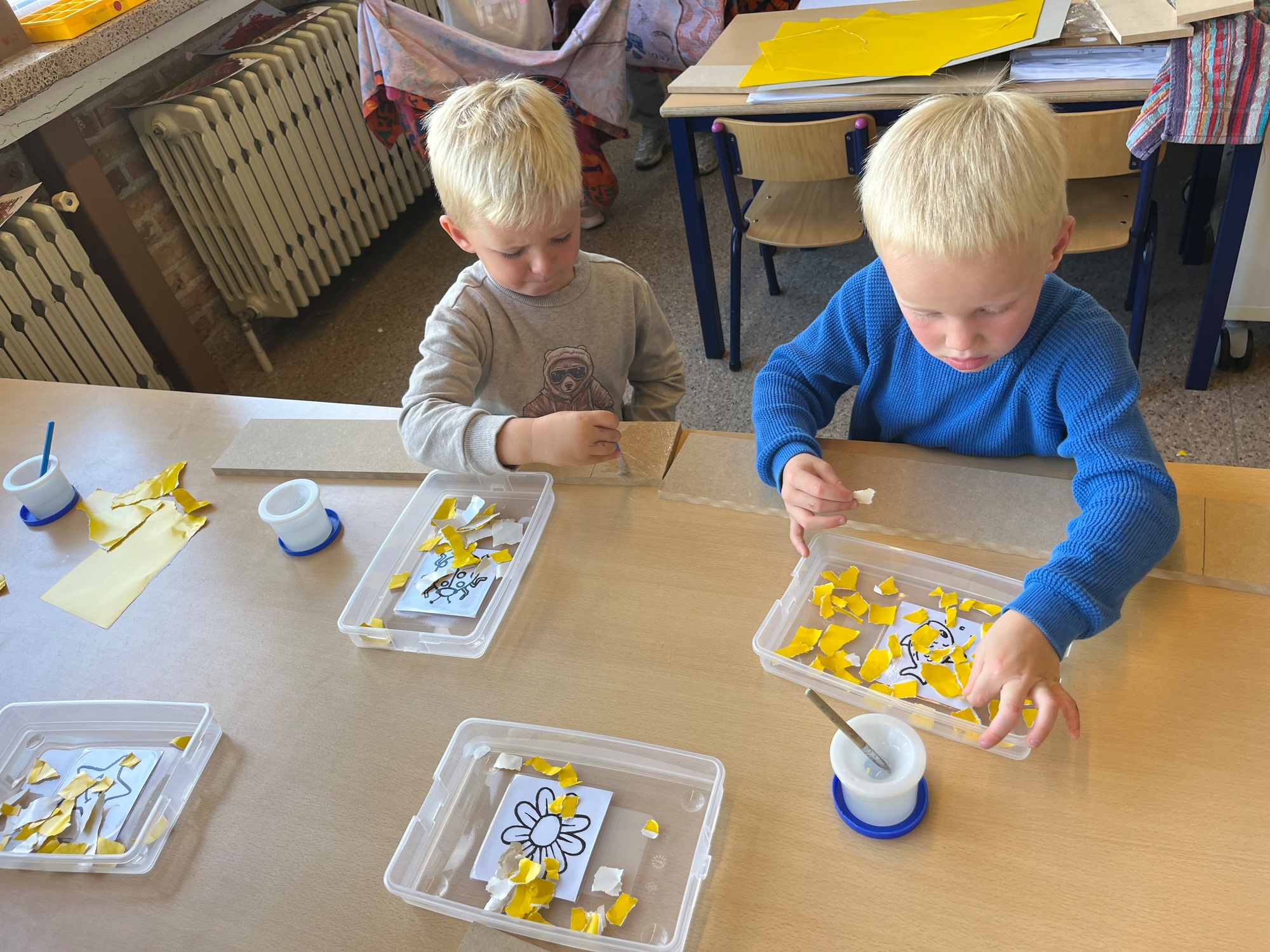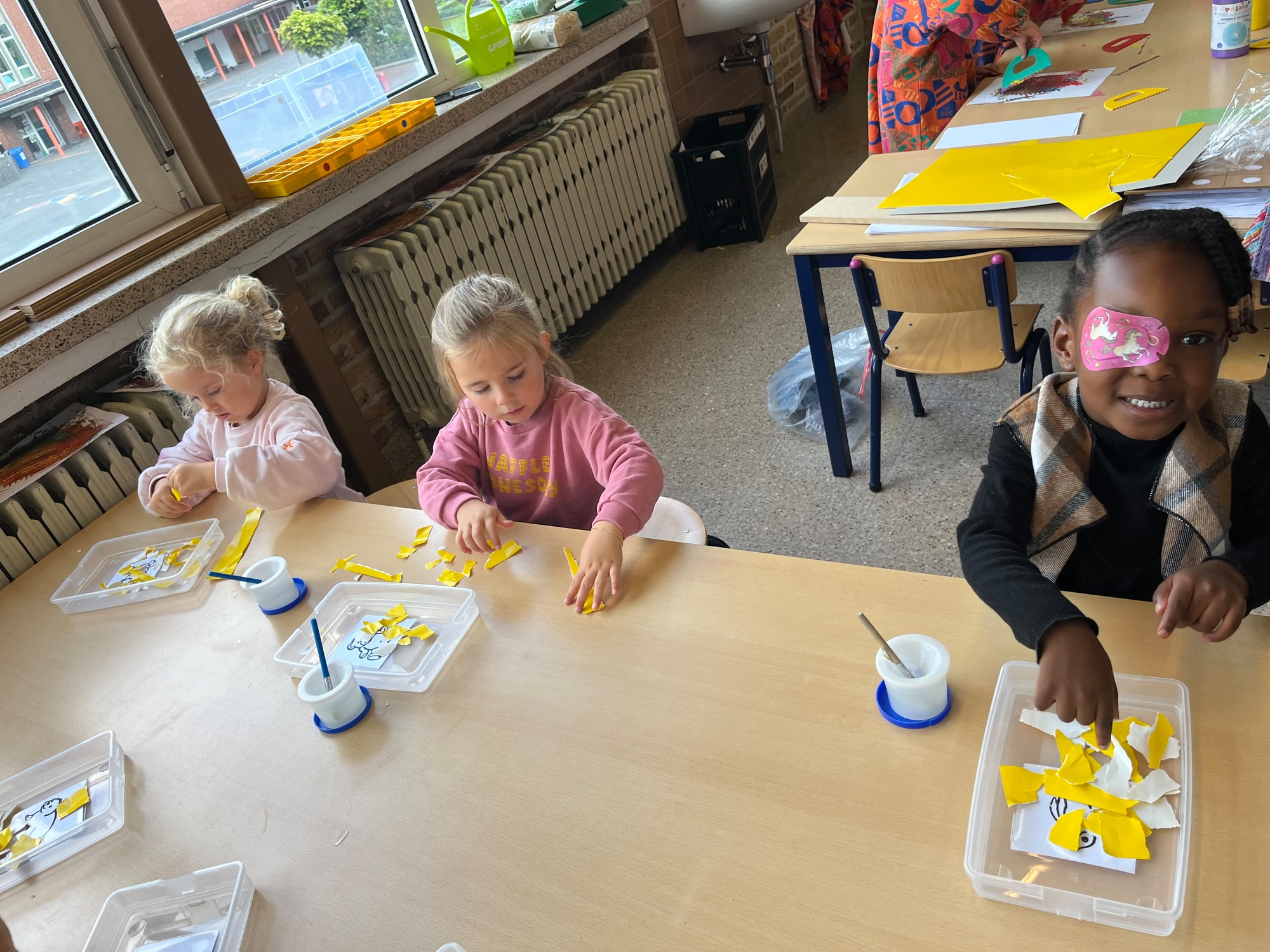 We pasten verschillende technieken toe: knippen, scheuren, schilderen, stempelen, kleven,..