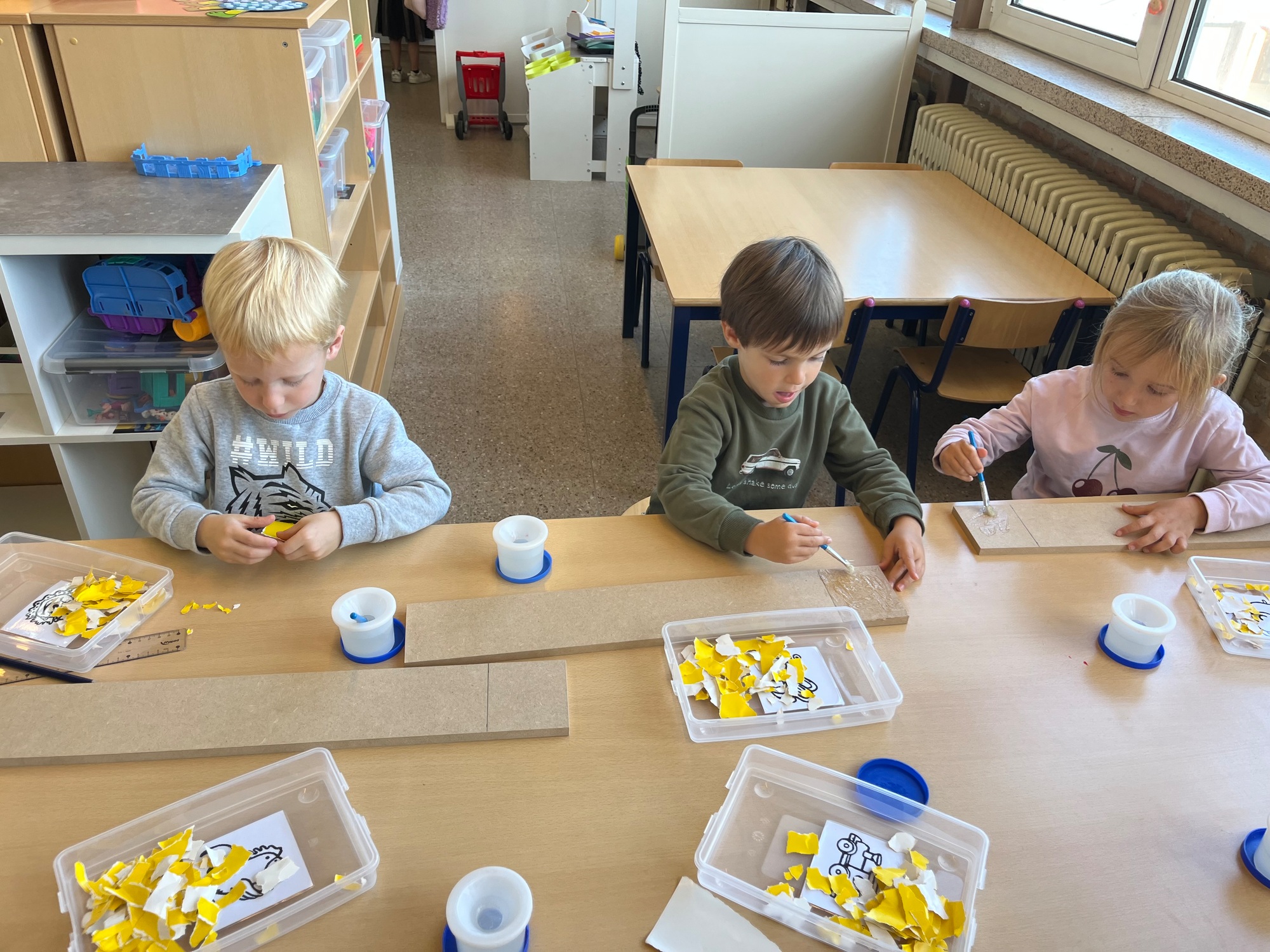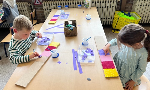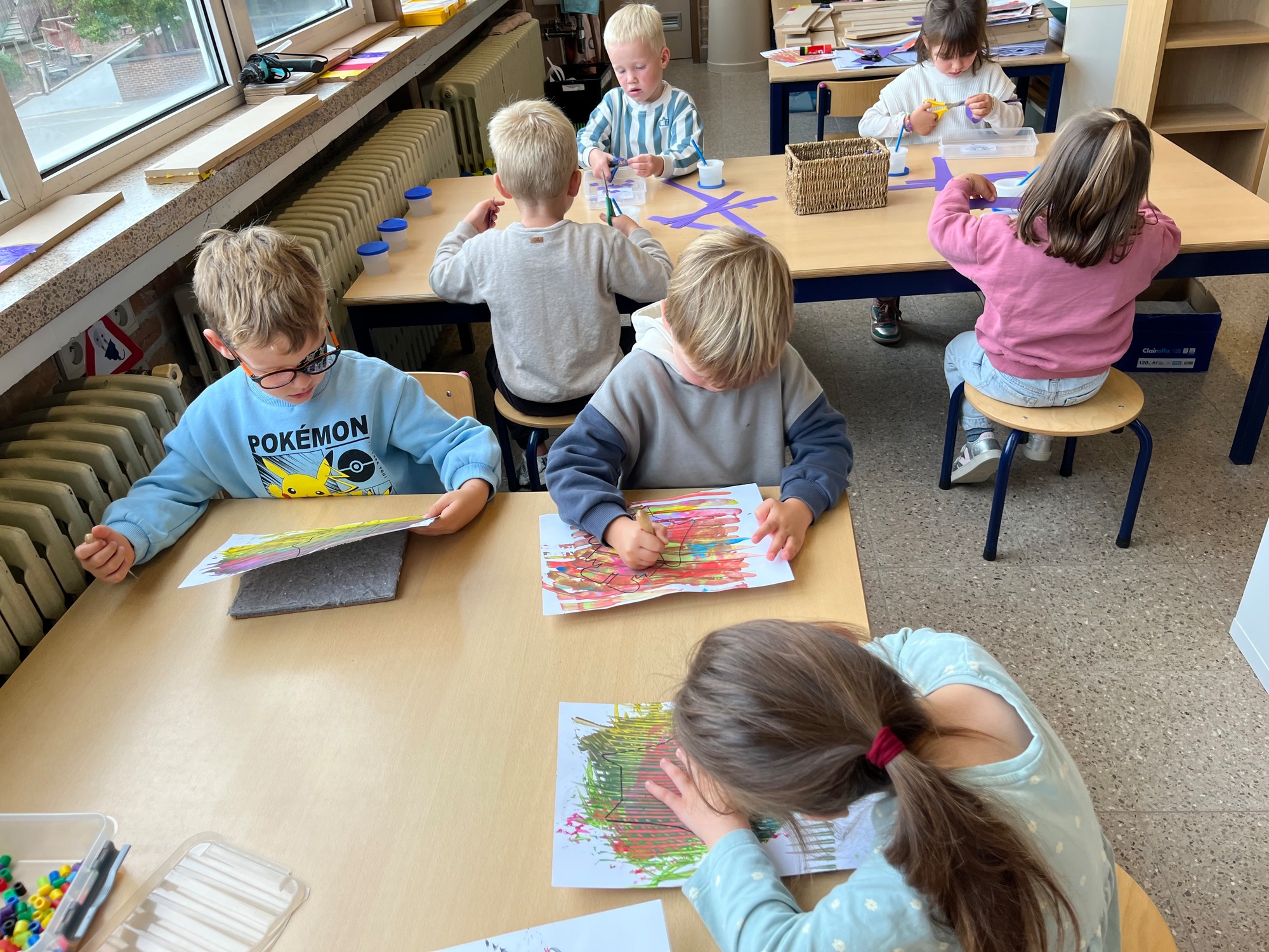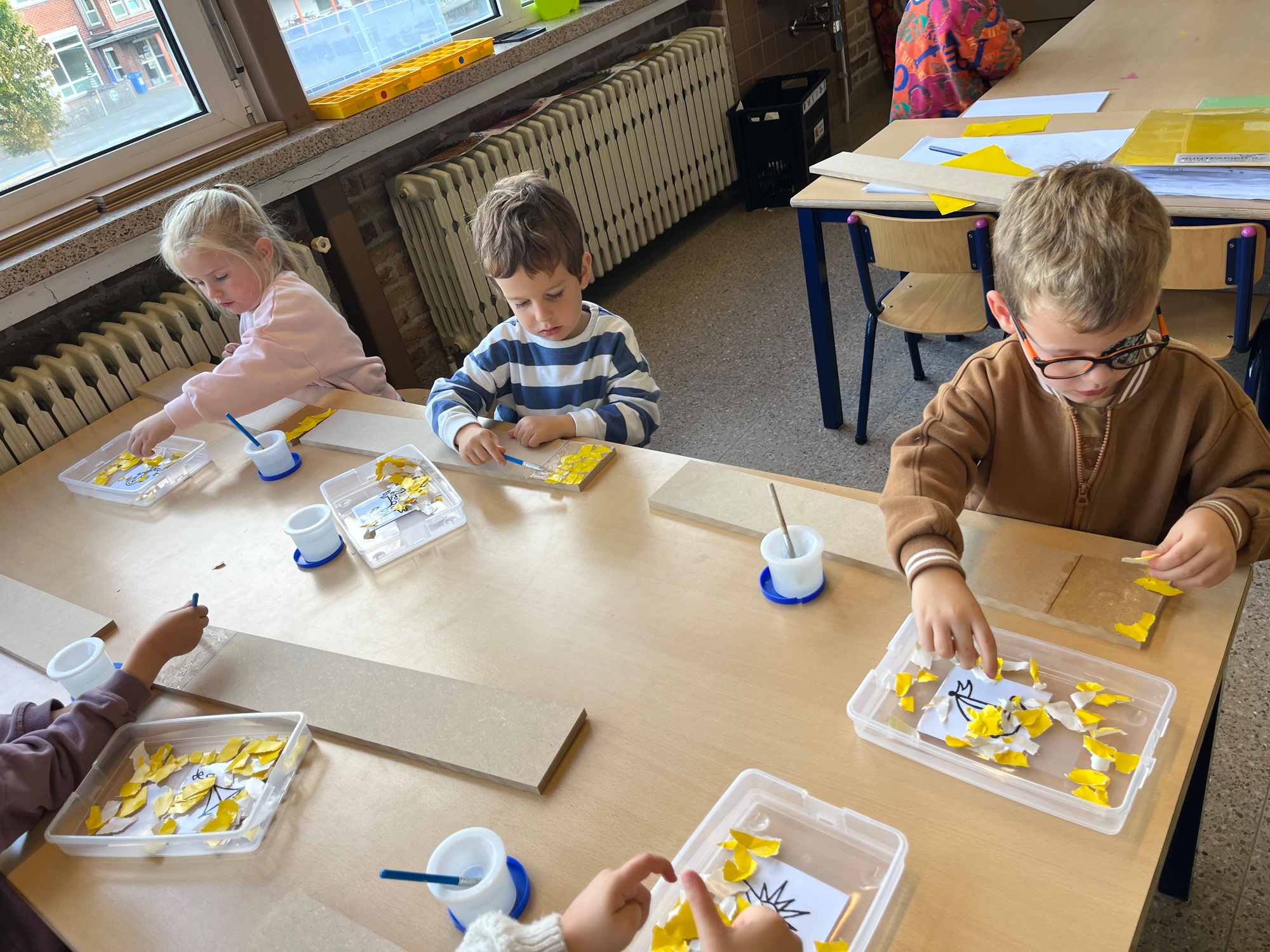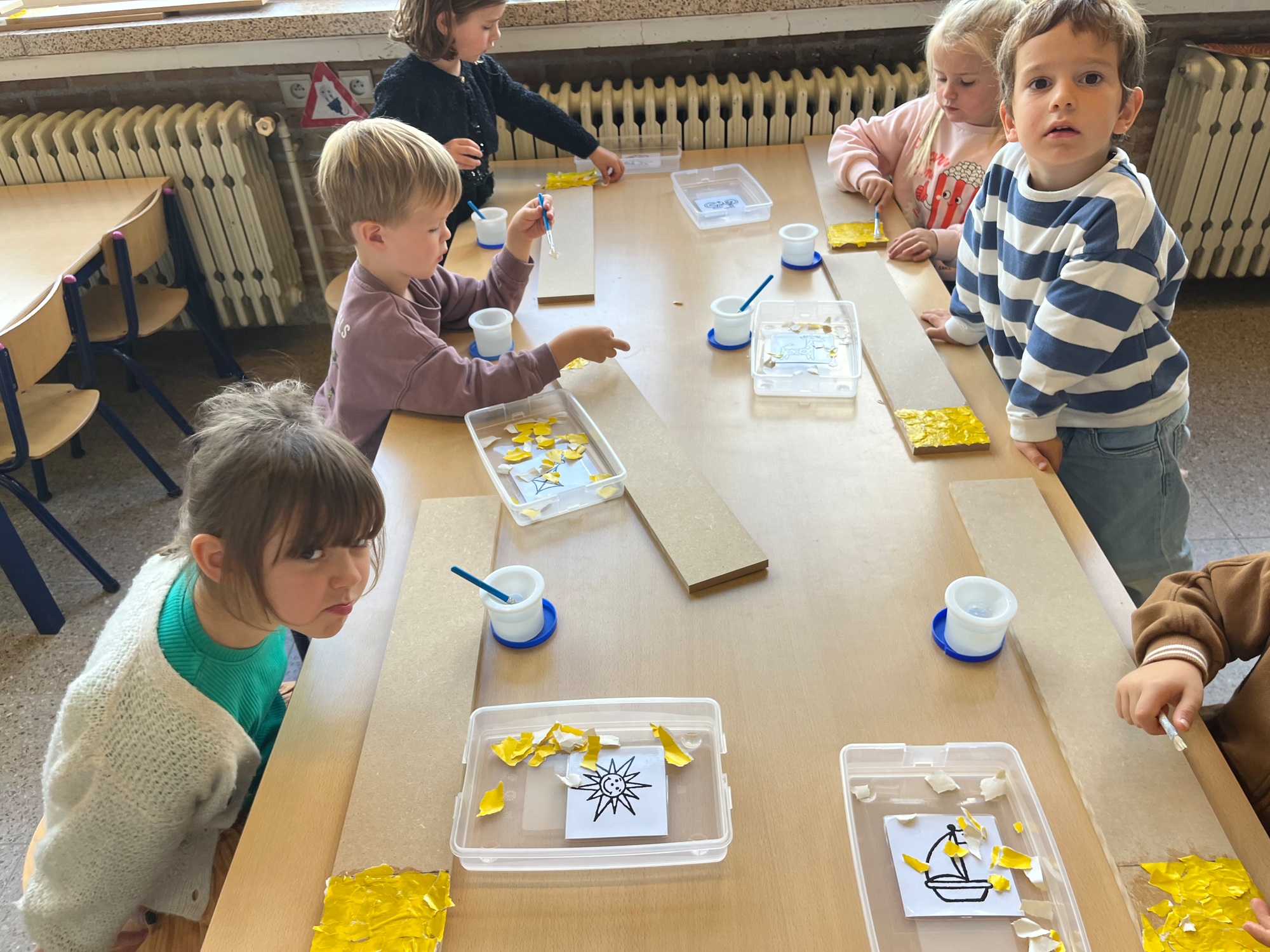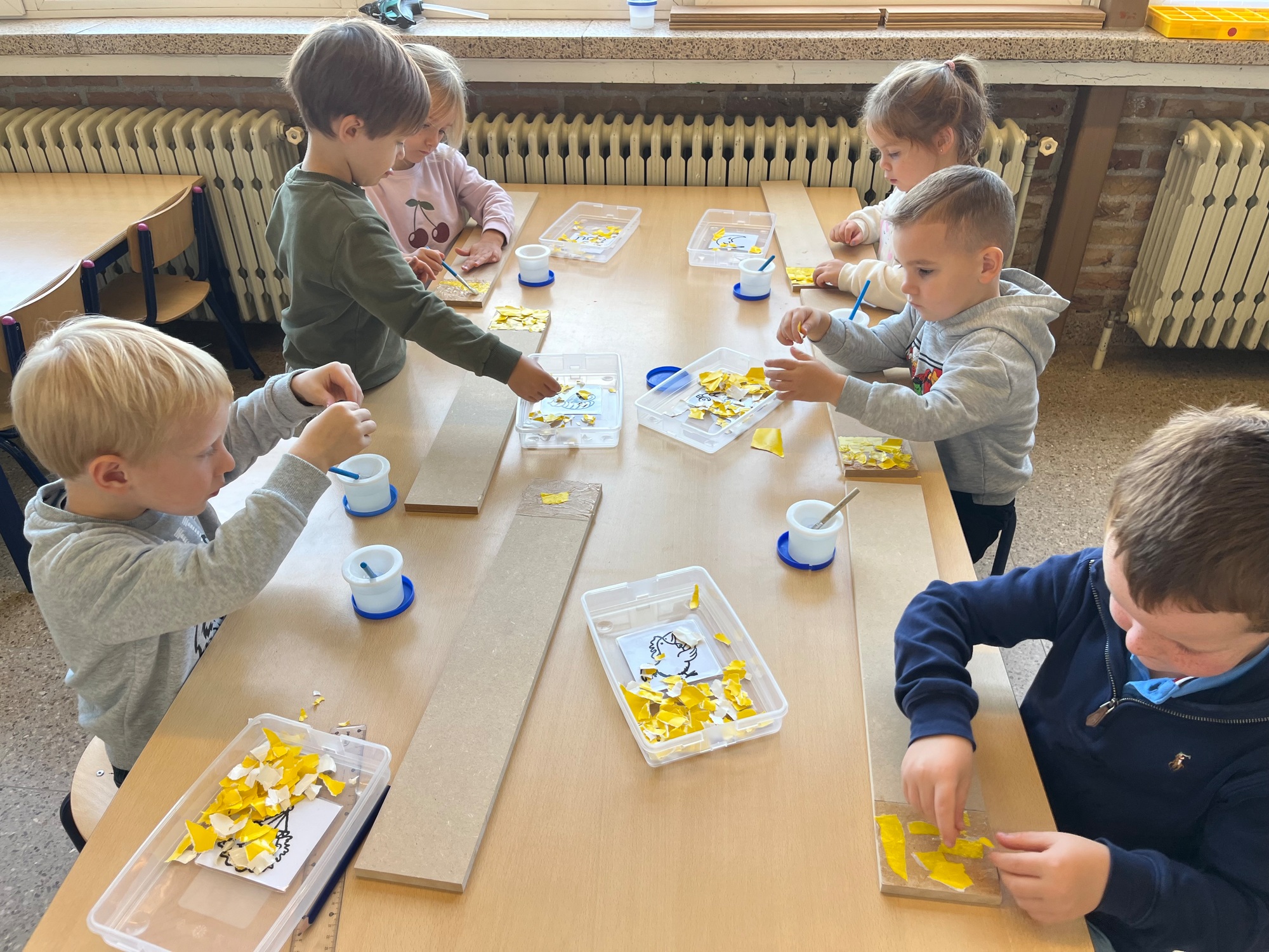 We pasten verschillende technieken toe: knippen, scheuren, schilderen, stempelen, kleven,..