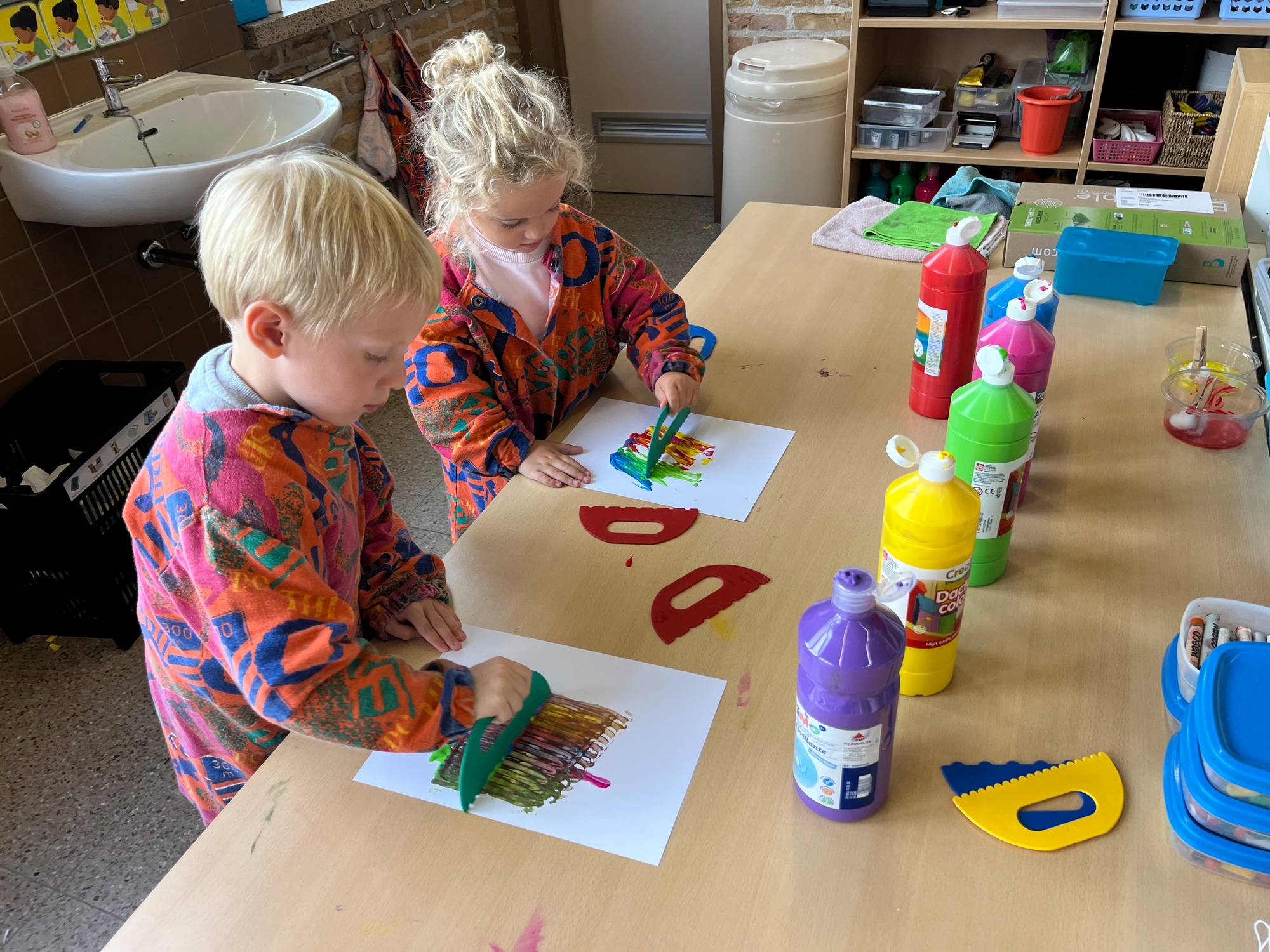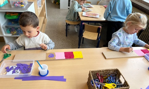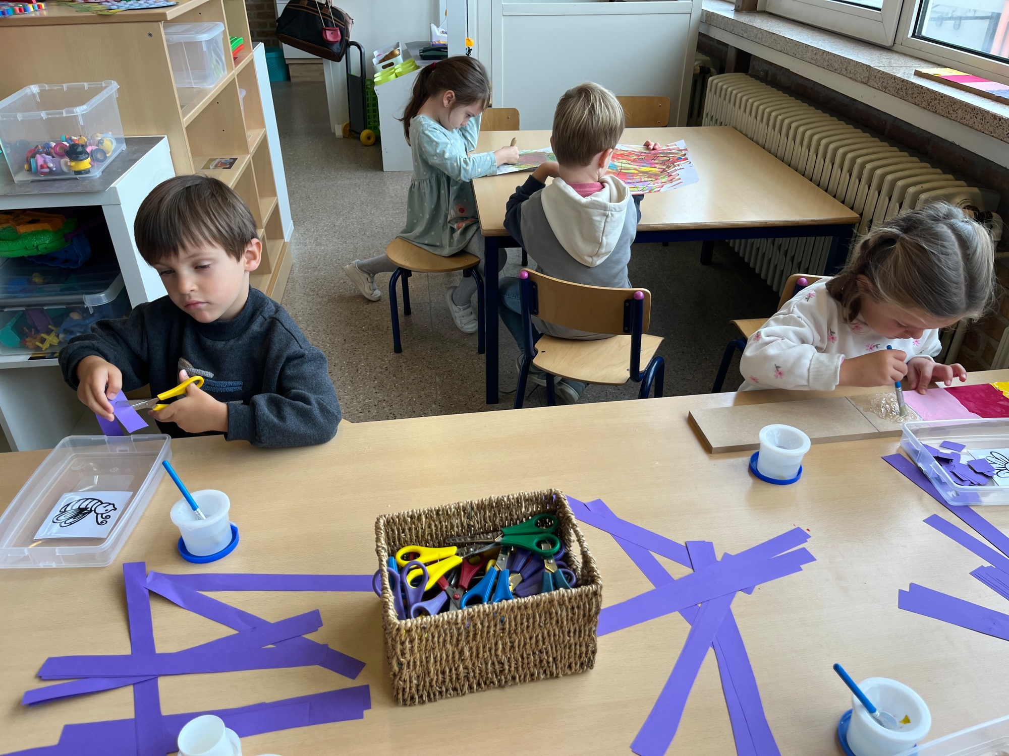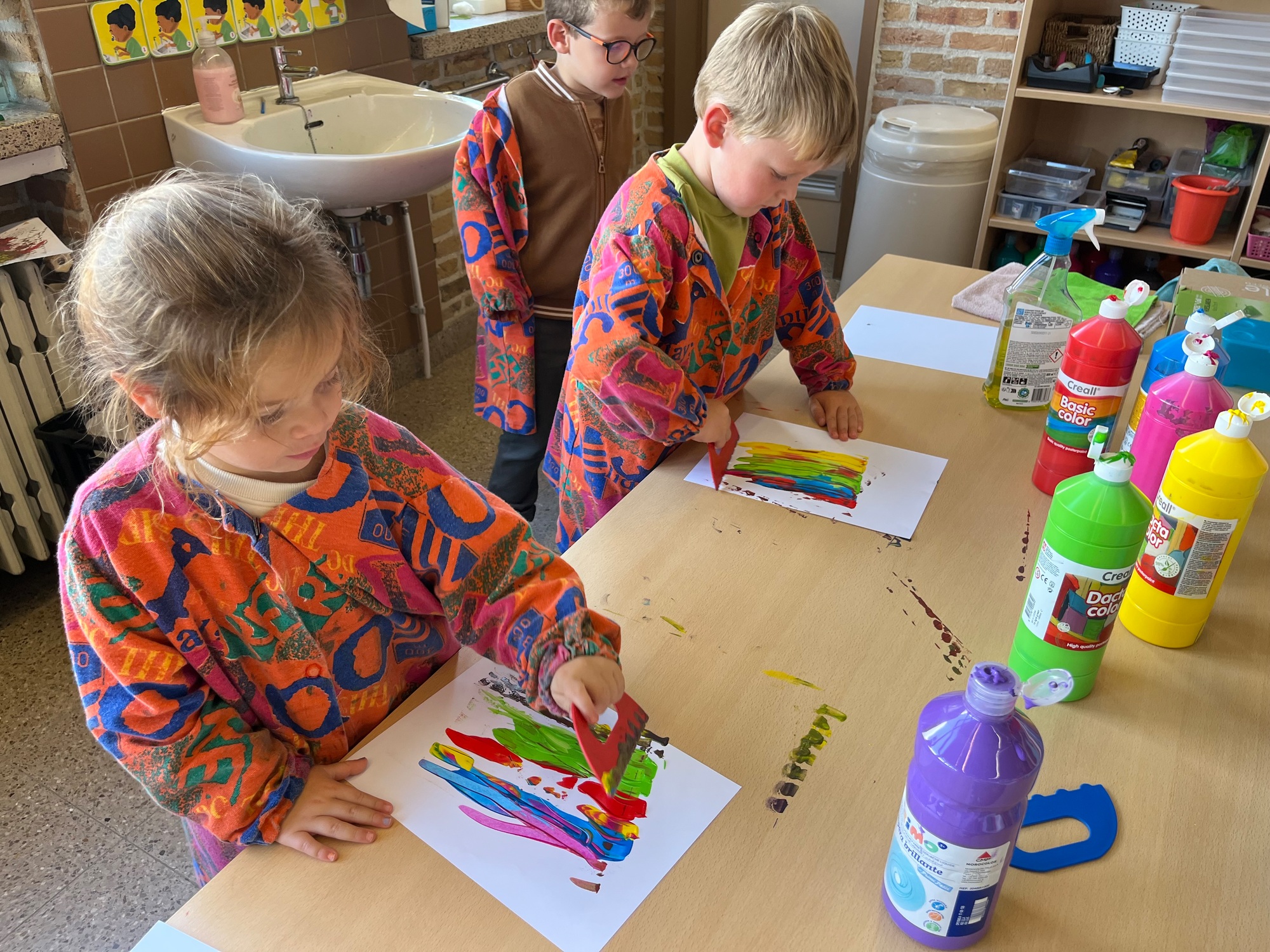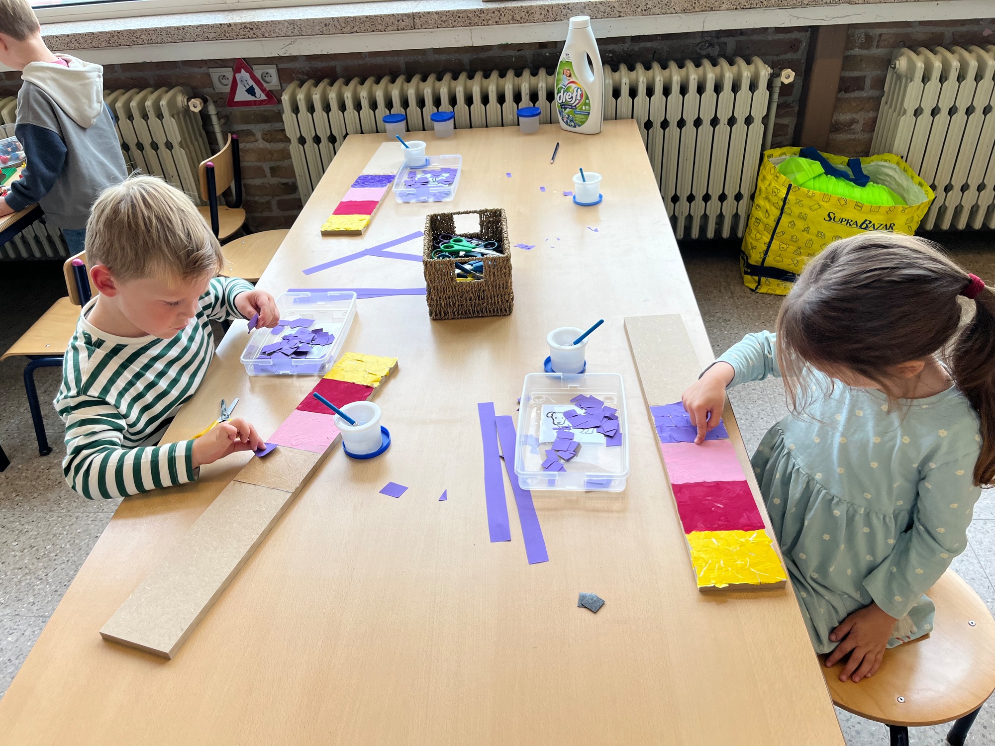 We pasten verschillende technieken toe: knippen, scheuren, schilderen, stempelen, kleven,..
