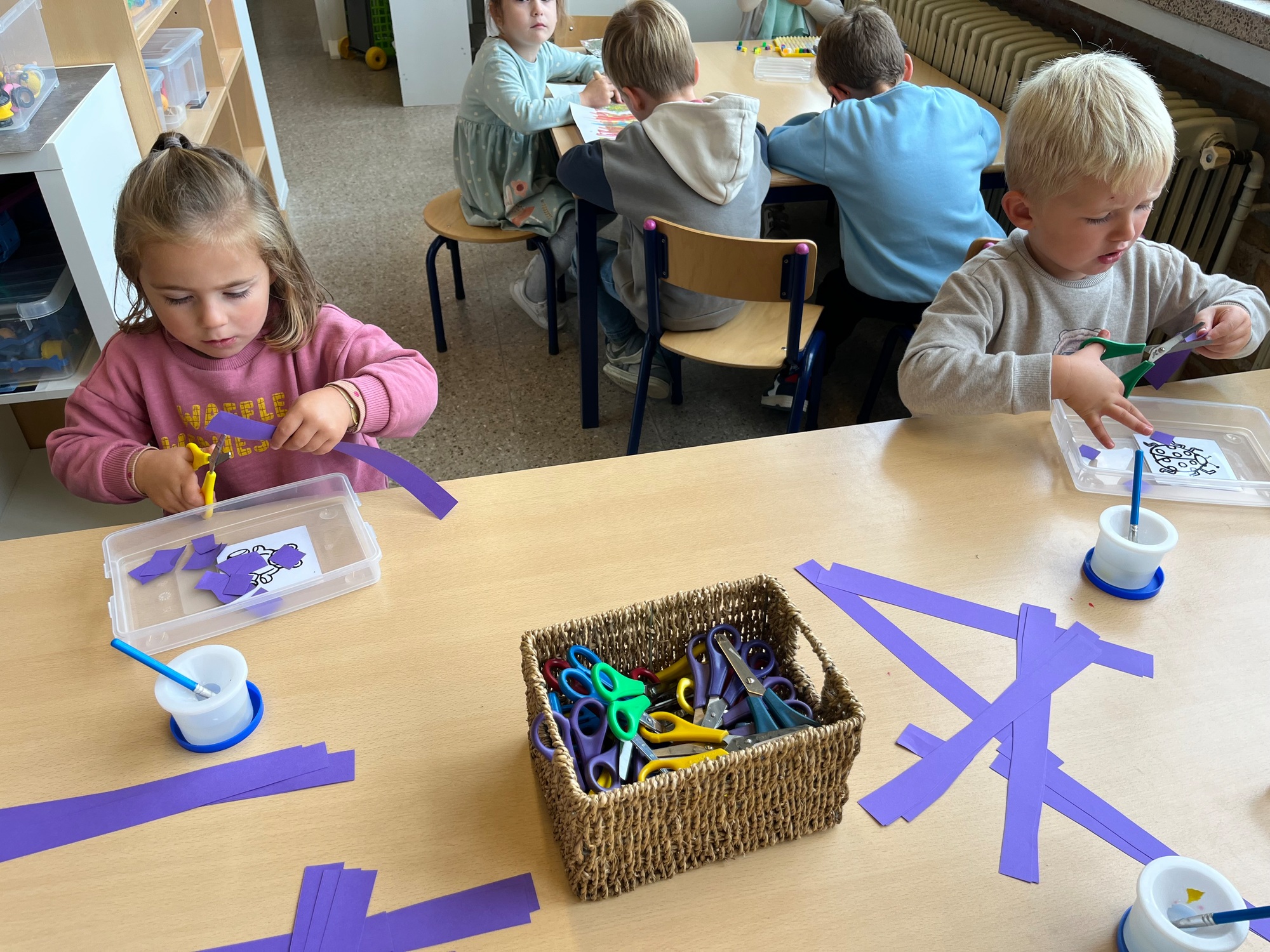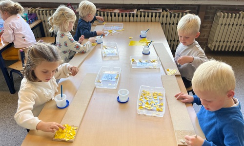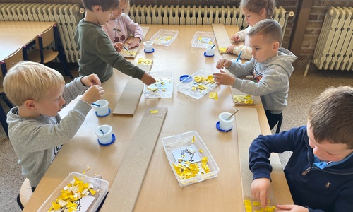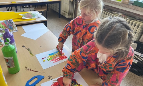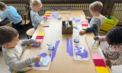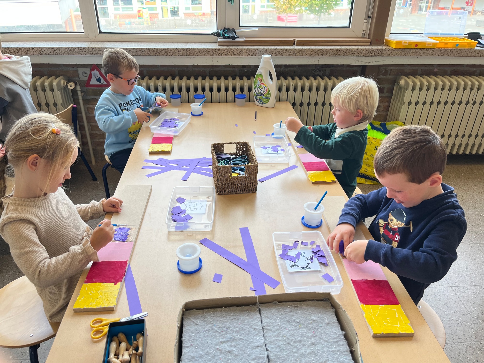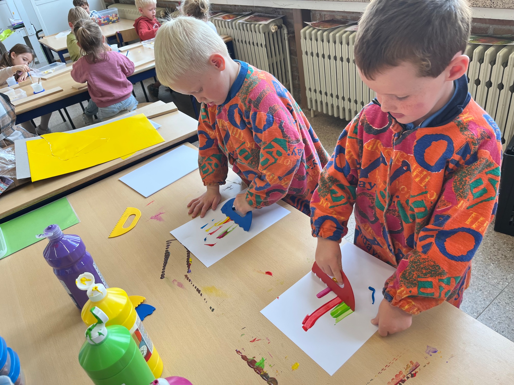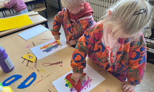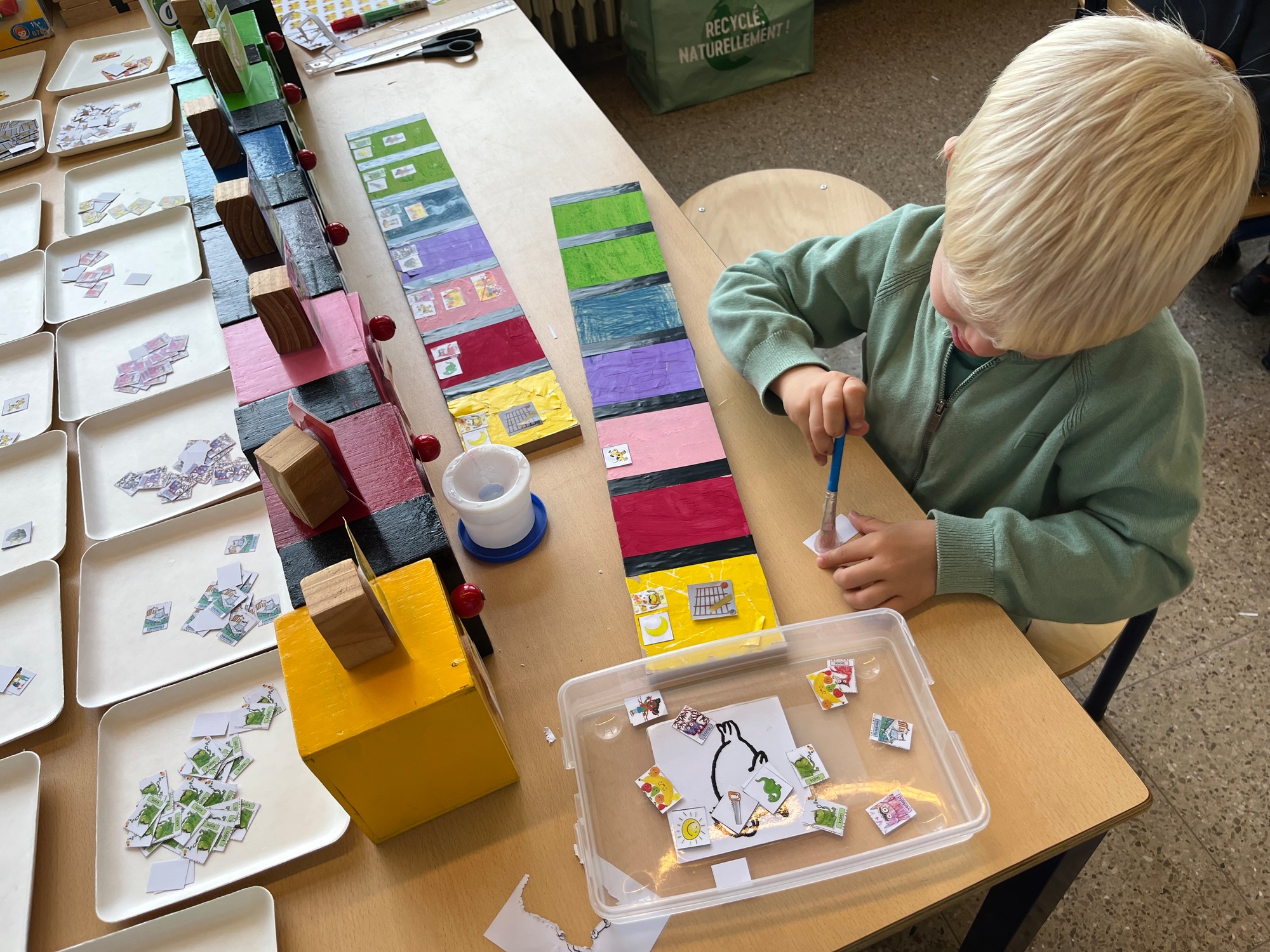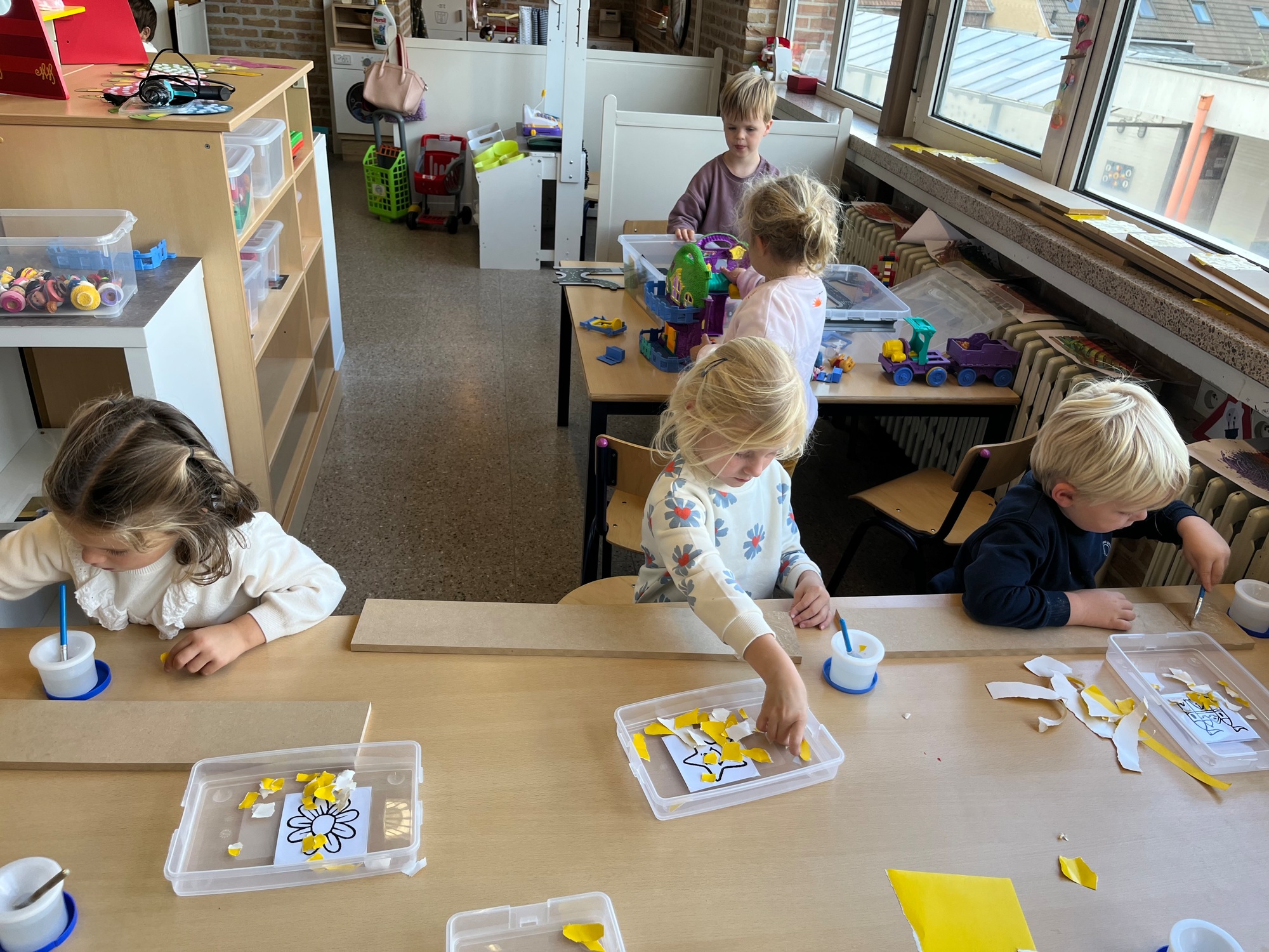 We pasten verschillende technieken toe: knippen, scheuren, schilderen, stempelen, kleven,..