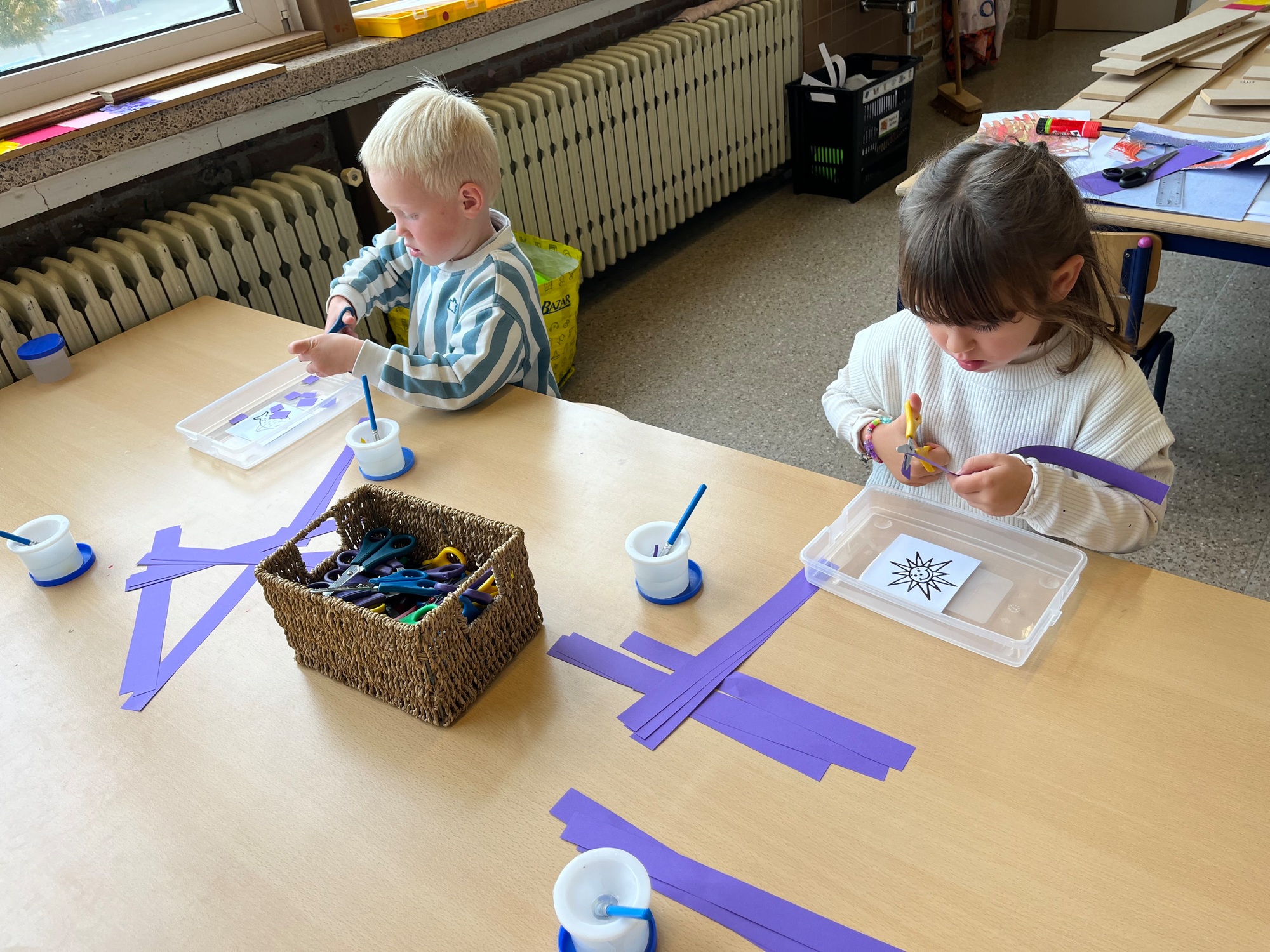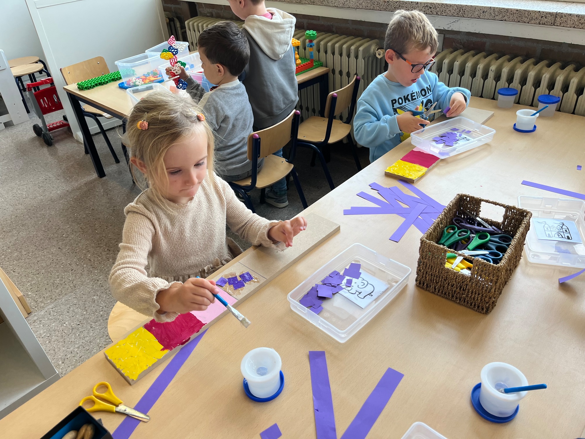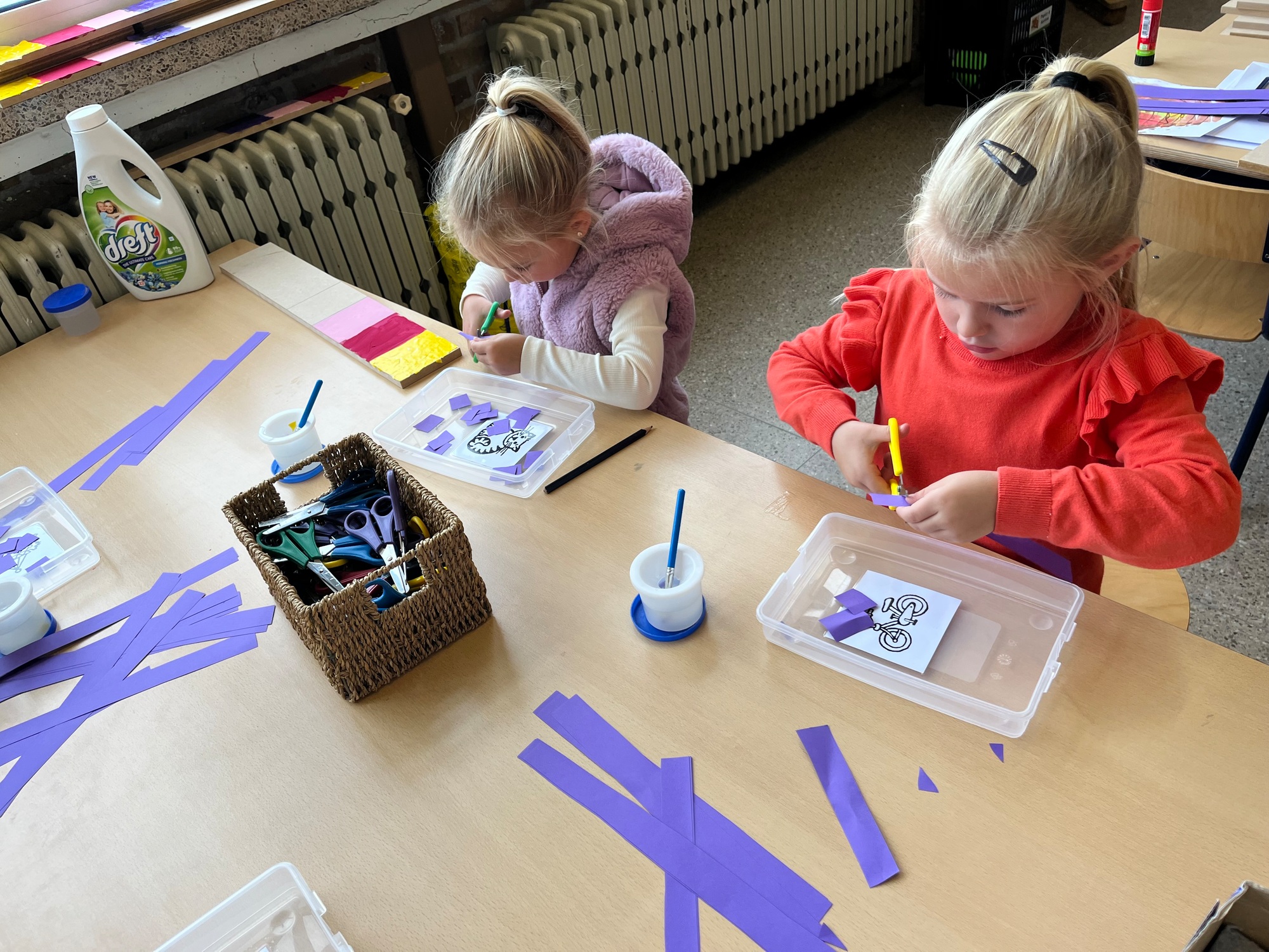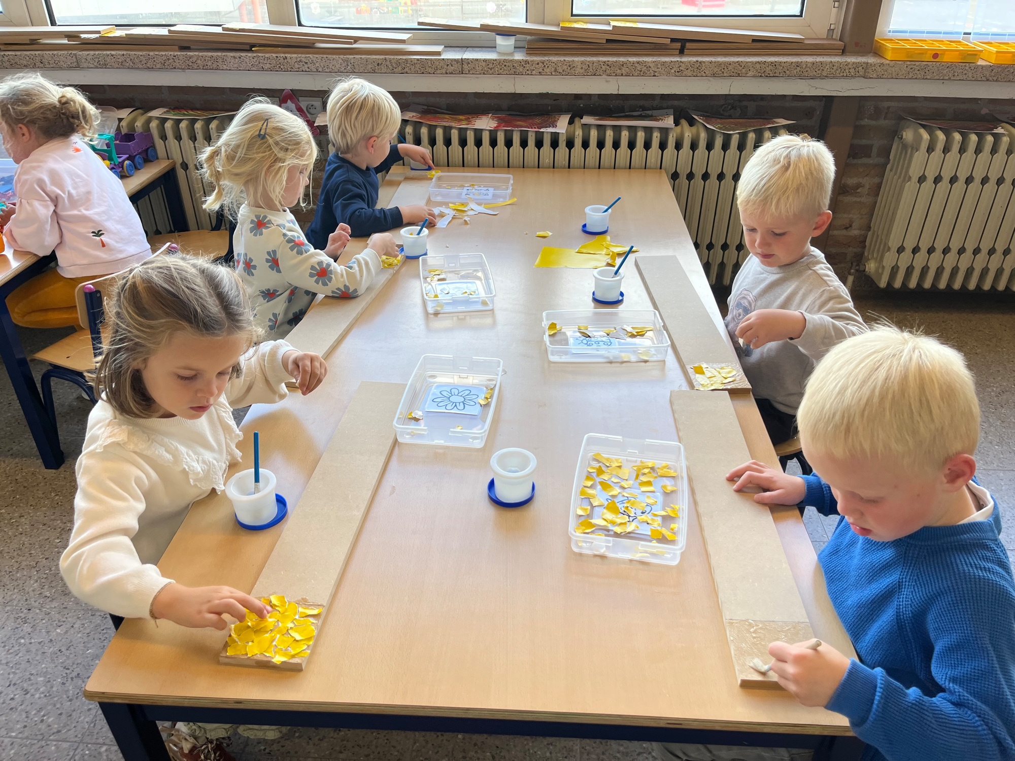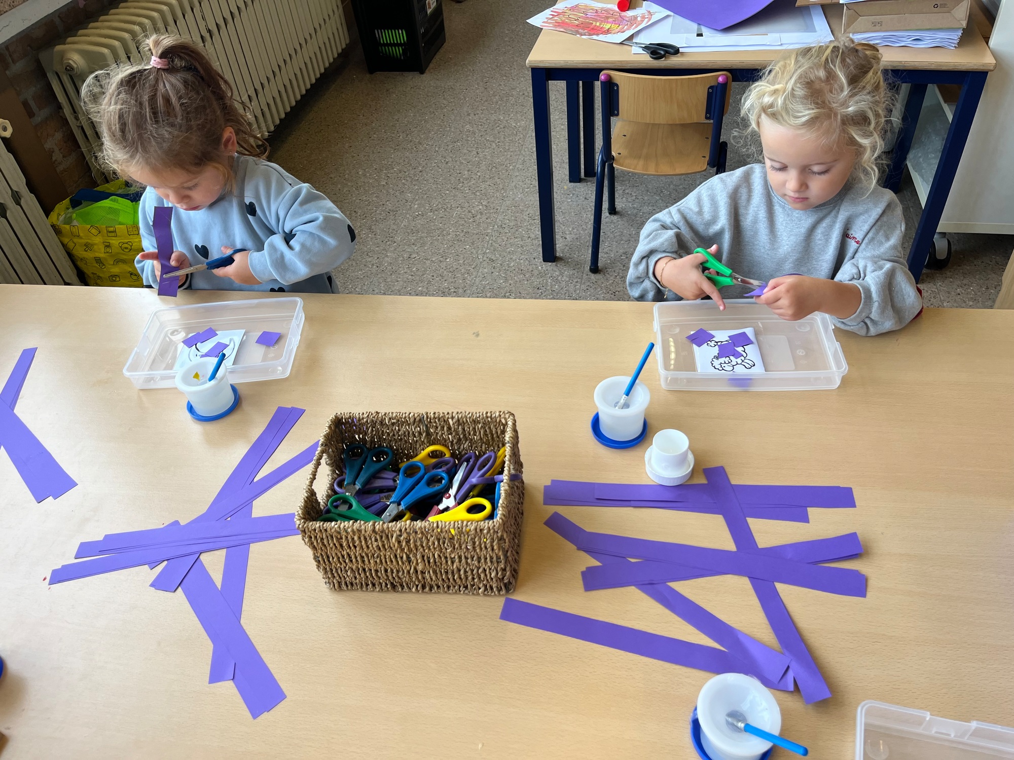 We pasten verschillende technieken toe: knippen, scheuren, schilderen, stempelen, kleven,..