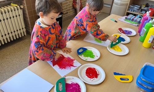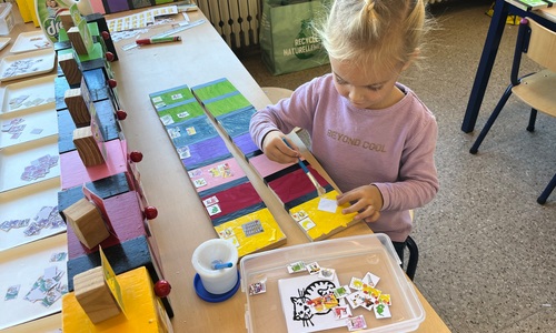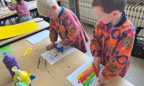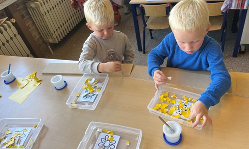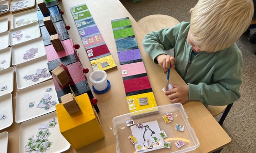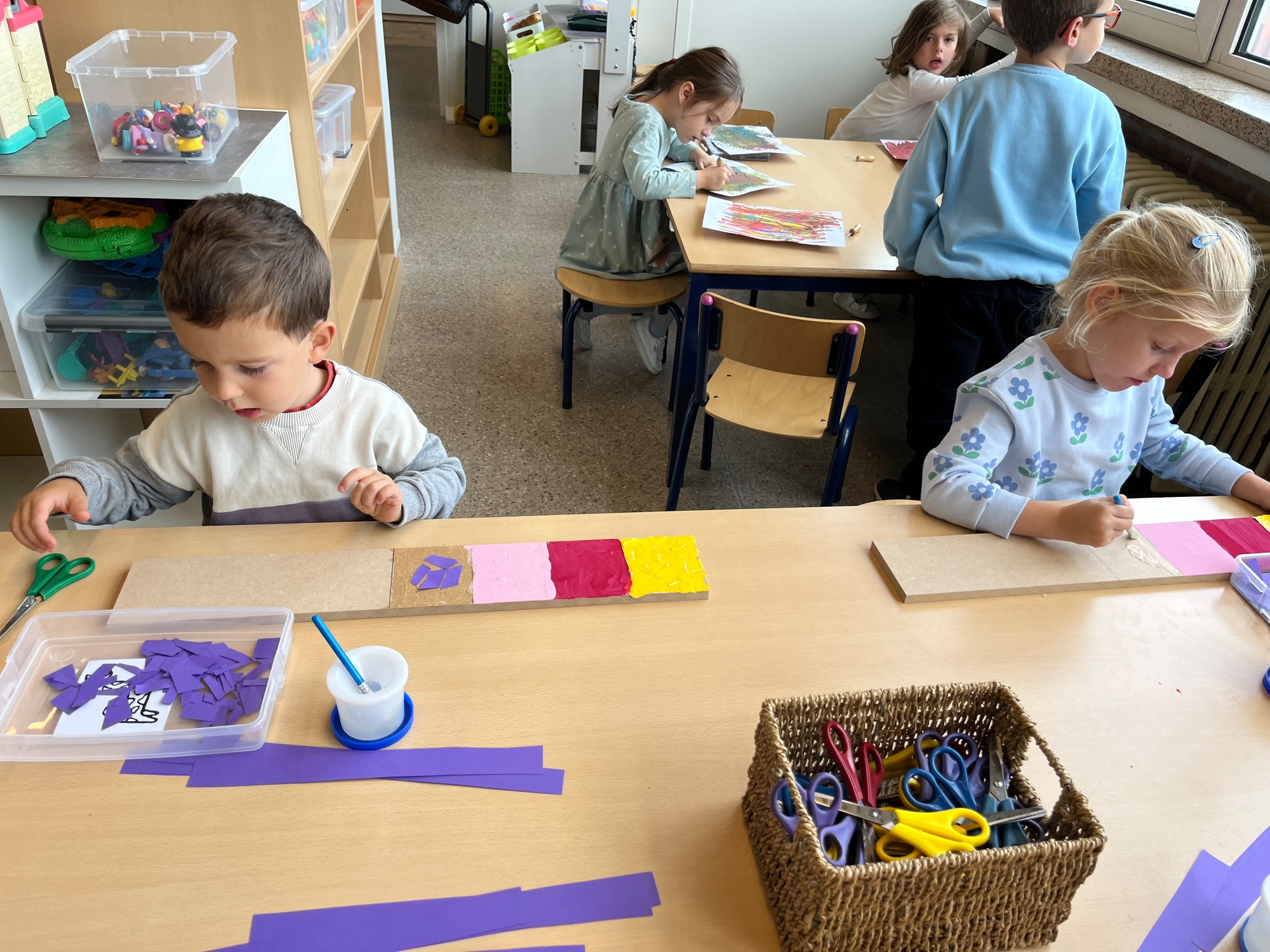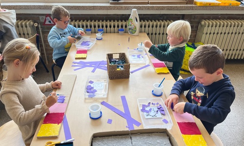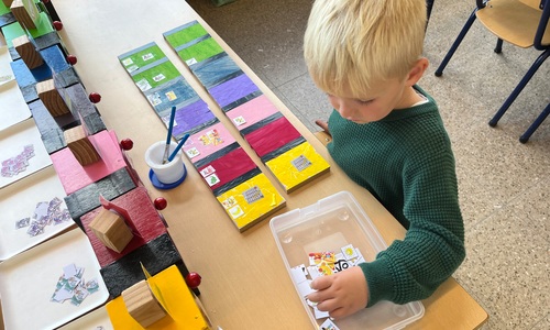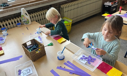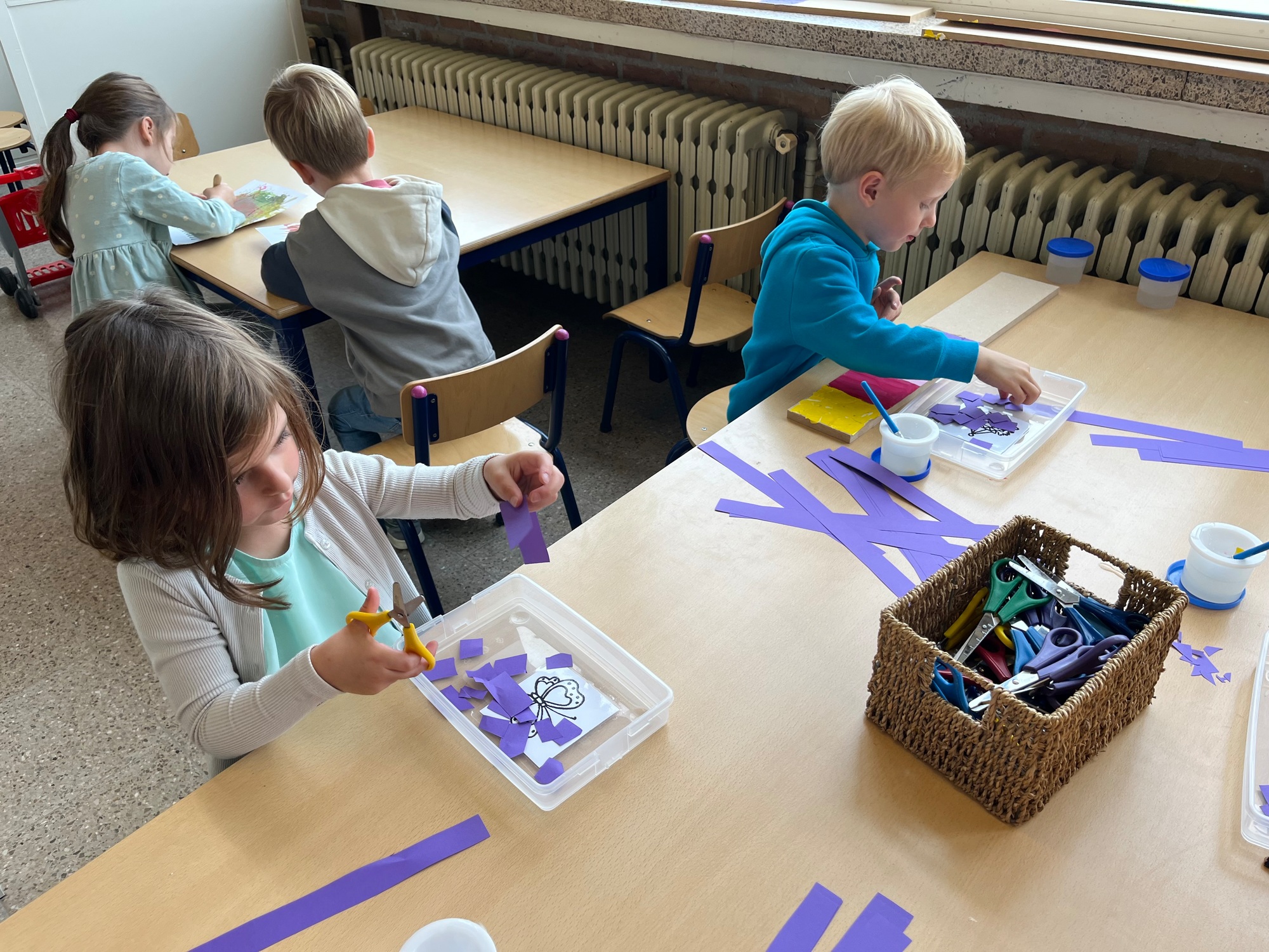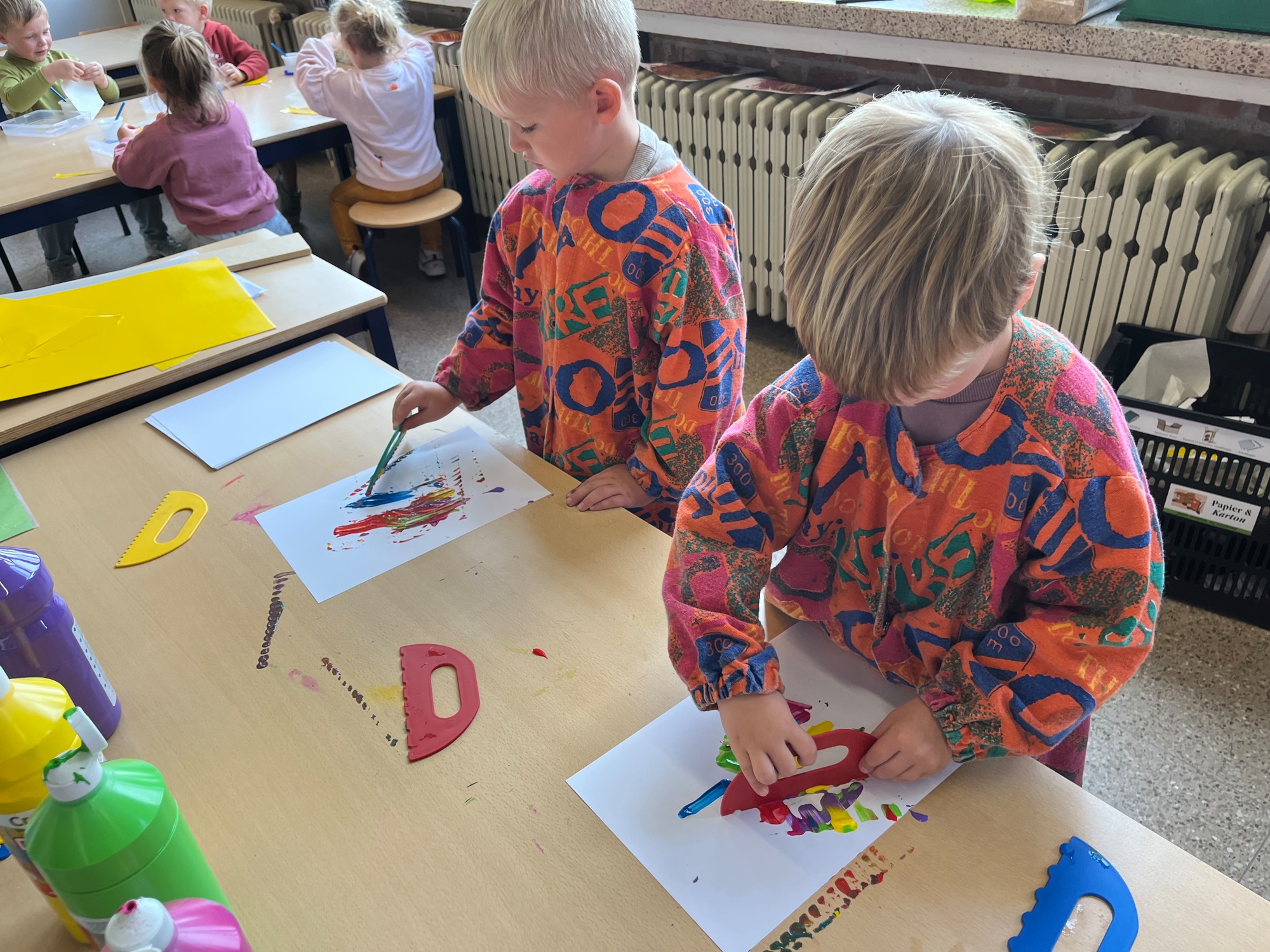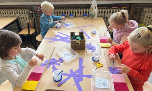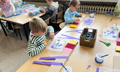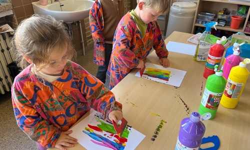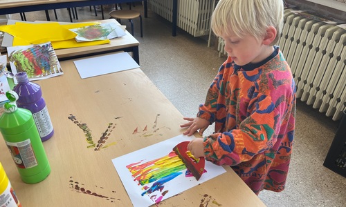 We pasten verschillende technieken toe: knippen, scheuren, schilderen, stempelen, kleven,..