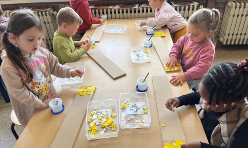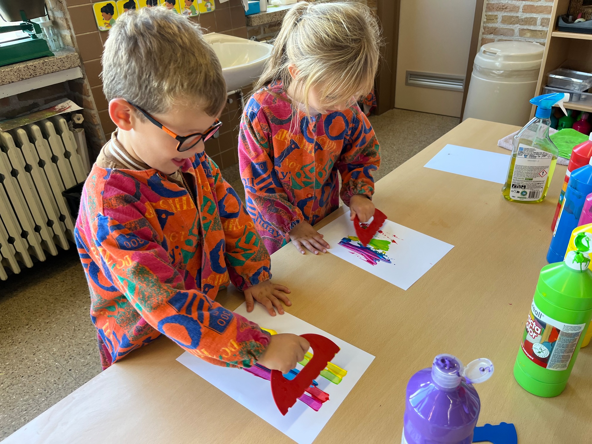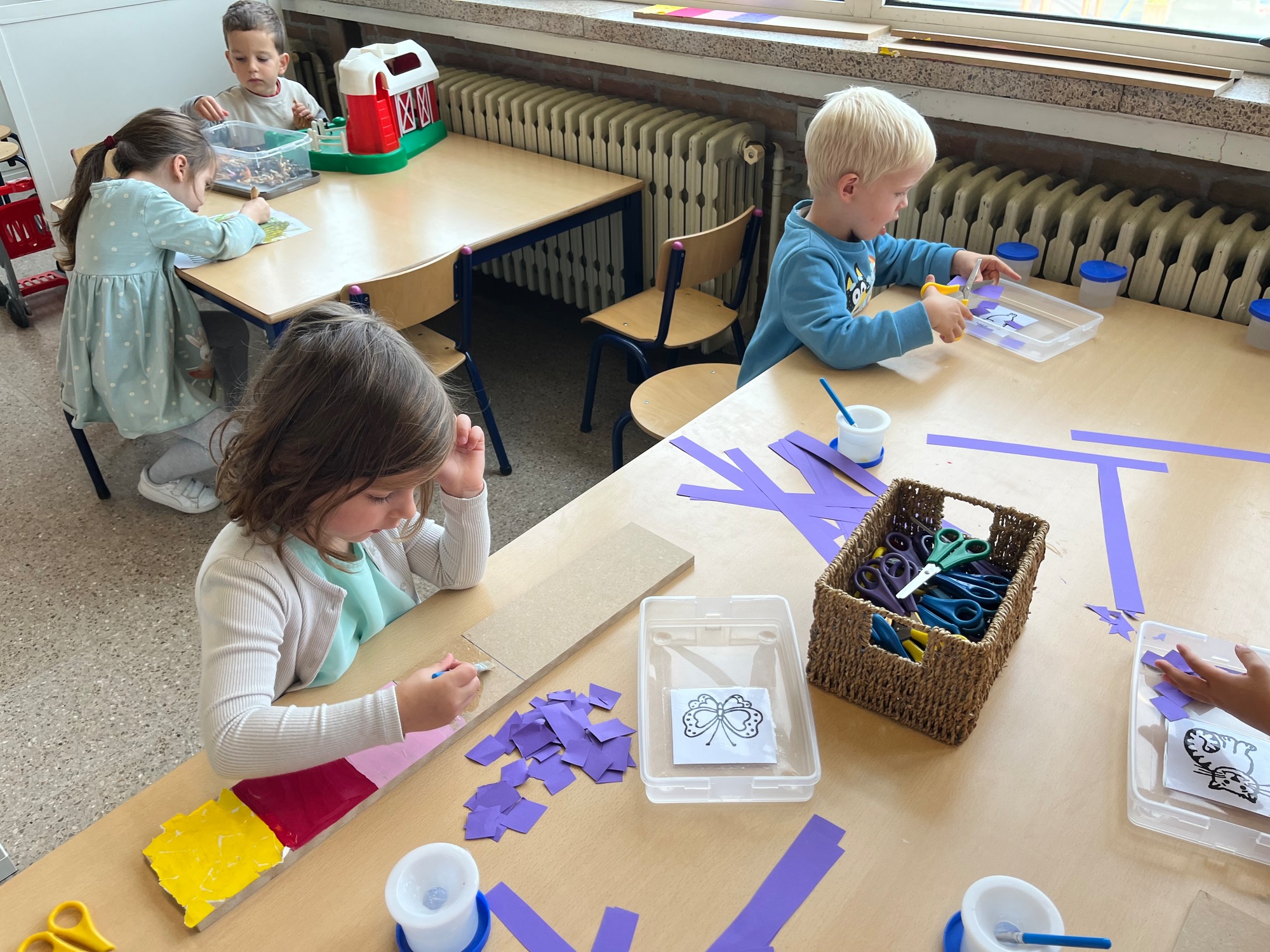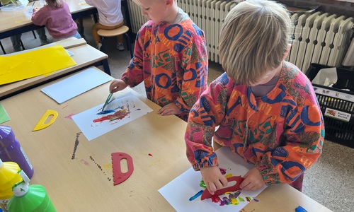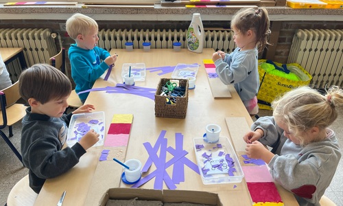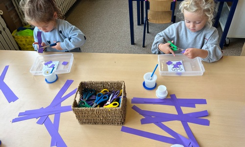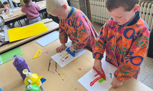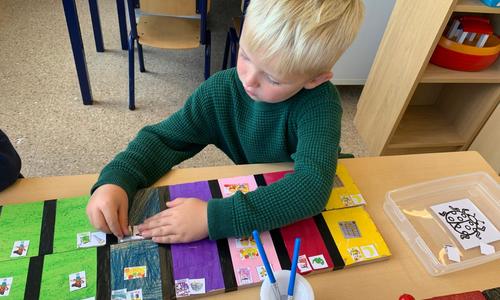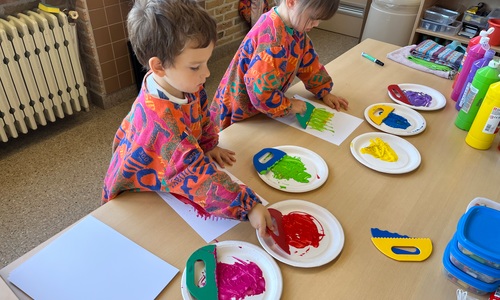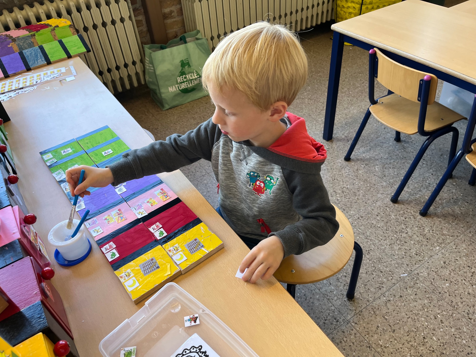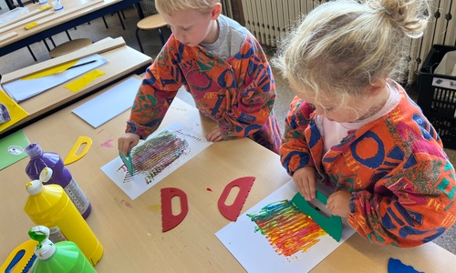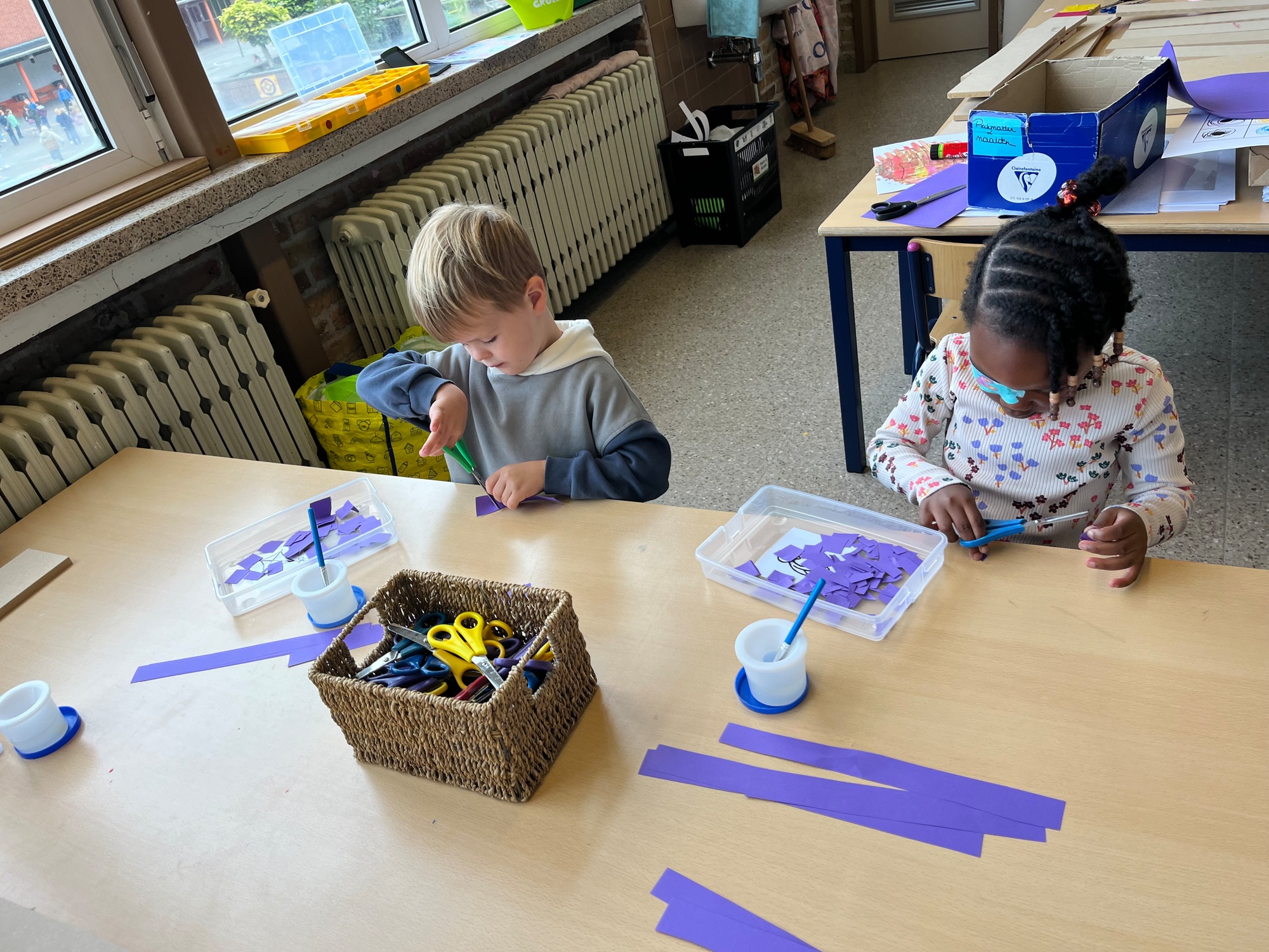 We pasten verschillende technieken toe: knippen, scheuren, schilderen, stempelen, kleven,..
