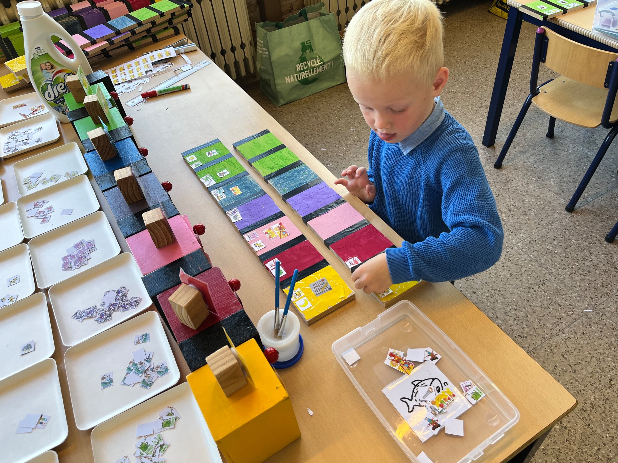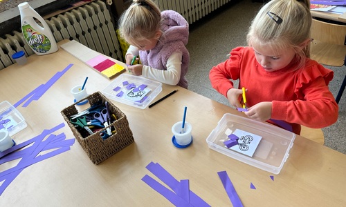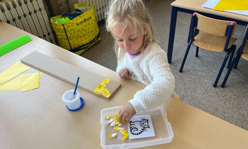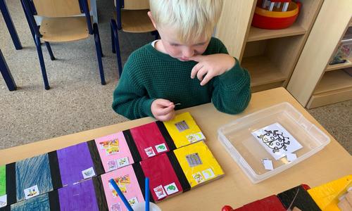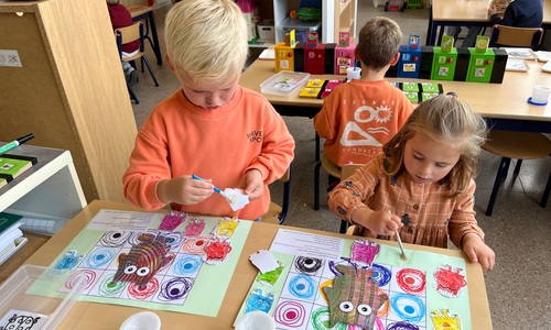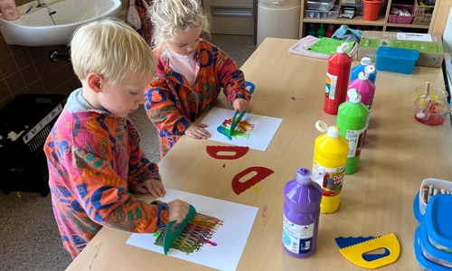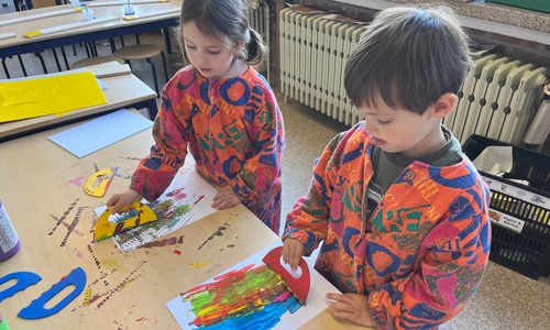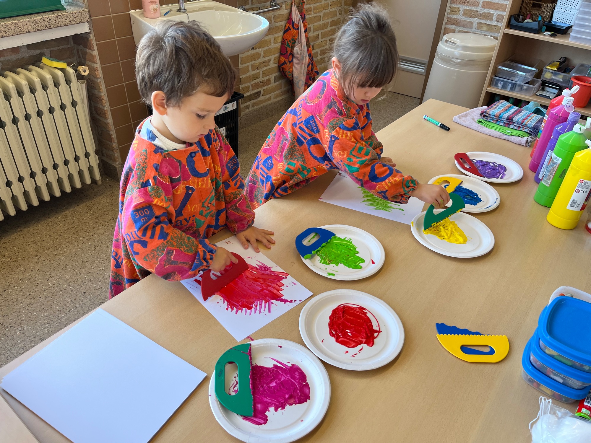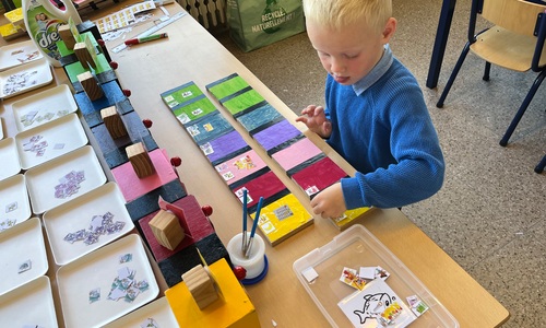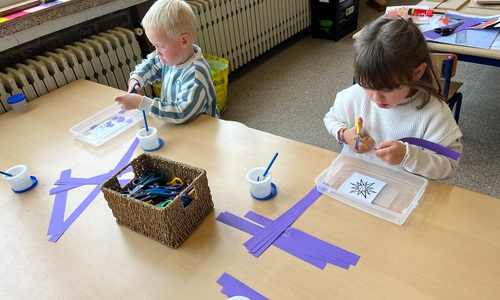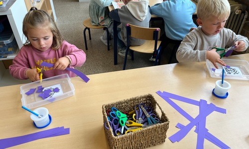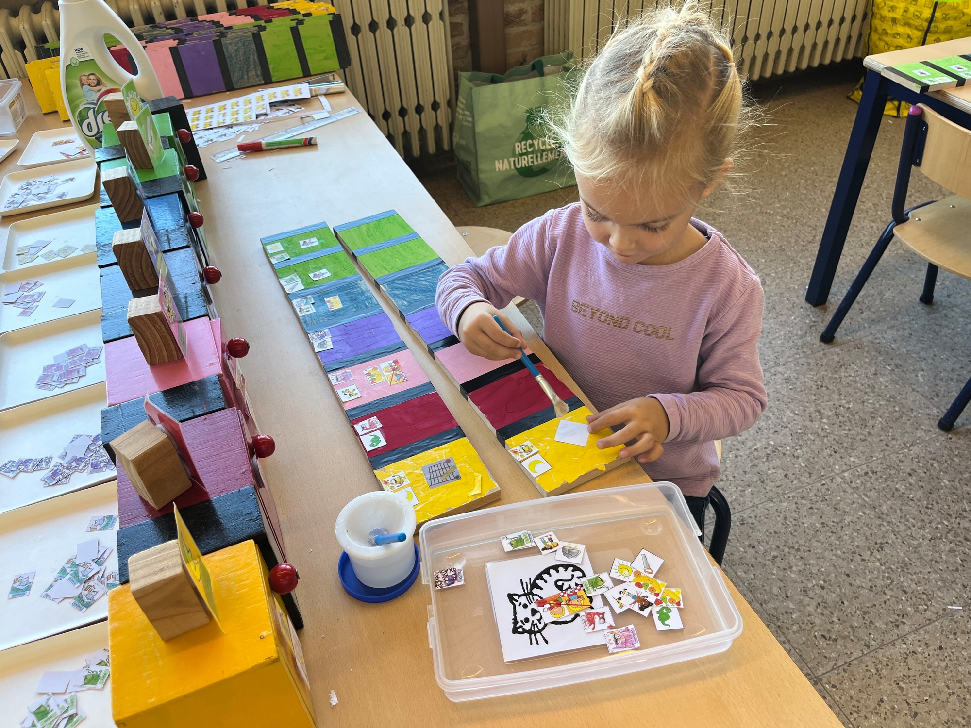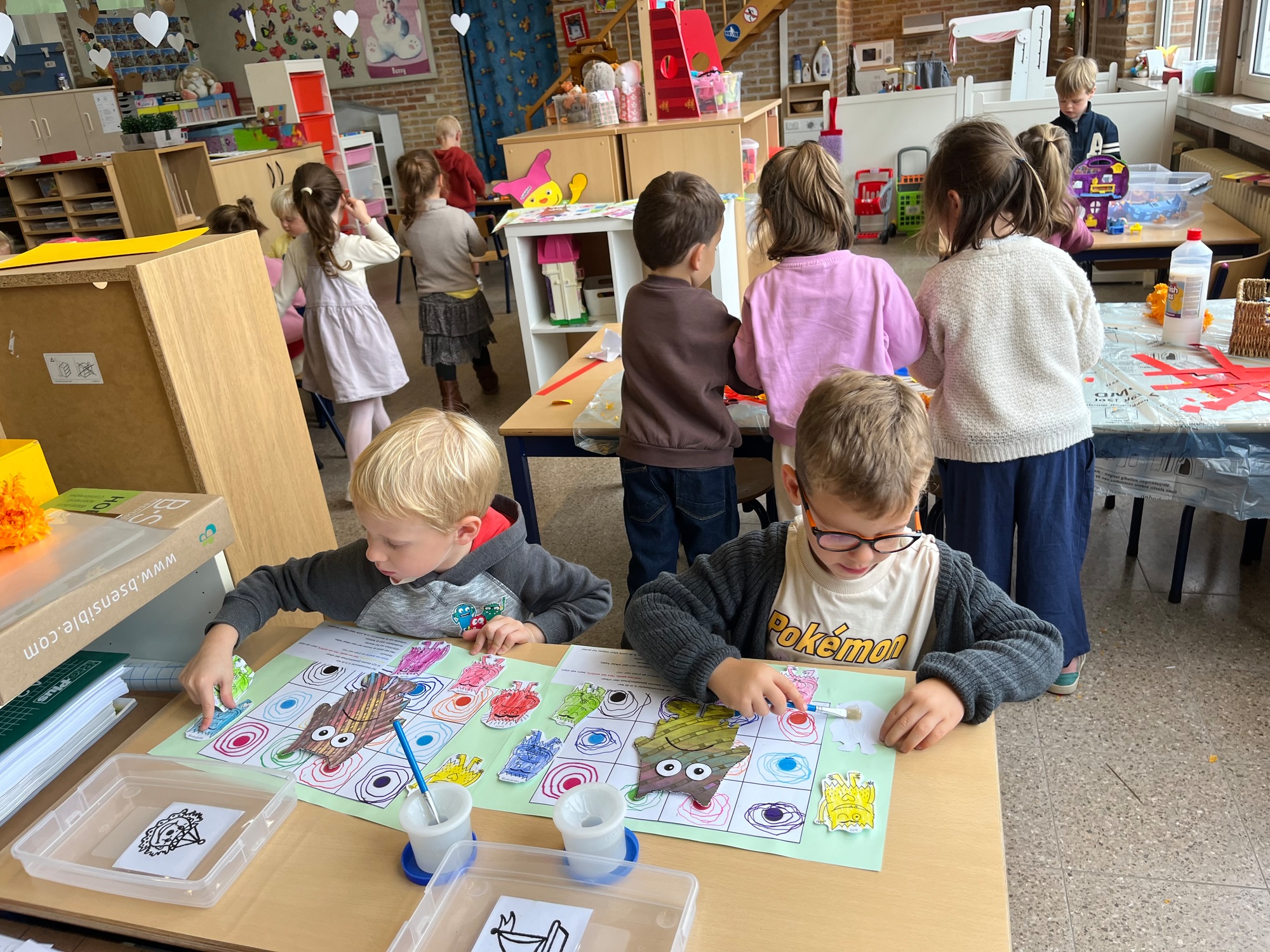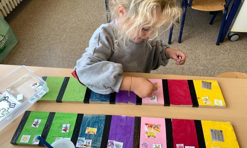 We pasten verschillende technieken toe: knippen, scheuren, schilderen, stempelen, kleven,..