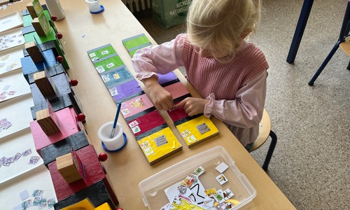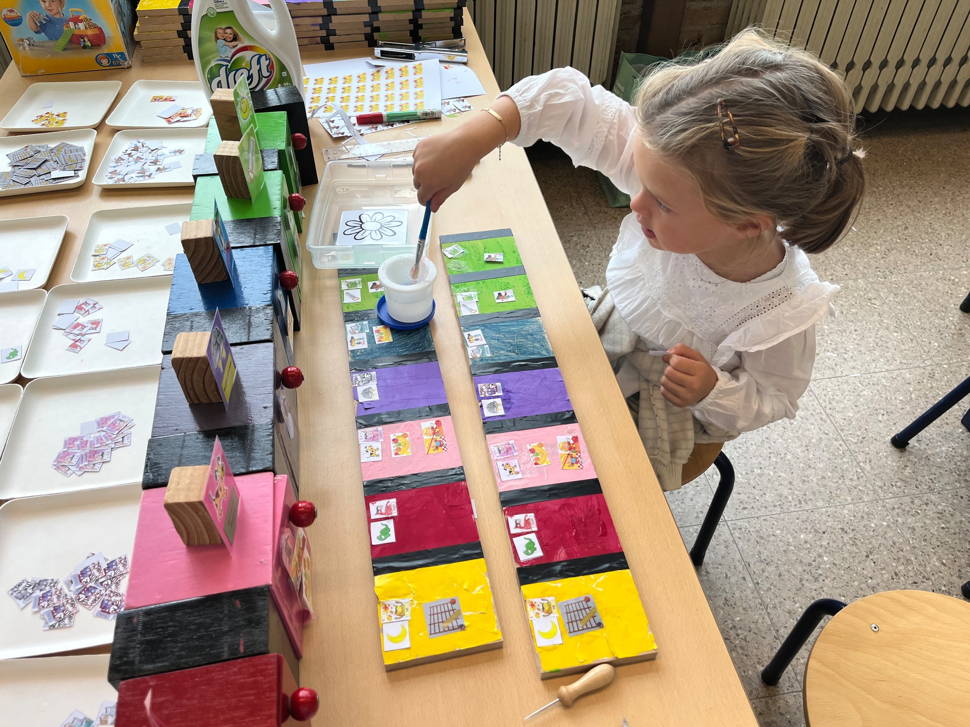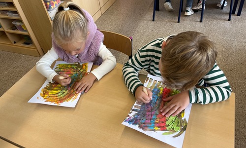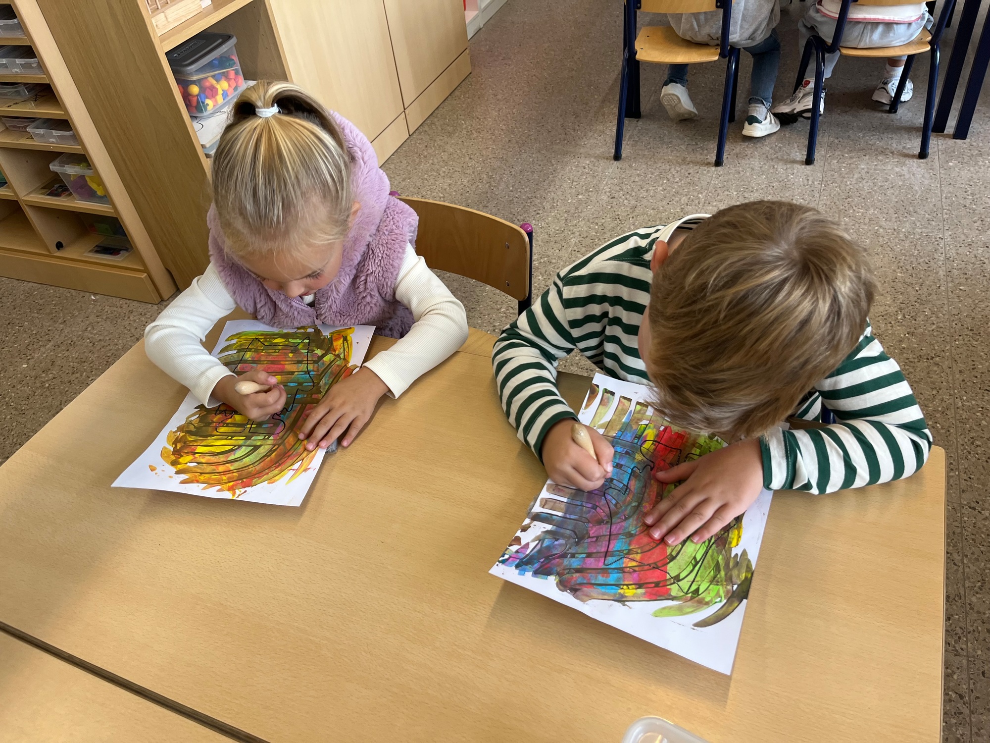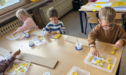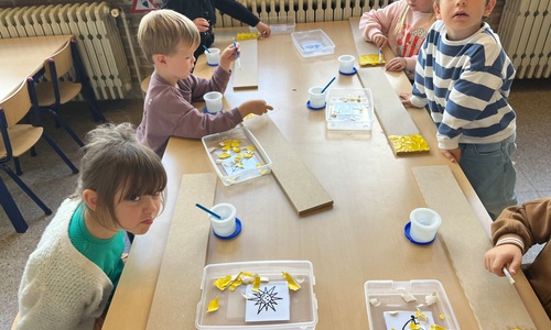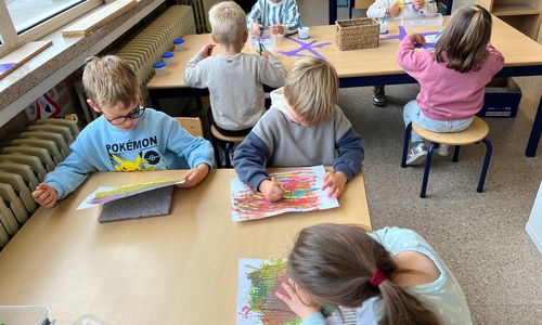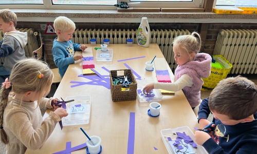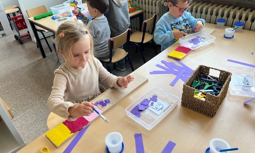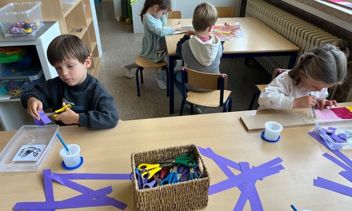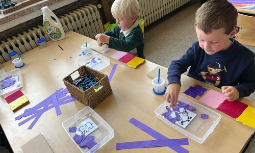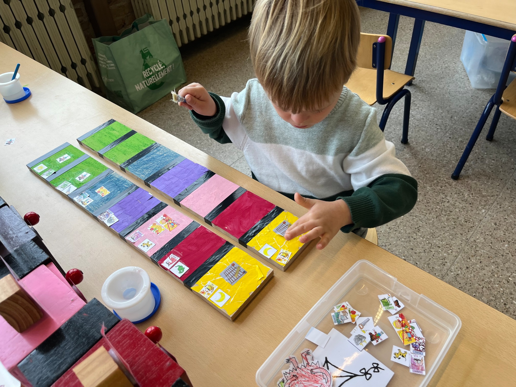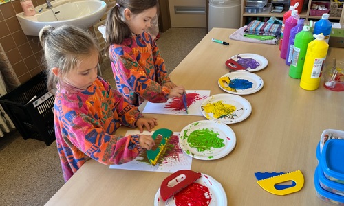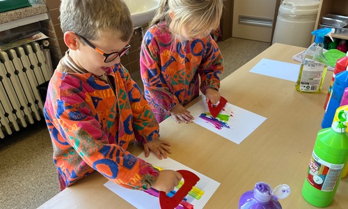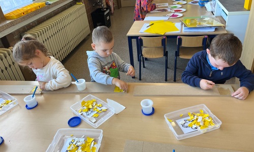 We pasten verschillende technieken toe: knippen, scheuren, schilderen, stempelen, kleven,..