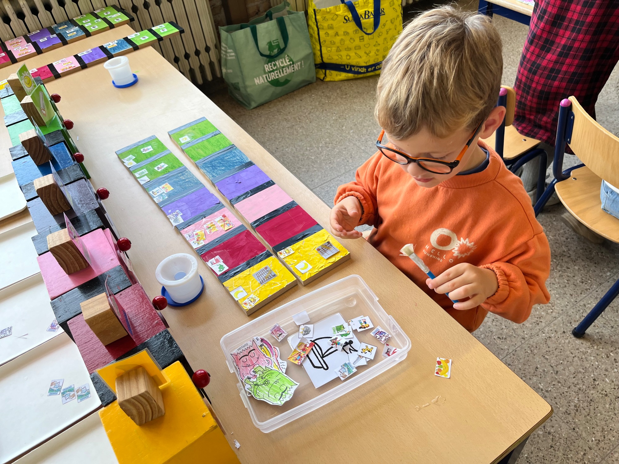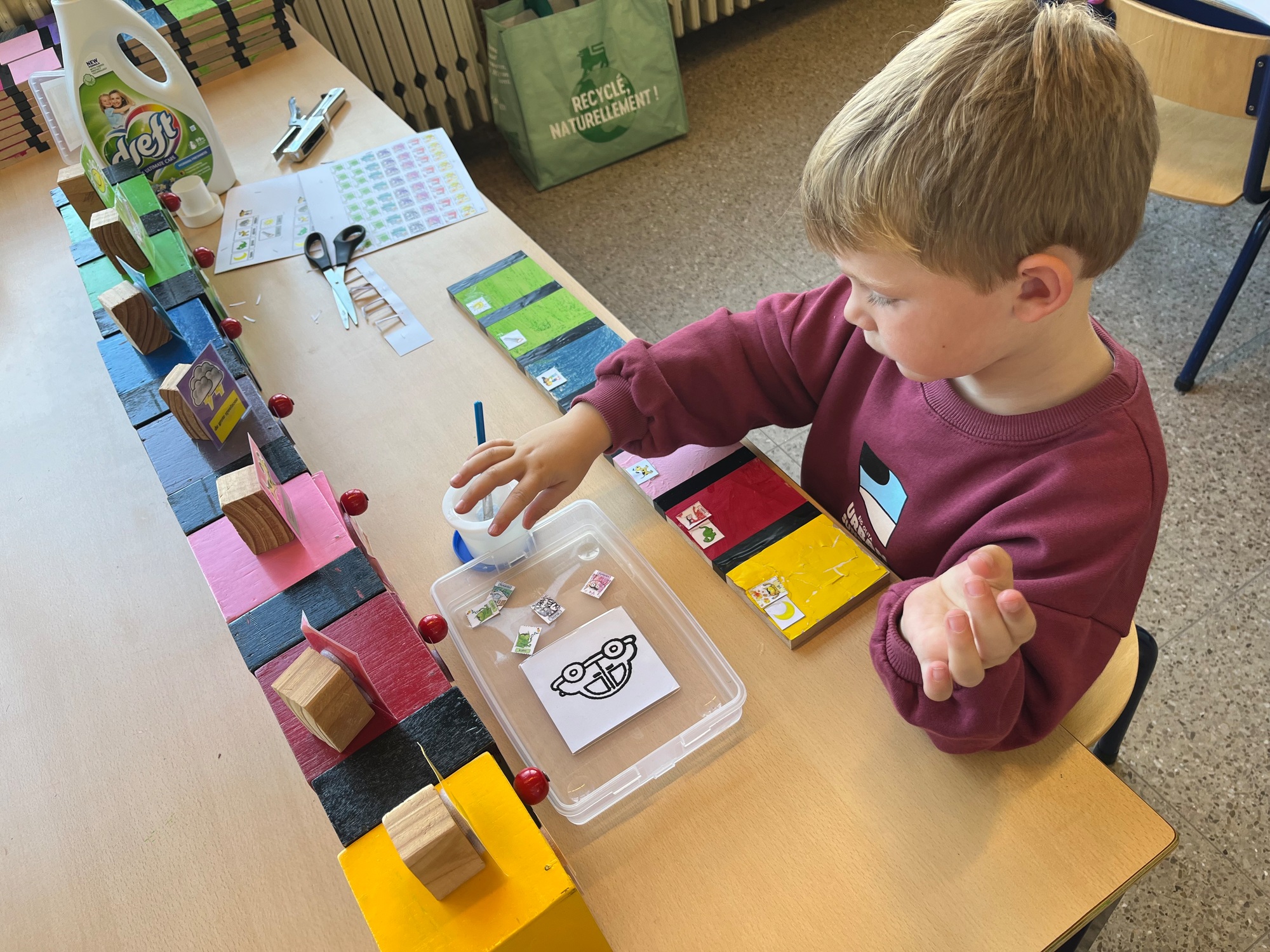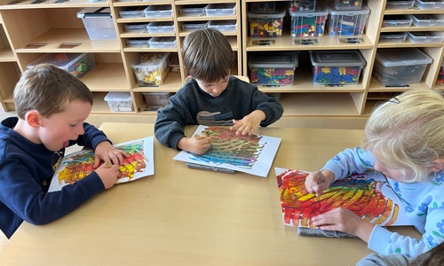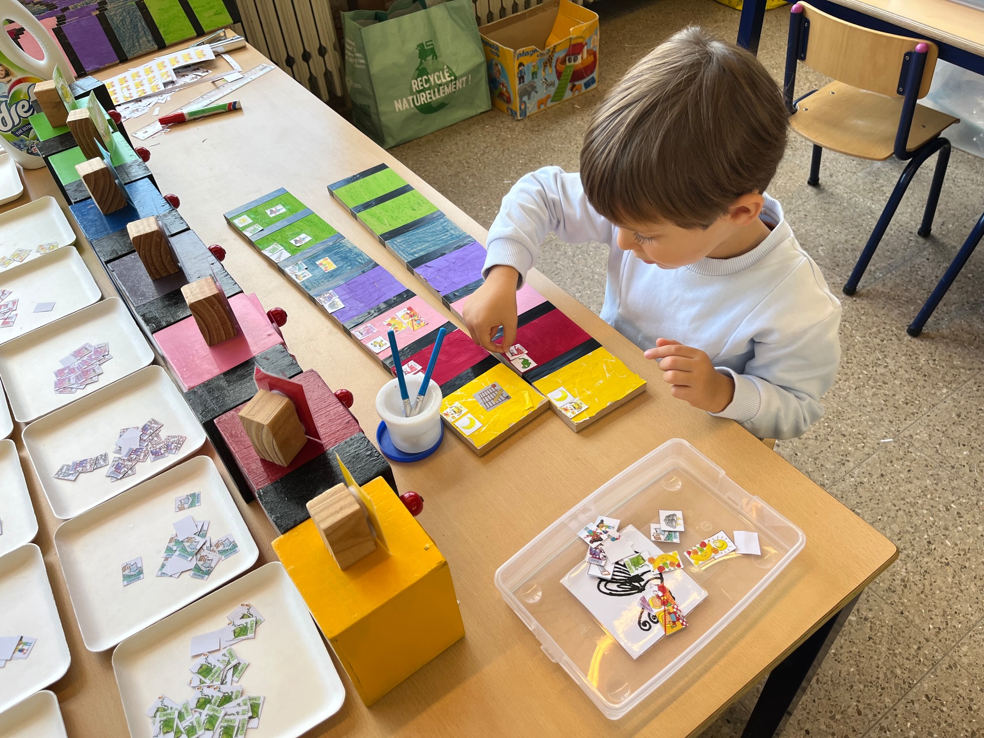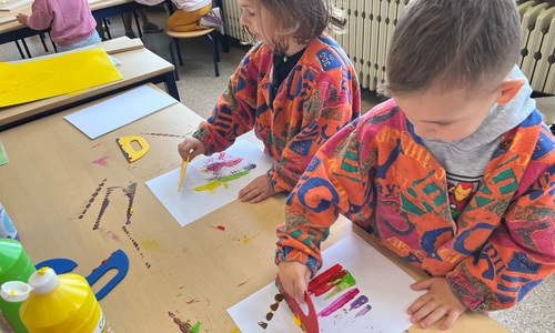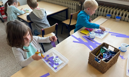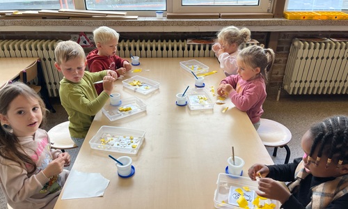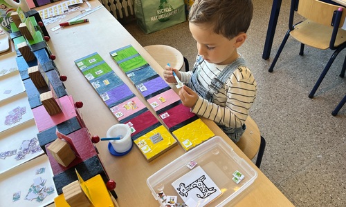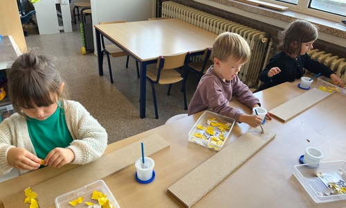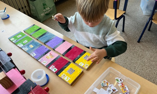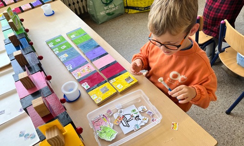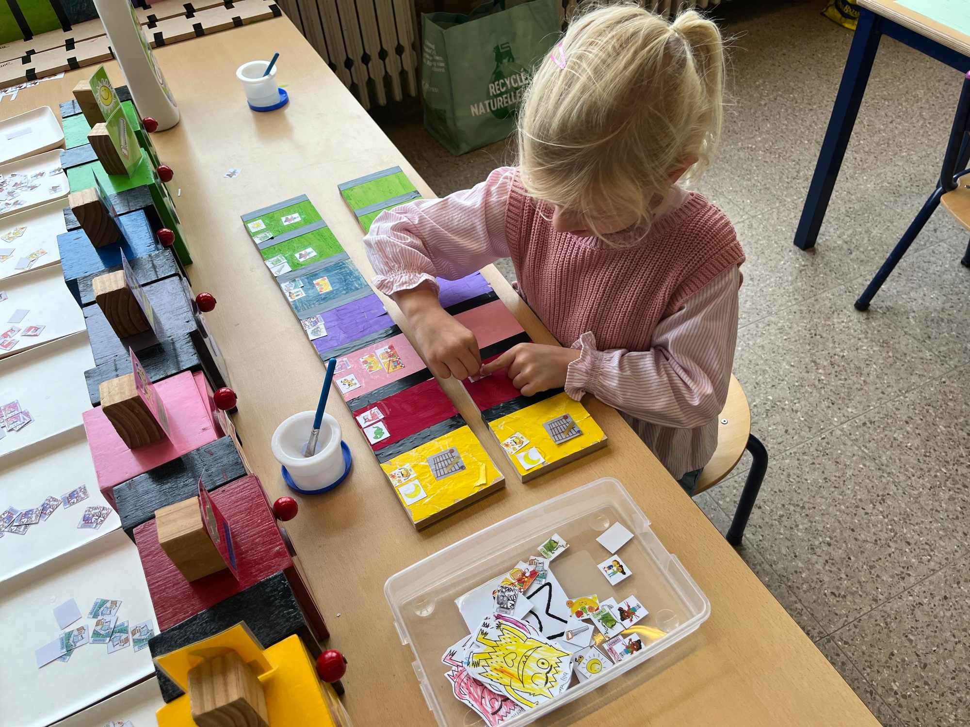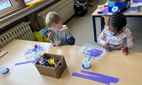 We pasten verschillende technieken toe: knippen, scheuren, schilderen, stempelen, kleven,..