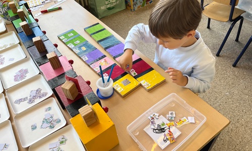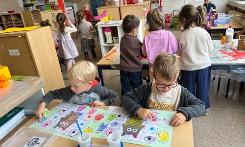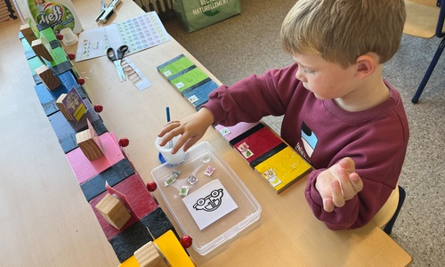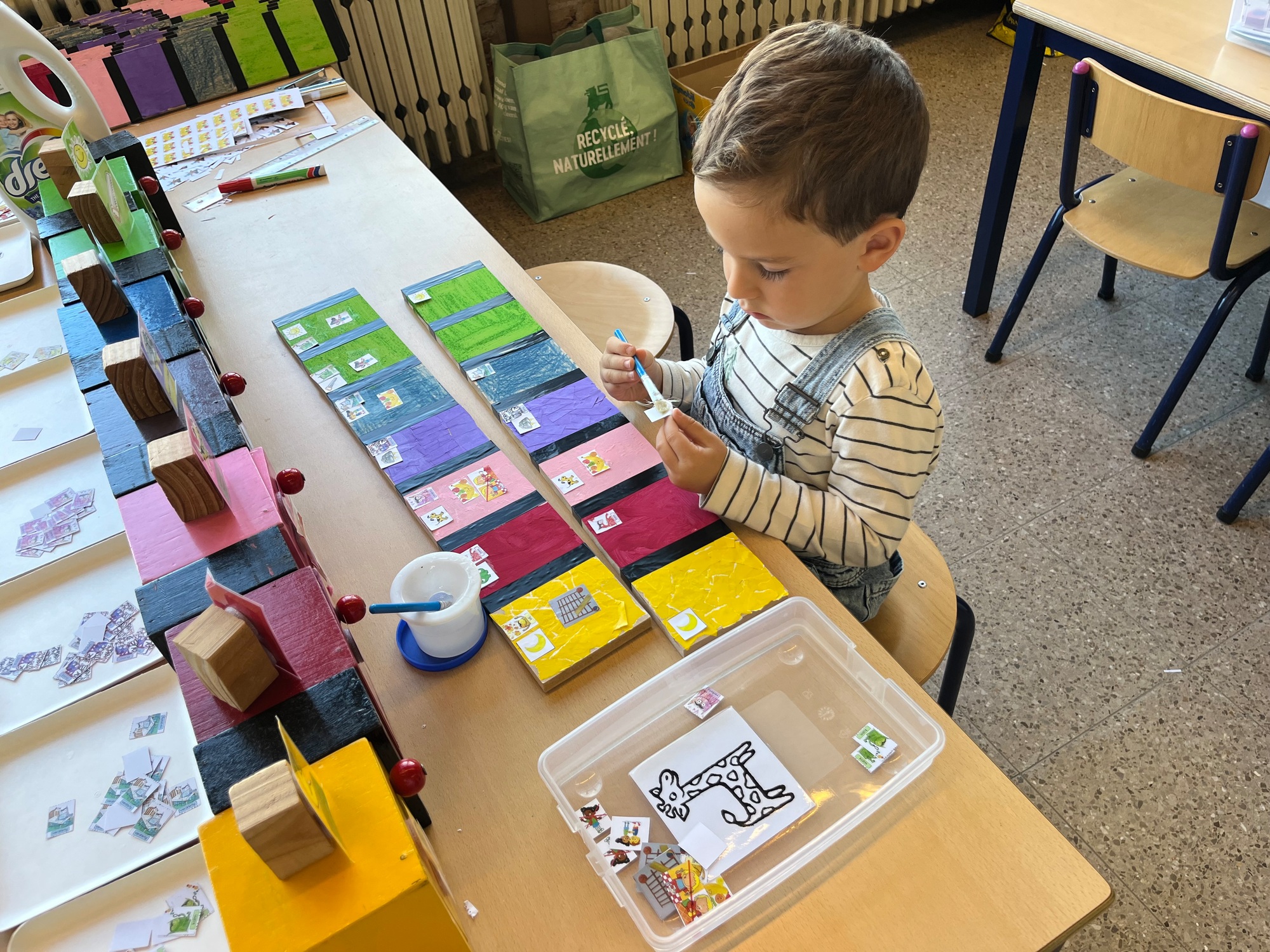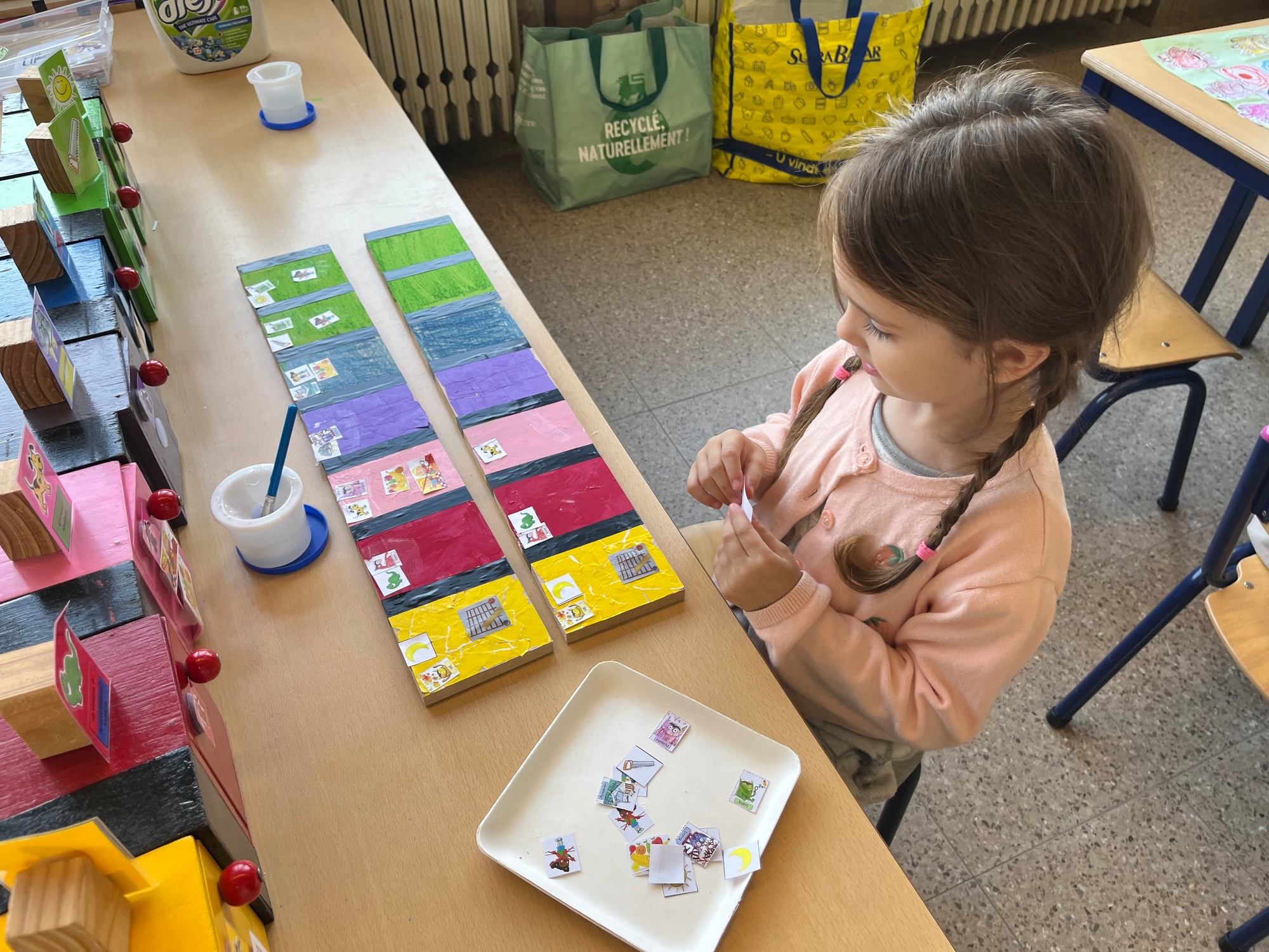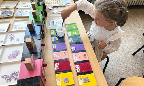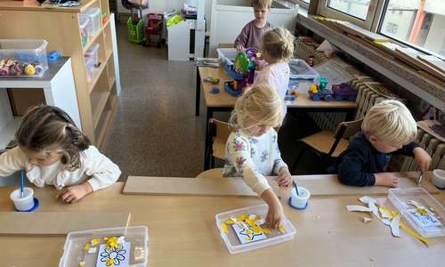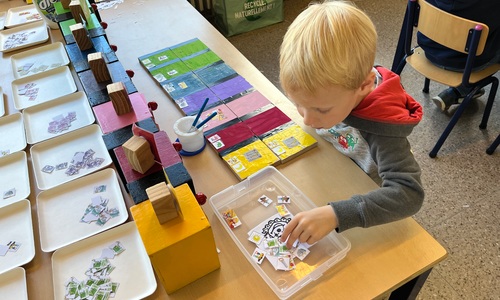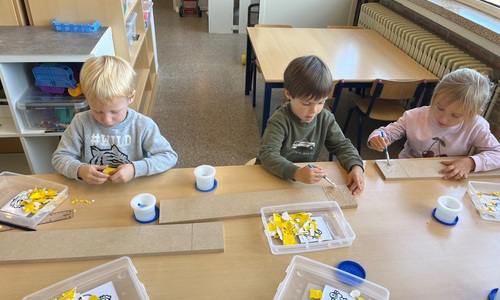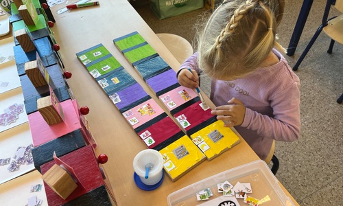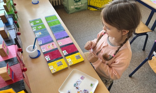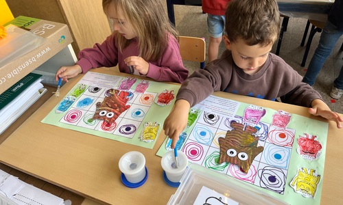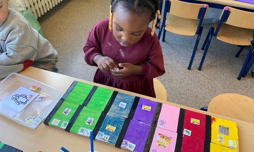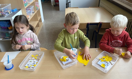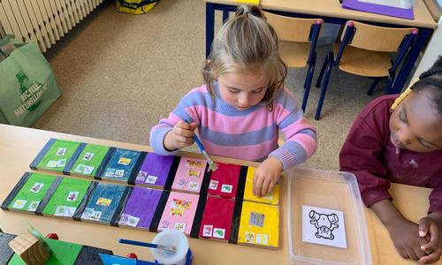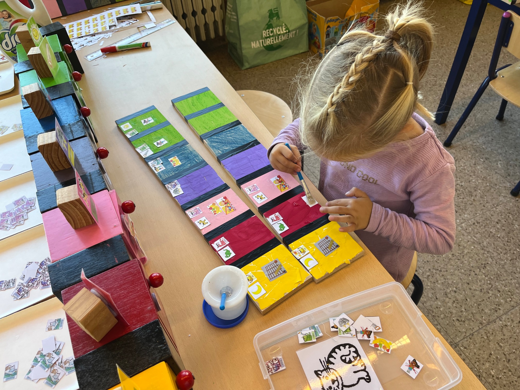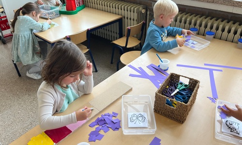 We pasten verschillende technieken toe: knippen, scheuren, schilderen, stempelen, kleven,..
