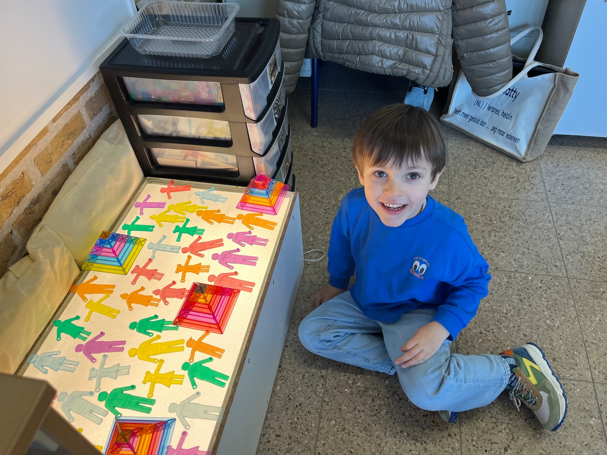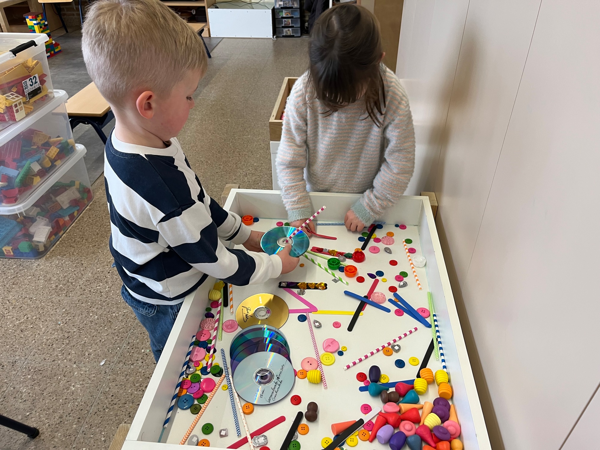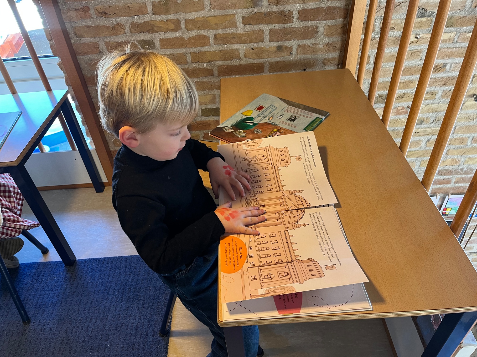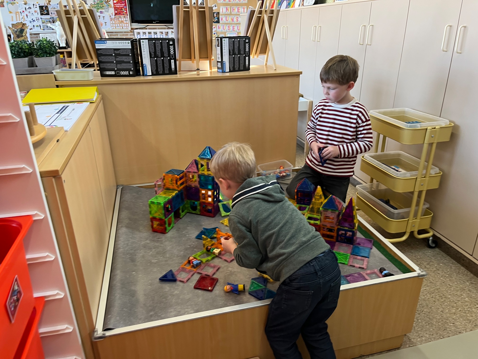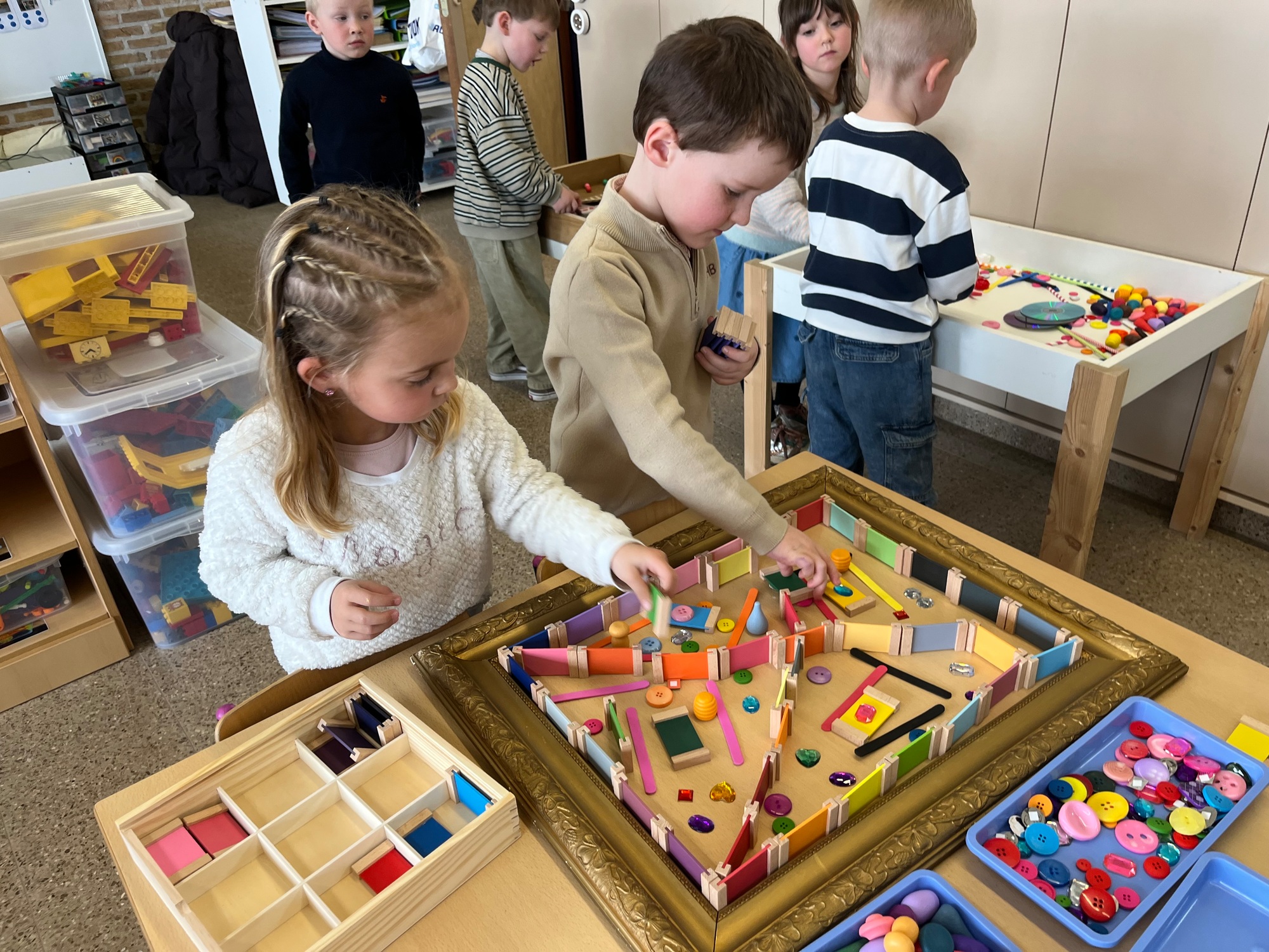 Kunstwerken maken met loose parts, museums bouwen met de magneten, kijken inboeken en vertellen aan elkaar in de boekenhoek