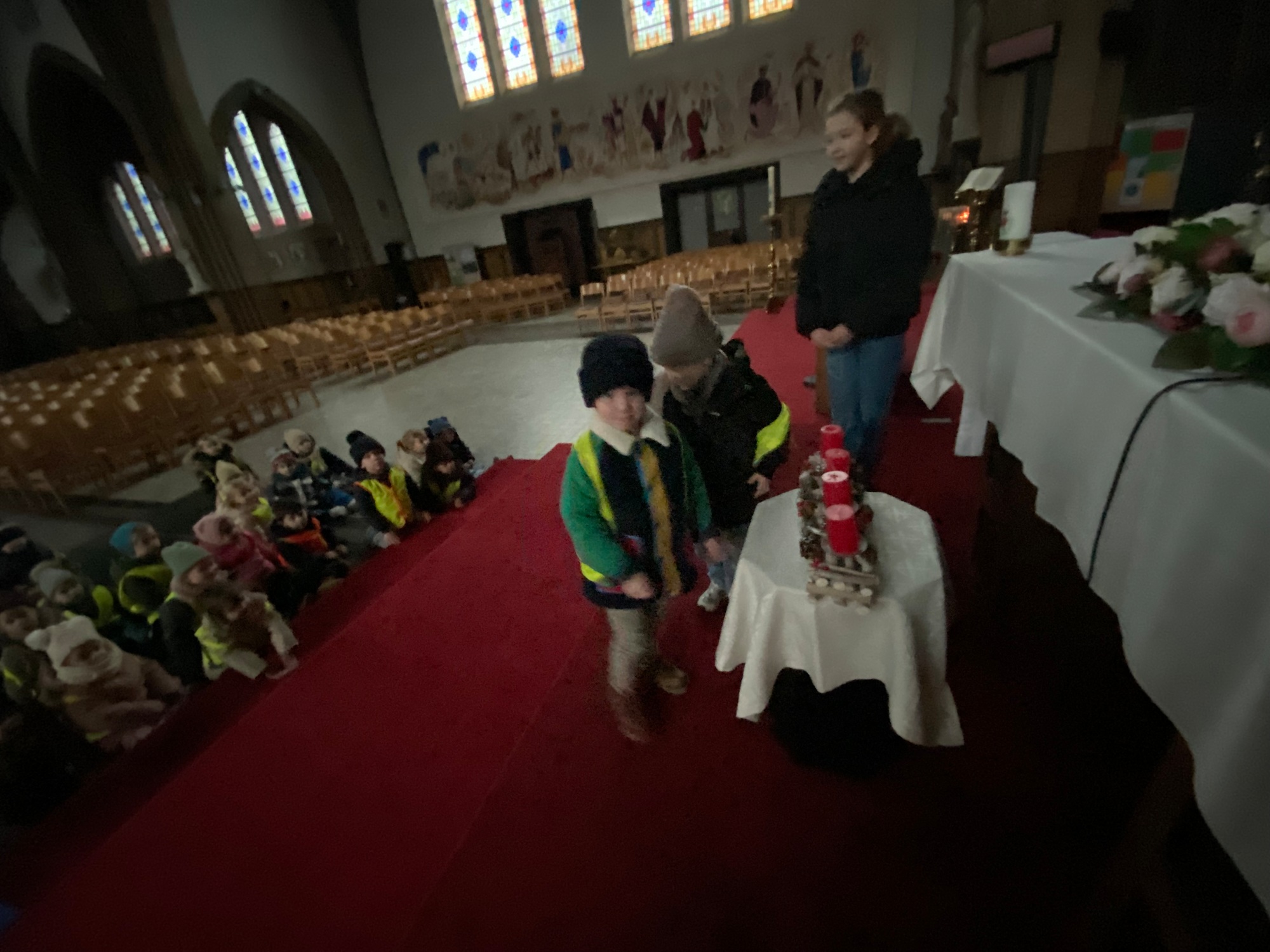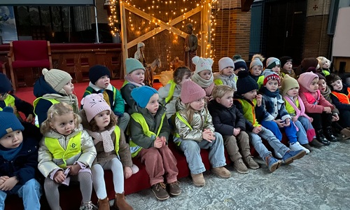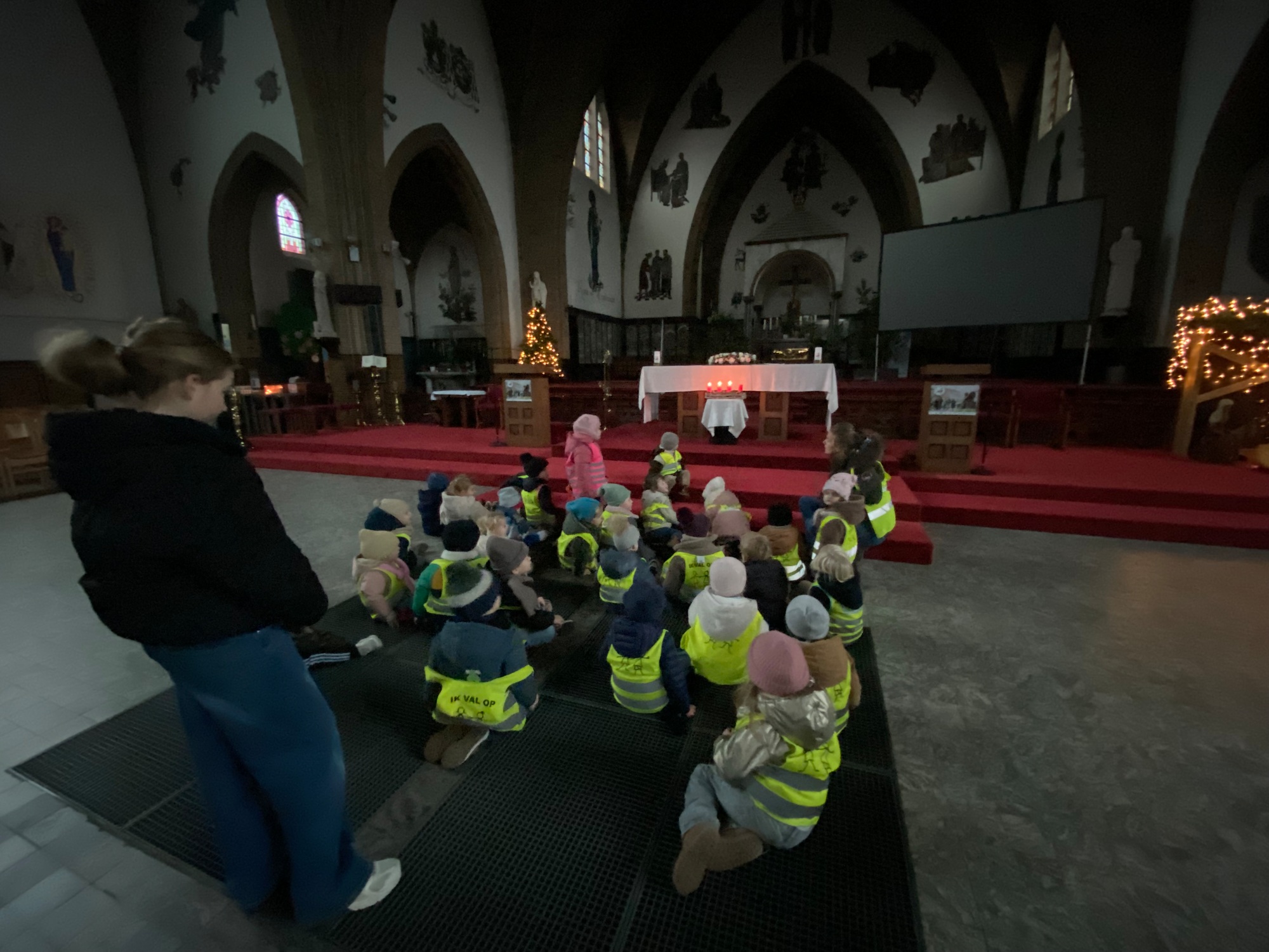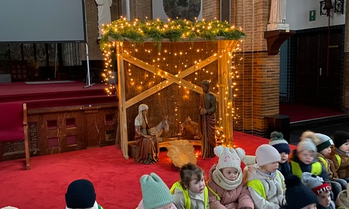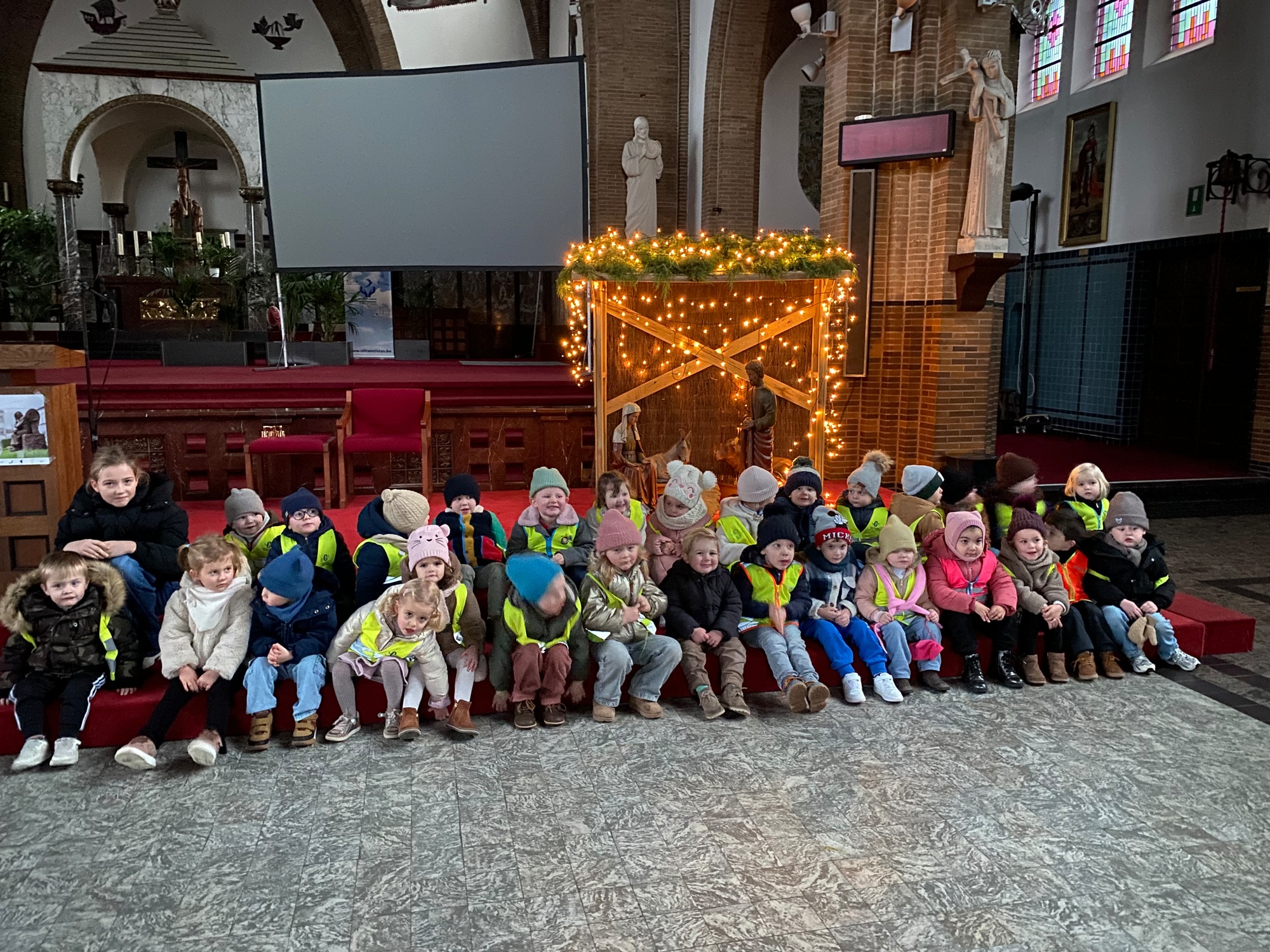 Vandaag gingen we; de kleuters van juf Deborah en juf Els met een pakje naar het sociaal huis. Fien de dochter van juf Deborah was ook mee en hielp ons onderweg. Daarna gingen we naar de kerk om de kerststal te bewonderen. Juf Deborah vertelde het kerstverhaal. We bekeken ook de adventskrans. De kleuters waren vol verwondering.