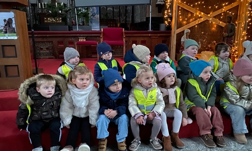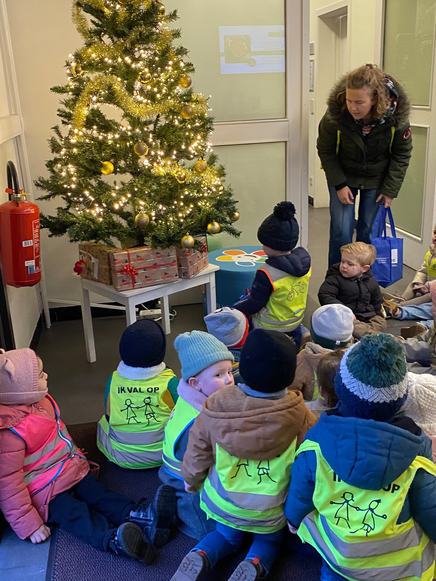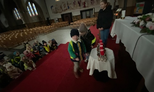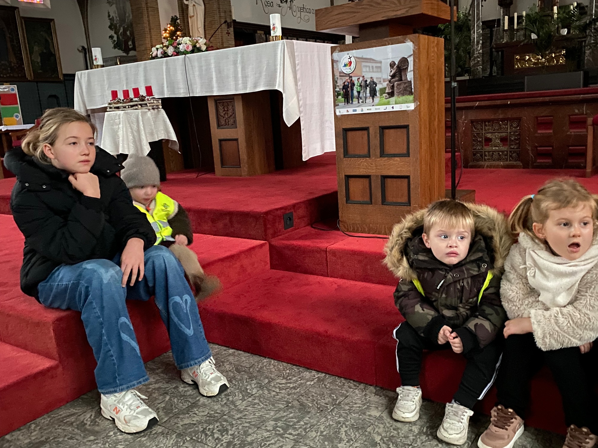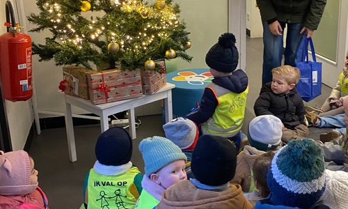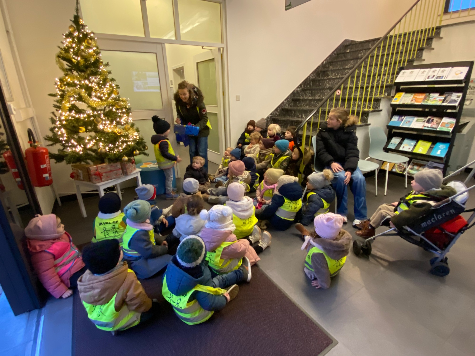Vandaag gingen we; de kleuters van juf Deborah en juf Els met een pakje naar het sociaal huis. Fien de dochter van juf Deborah was ook mee en hielp ons onderweg. Daarna gingen we naar de kerk om de kerststal te bewonderen. Juf Deborah vertelde het kerstverhaal. We bekeken ook de adventskrans. De kleuters waren vol verwondering.