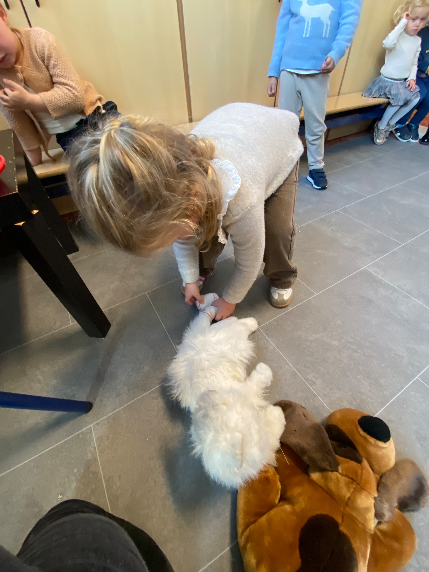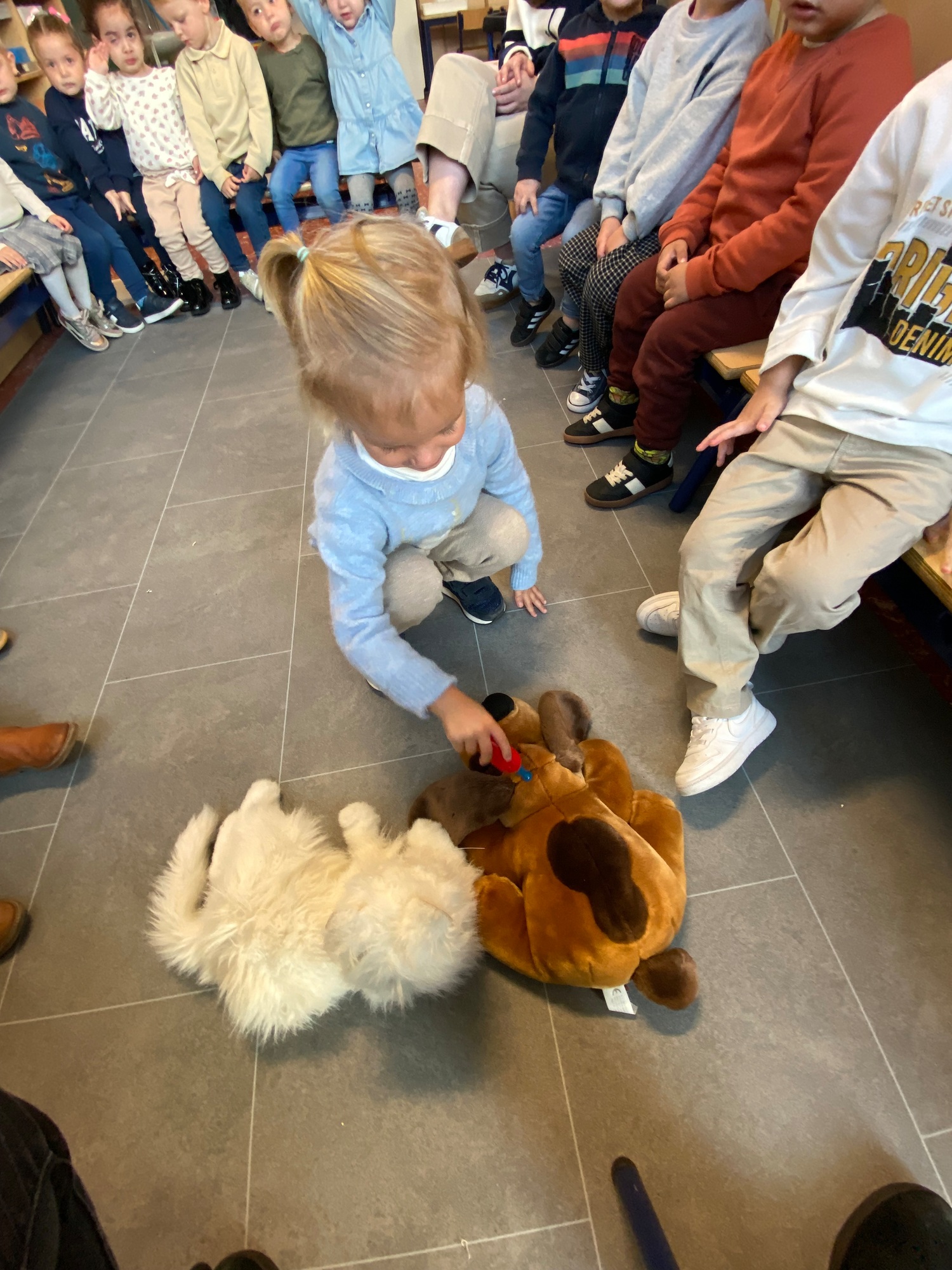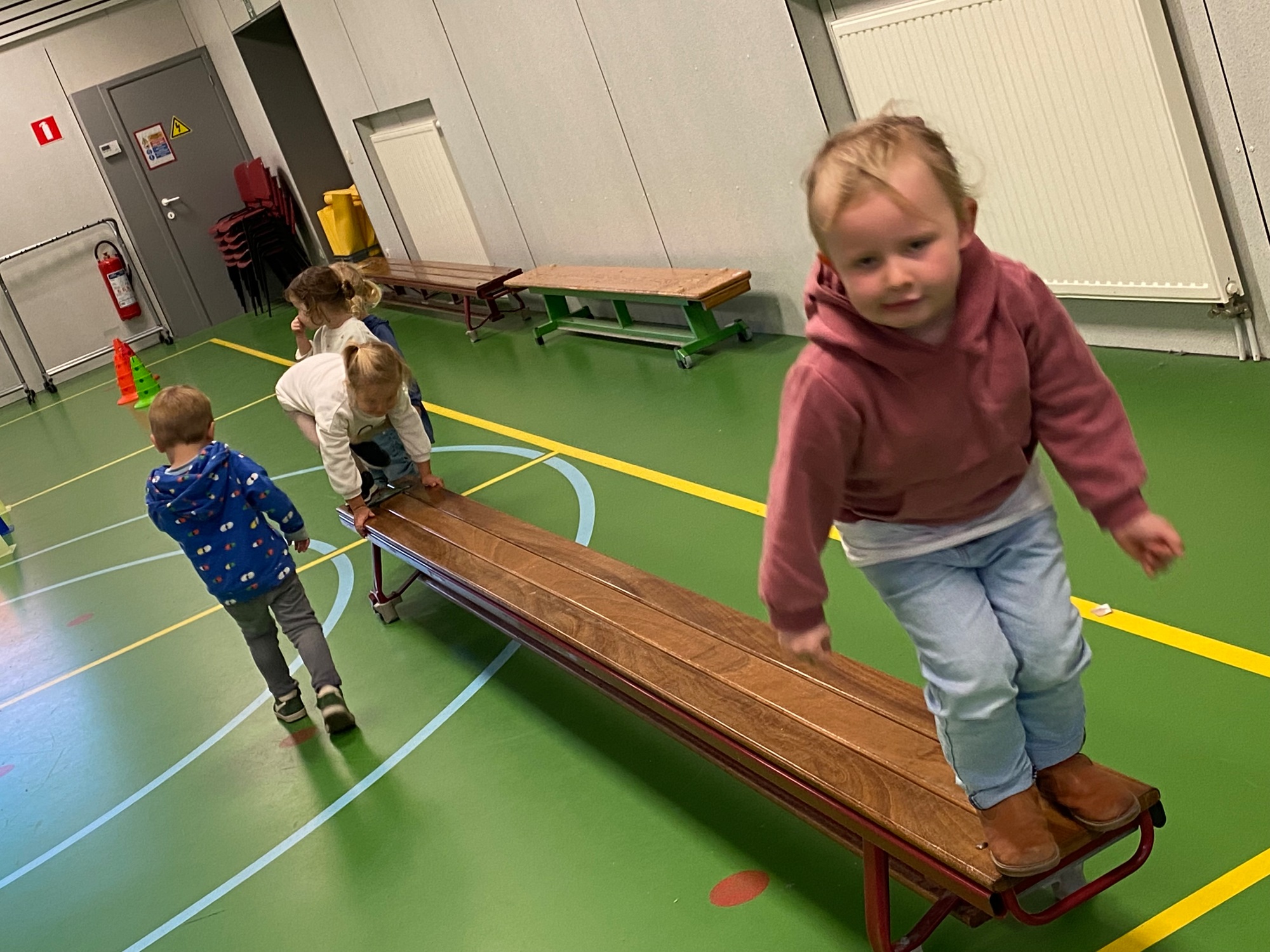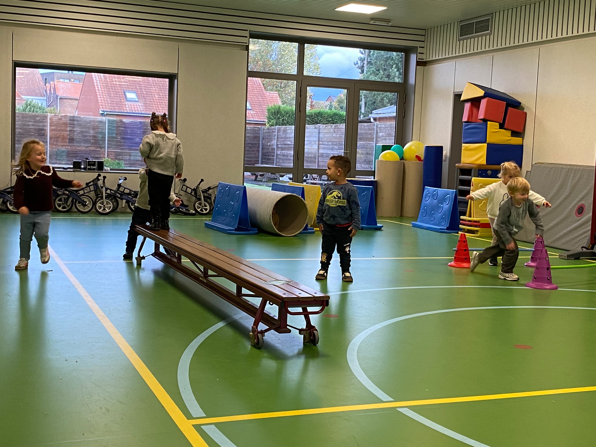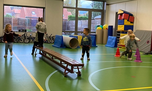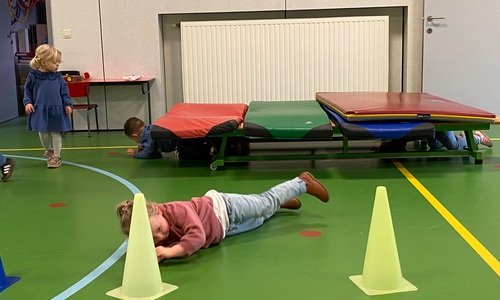 In de gymzaal speelden we de hondenschool waarbij de kleuters allerlei oefeningen moeten uitvoeren.