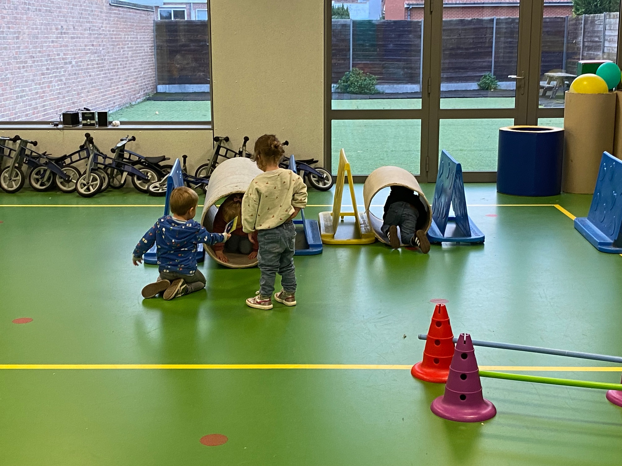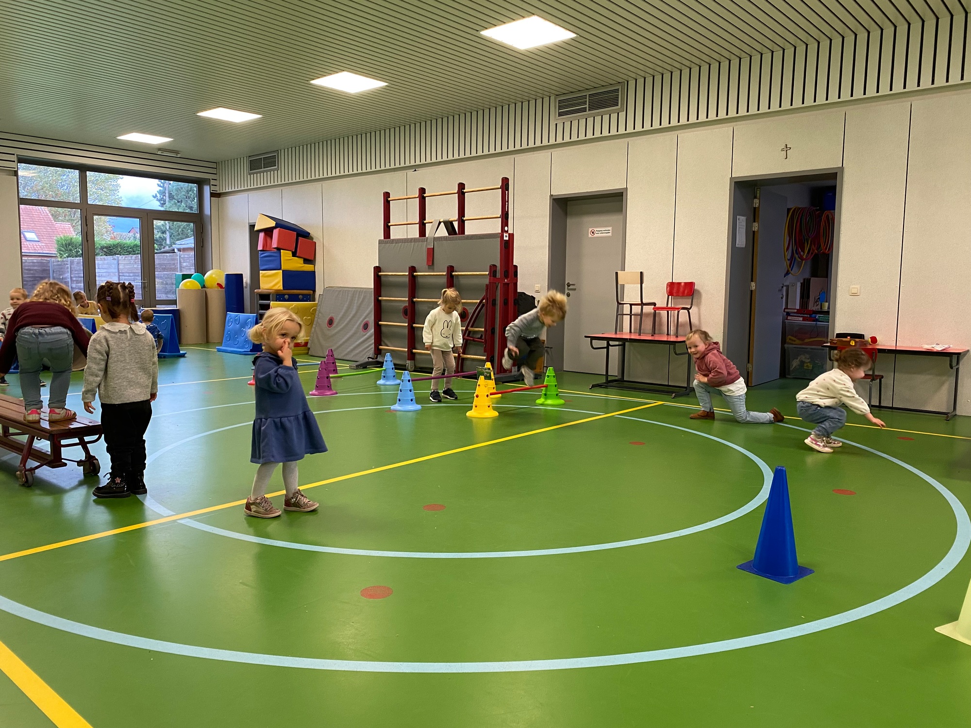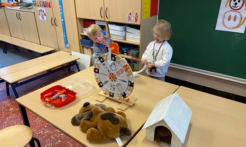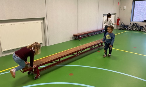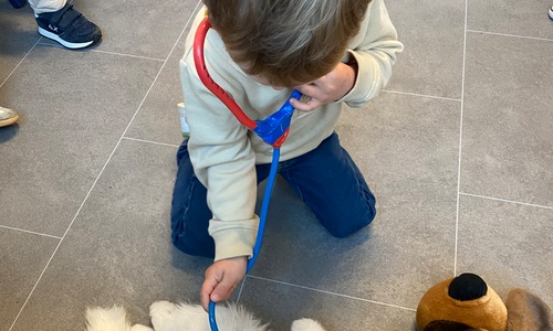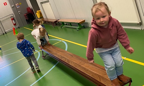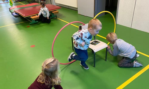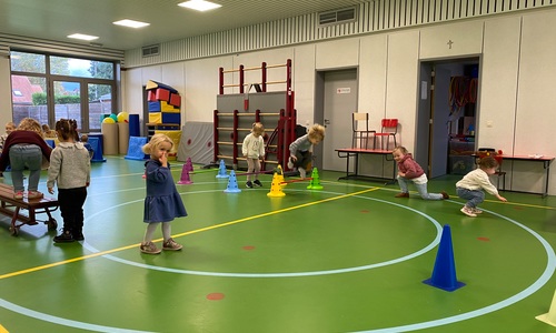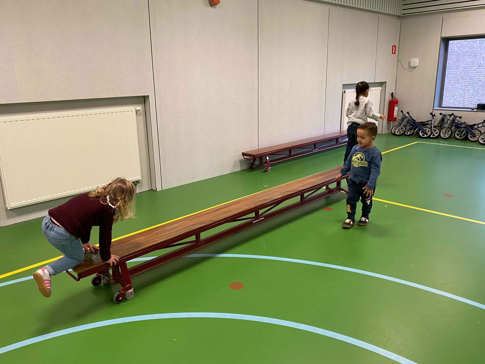 In de gymzaal speelden we de hondenschool waarbij de kleuters allerlei oefeningen moeten uitvoeren.