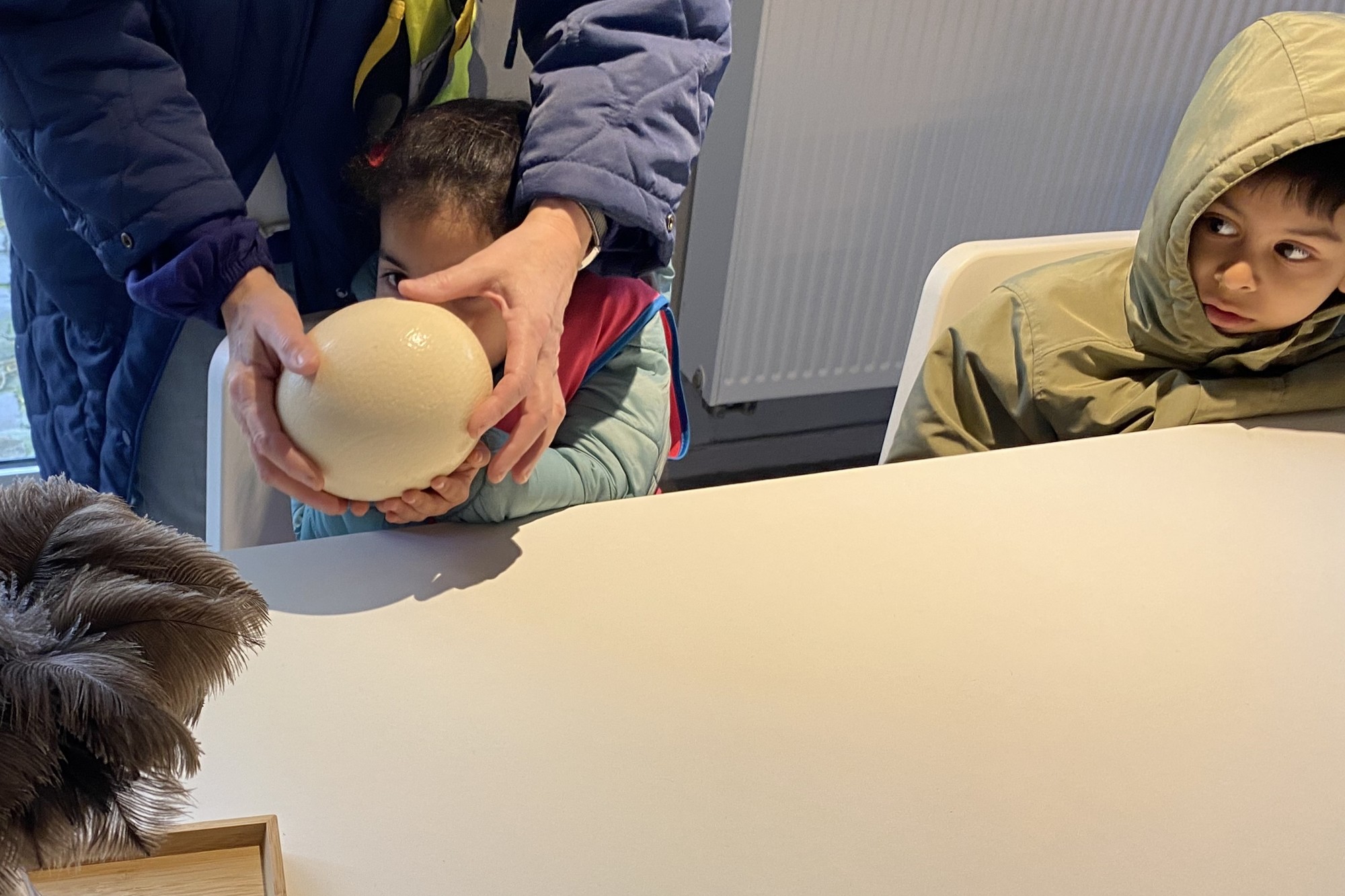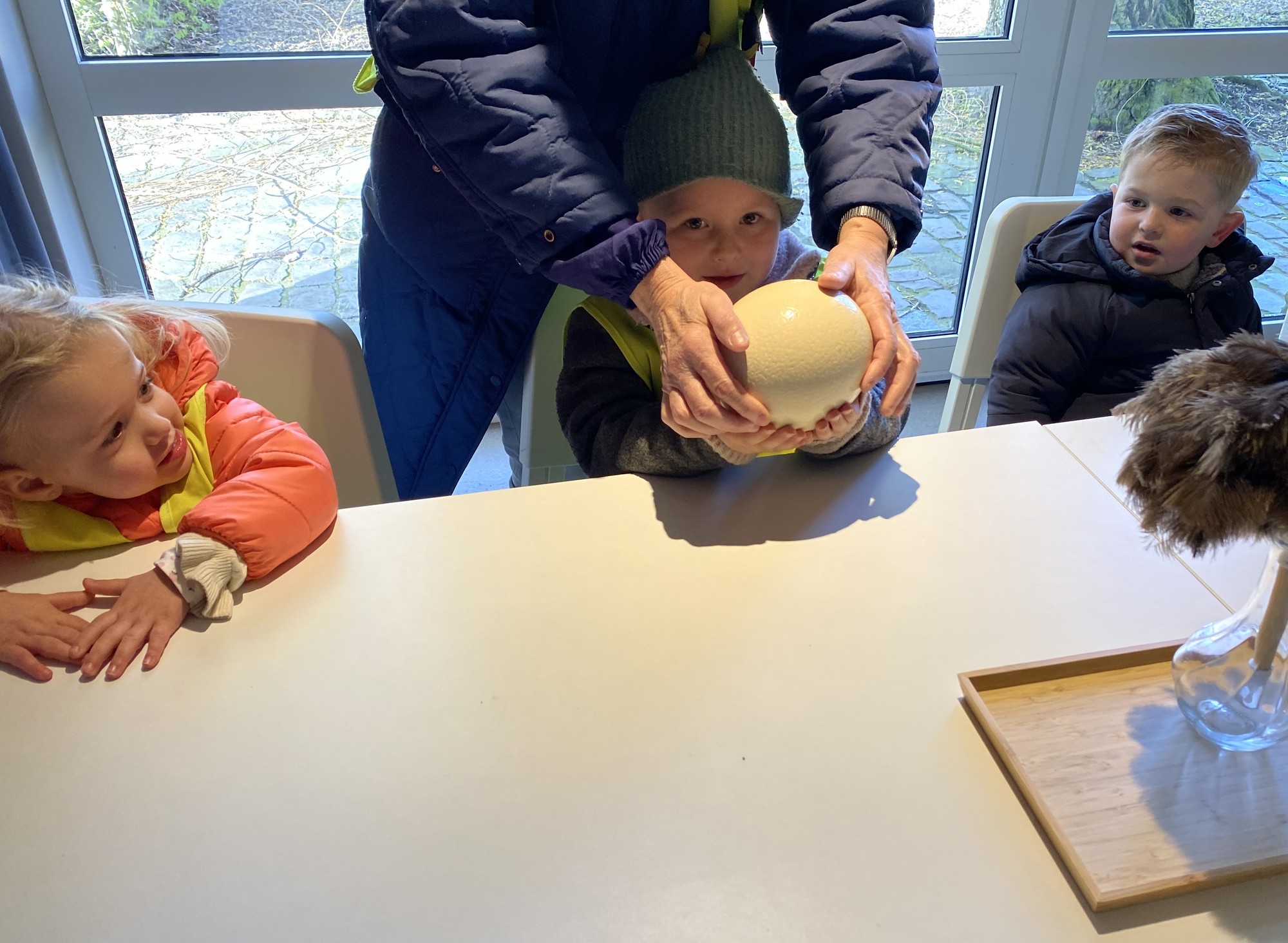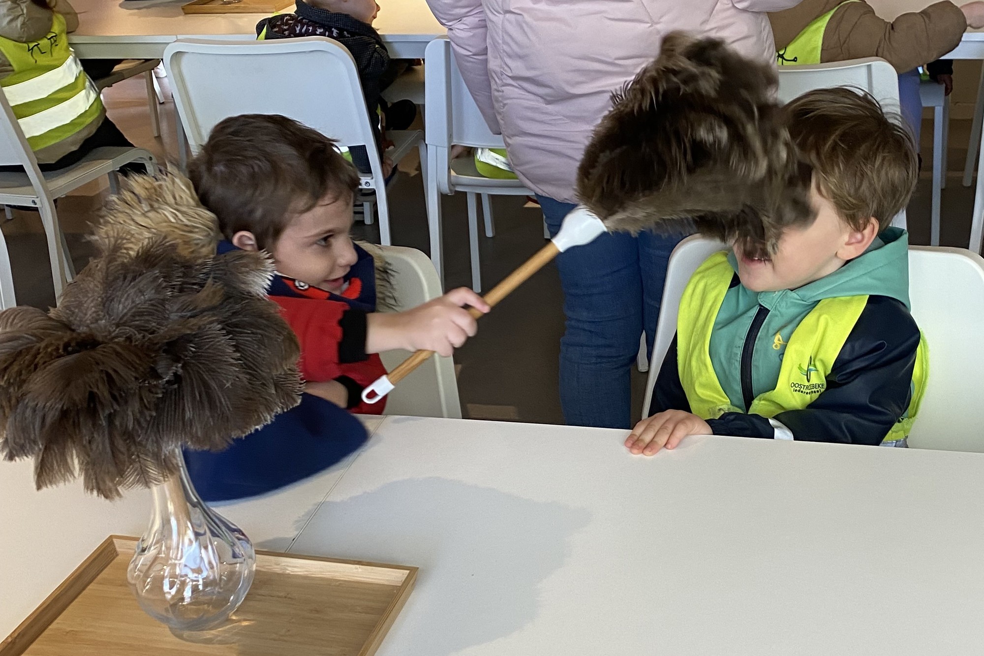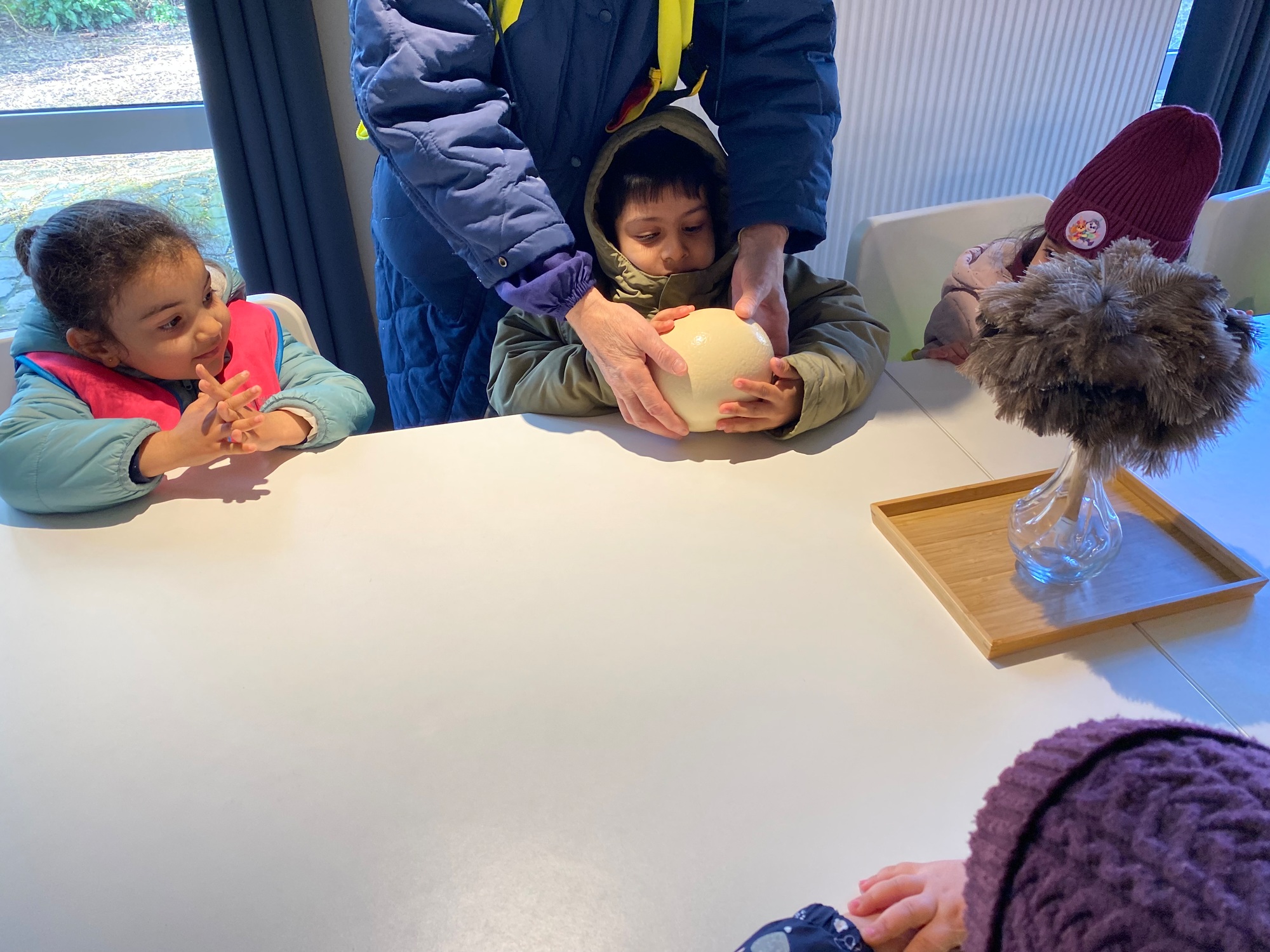 Een ei wegen, een kuikentje strelen, elkaar afstoffen, de grote dieren bekijken en een stukje cake eten...het hoort er allemaal bij