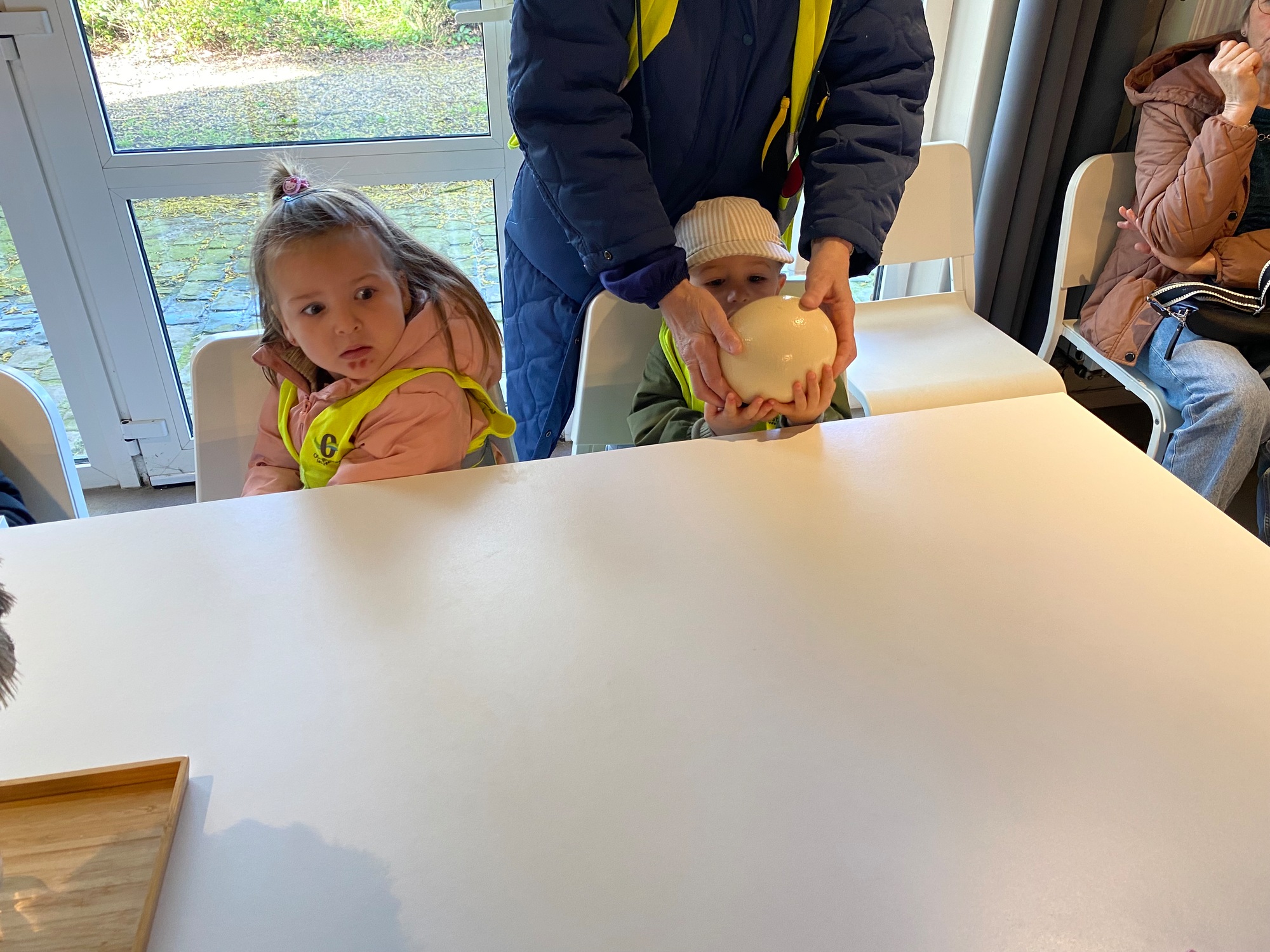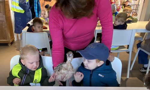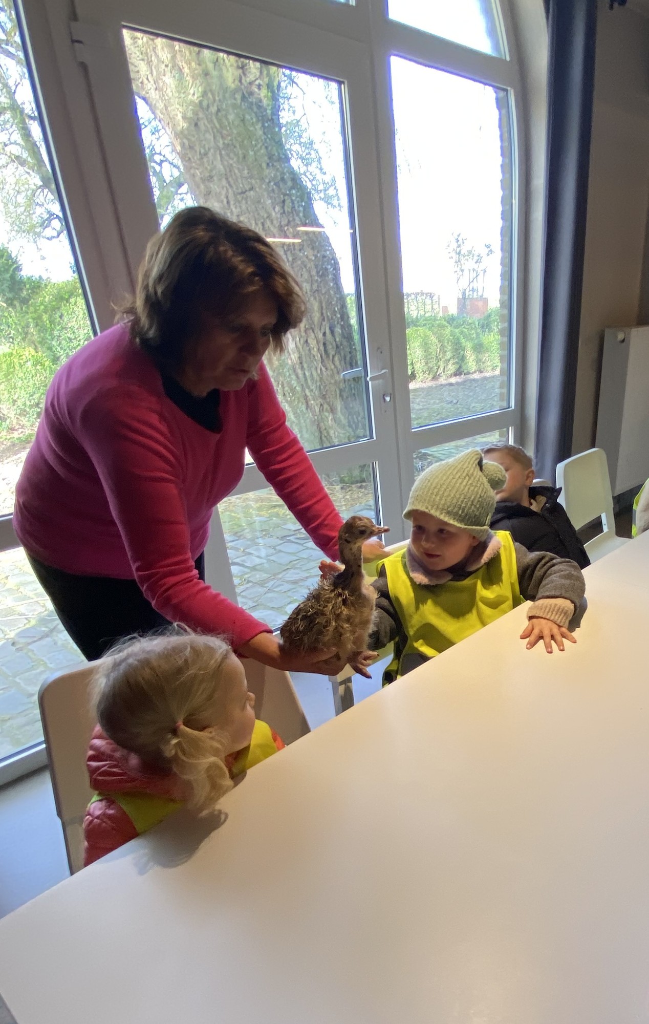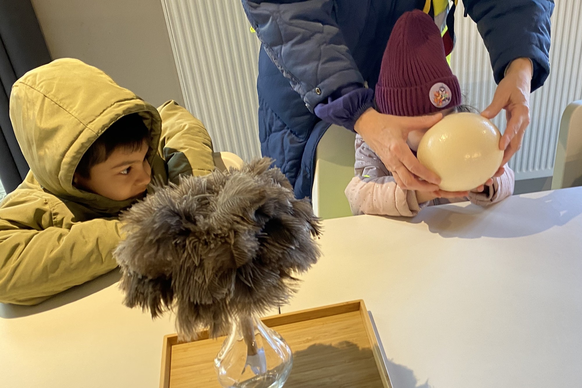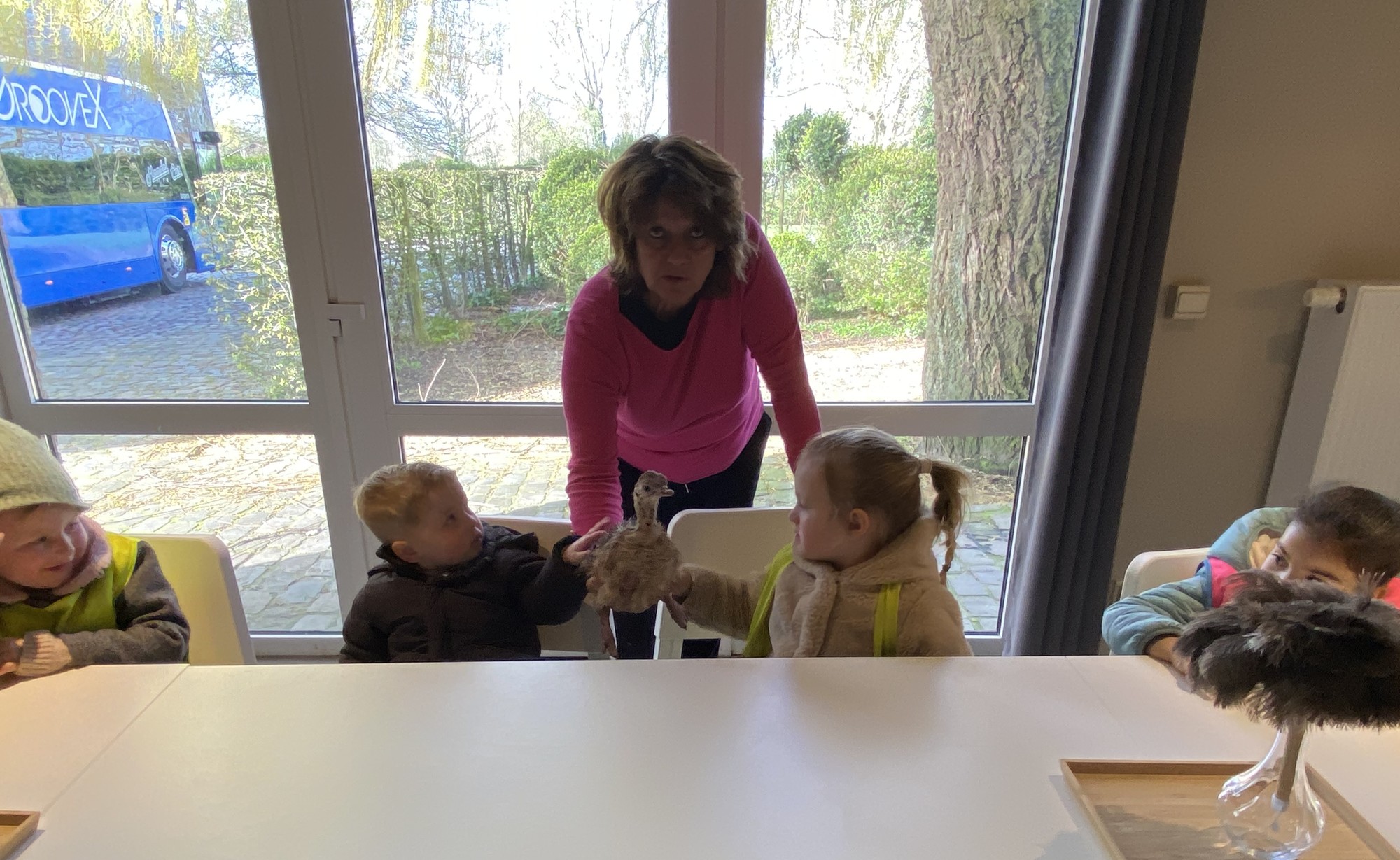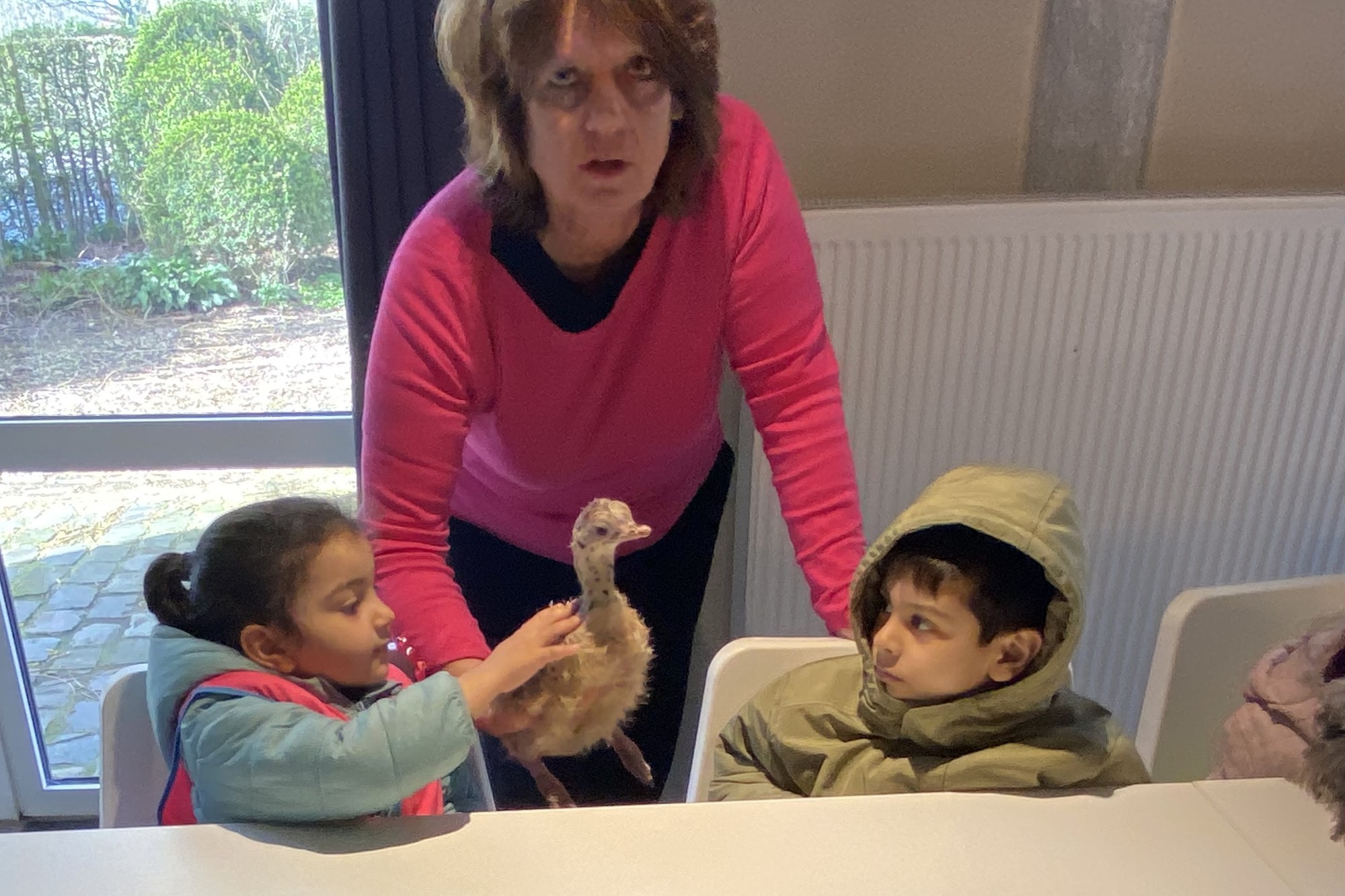 Een ei wegen, een kuikentje strelen, elkaar afstoffen, de grote dieren bekijken en een stukje cake eten...het hoort er allemaal bij