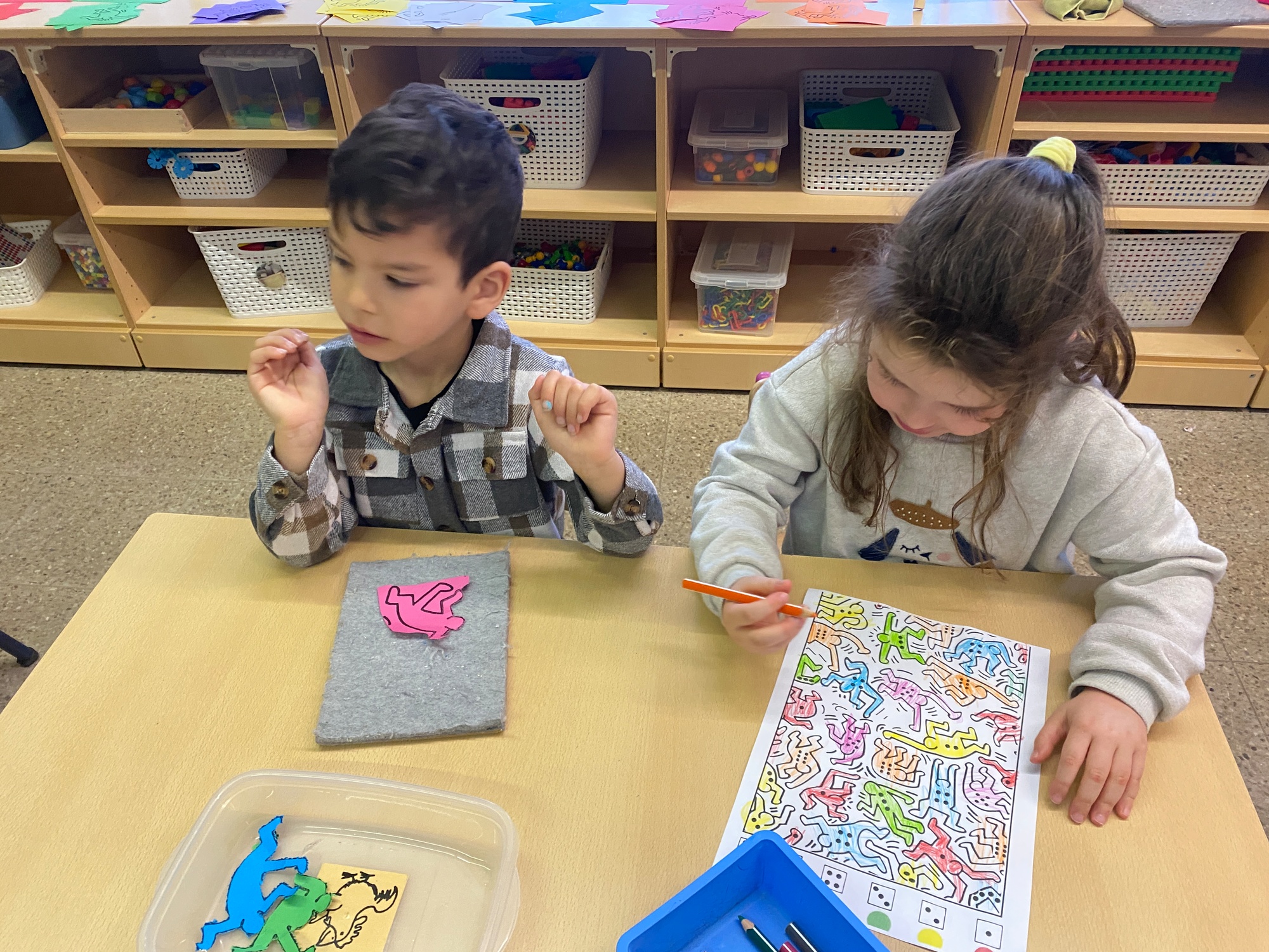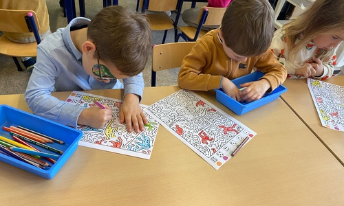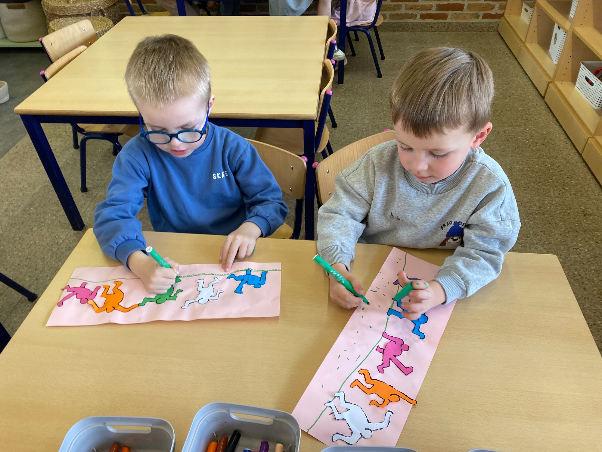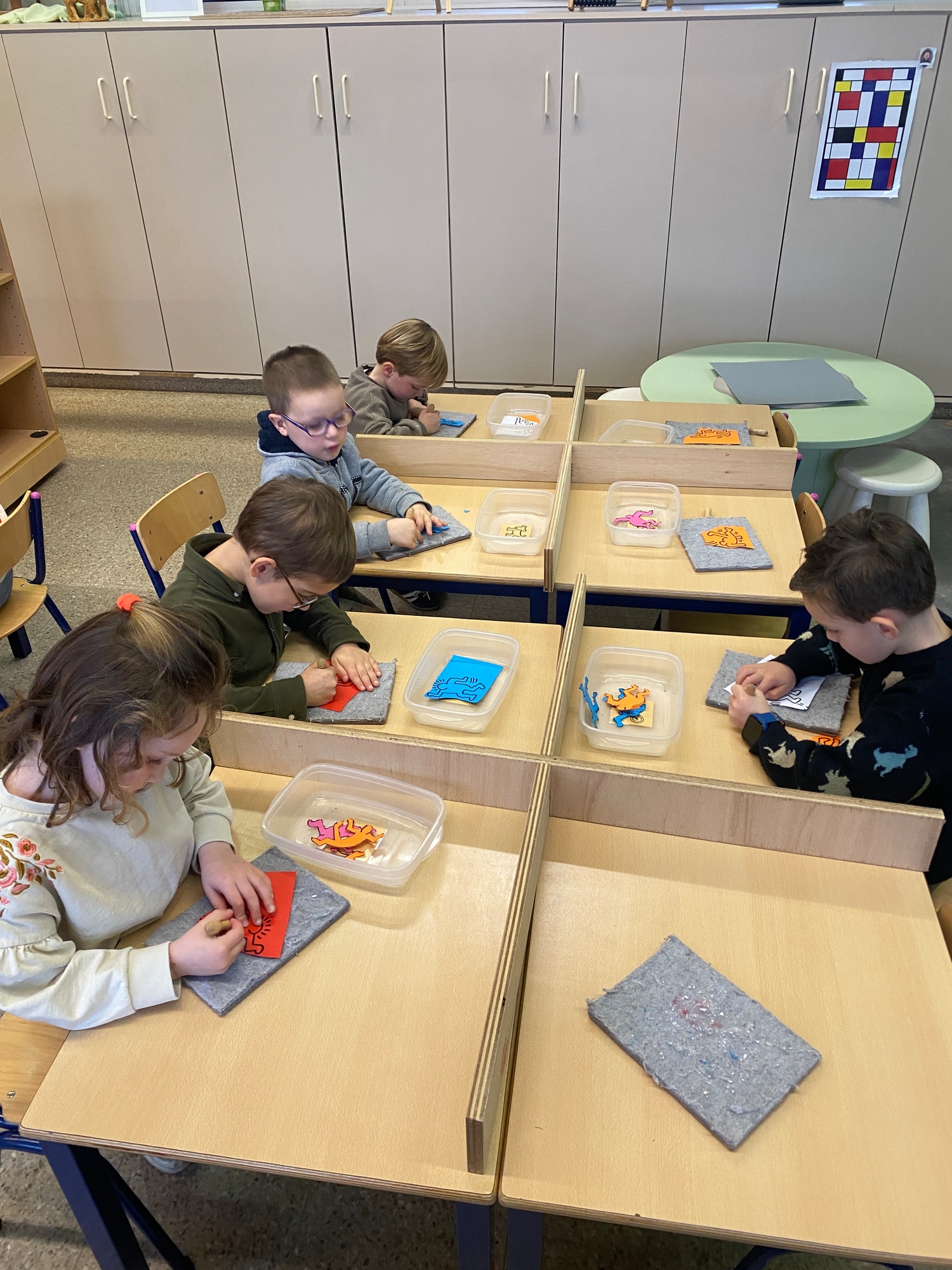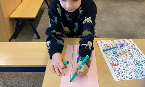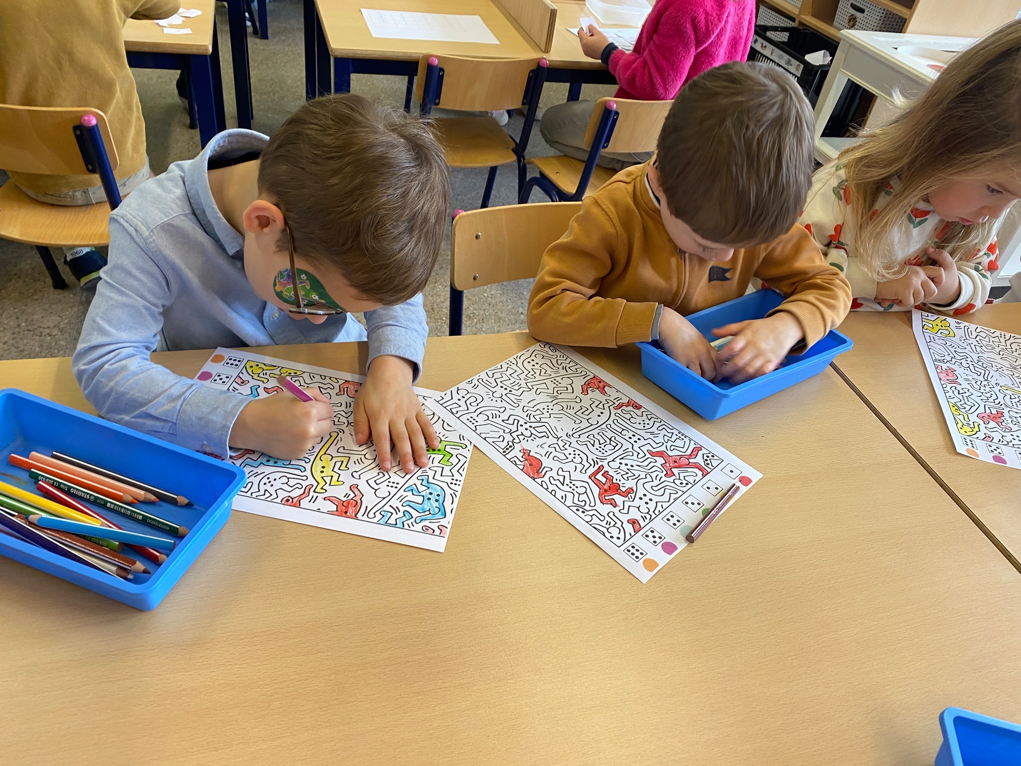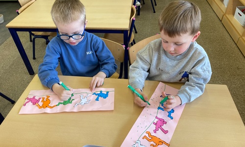 Kleuren volgens legende Mannetjes knippen en plakken in een matrix 5 Mannetjes prikken Een lange rechte lijn tekenen, korte grassprietjes tekenen. Figuurtjes maken met knopen. Keith Haring wist wat hij tekenen zou... Mannetjes voor jou!