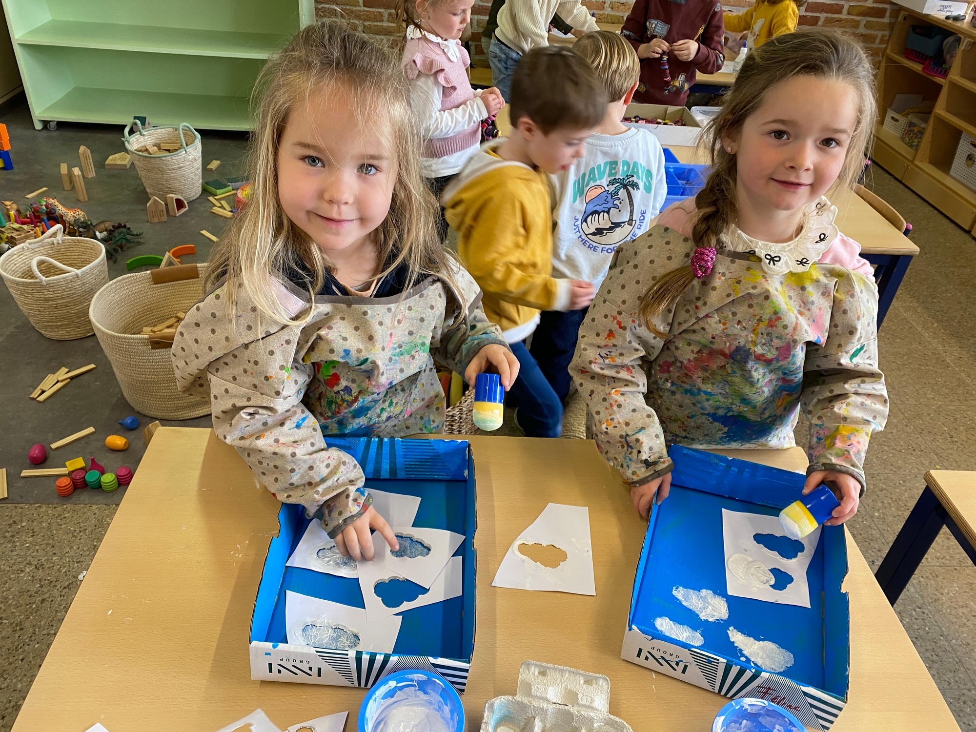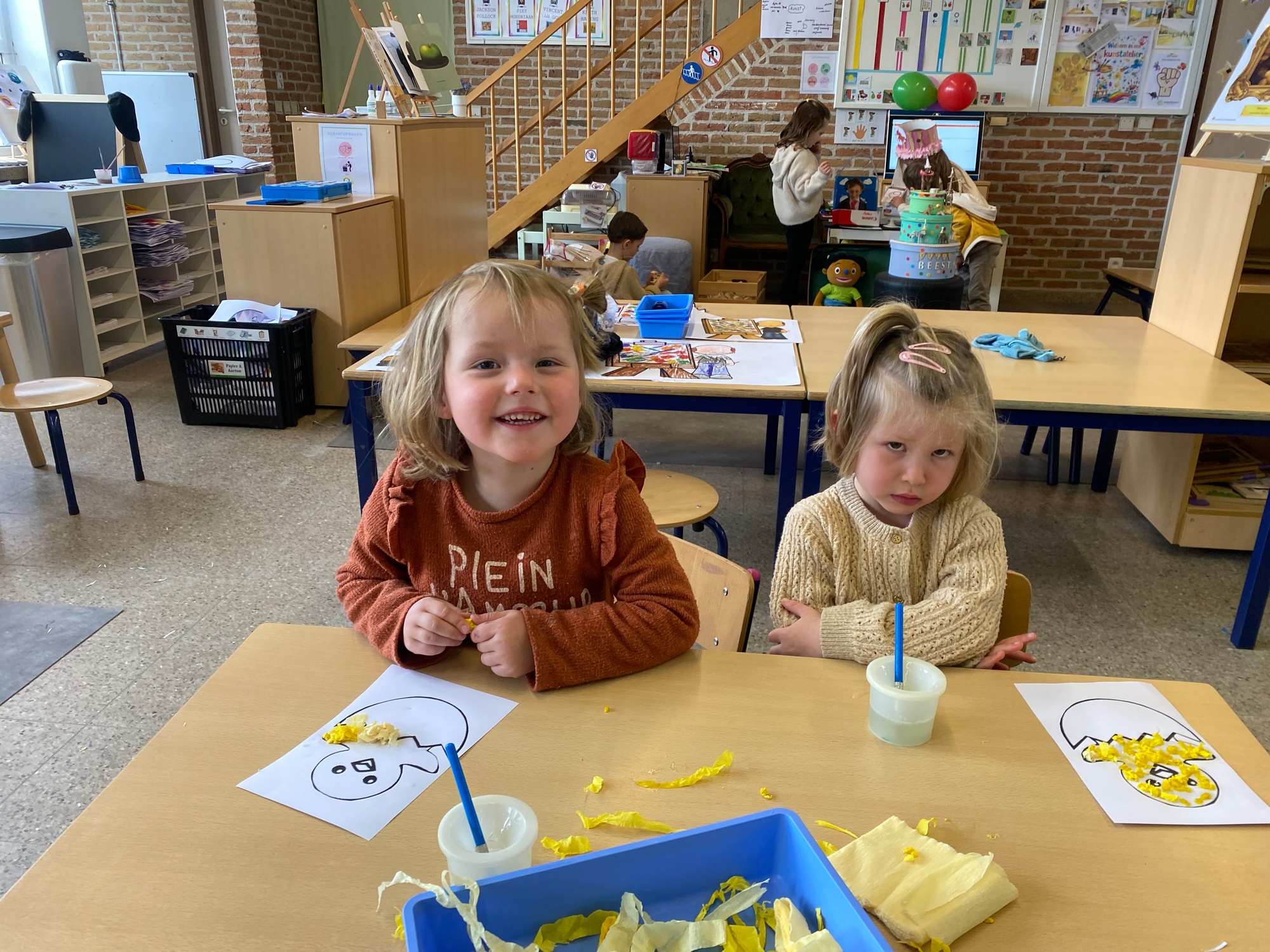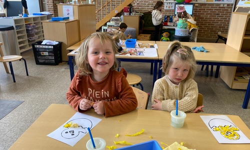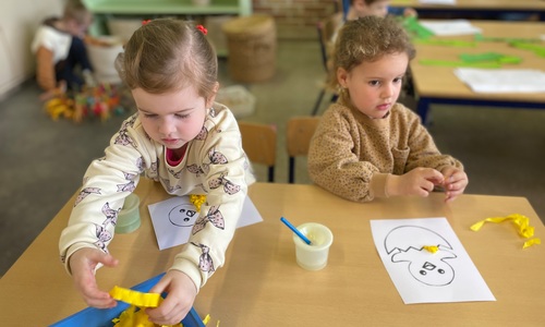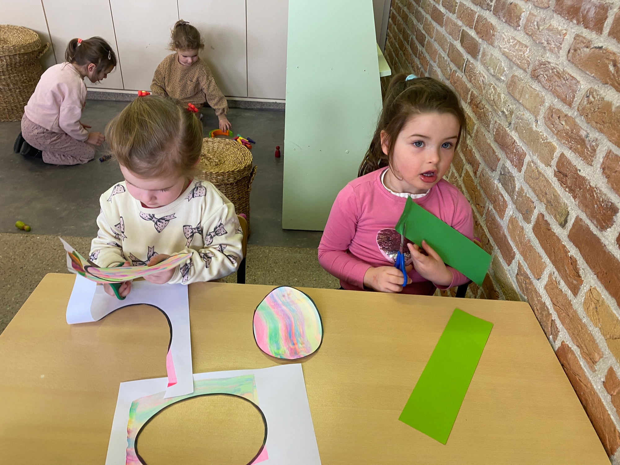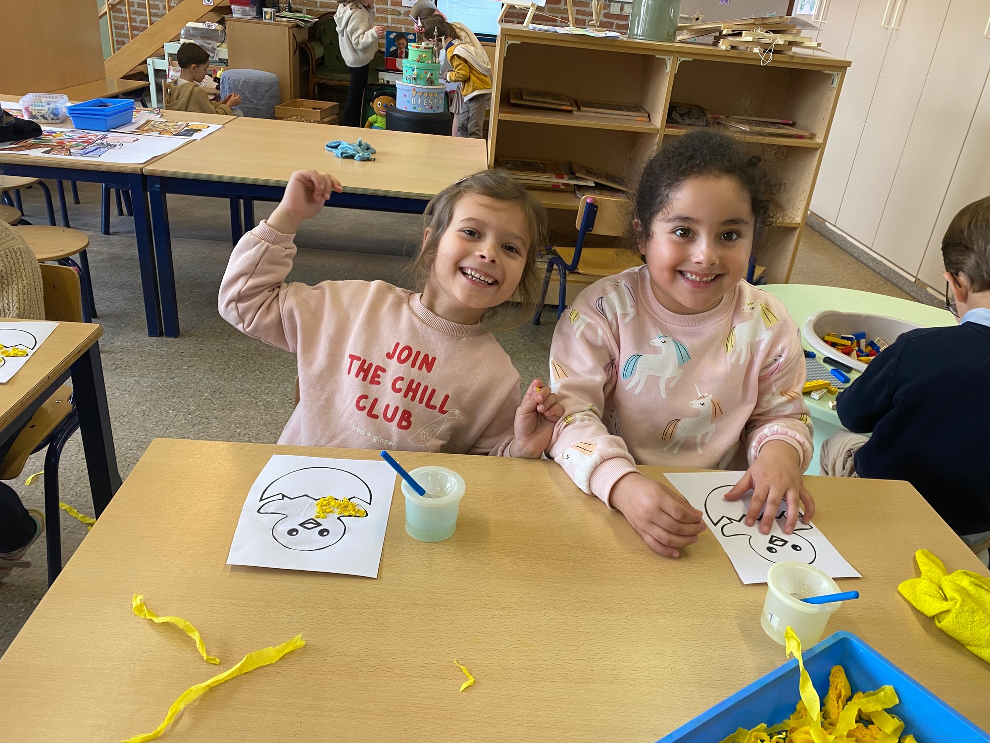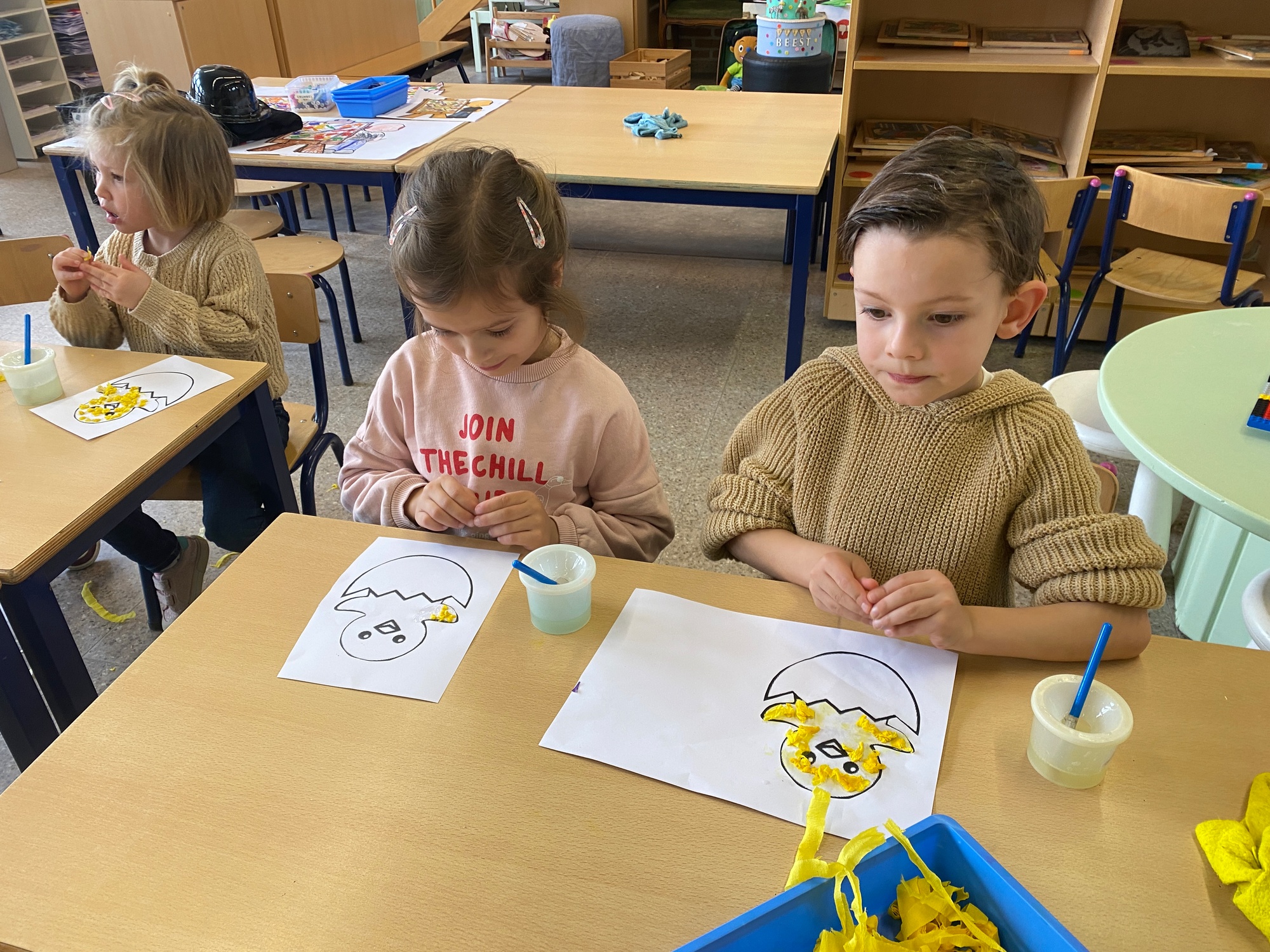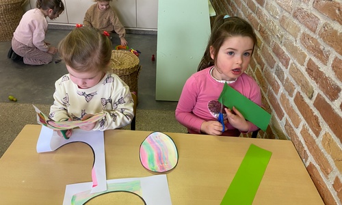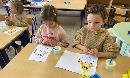 Wolken stempelen, eitjes versieren met stipjes verf en een trekkertje (Wat een mooi resultaat), kuikentje versieren, appel prikken, gras knippen...