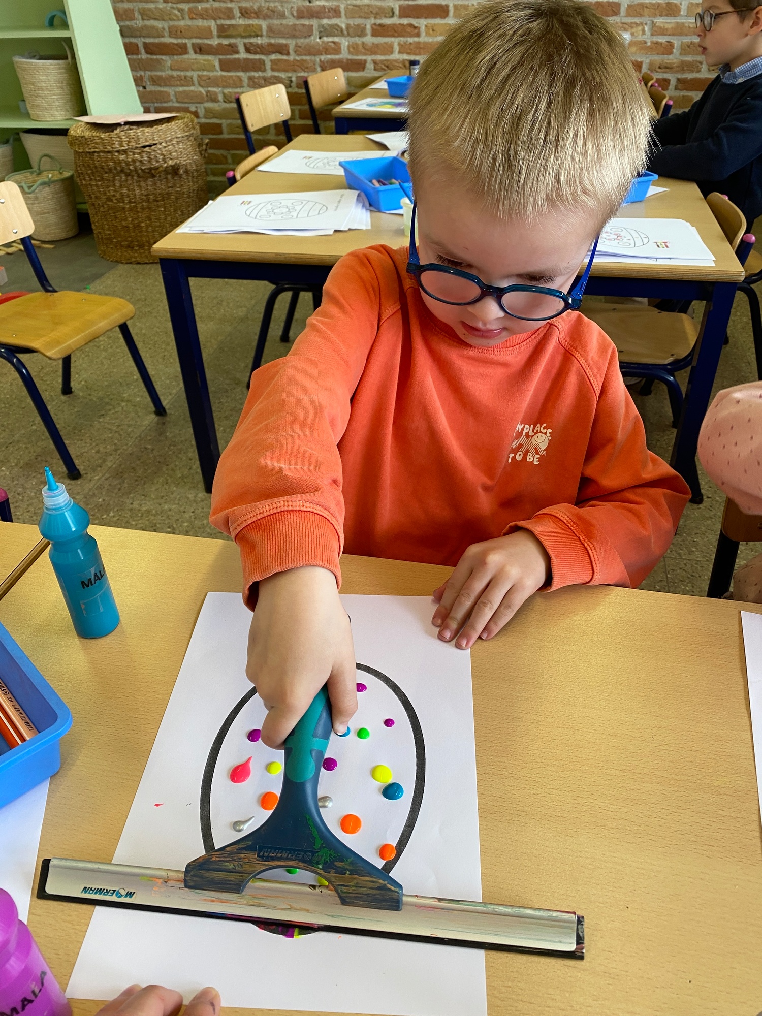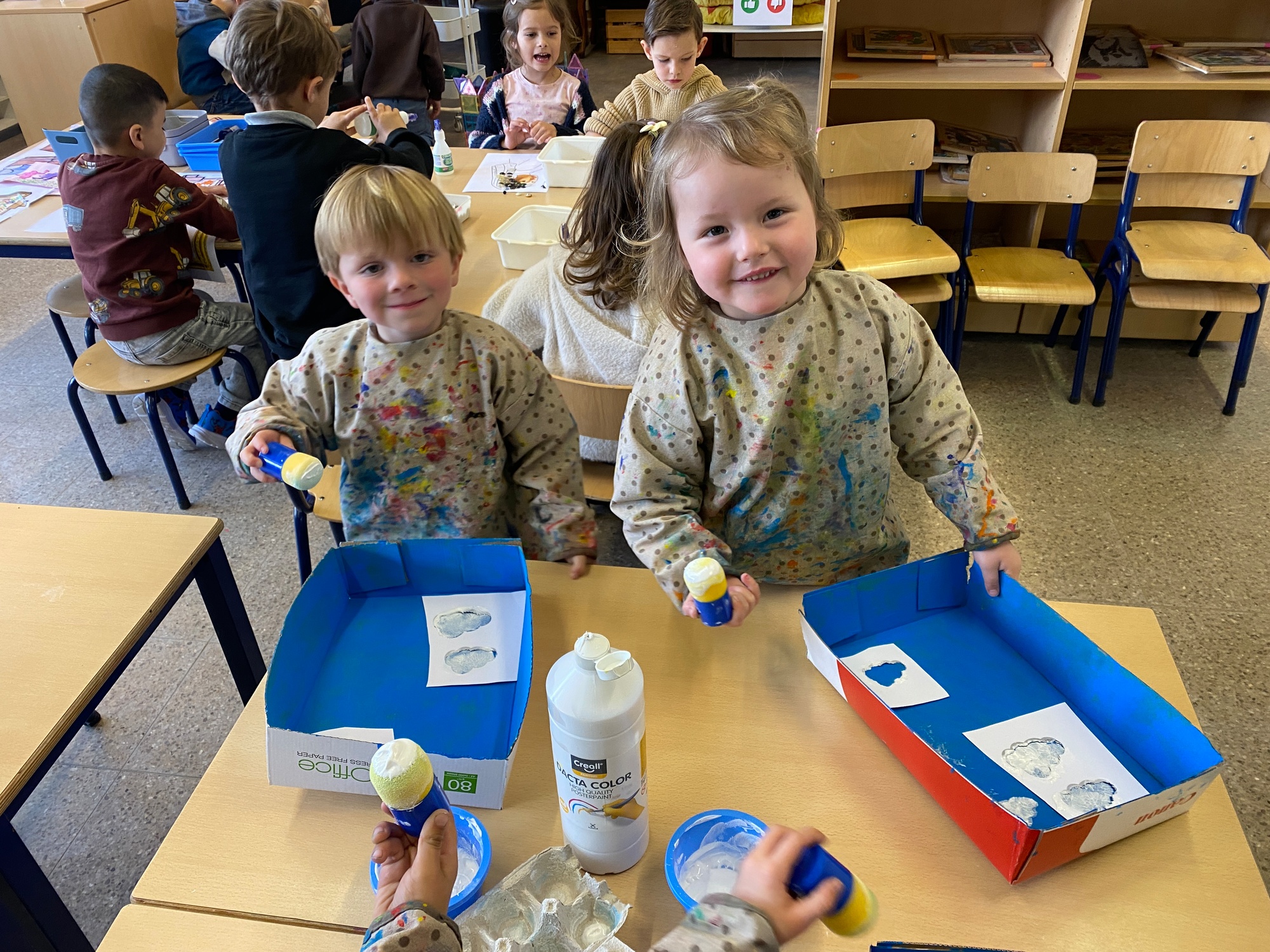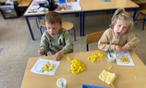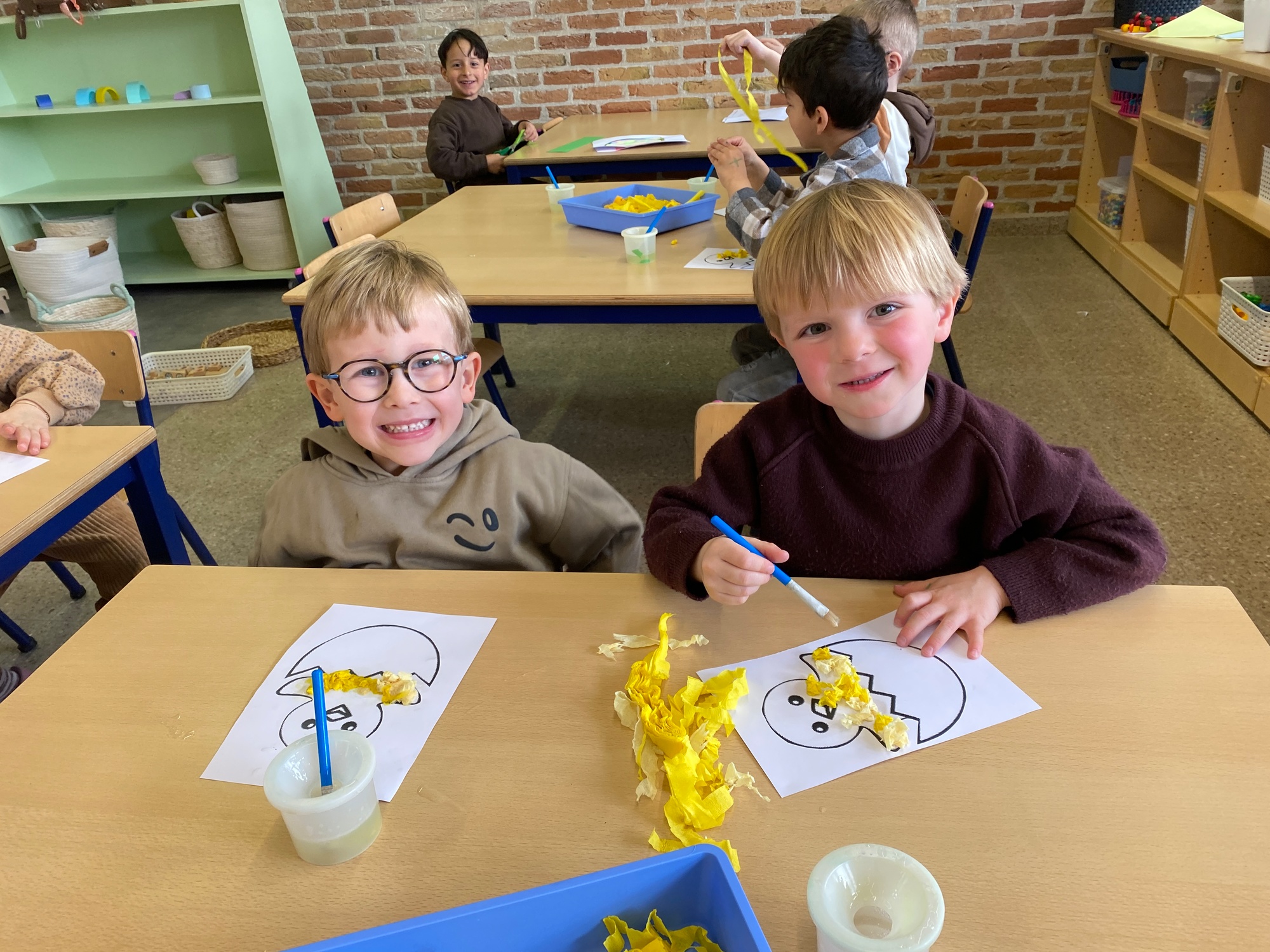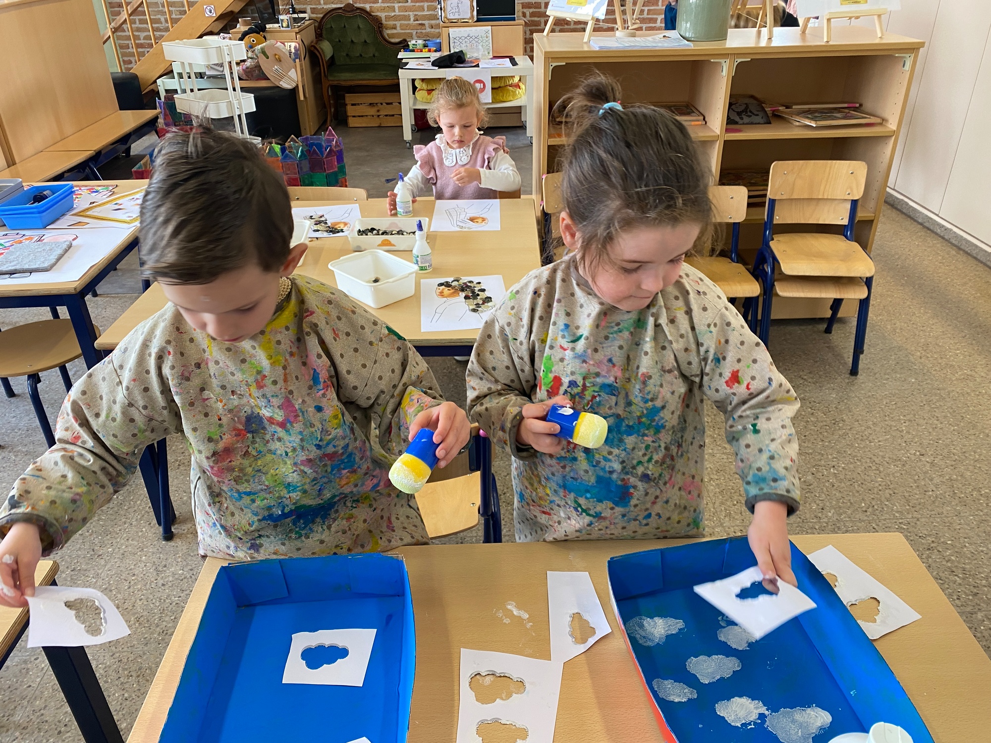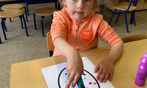 Wolken stempelen, eitjes versieren met stipjes verf en een trekkertje (Wat een mooi resultaat), kuikentje versieren, appel prikken, gras knippen...