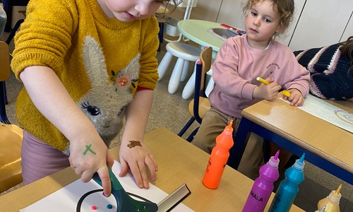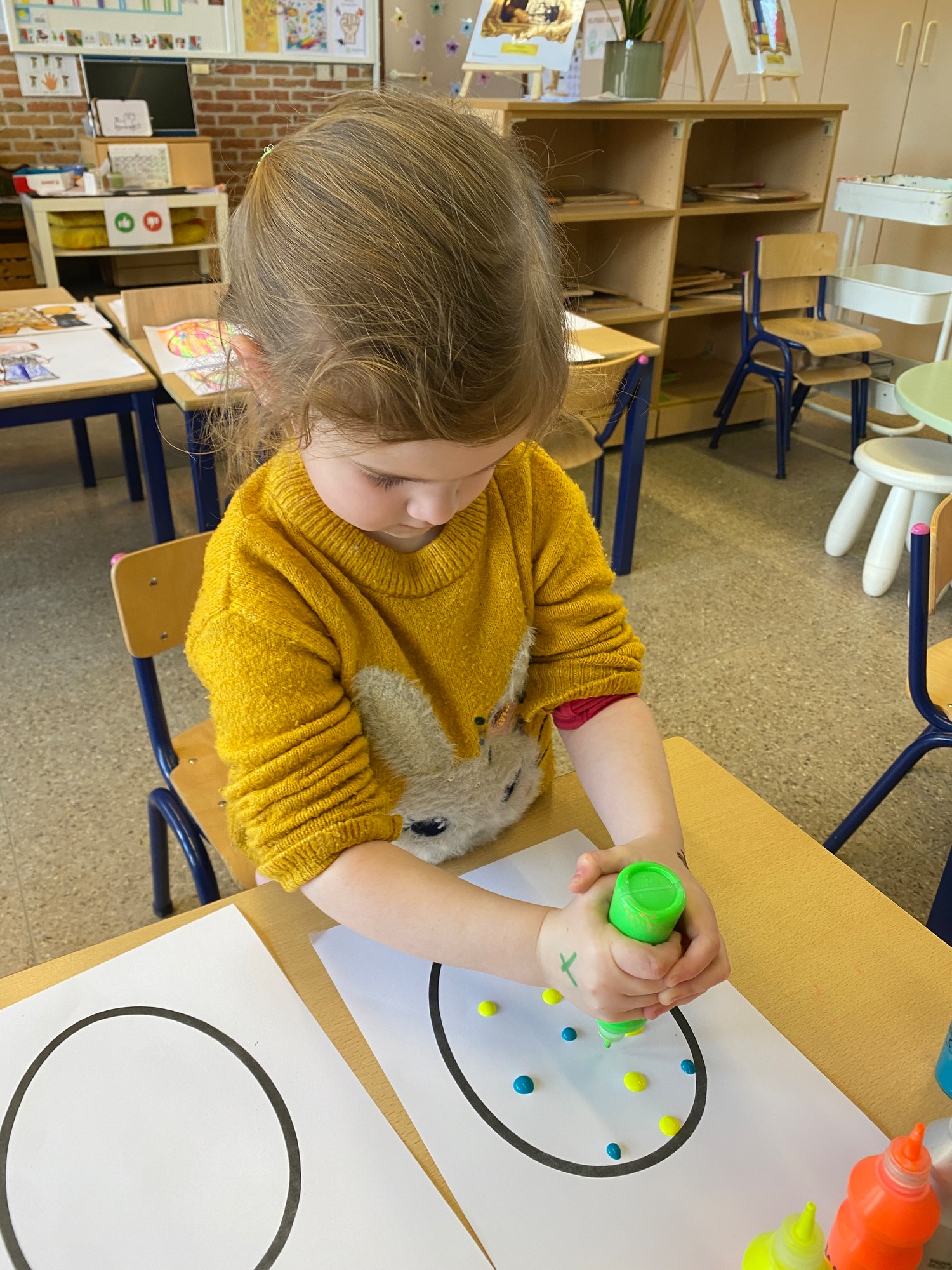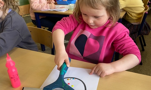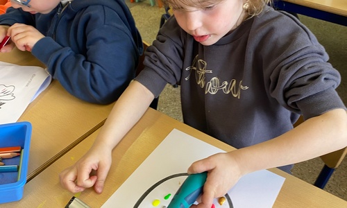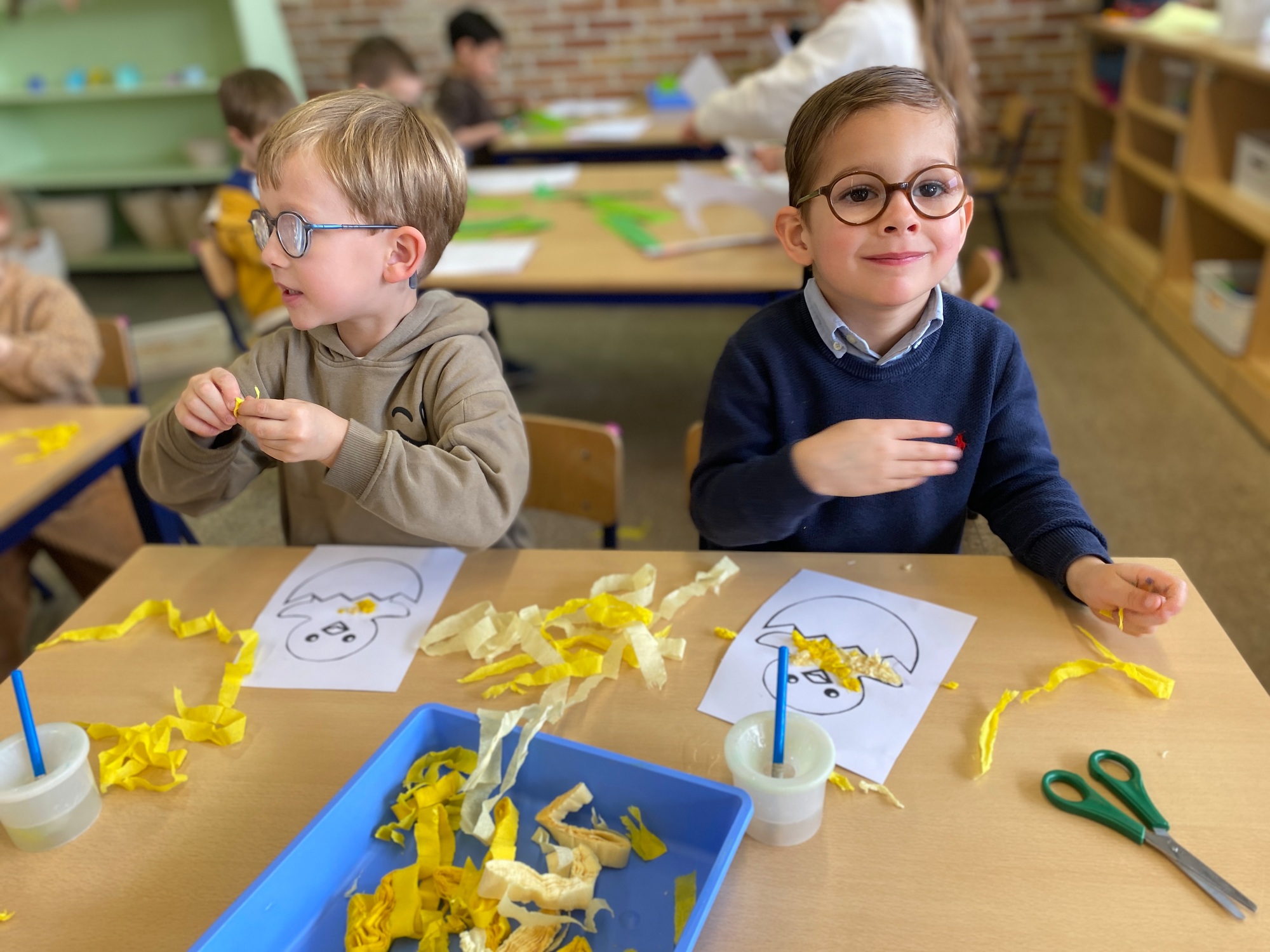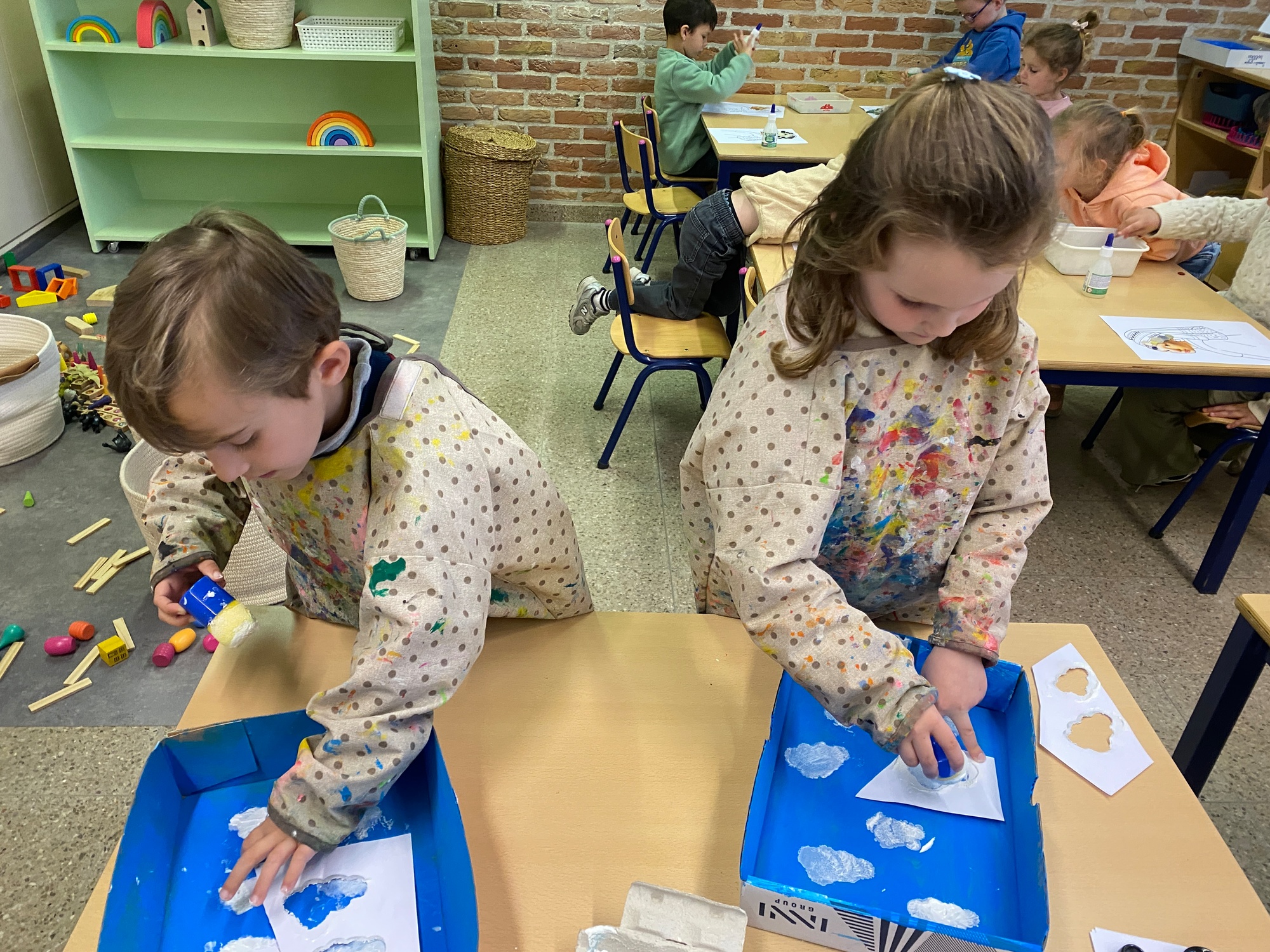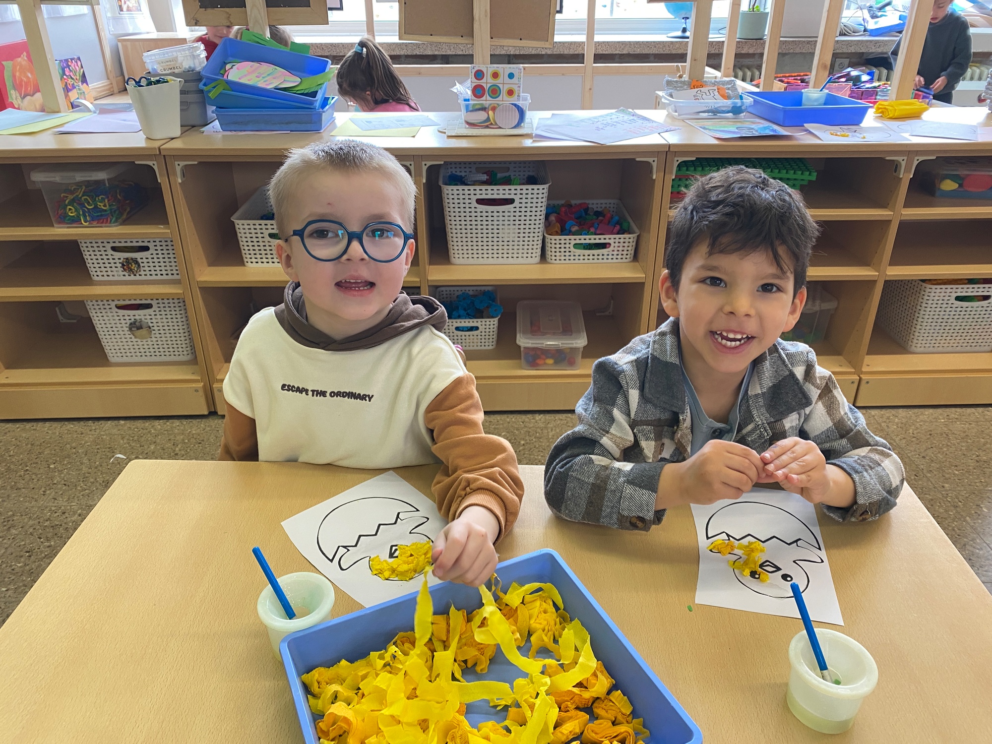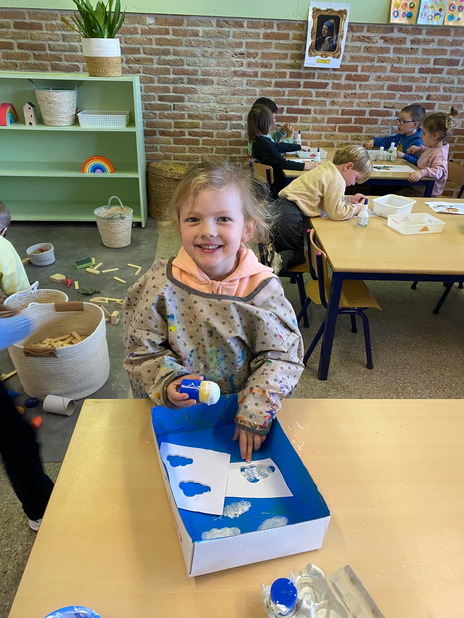 Wolken stempelen, eitjes versieren met stipjes verf en een trekkertje (Wat een mooi resultaat), kuikentje versieren, appel prikken, gras knippen...