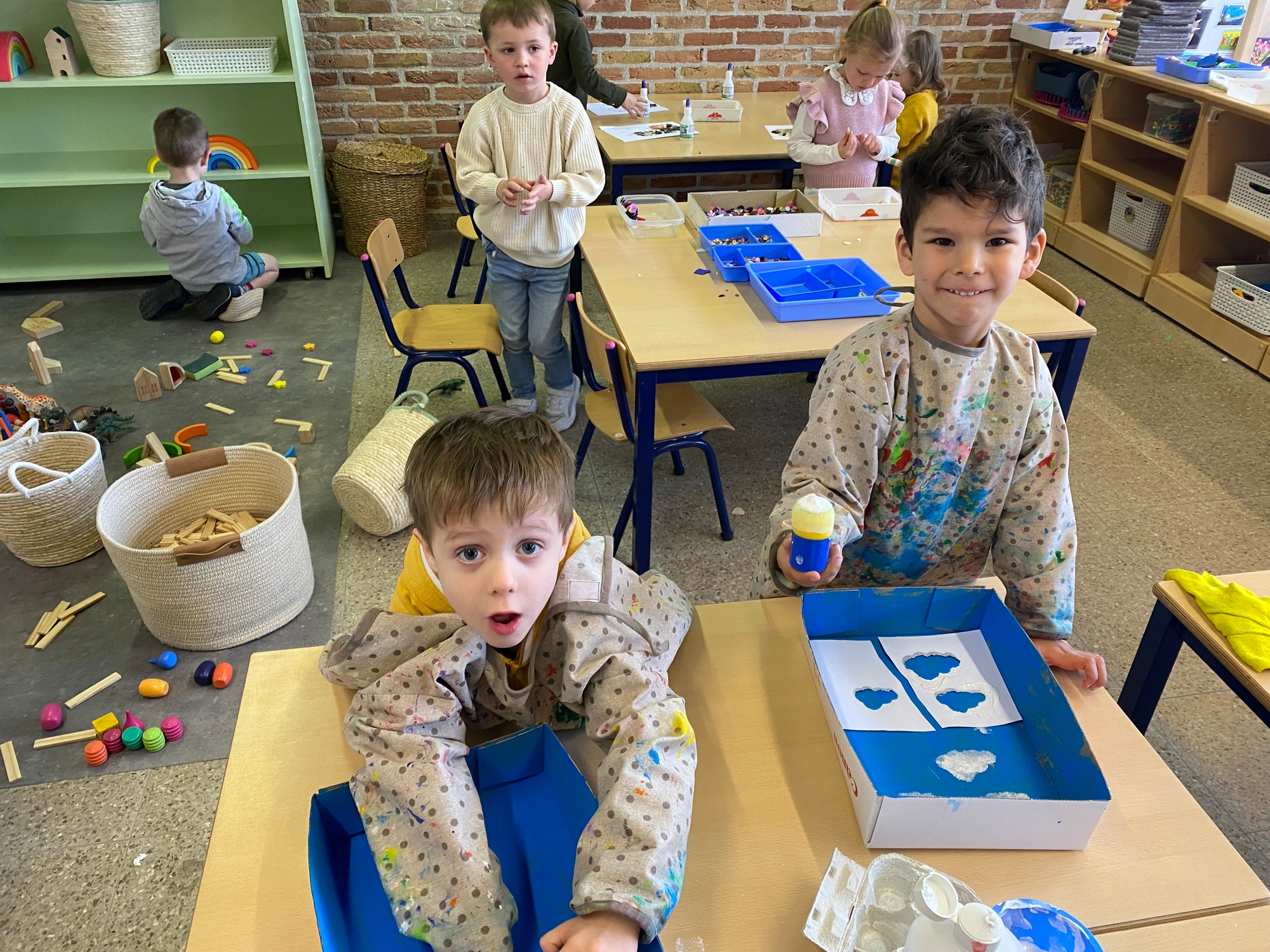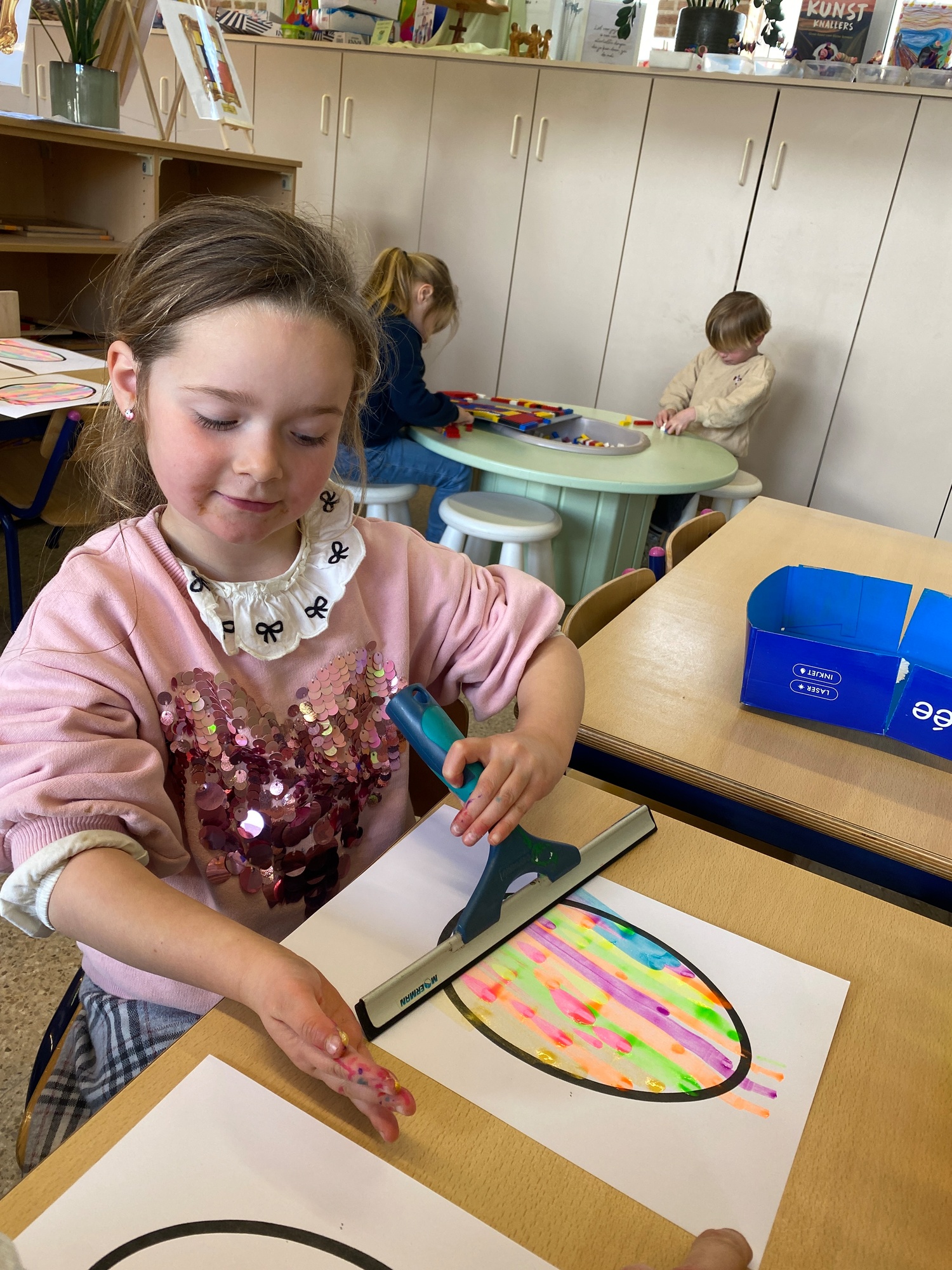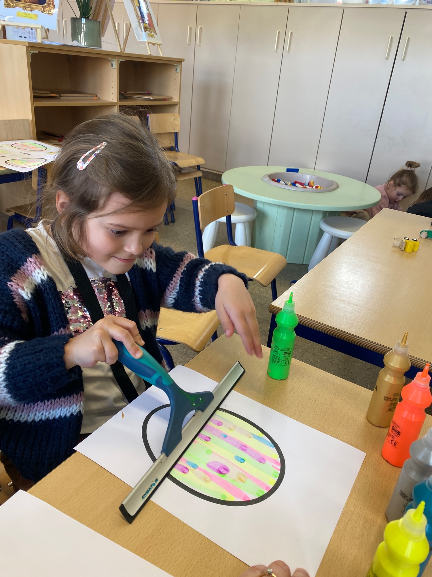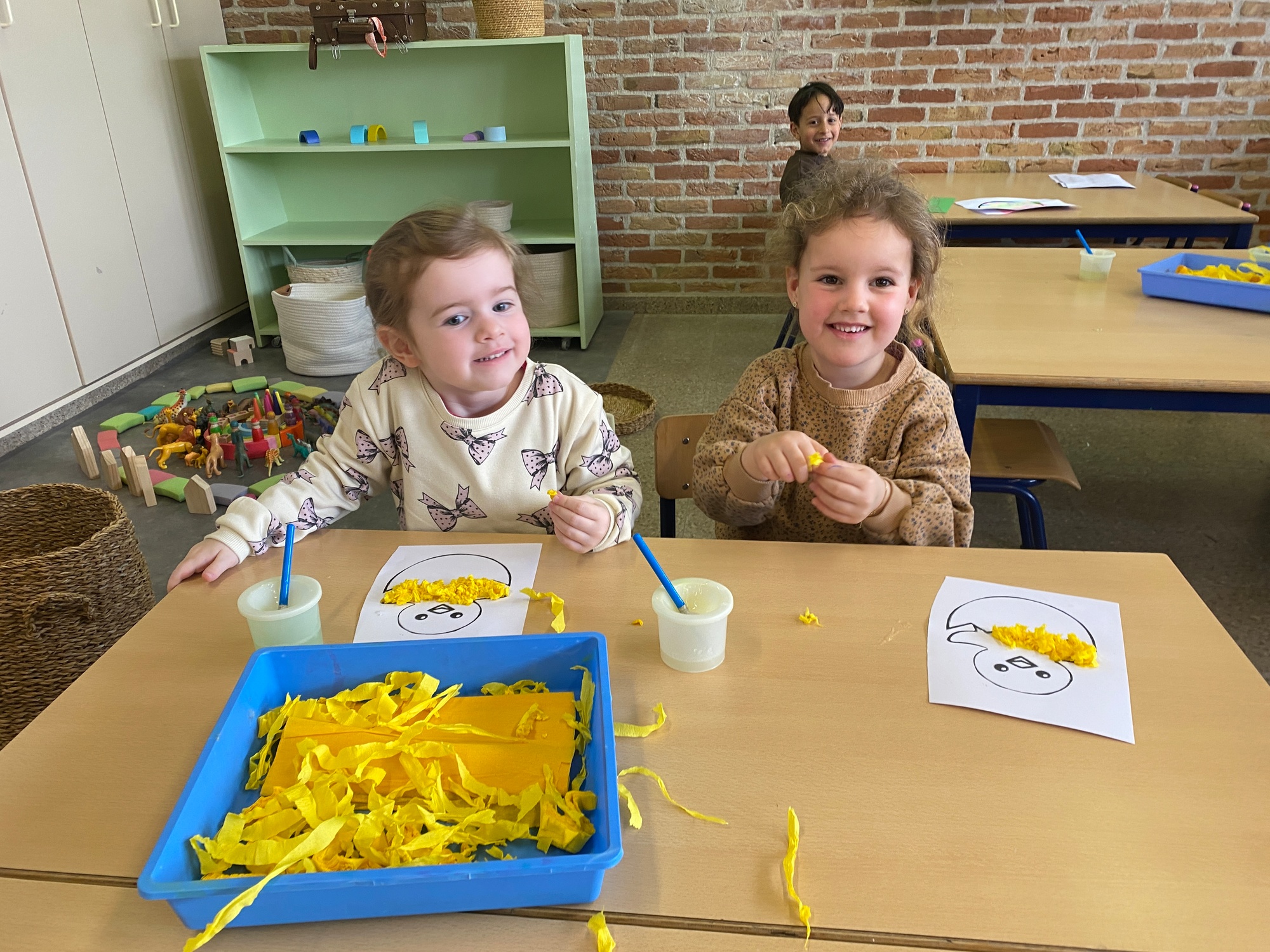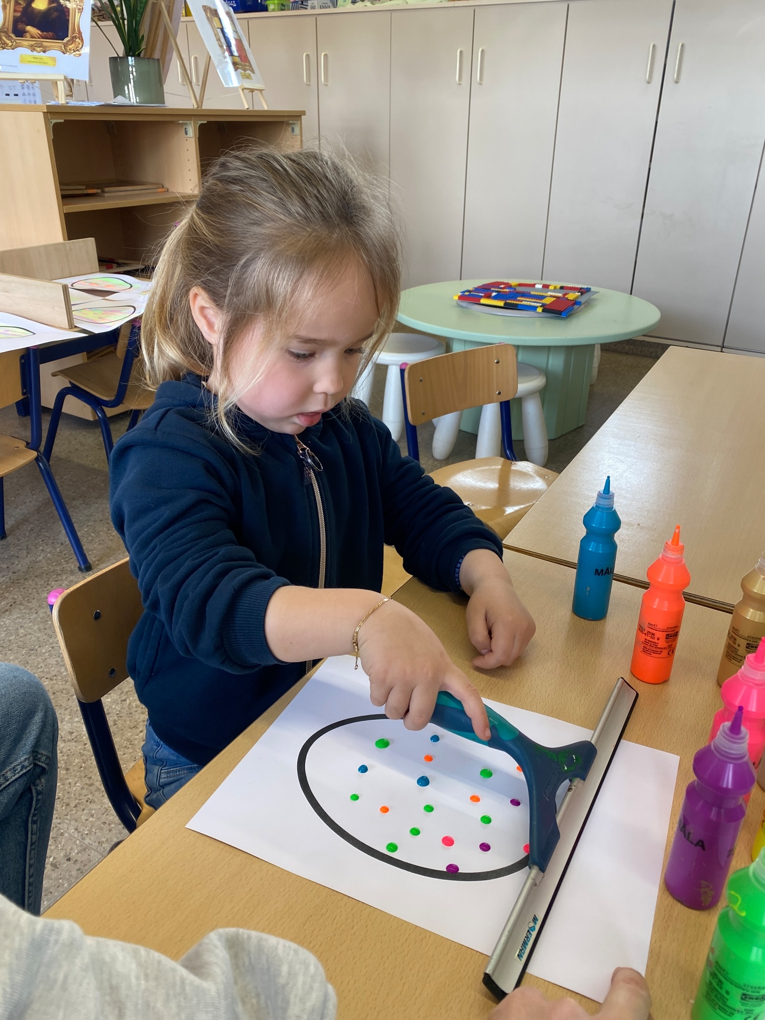 Wolken stempelen, eitjes versieren met stipjes verf en een trekkertje (Wat een mooi resultaat), kuikentje versieren, appel prikken, gras knippen...