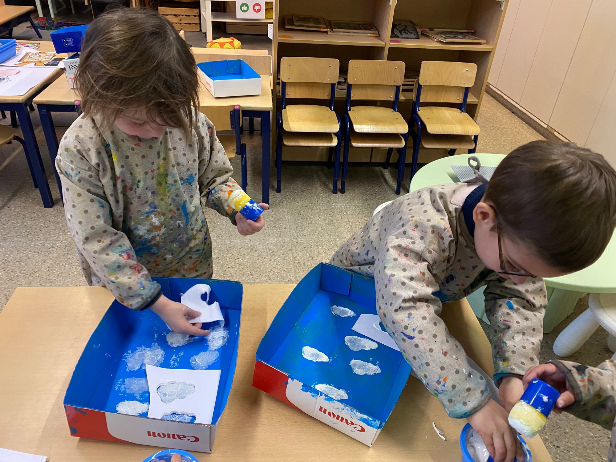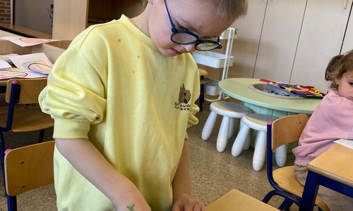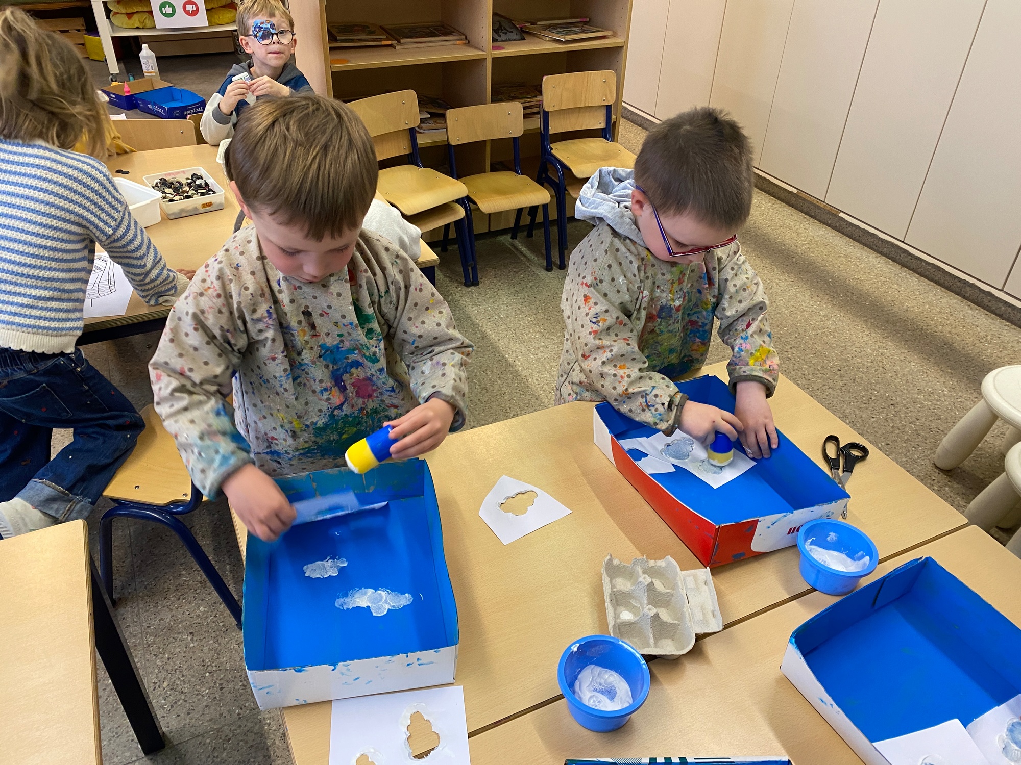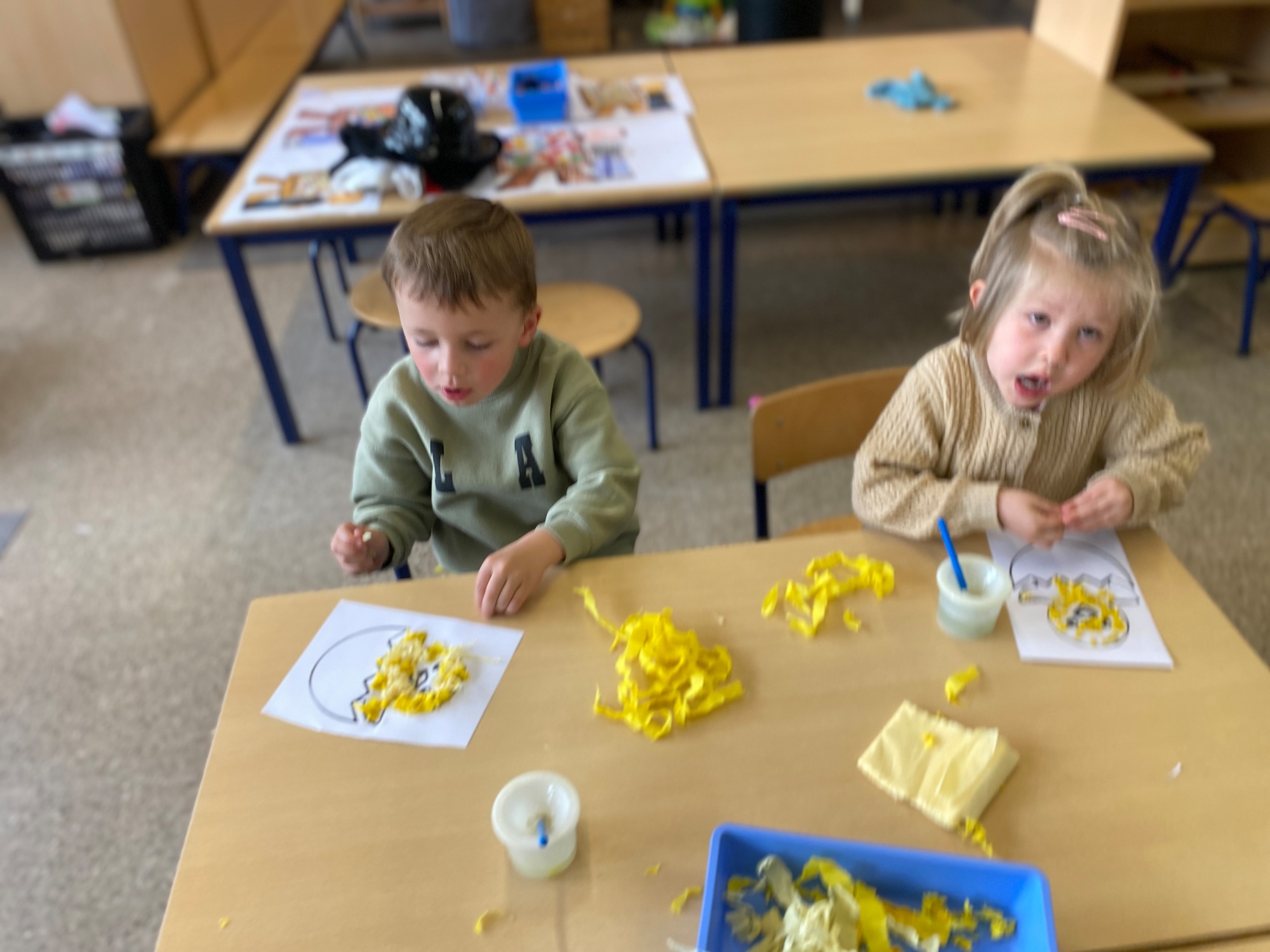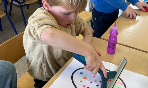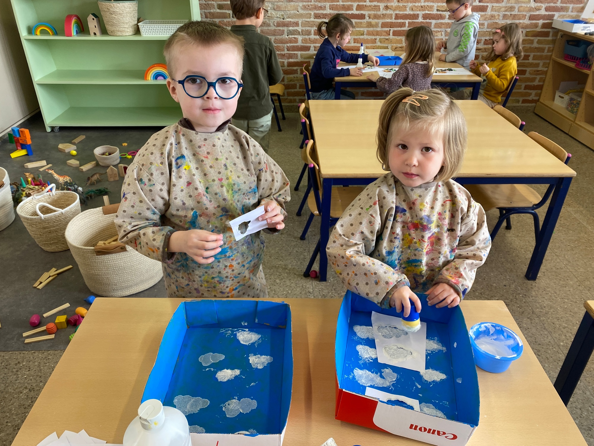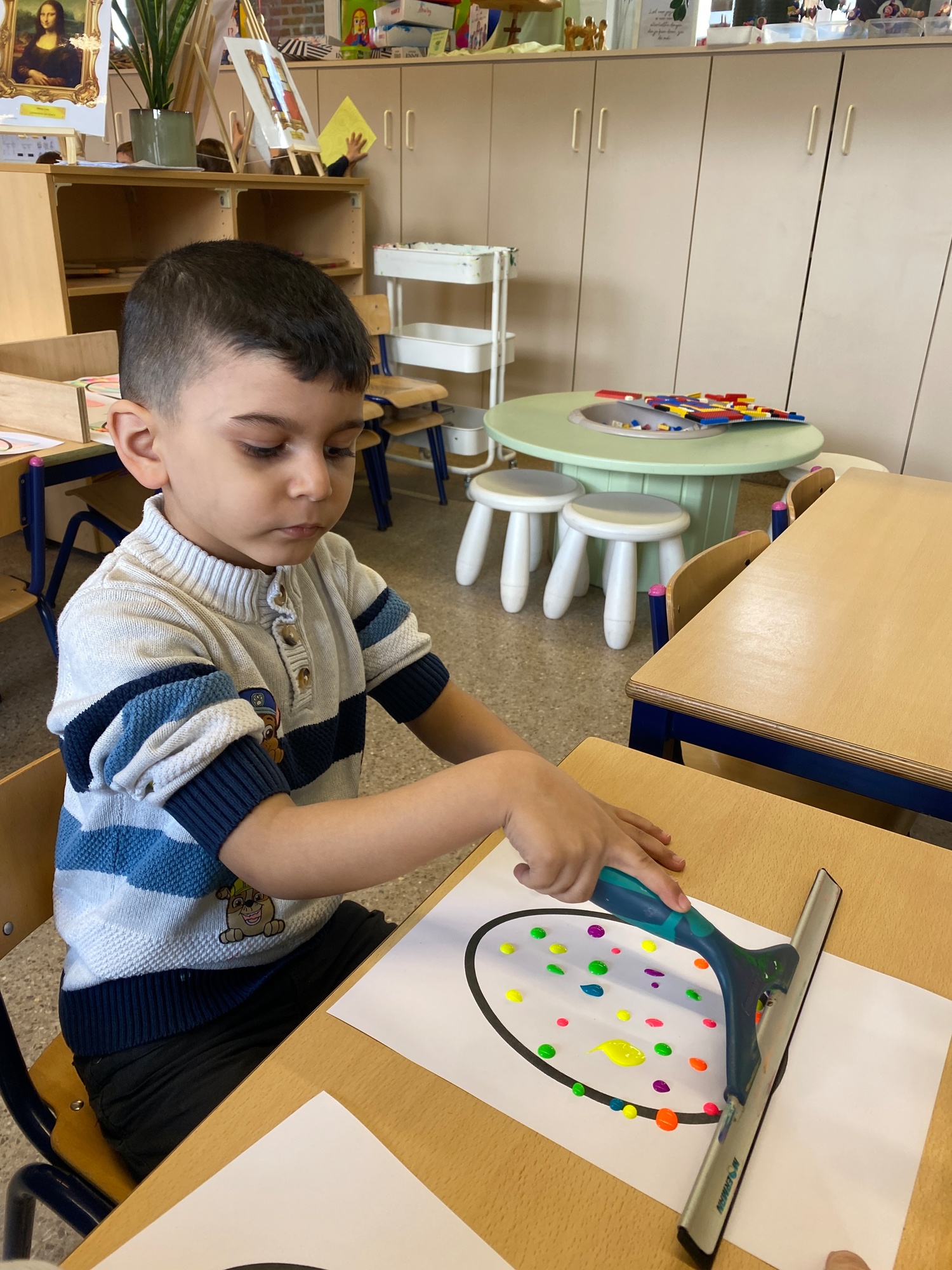 Wolken stempelen, eitjes versieren met stipjes verf en een trekkertje (Wat een mooi resultaat), kuikentje versieren, appel prikken, gras knippen...