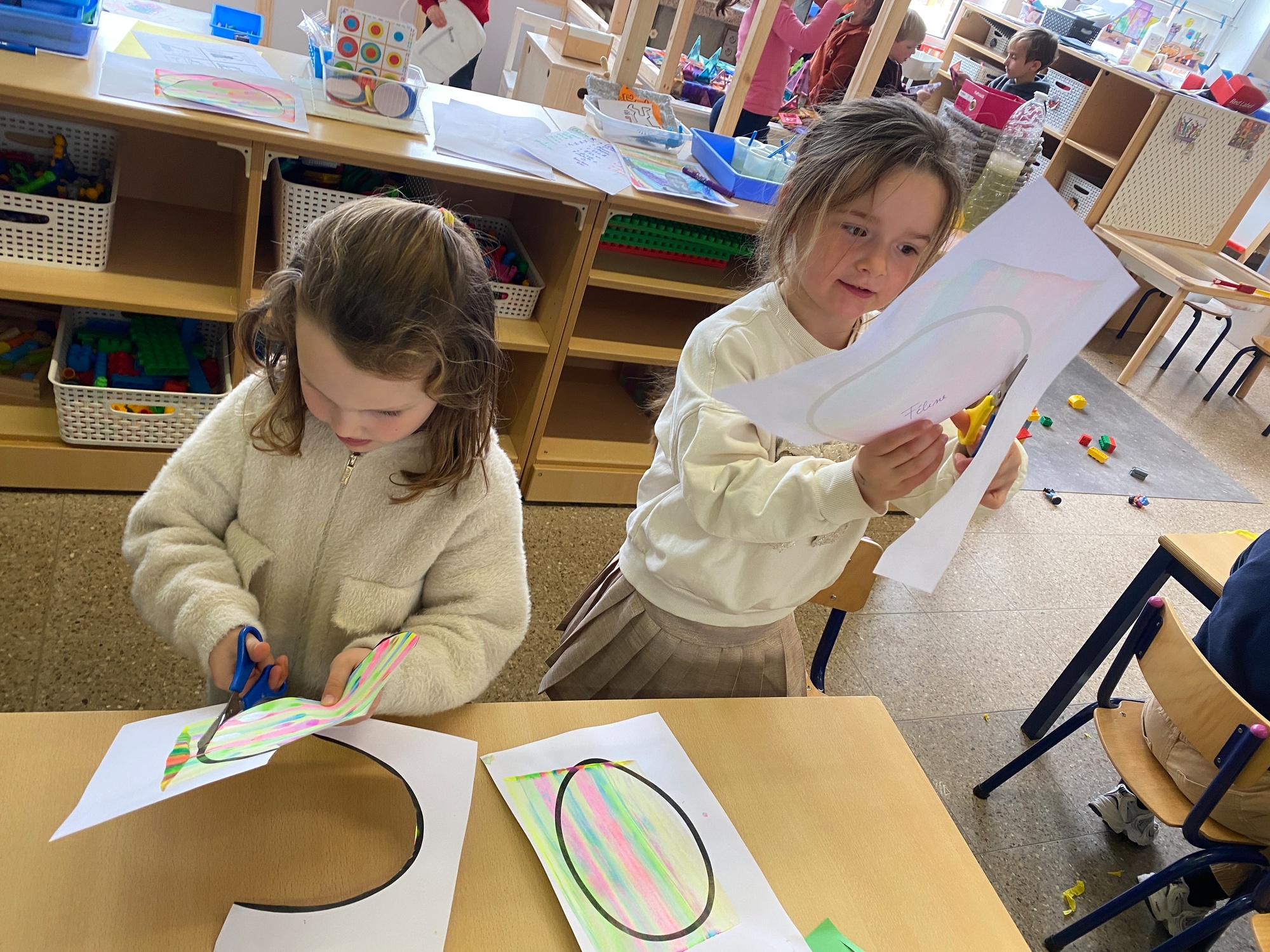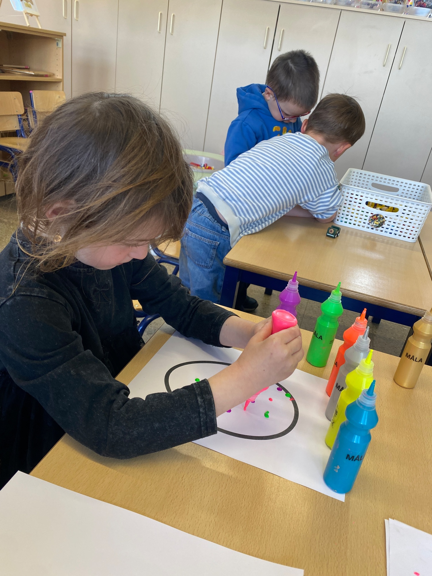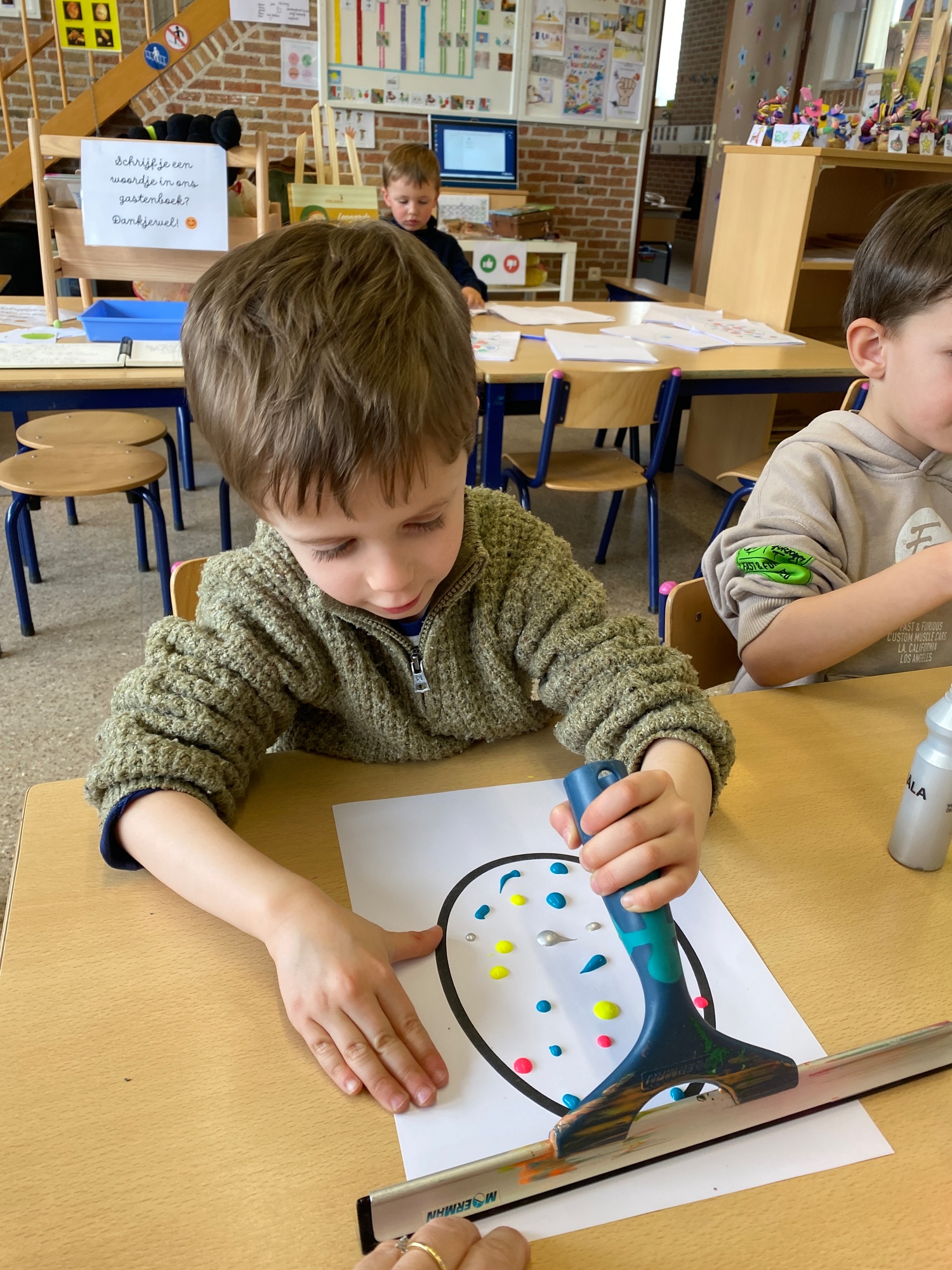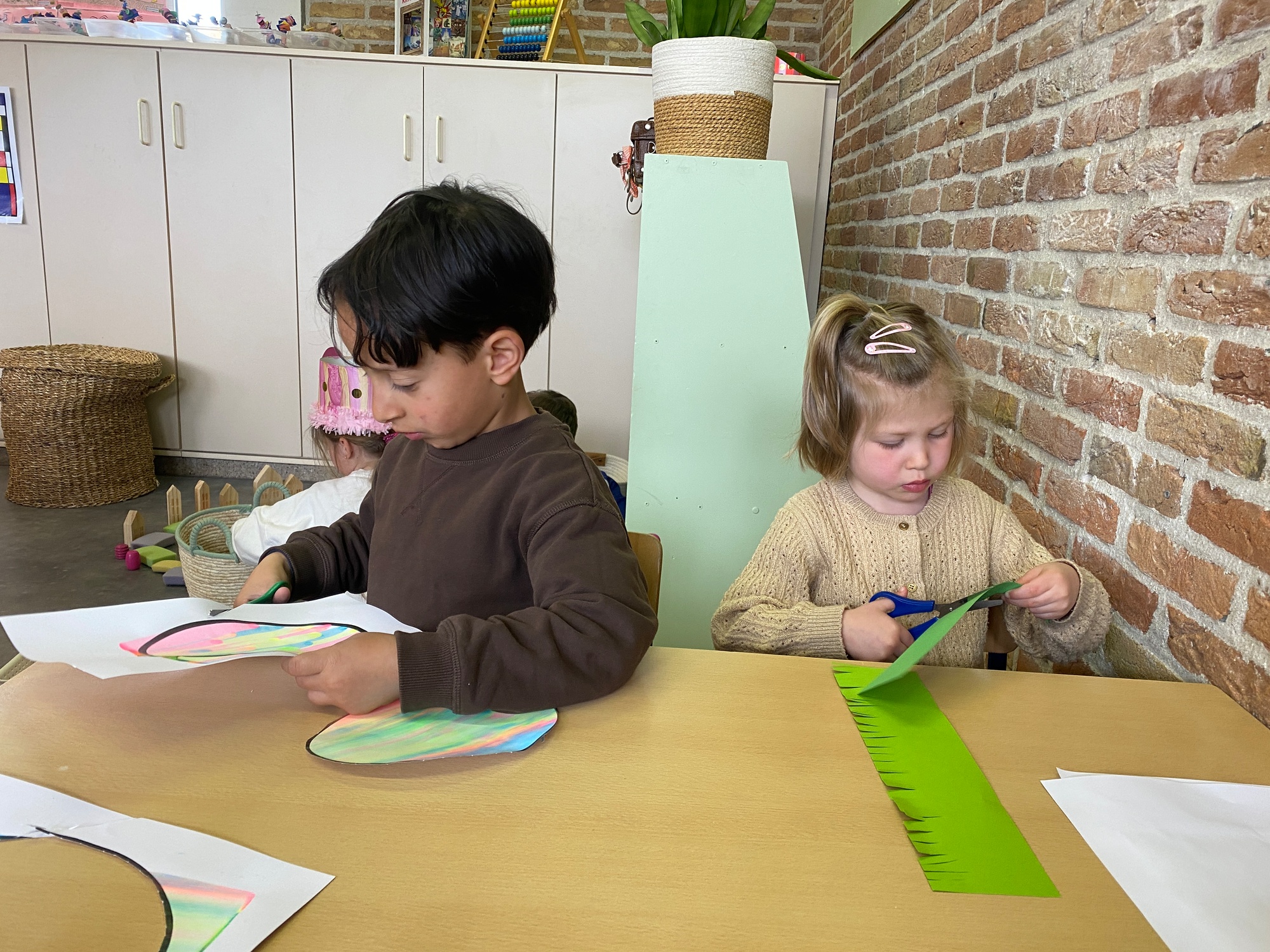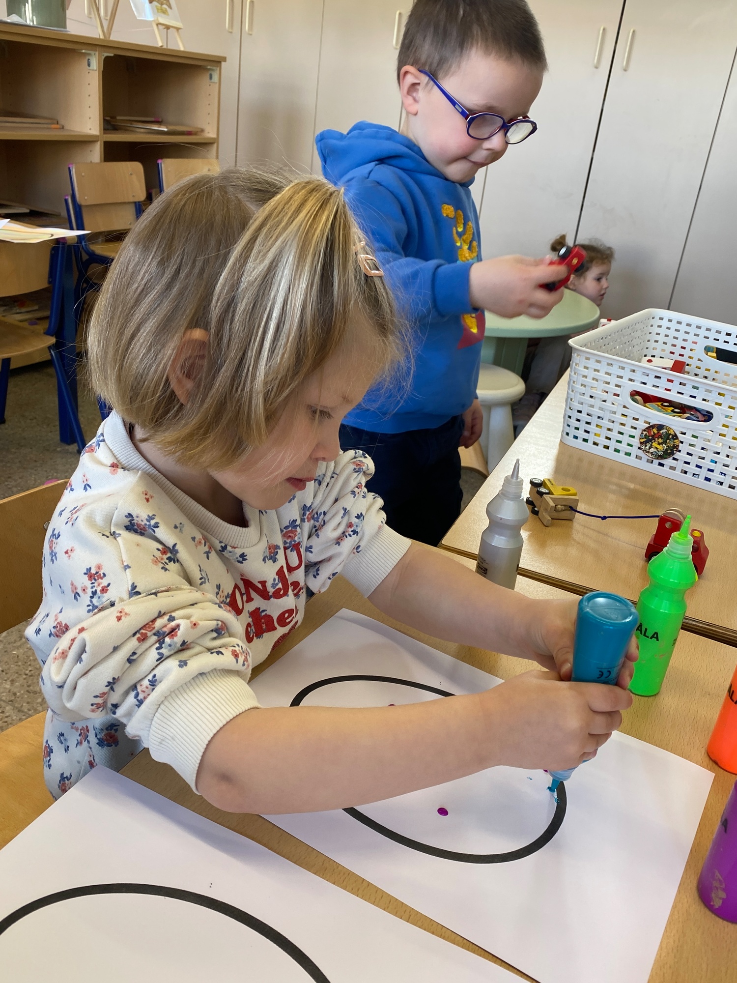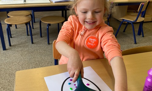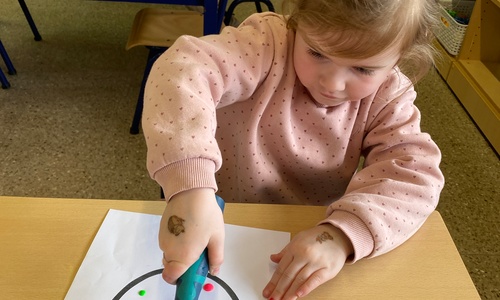 Wolken stempelen, eitjes versieren met stipjes verf en een trekkertje (Wat een mooi resultaat), kuikentje versieren, appel prikken, gras knippen...