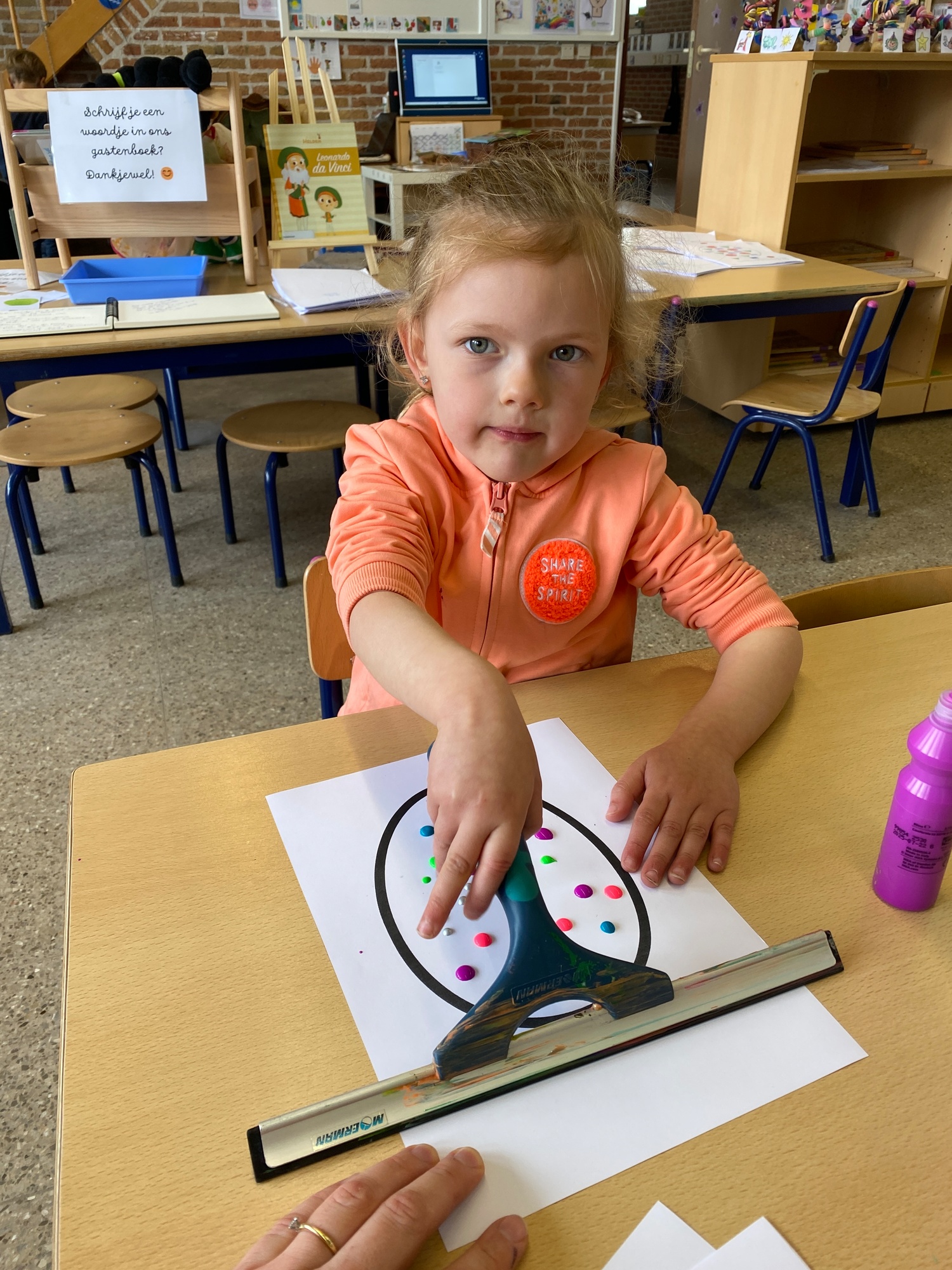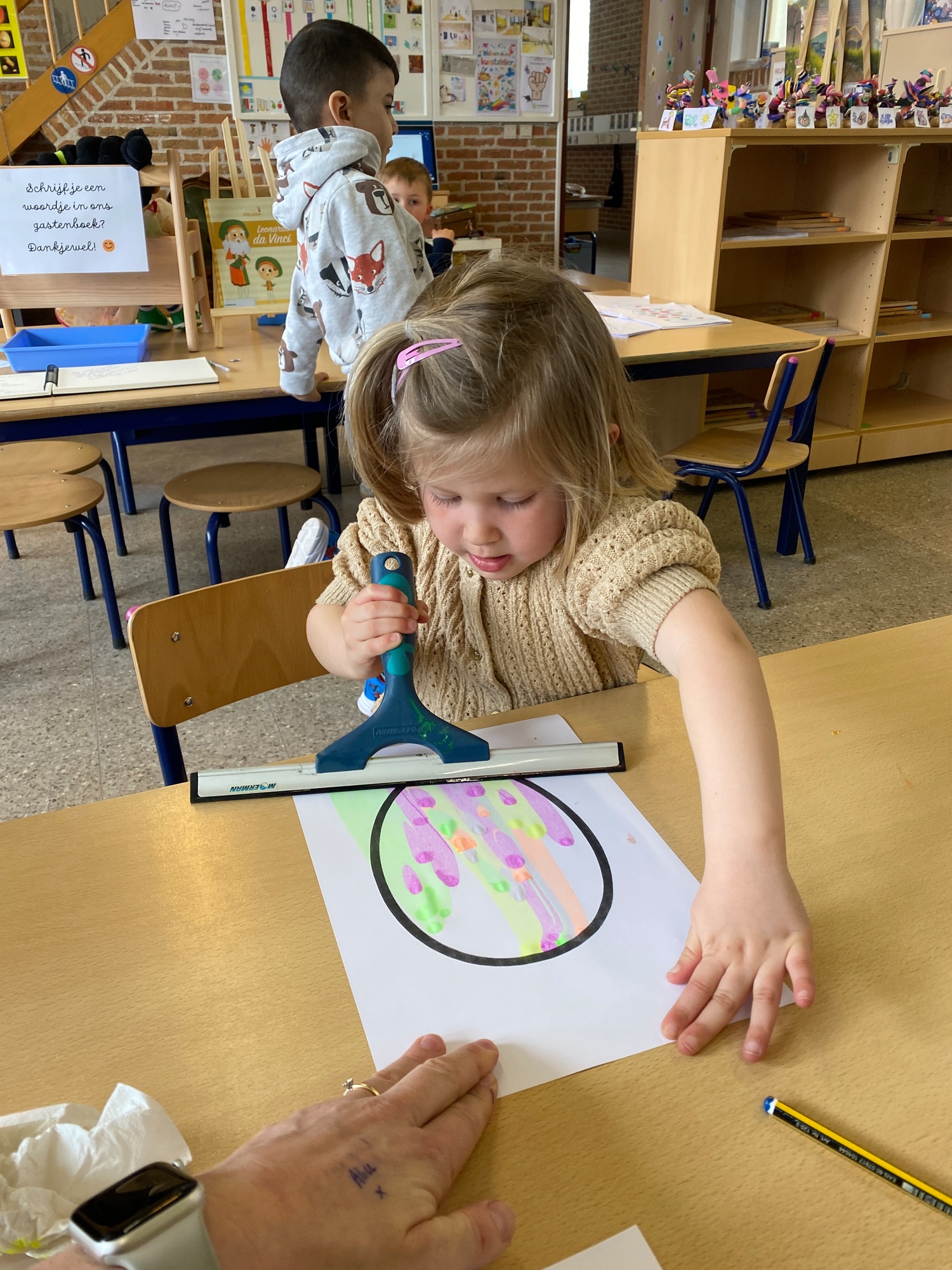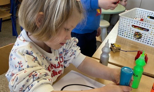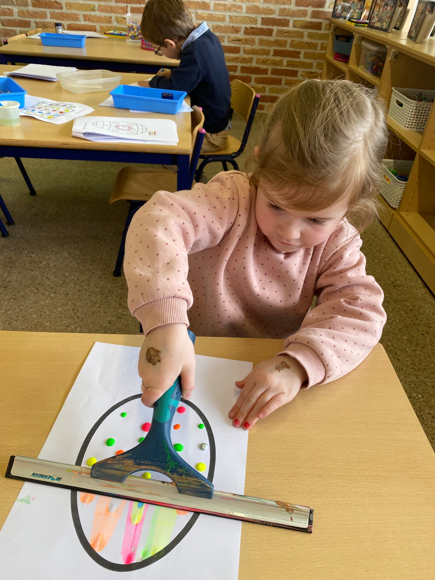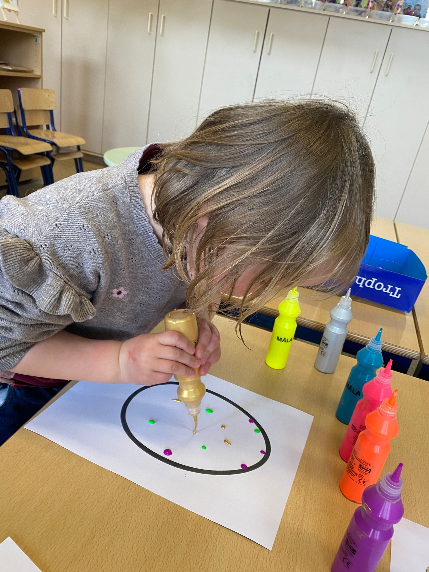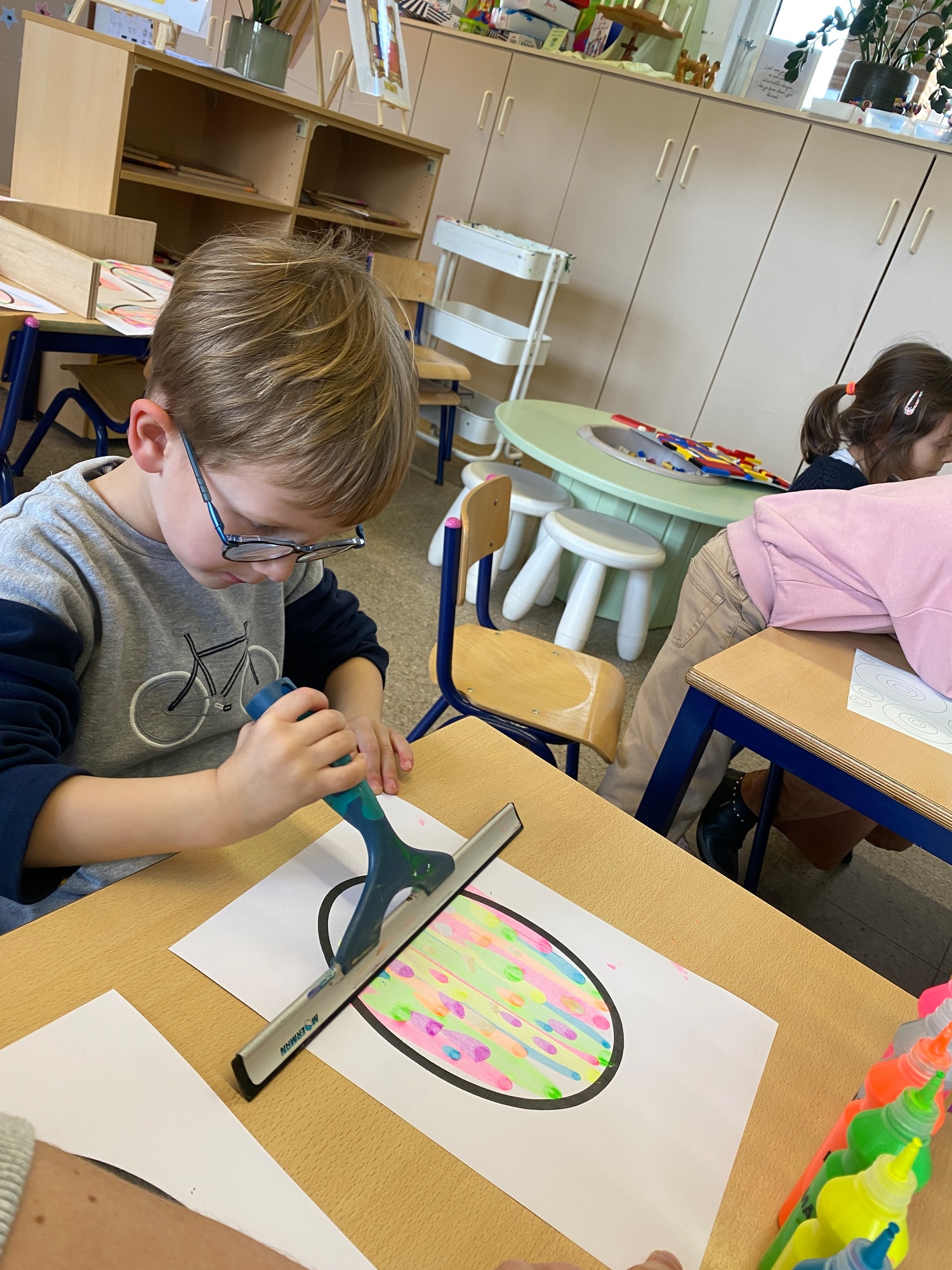 Wolken stempelen, eitjes versieren met stipjes verf en een trekkertje (Wat een mooi resultaat), kuikentje versieren, appel prikken, gras knippen...