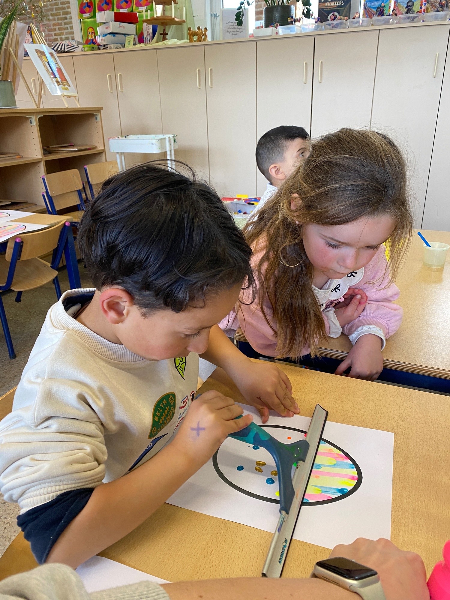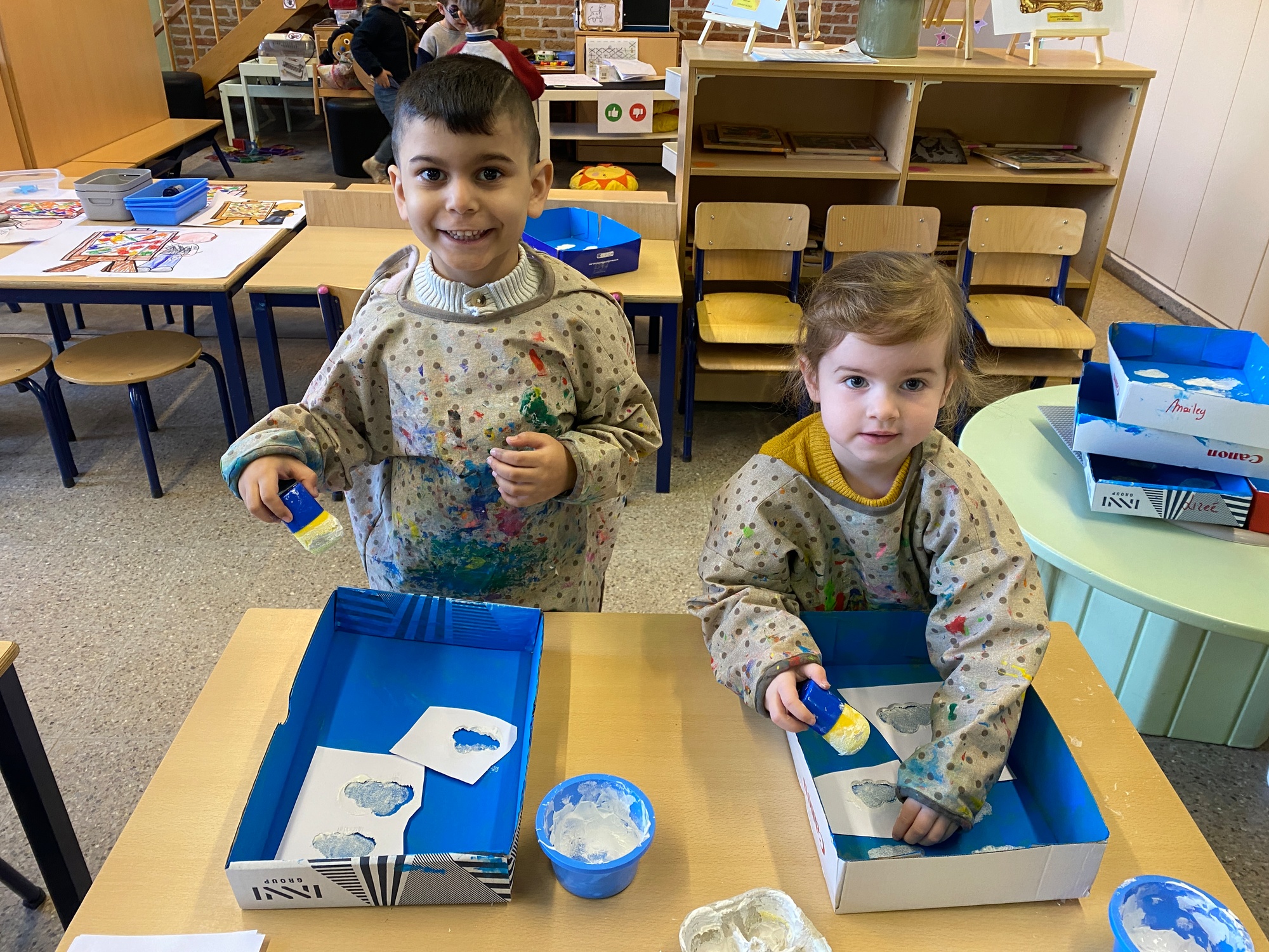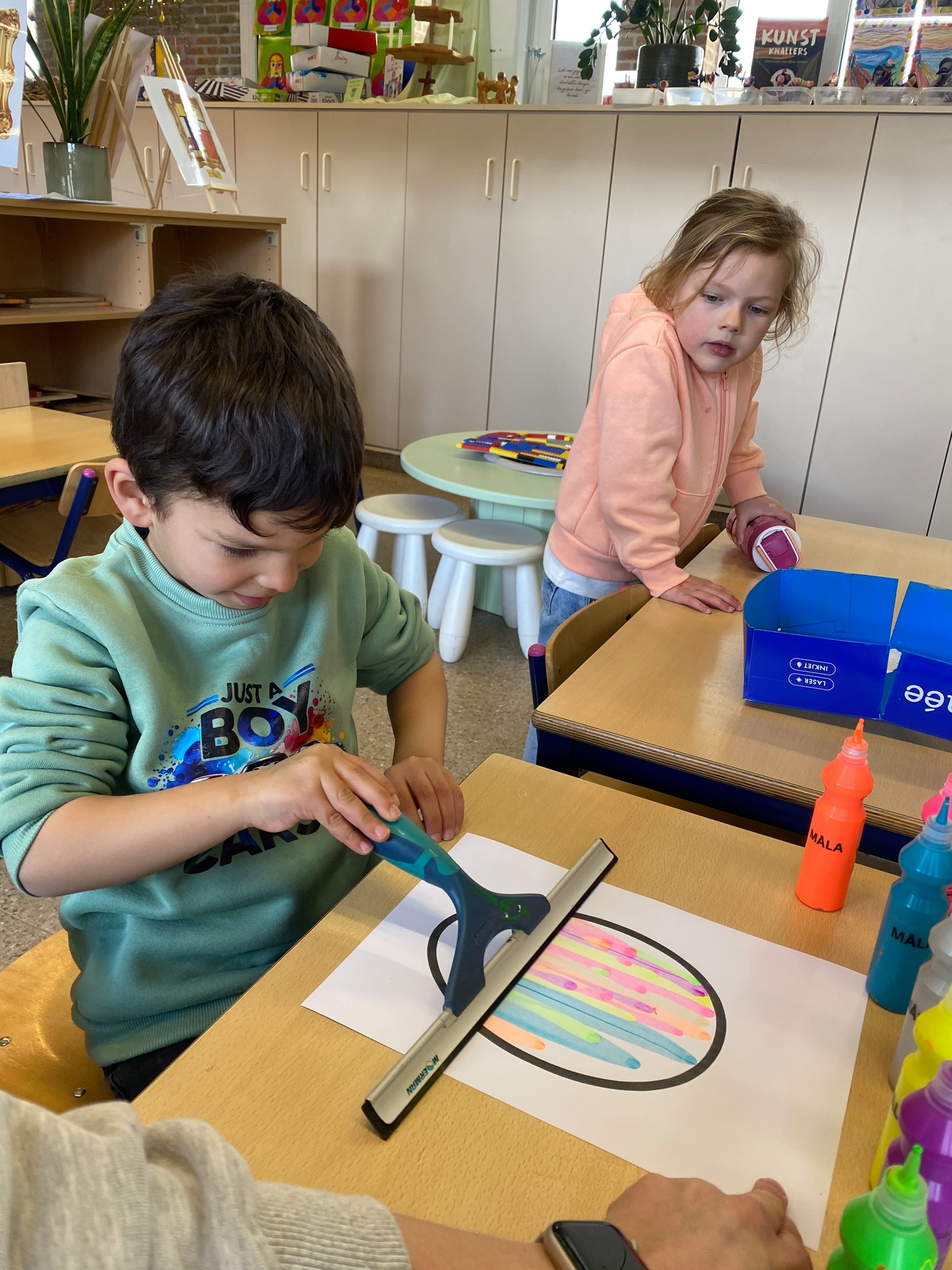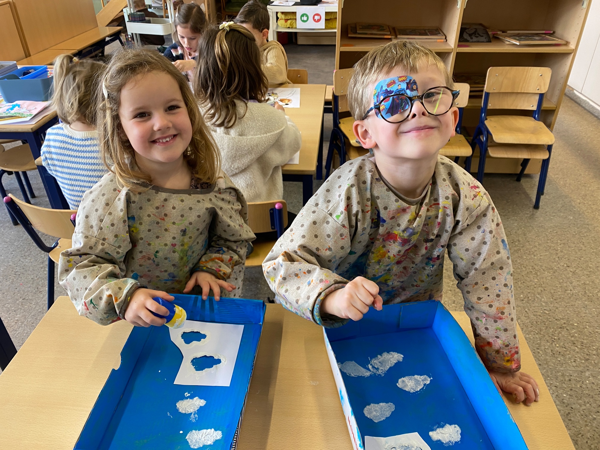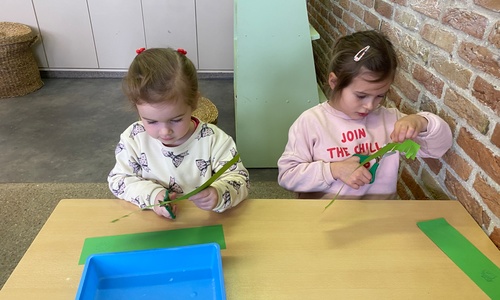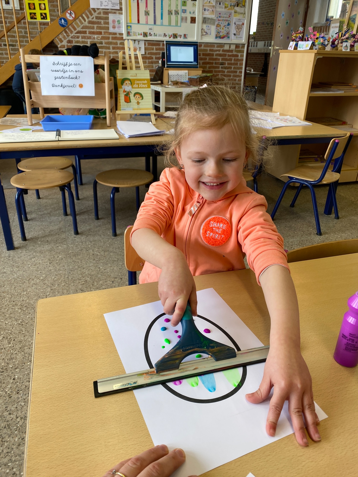 Wolken stempelen, eitjes versieren met stipjes verf en een trekkertje (Wat een mooi resultaat), kuikentje versieren, appel prikken, gras knippen...