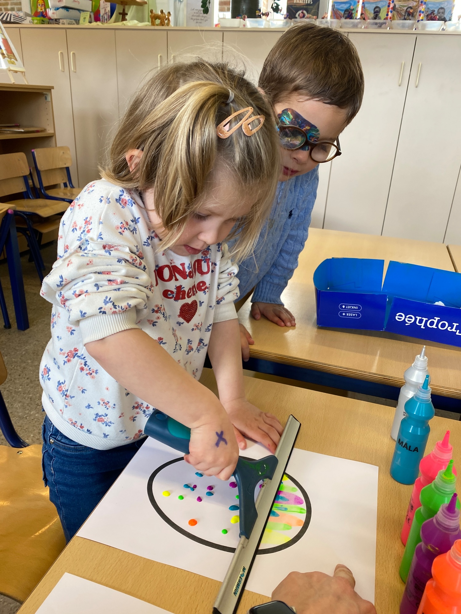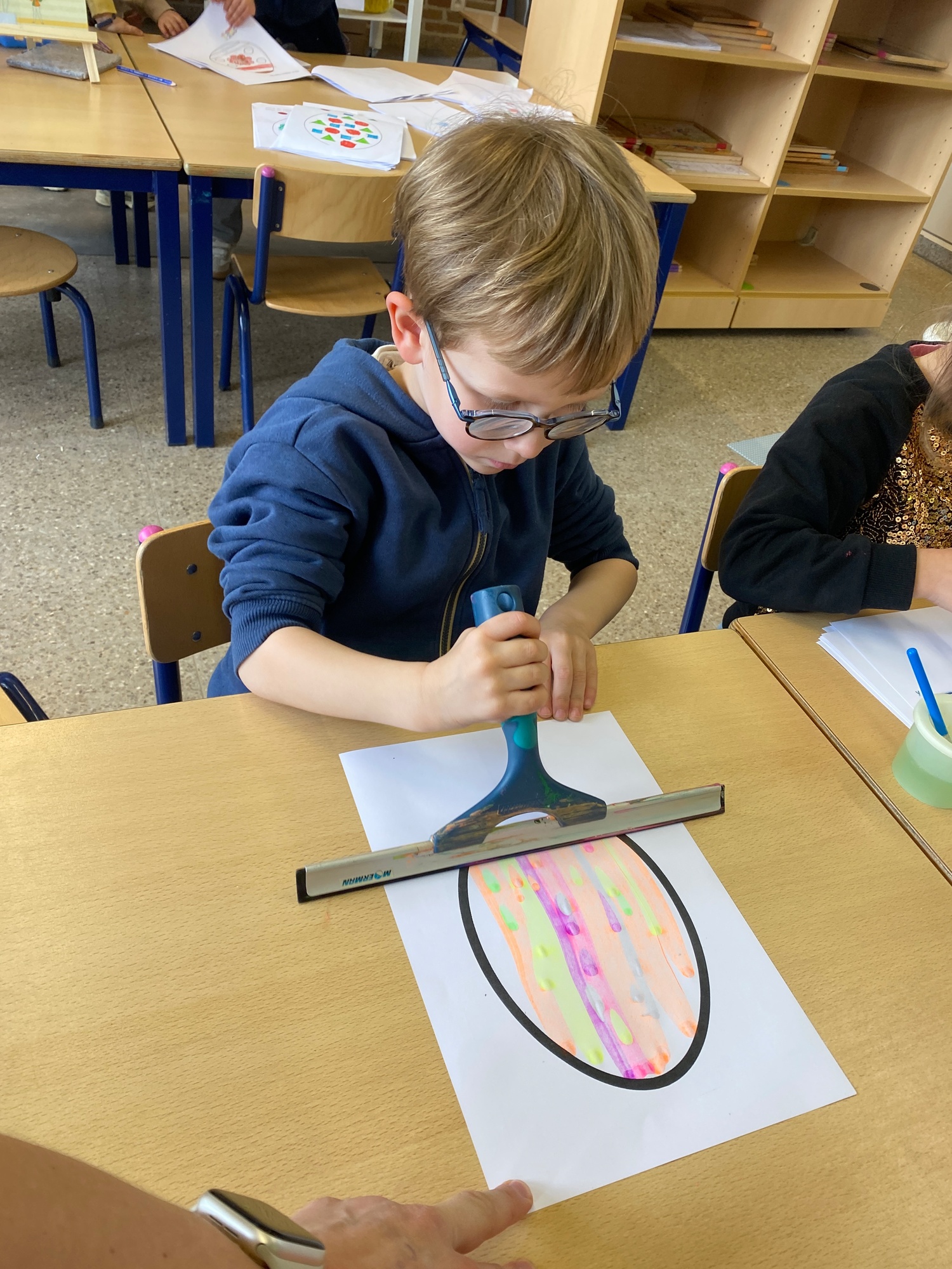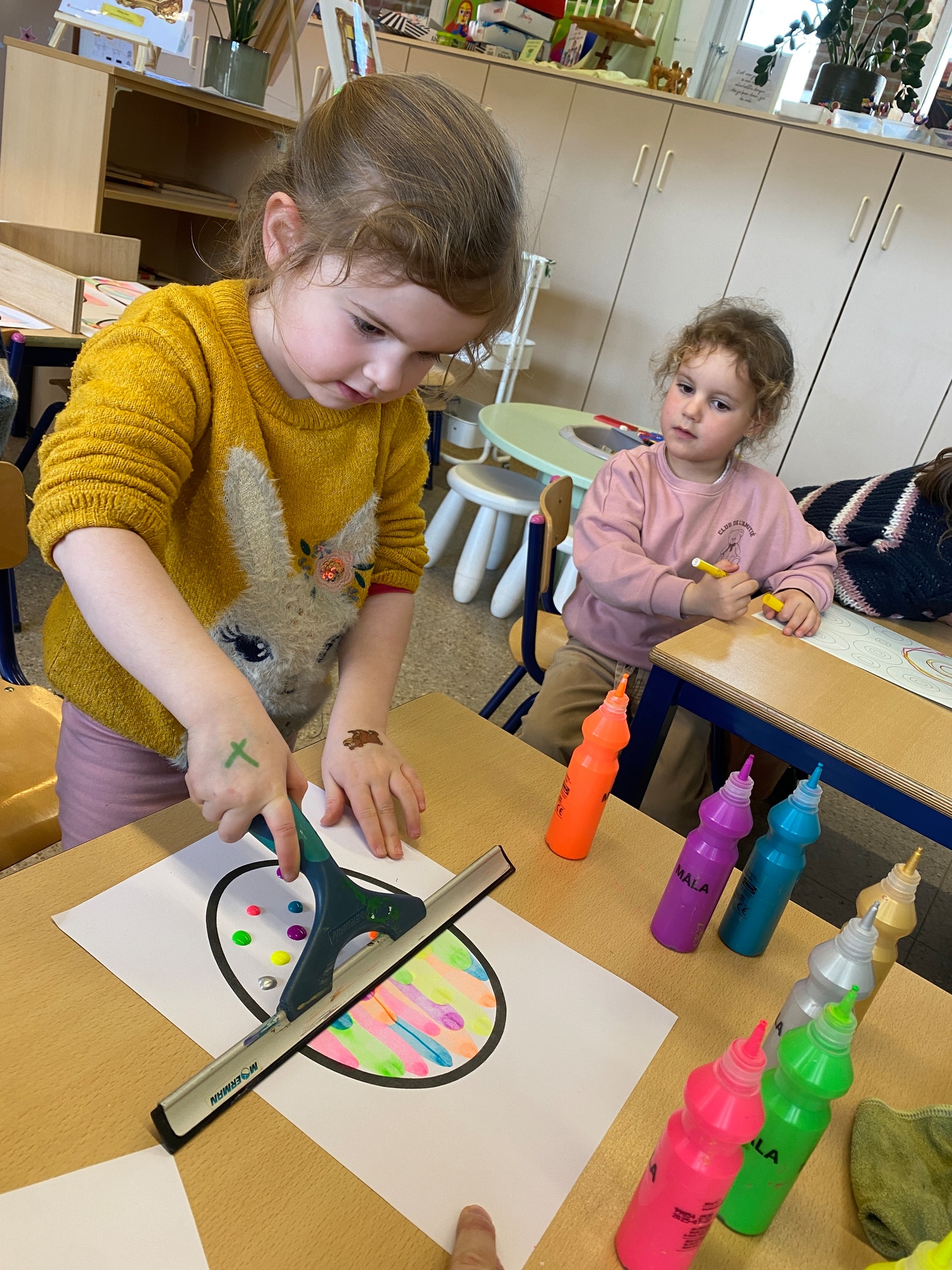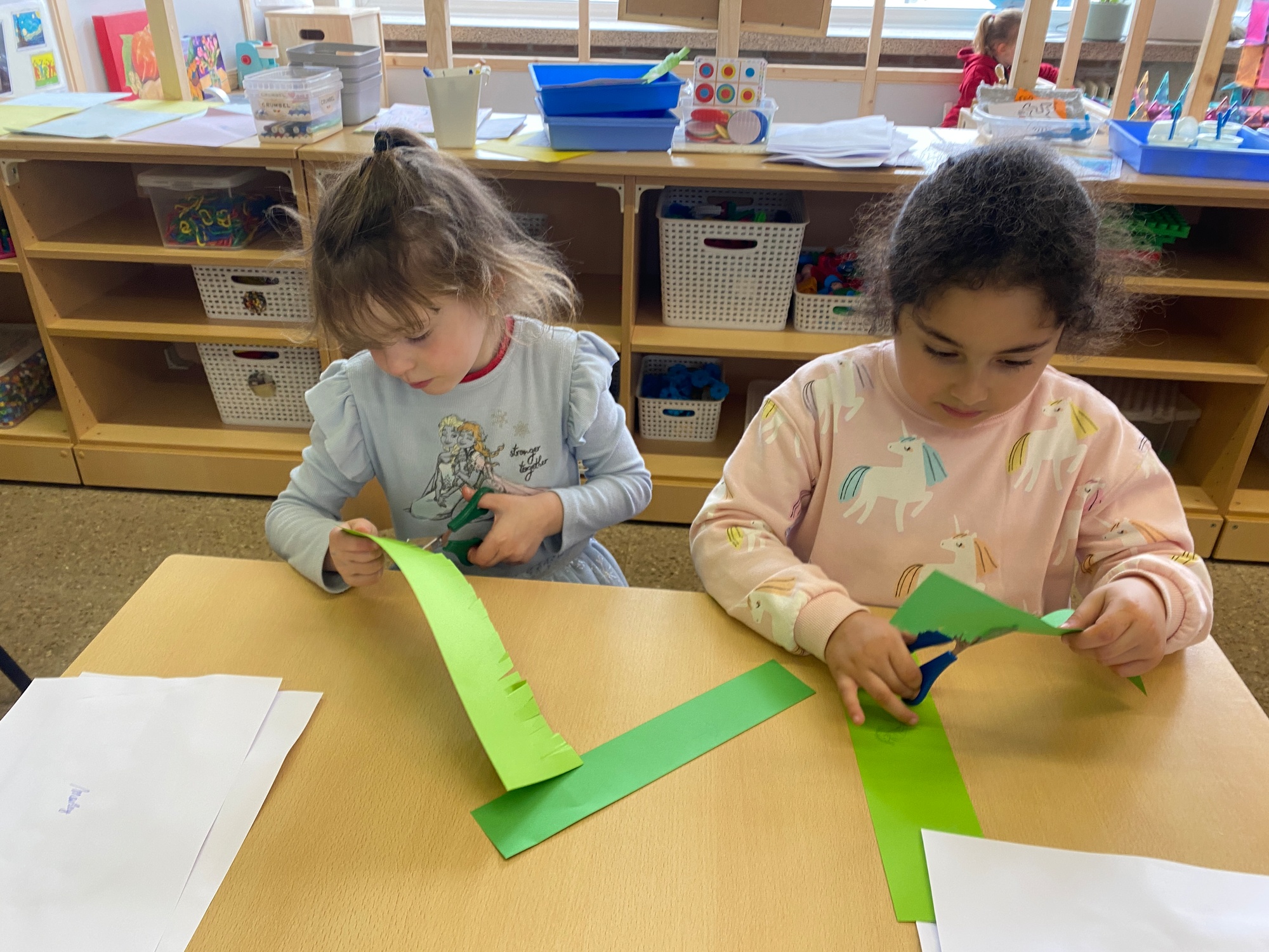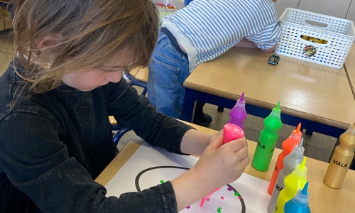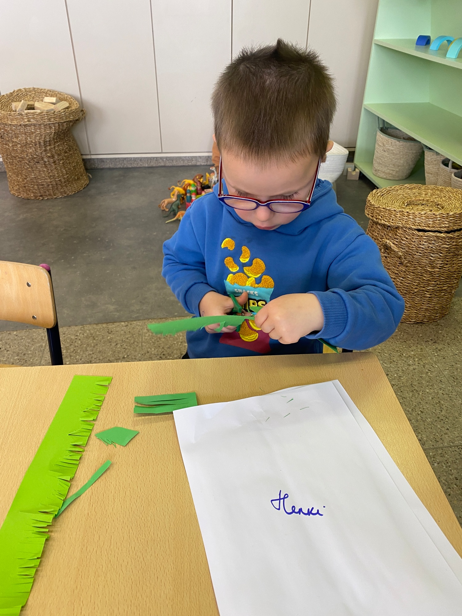 Wolken stempelen, eitjes versieren met stipjes verf en een trekkertje (Wat een mooi resultaat), kuikentje versieren, appel prikken, gras knippen...