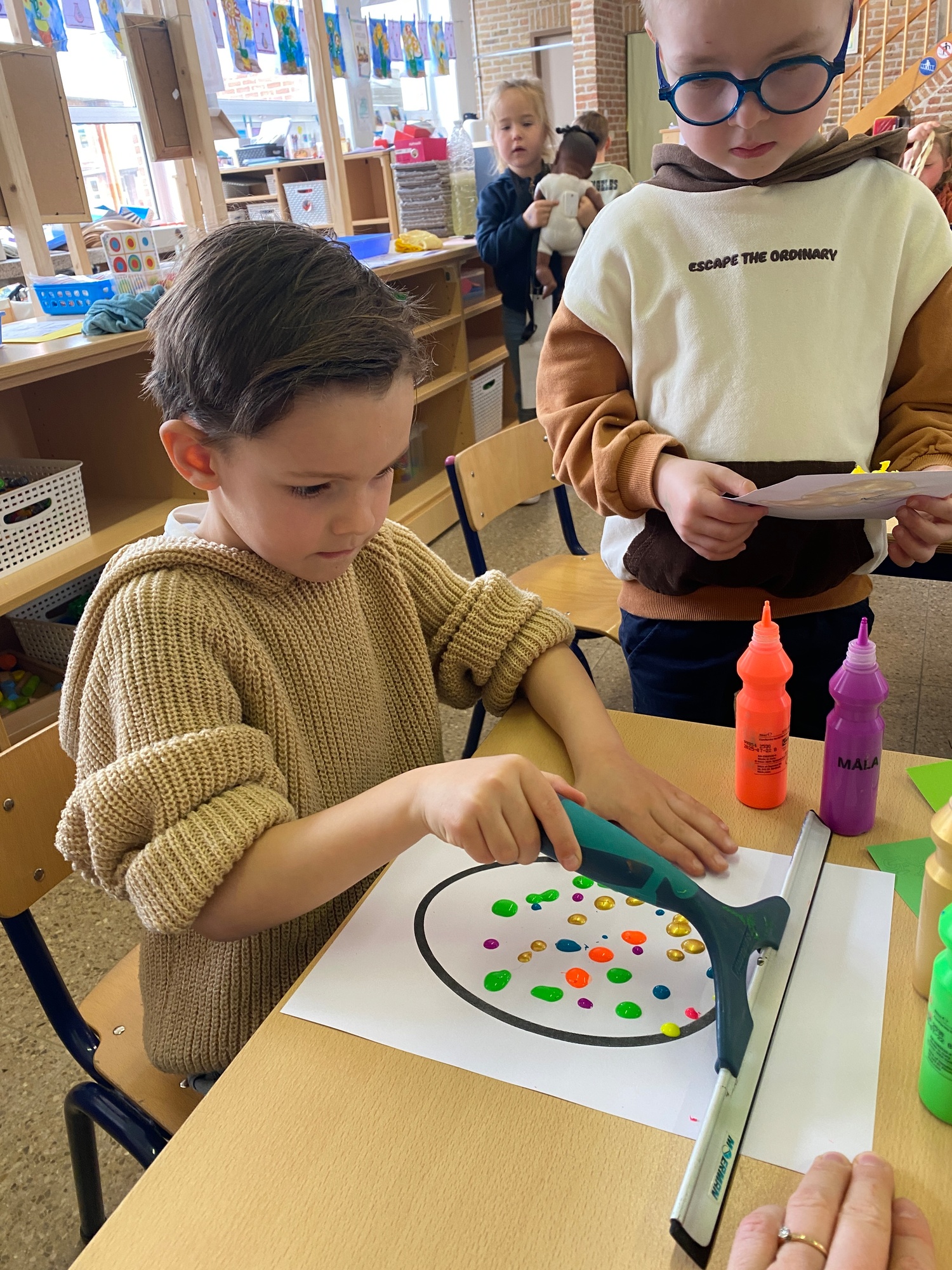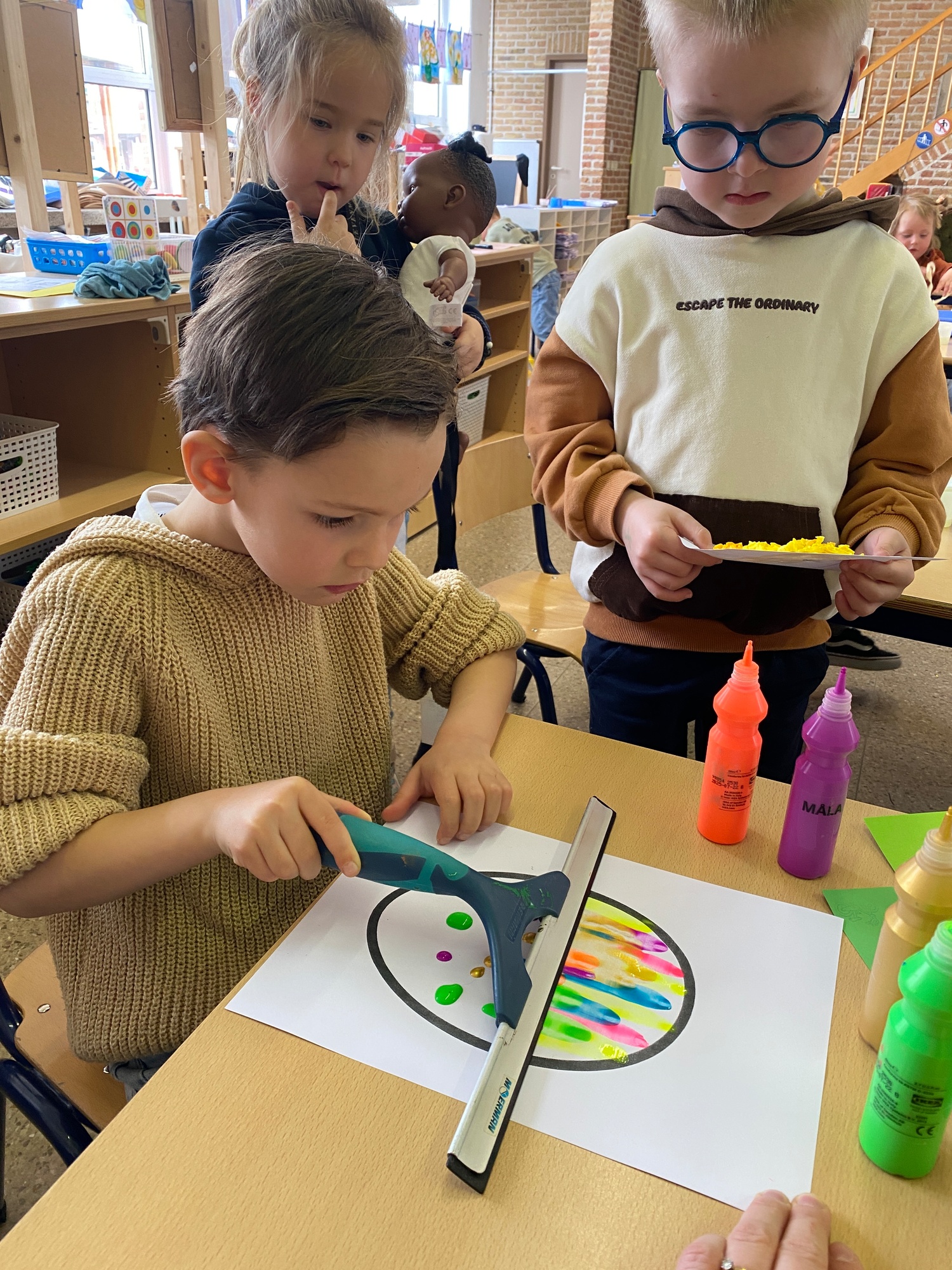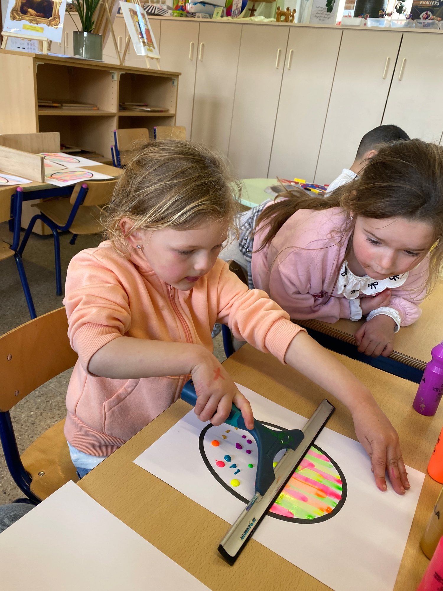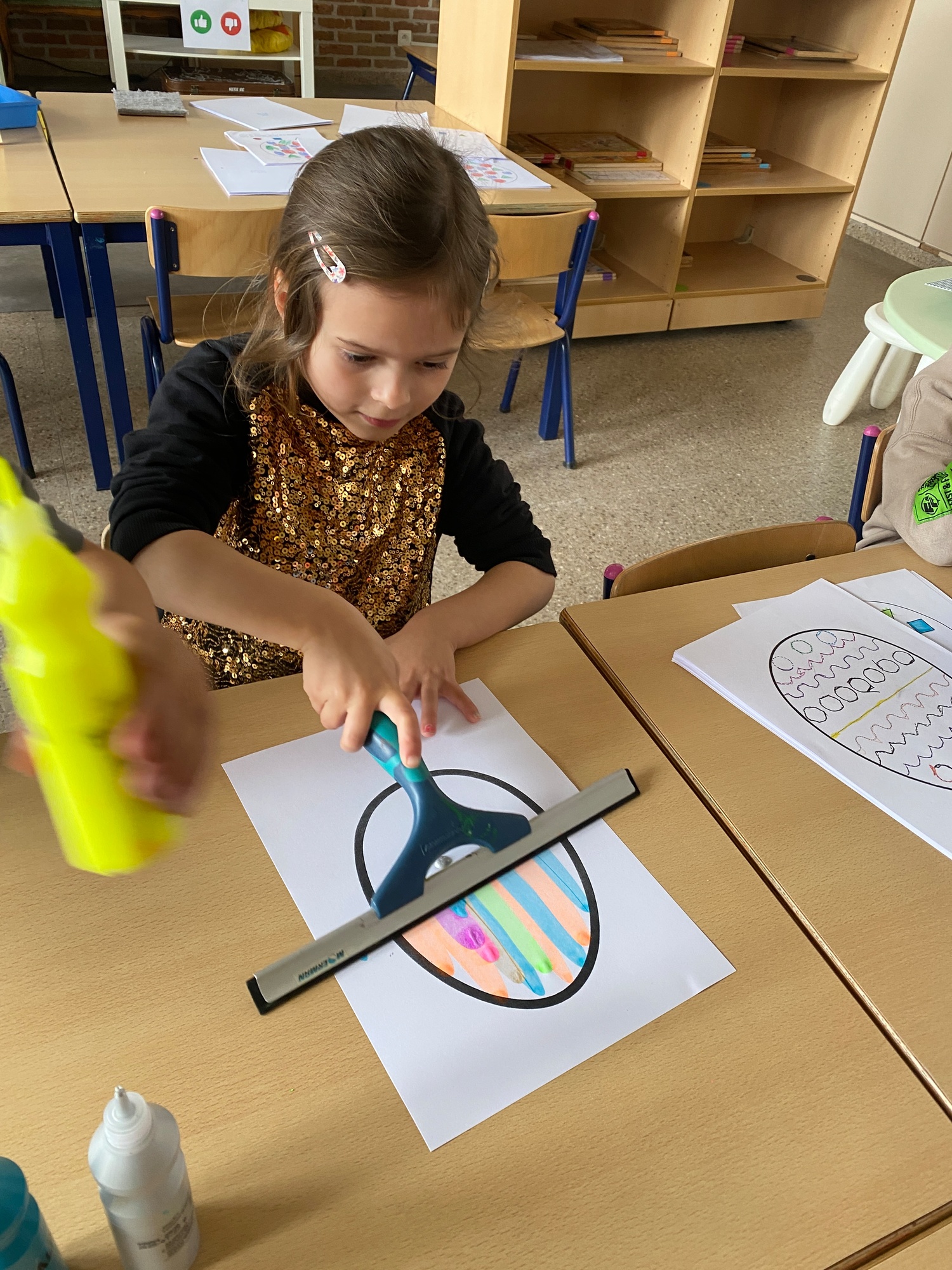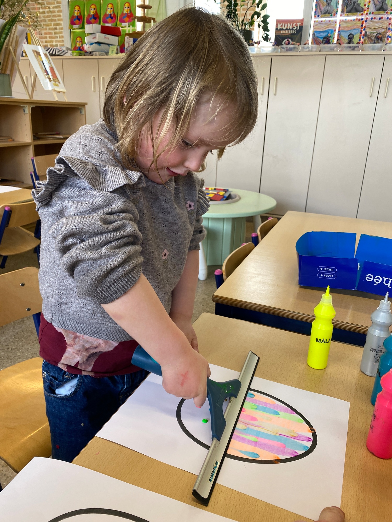 Wolken stempelen, eitjes versieren met stipjes verf en een trekkertje (Wat een mooi resultaat), kuikentje versieren, appel prikken, gras knippen...
