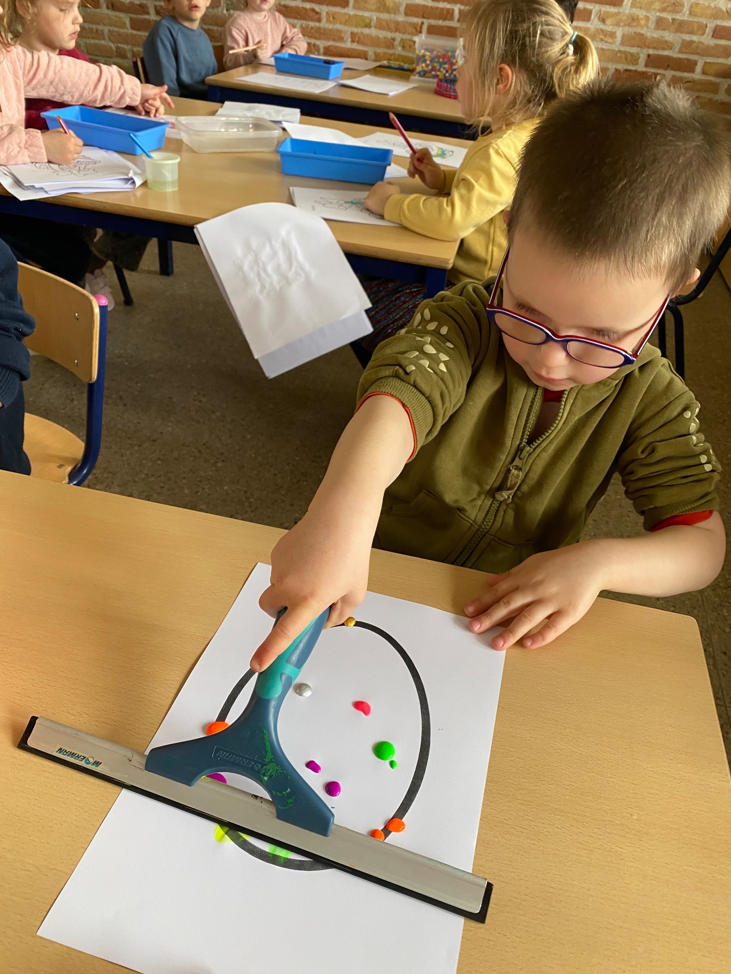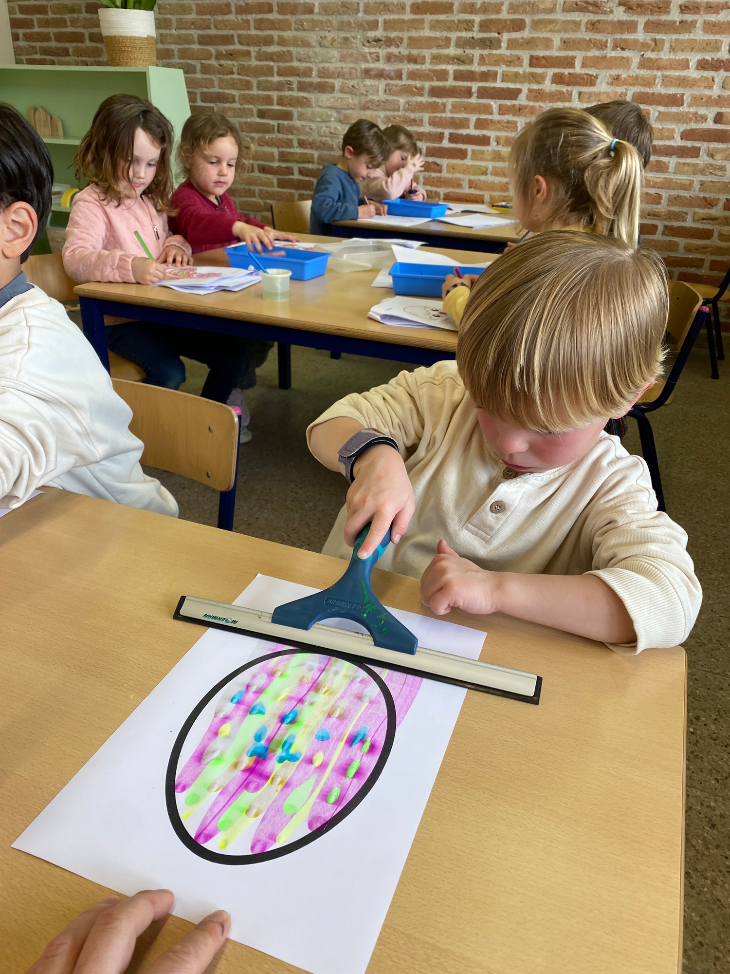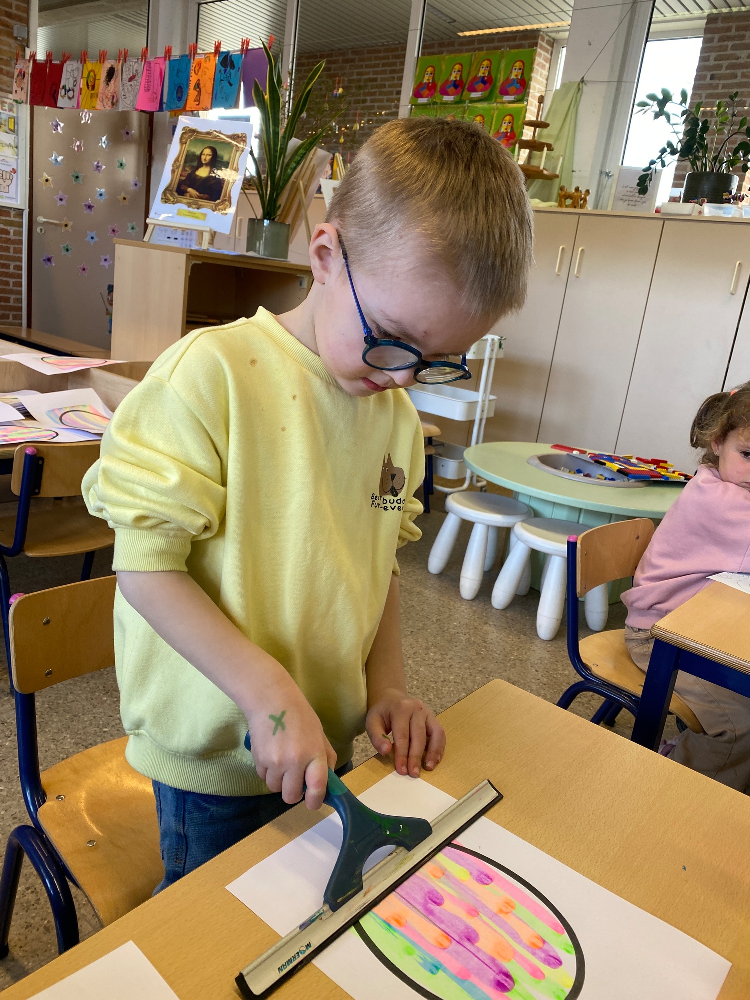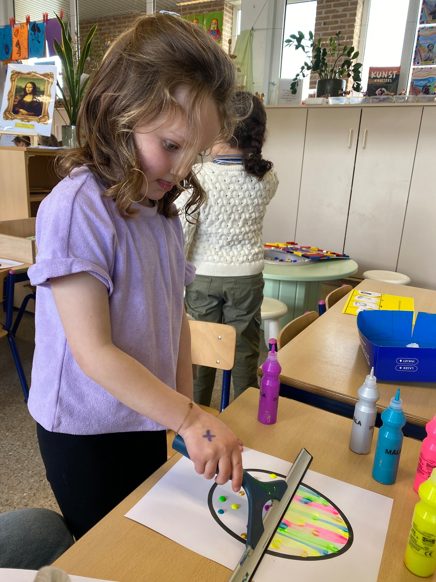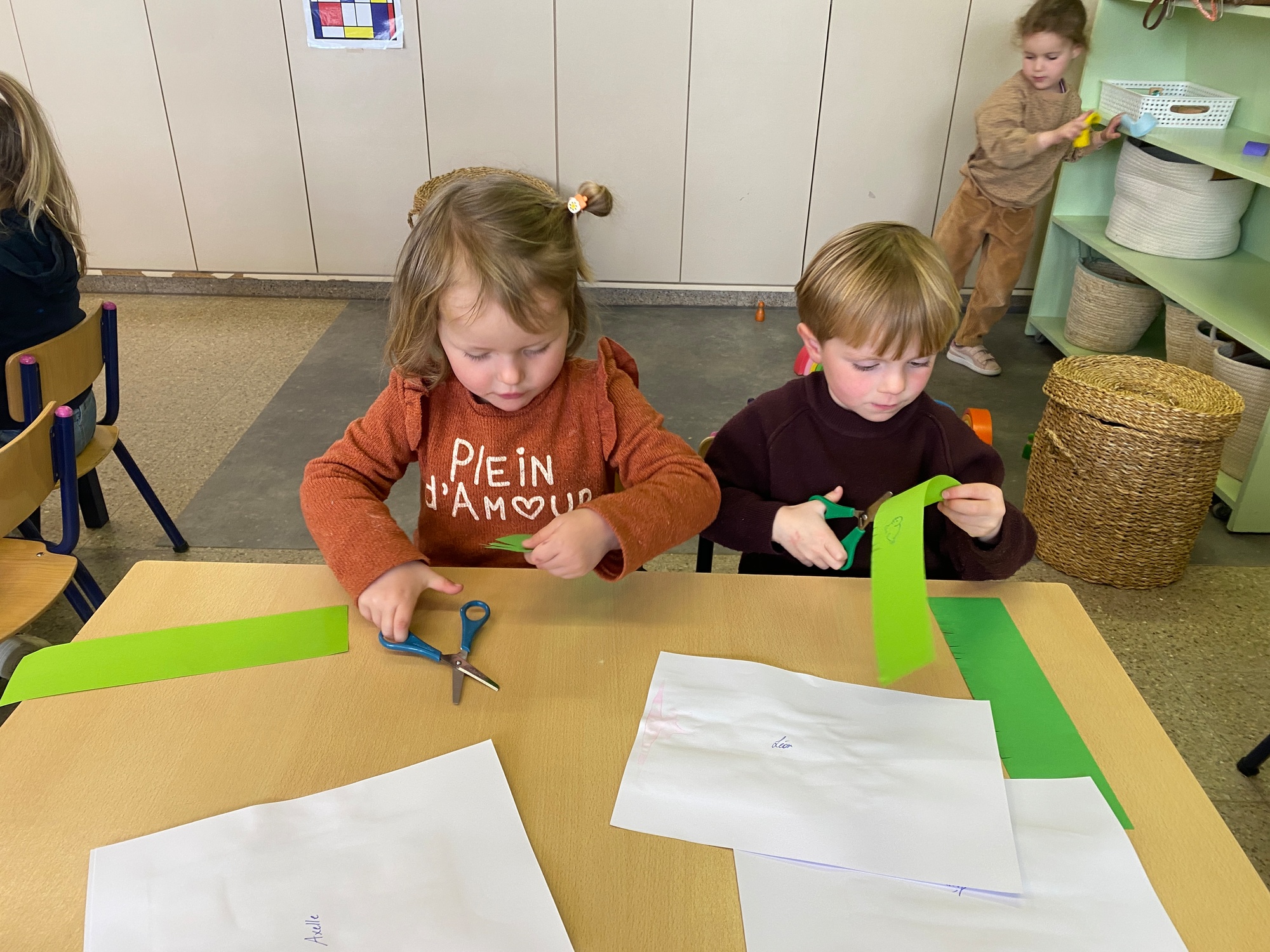 Wolken stempelen, eitjes versieren met stipjes verf en een trekkertje (Wat een mooi resultaat), kuikentje versieren, appel prikken, gras knippen...