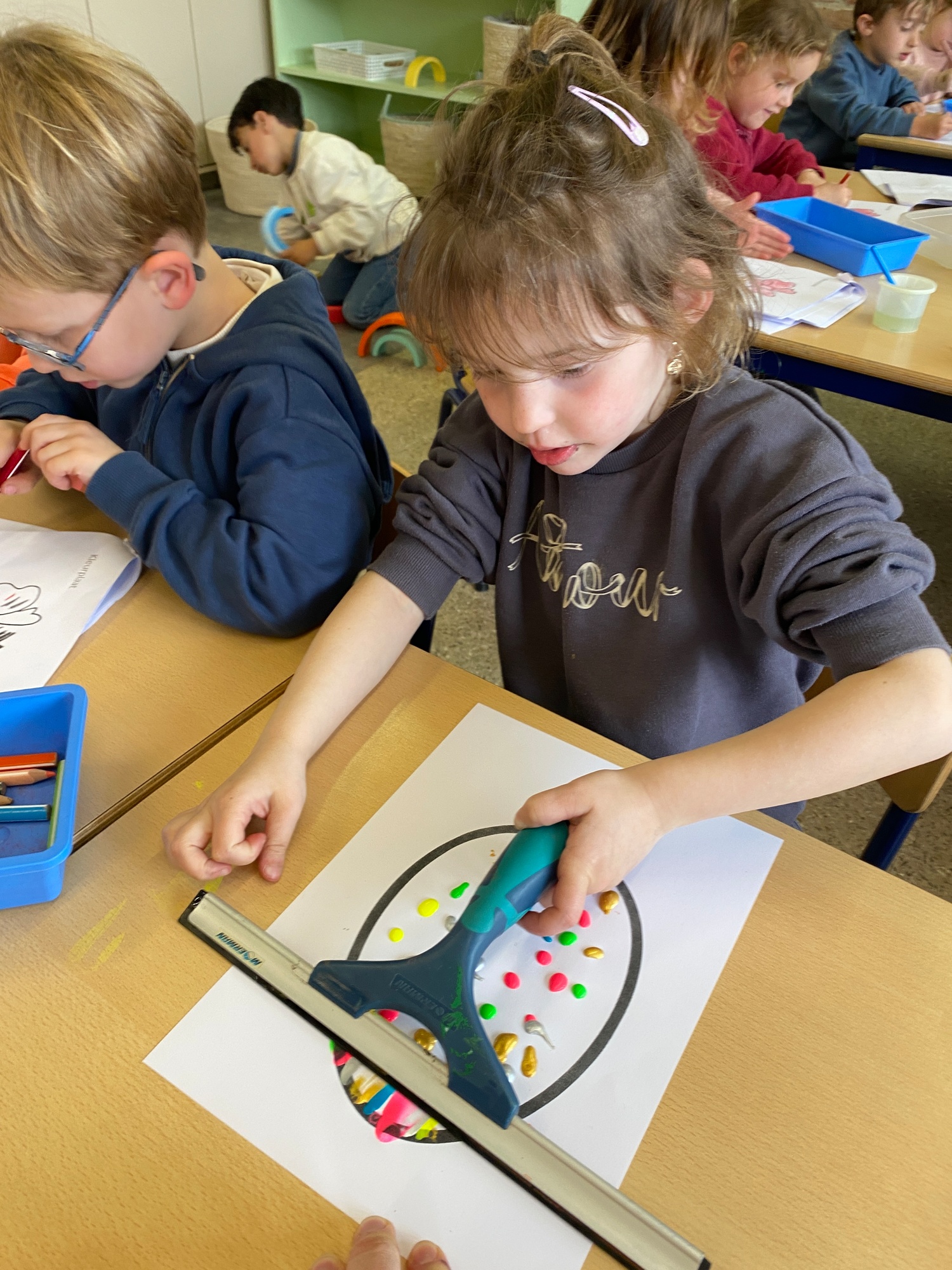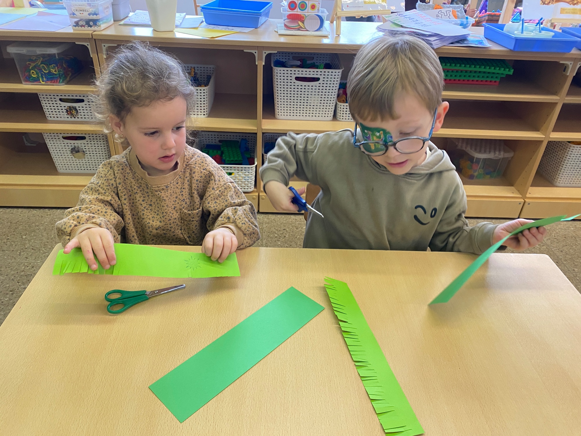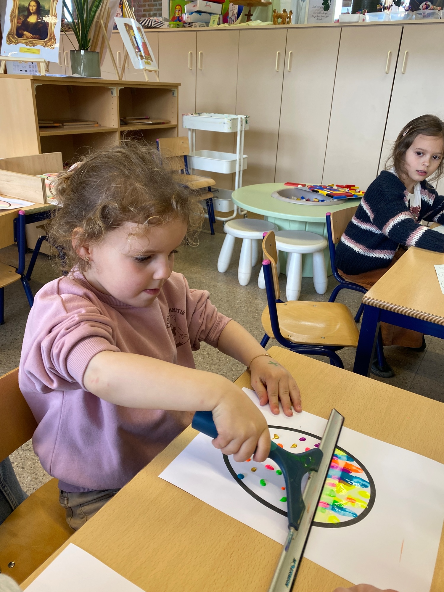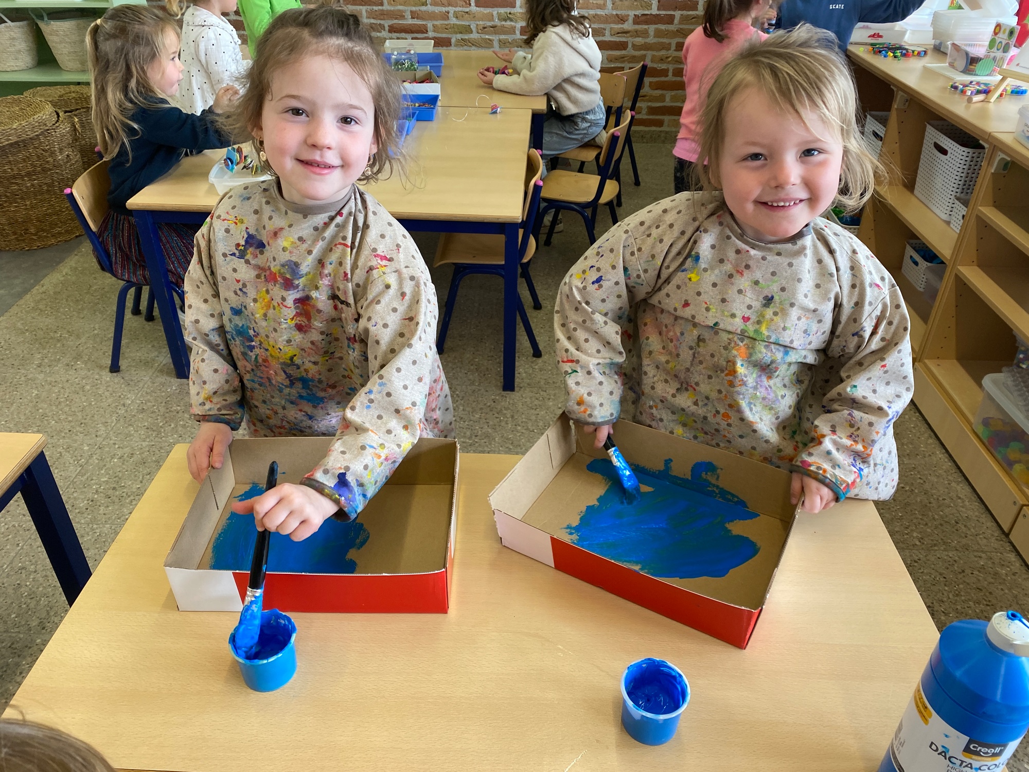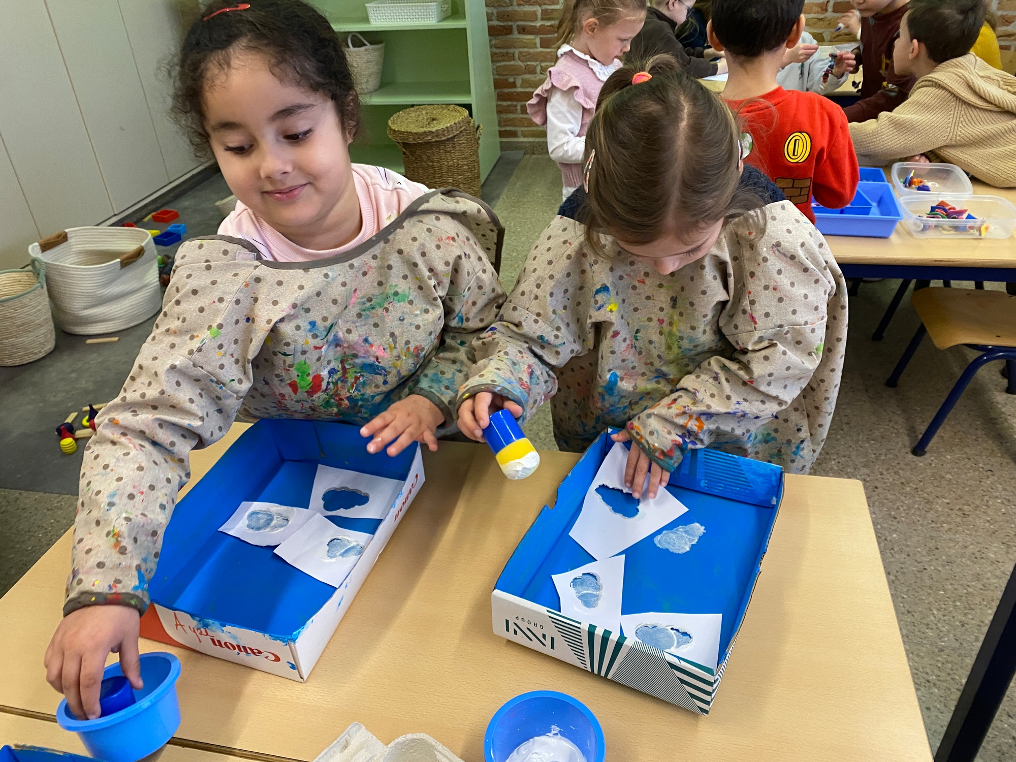 Wolken stempelen, eitjes versieren met stipjes verf en een trekkertje (Wat een mooi resultaat), kuikentje versieren, appel prikken, gras knippen...